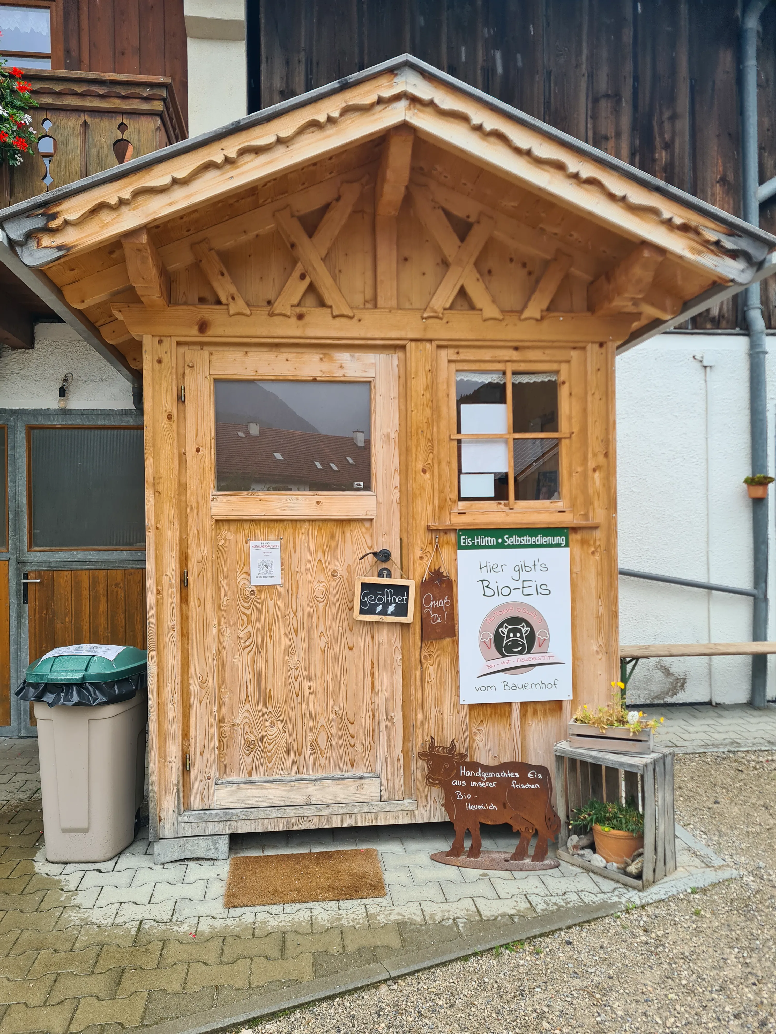 Etwas in Eile, um nicht ganze zwei Stunden auf den nächsten Zug warten zu müssen, spurten wir dann zum Bahnhof in Eschenlohe. Wir sind allerdings gegen Ende dann doch wieder so gut in der Zeit, dass wir uns noch beim SB-Bio-Eisverkauf bedienen. Anschließend geht es dann mit dem Zug zurück nach München: wie es sich hier gehört natürlich mit SEV zwischen Murnau und Weilheim.