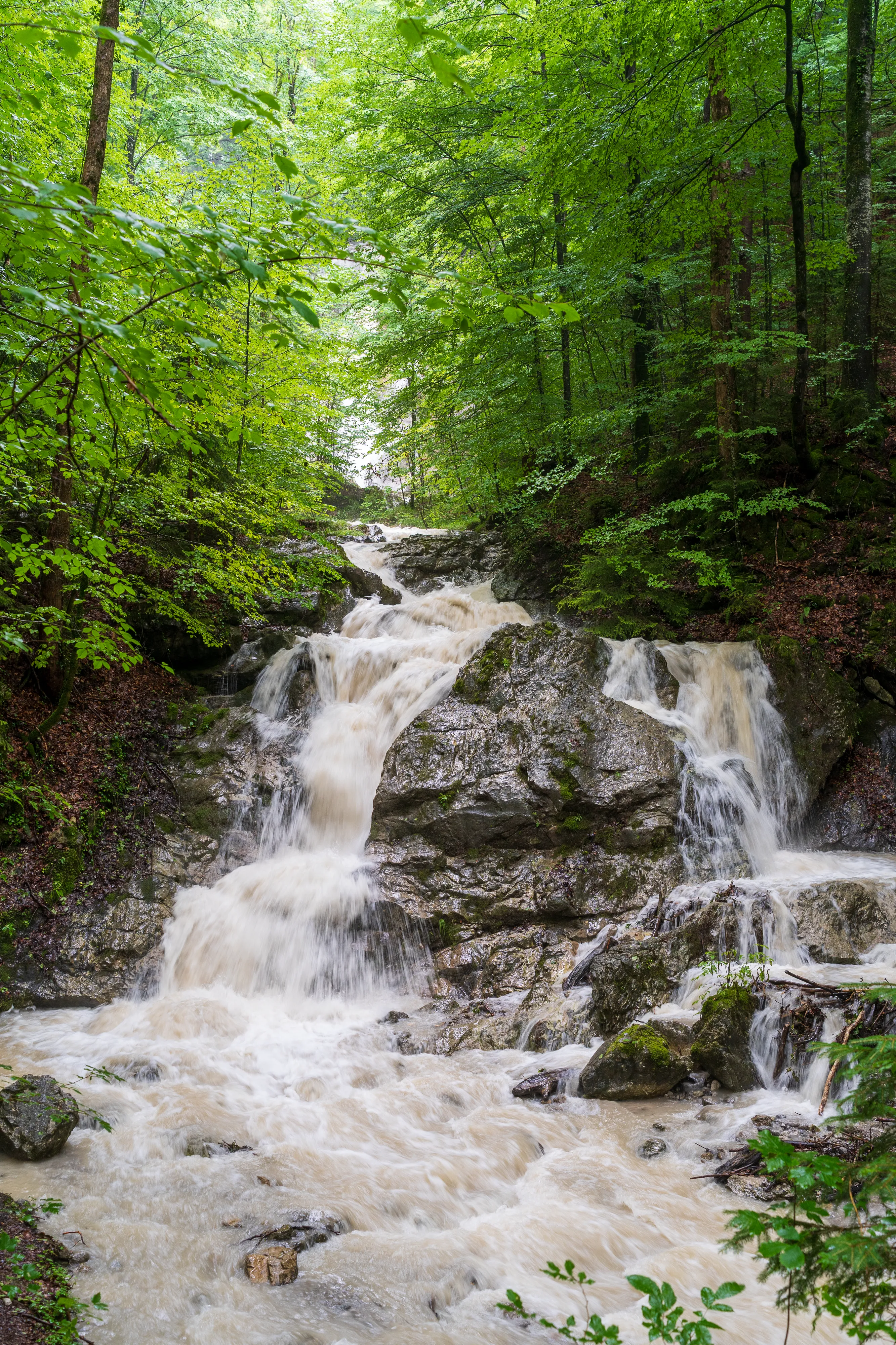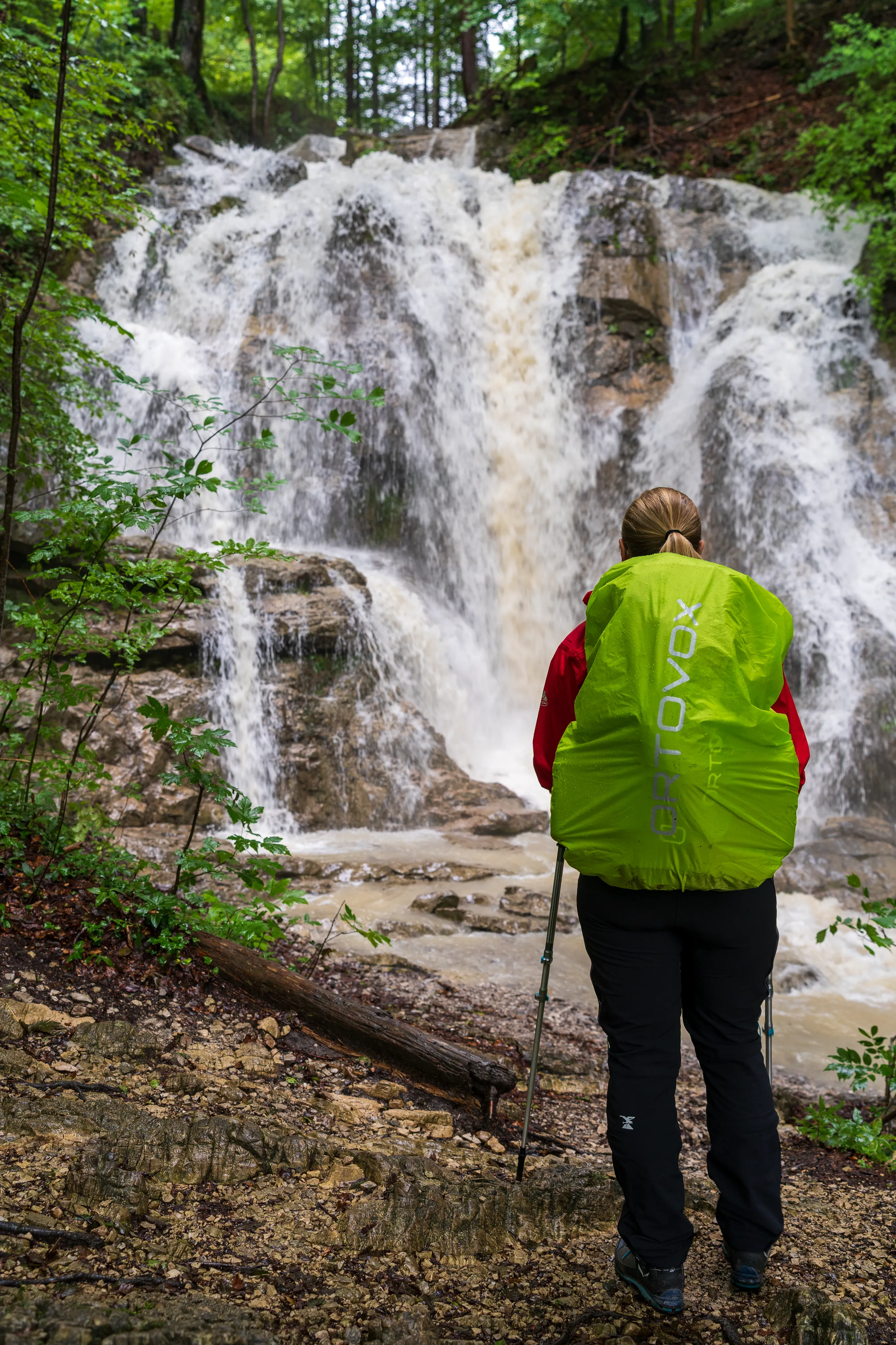 Wir reisen mit den Öffentlichen an. Leider mehr schlecht als Recht, denn die Bahnstrecke nach Kochel ist leider gesperrt und so müssen wir stattdessen ab Bad Tölz auf den Bus umsteigen: 40 quälende Minuten bis Kochel. Dort dann Umstieg in den Bus gen Mittenwald. Auch wenn es schon regnet entscheiden wir uns für den Ausstieg am Ortsende von Kochel. Der Bus würde uns auch bis hoch zum Walchensee bringen, aber wir scheuen den vollen Aufstieg auch bei Regen nicht und laufen lieber noch ein wenig am schönen Kochelsee entlang und besuchen noch ein paar kleinere Wasserfälle auf dem Weg nach oben. Außerdem ist unsere erste Etappe ohnehin nicht besonders lang, der Tag noch jung und wir gut gegen den Regen ausgerüstet: Regenjacke, Regenhose, Abdeckung für den Rucksack und wasserfeste Schuhe sind Pflicht.