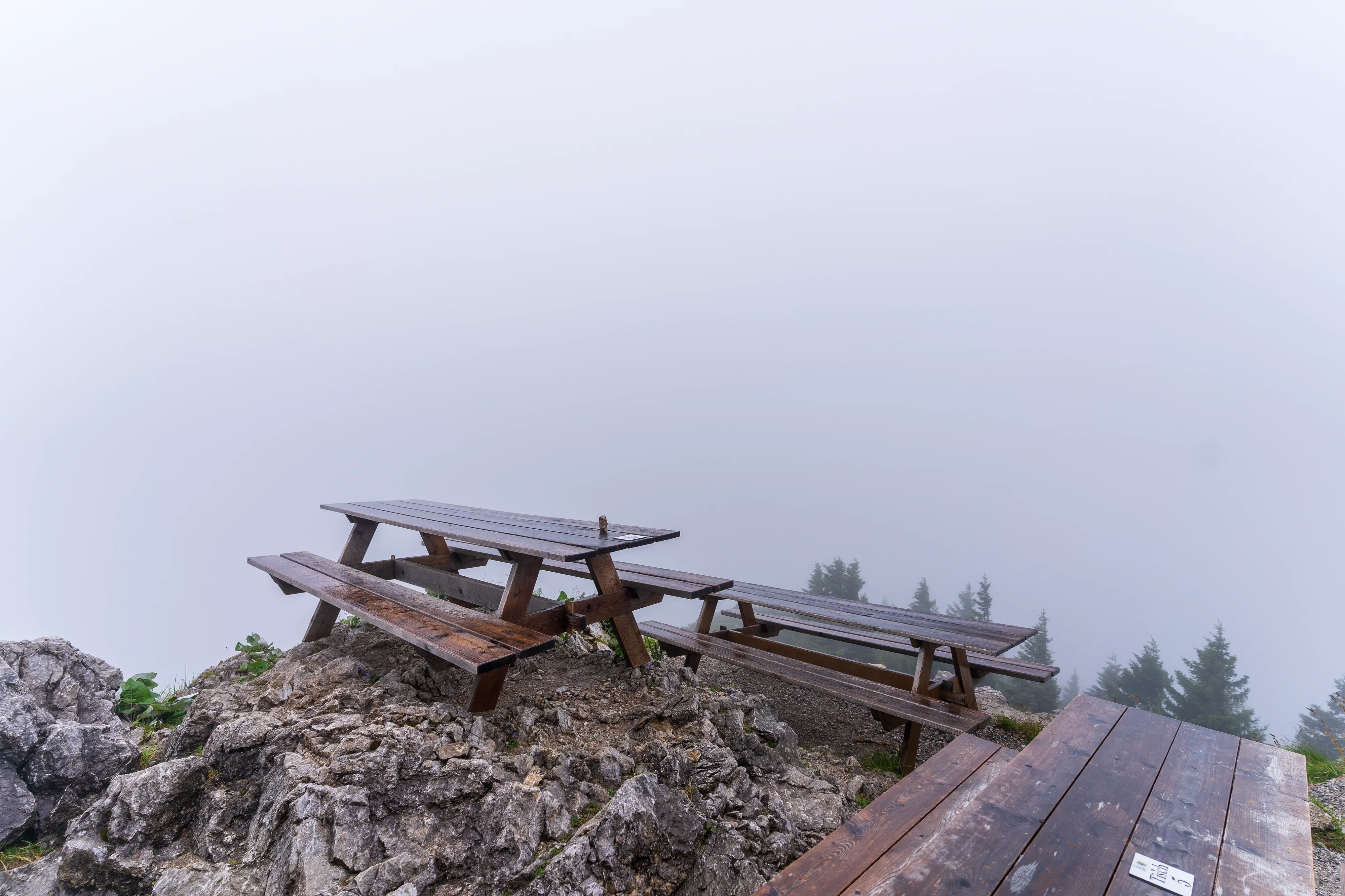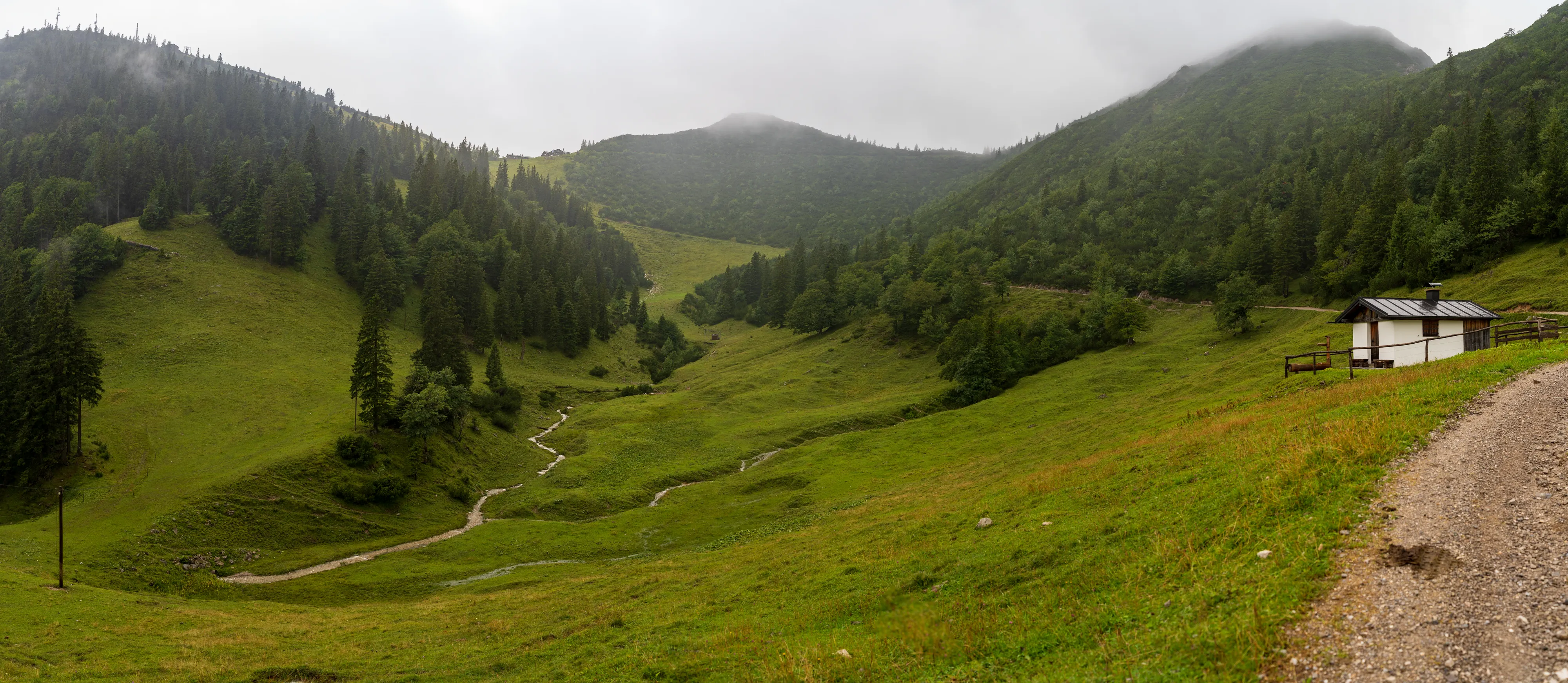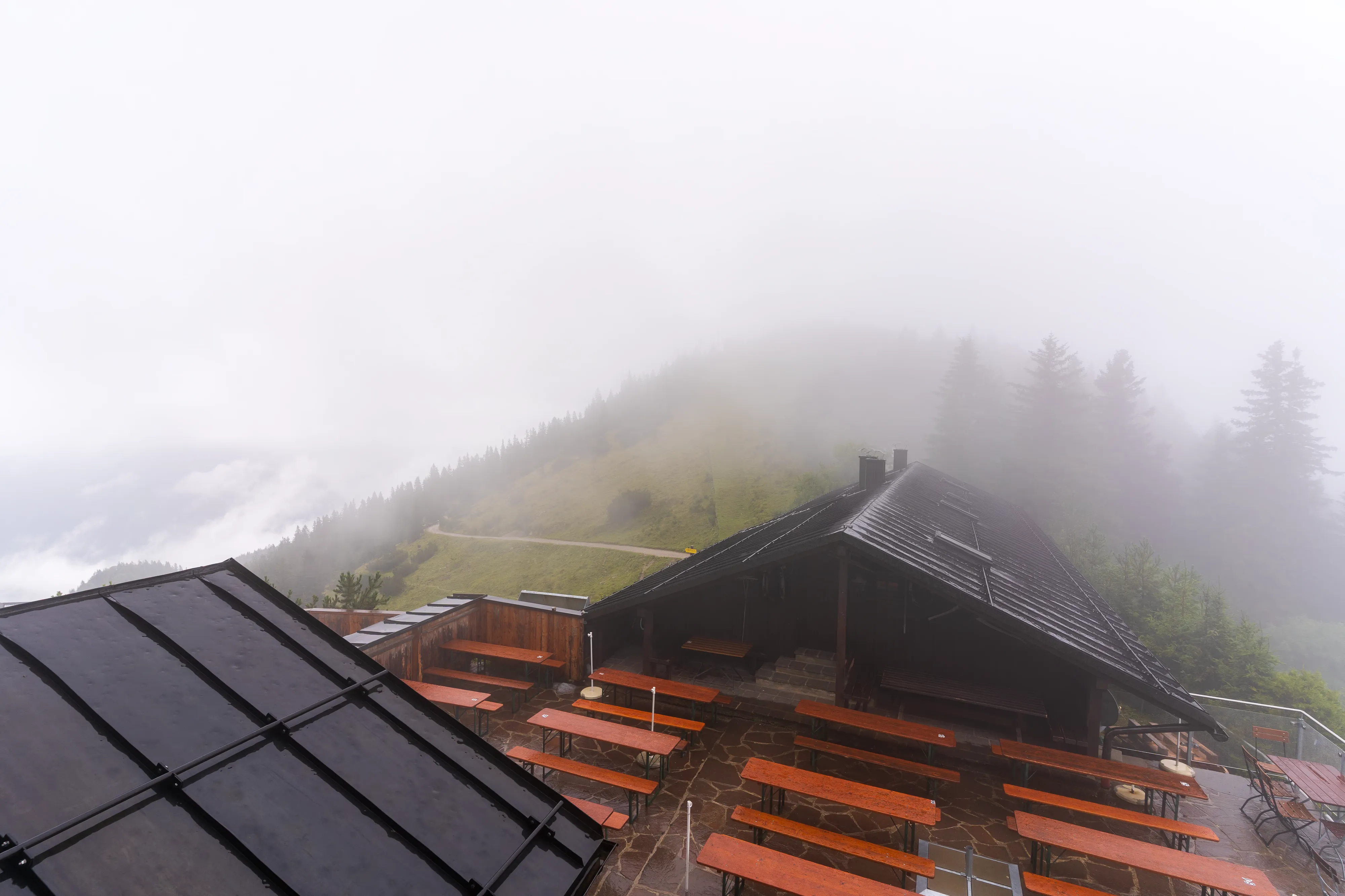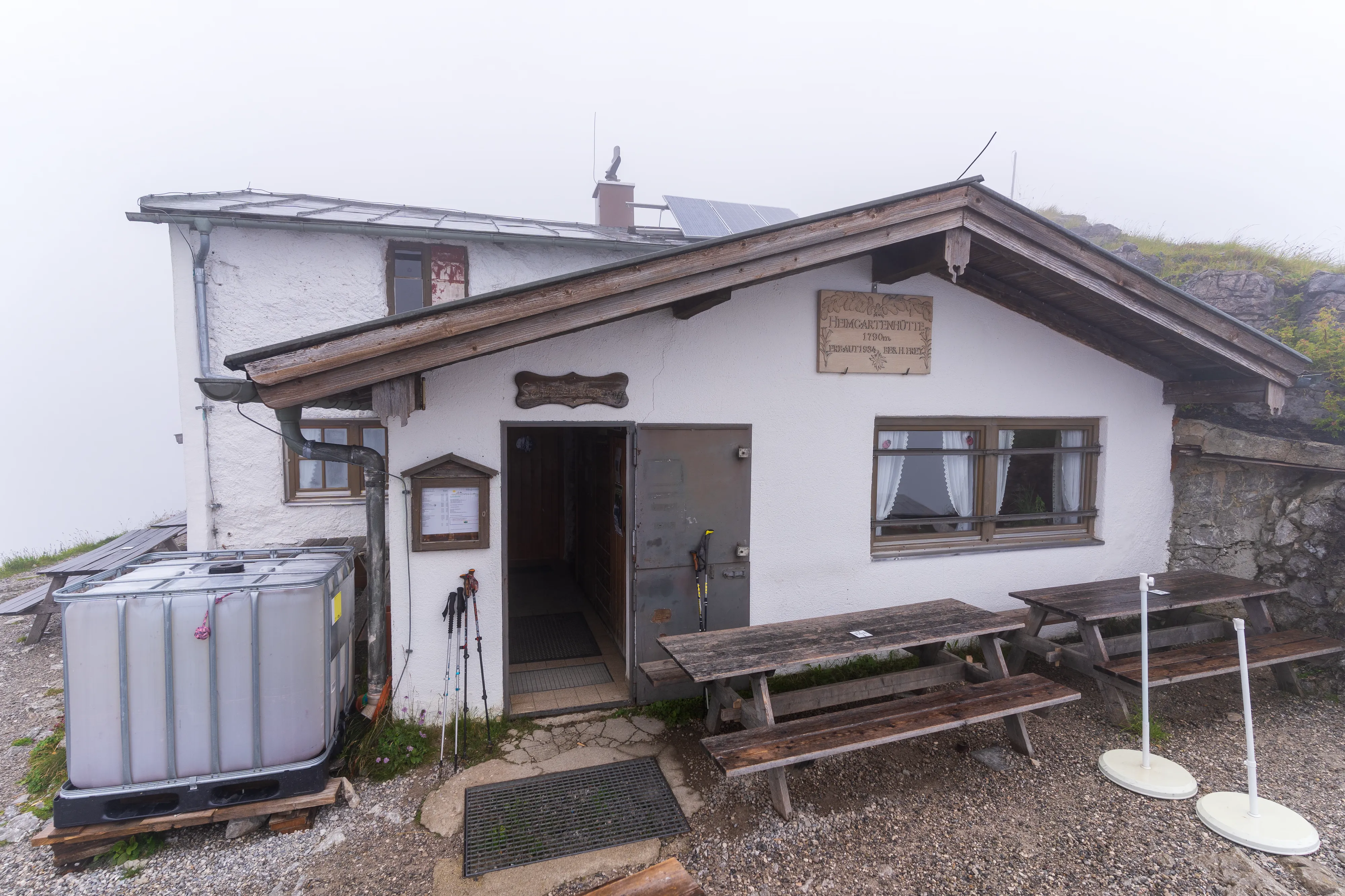 Am Heimgarten angekommen wird das Wetter wieder ekliger - perfektes Timing also für eine stärkende Suppe und einen Kaiserschmarrn in der Heimgartenhütte. Mit 1791 m zwar nicht sonderlich hoch gelegen, so ist dies dennoch der höchste Punkt auf der Tour. Die charmante Hütte hat lediglich ein kleines “Esszimmer”, welches nun gut besucht ist - trotz des schlechten Wetters sind einige Bergsteiger unterwegs bzw. sitzen in einer der Hütten. Beim Abmarsch zeigt das Außenthermometer knackige 5° an. Das deckt sich mit der Vorhersage und ist doch erstaunlich kalt für eine Wanderung auf unter 2000 m Höhe im August.