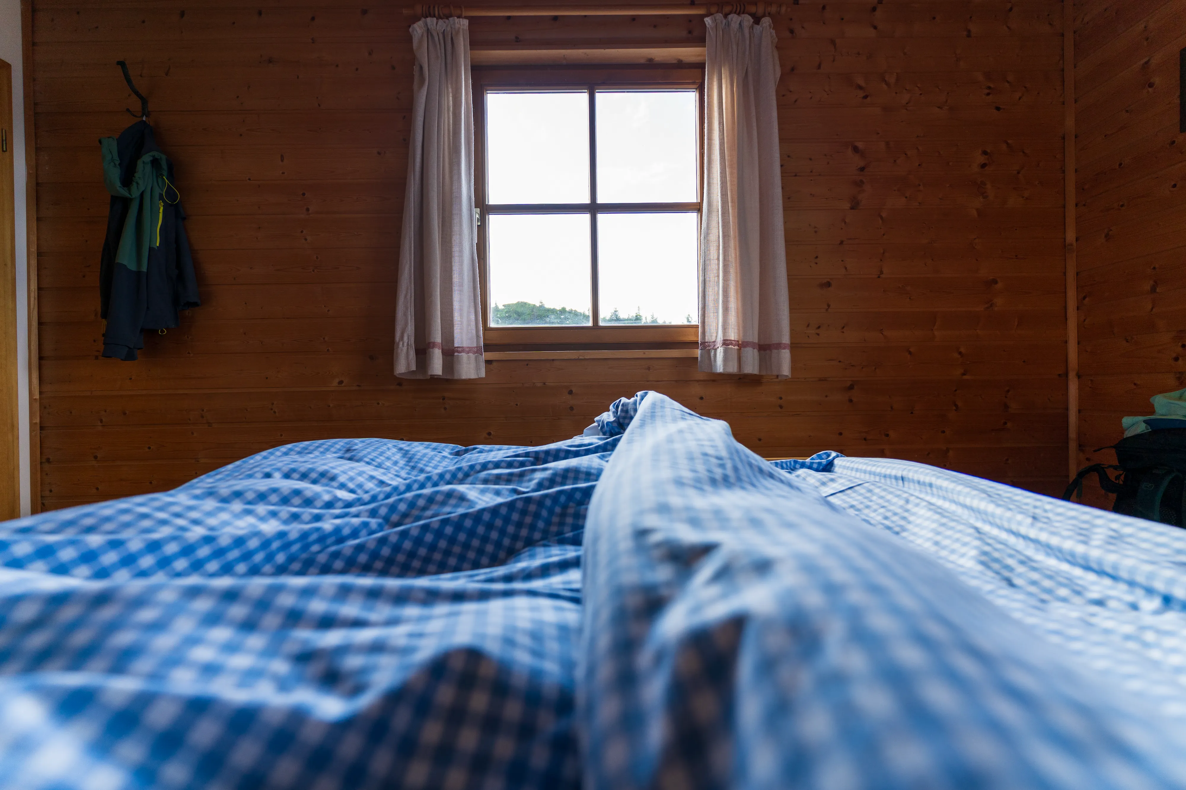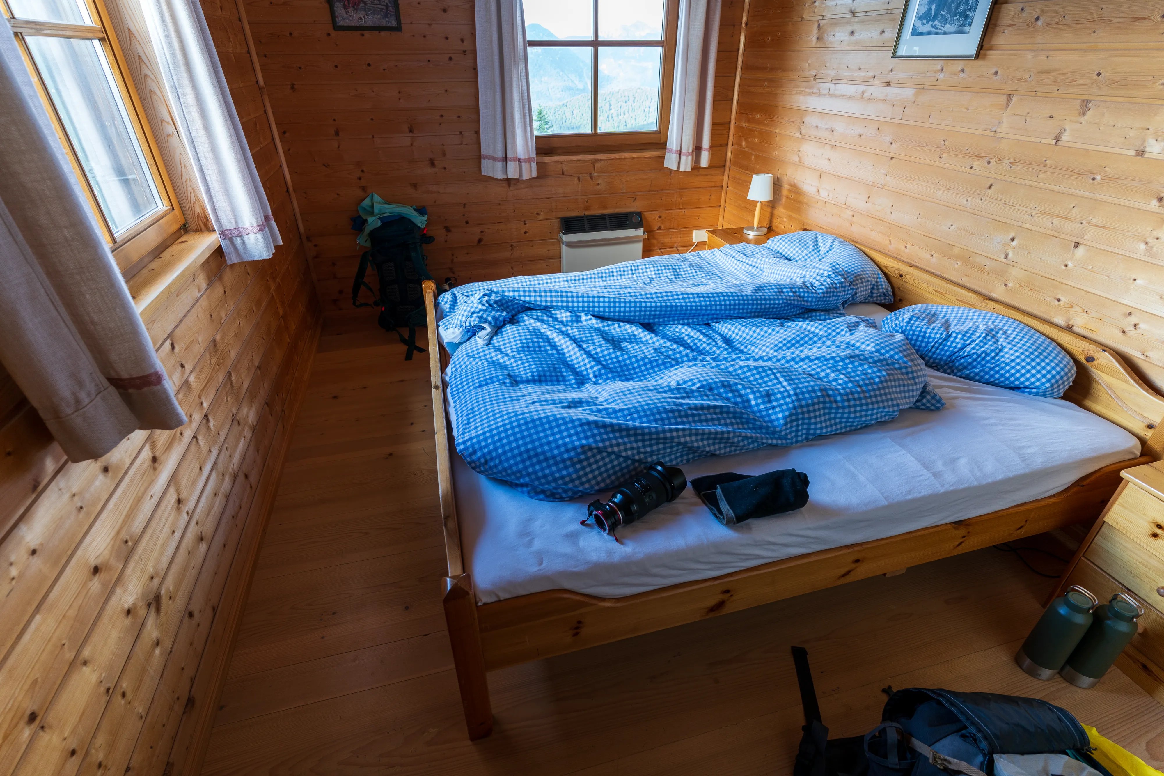 An der Hütte angekommen beziehen wir unser Doppelzimmer - das haben wir uns gegönnt. Wir haben Glück, wir bekommen ein Eckzimmer mit zwei Fenstern und haben sowohl einen Blick auf den Walchensee als auch auf den Fahrenbergkopf.