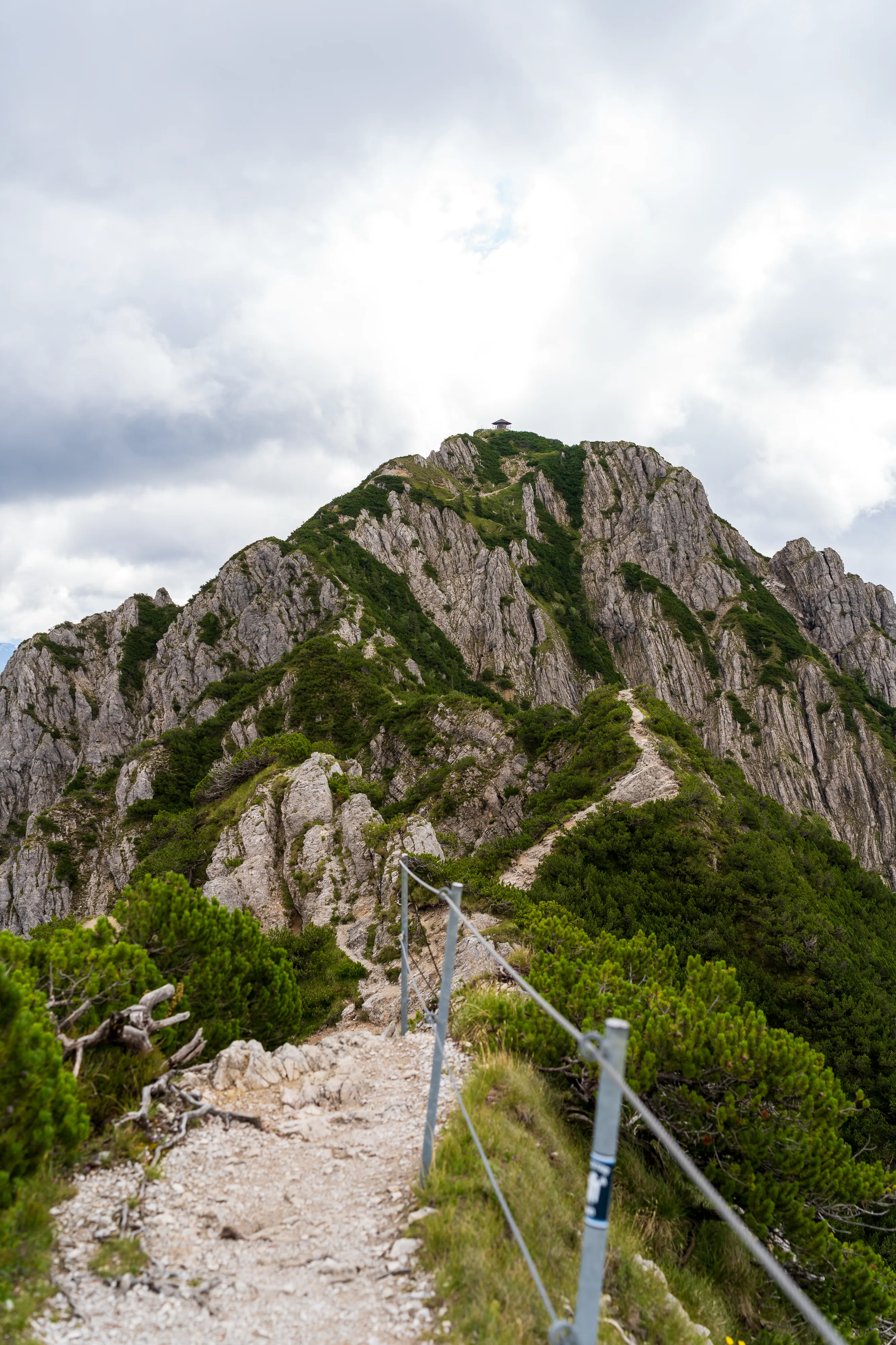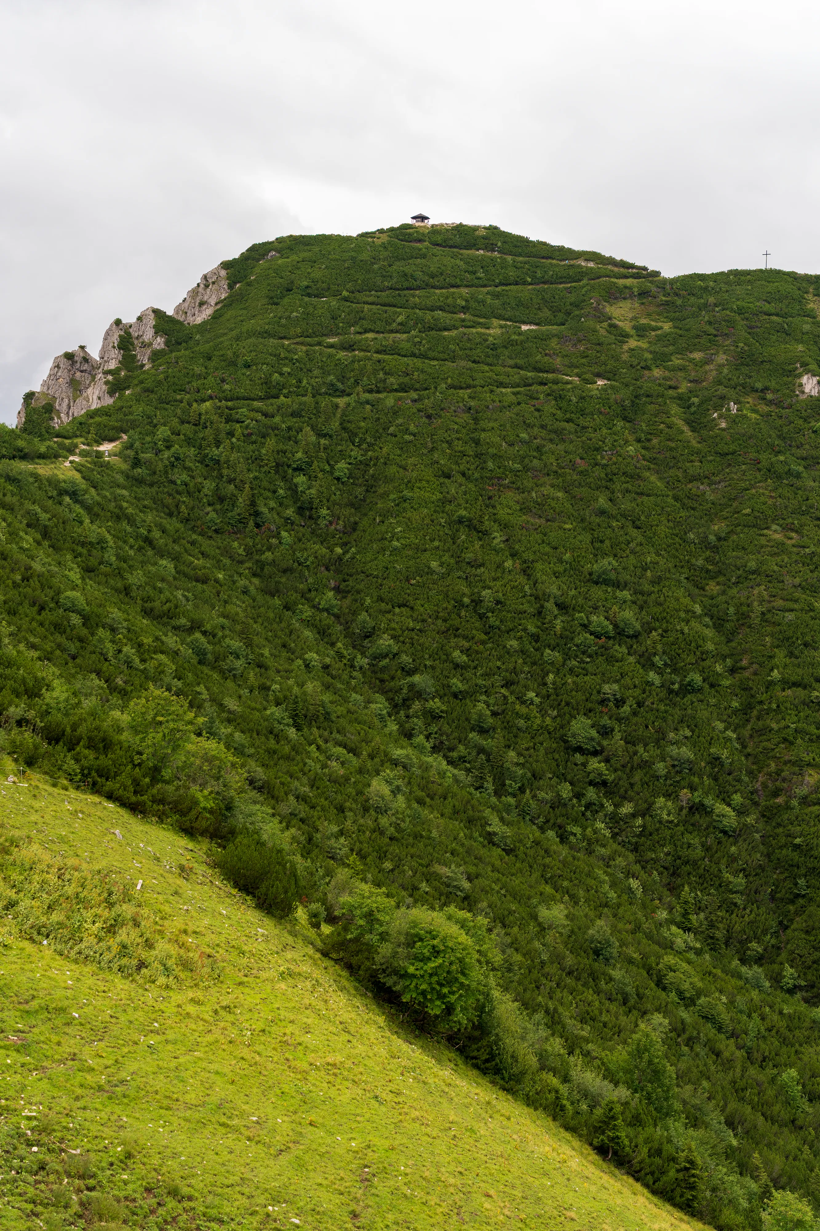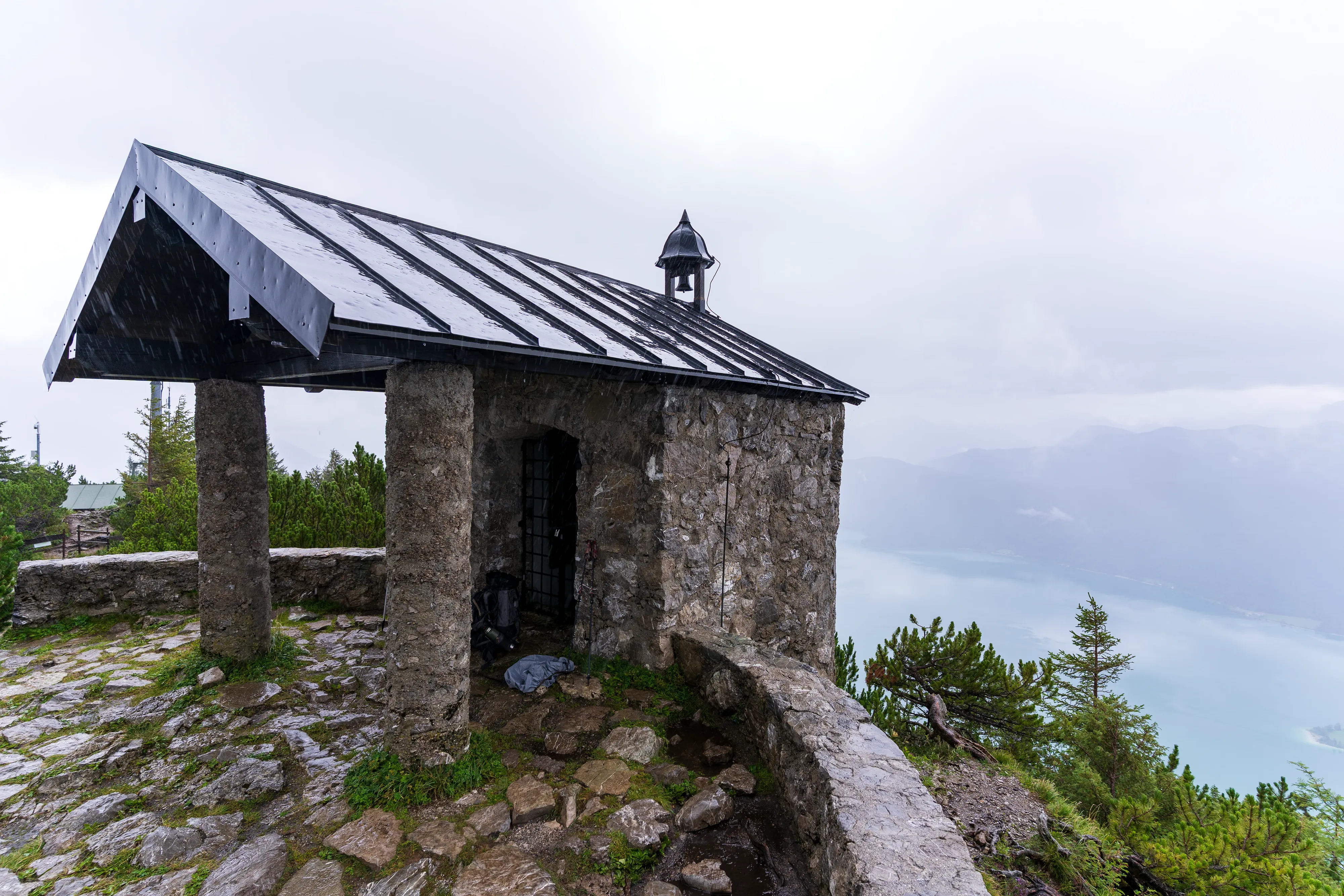 Allerdings scheint diese “Gutwetterphase” tatsächlich nur bis kurz nach unserem Aufbruch zu halten, dann regnet es wieder weiter. Den kurzen Umweg auf den Gipfel des Fahrenbergkopfs bzw. zu der kleinen Kapelle dort, welche dem vernichtenden Brand des Herzogstandhauses 1992 gedenkt, machen wir im Regen. Den Aufstieg zum Gipfel des Herzogstands ebenfalls.