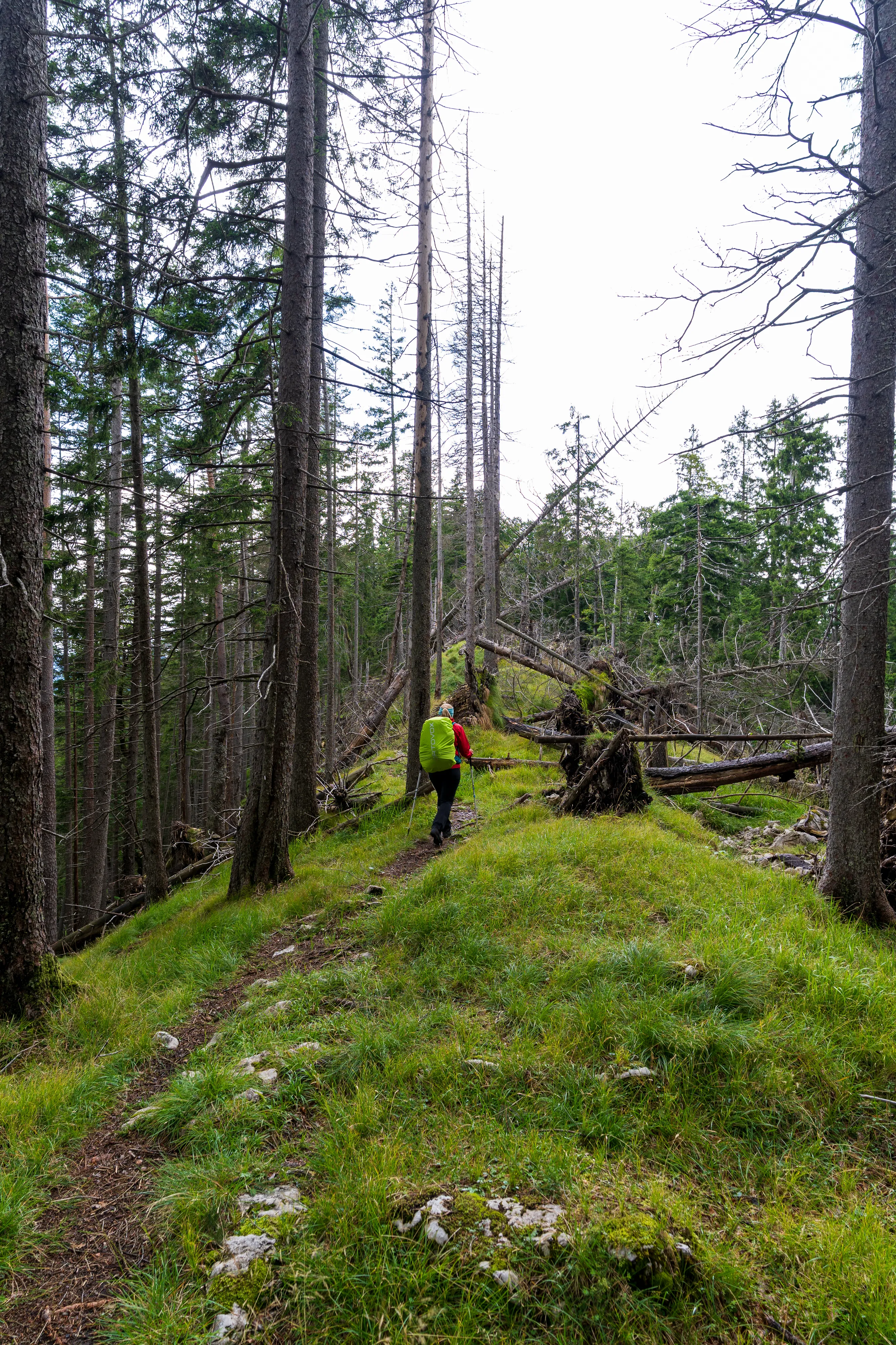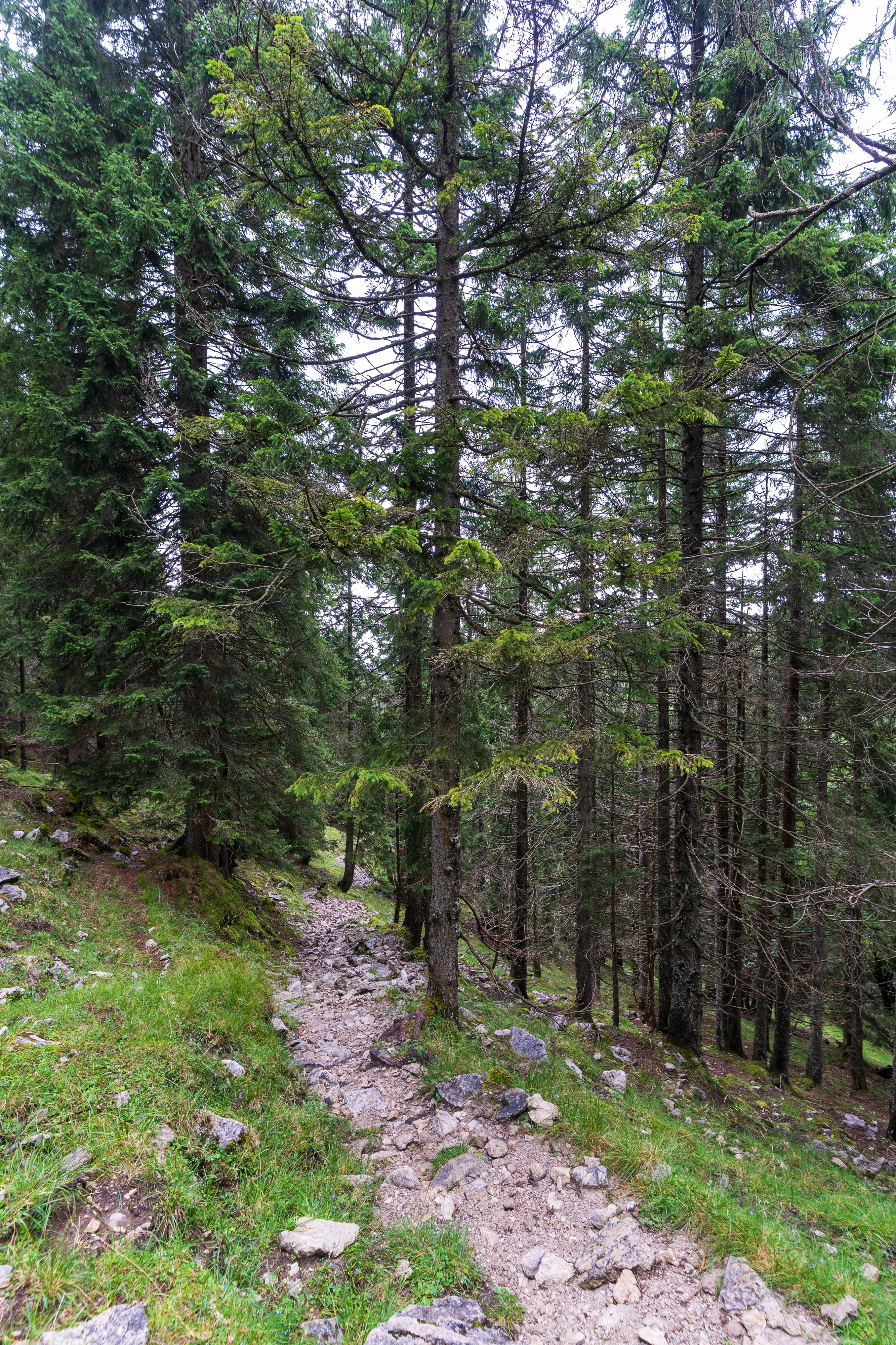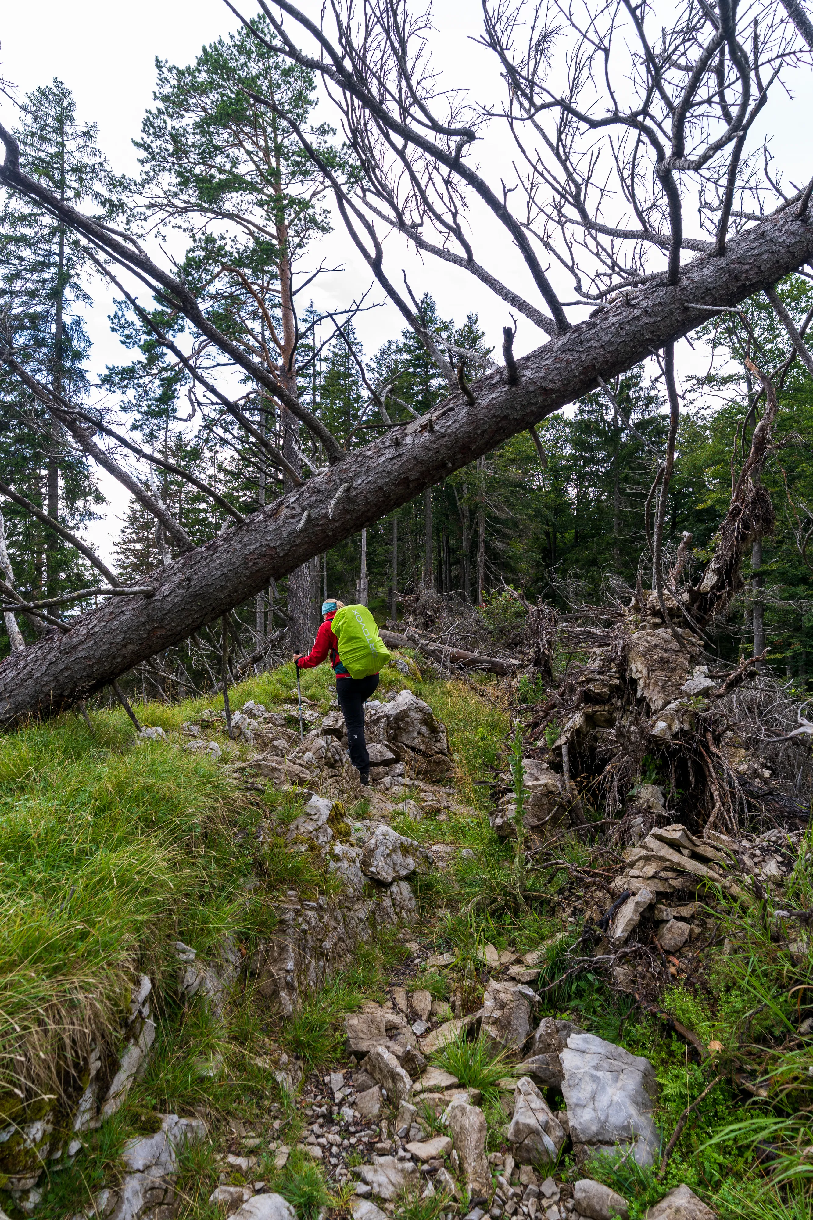 Die Strecke verläuft nun weniger spektakulär weiter am Grat entlang und folgt dann für ein Stück dem Maxweg bevor wir auf einem offensichtlich wenig begangenen Nebenweg über den Ölrain einem weiteren Grat folgend langsam über Osterfeuerspitze, Osterfeuerköpfl und Osterfeuerberg absteigen. Der Weg ist abwechslungsreich, führt über eine Schafweide, auf welcher wir ein einsames Schaf überraschen, und unter bzw. über vielen umgestürzten Bäumen entlang. Es ergeben sich einige schöne Blicke ins Tal auf Ohlstadt und Murnau im Norden aber auch auf Garmisch-Partenkirchen und die Zugspitze im Süden. Wir haben sogar das Glück, eine wilde Gams zu sehen - lustigerweise fast genau neben dem Schild, das zu deren Schutz um Nichtbetretung mancher Waldgebiete bittet.