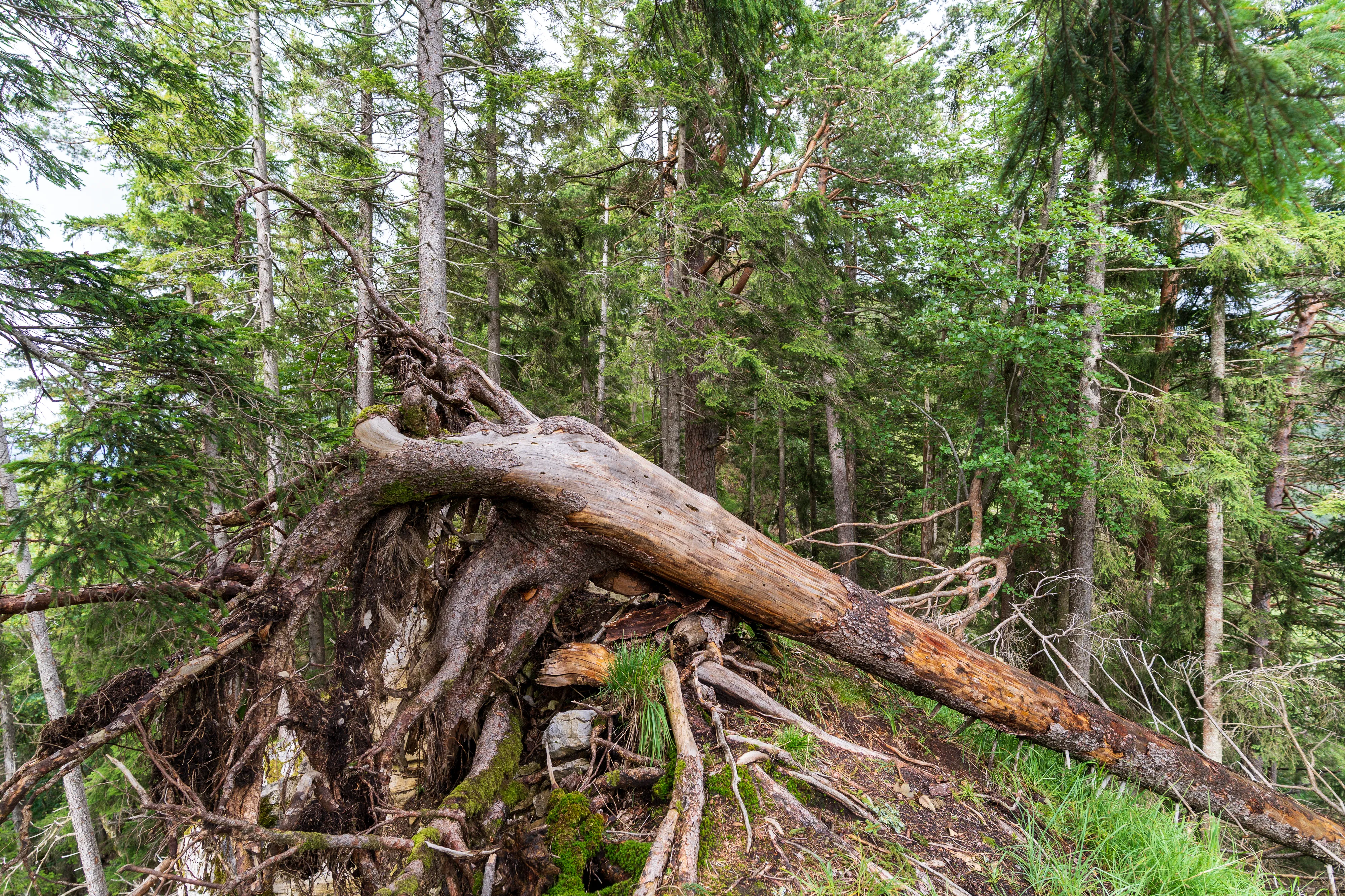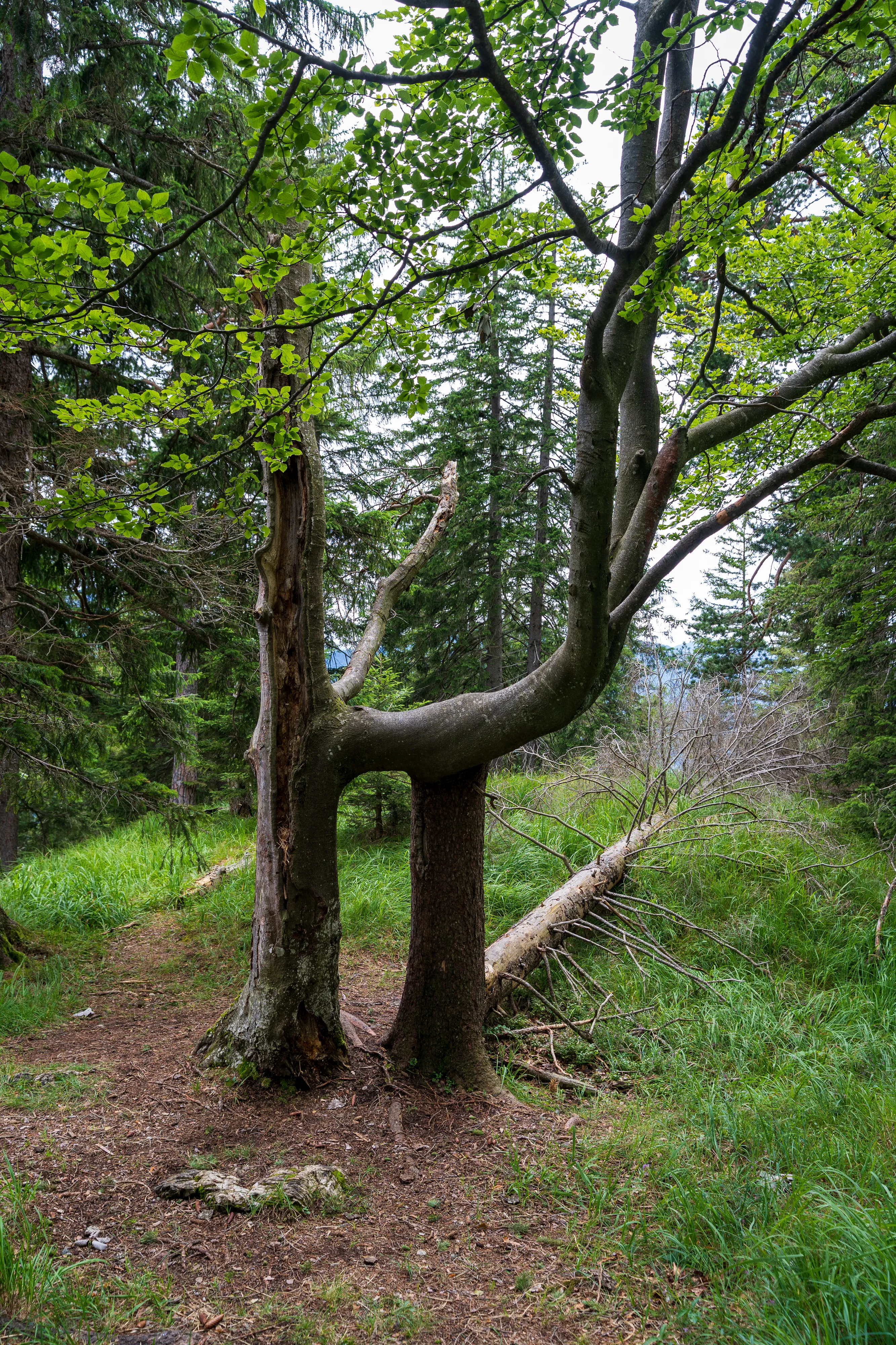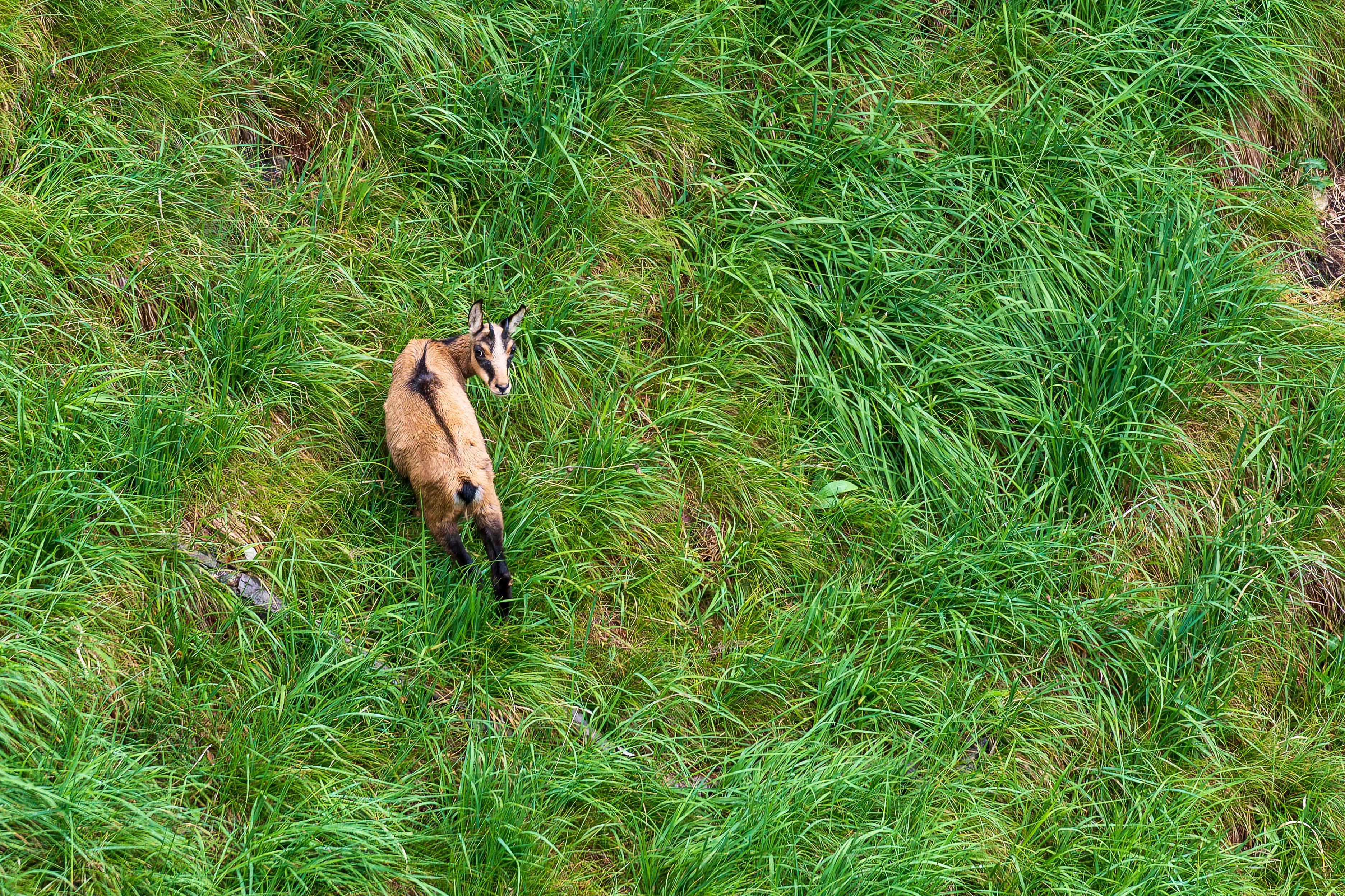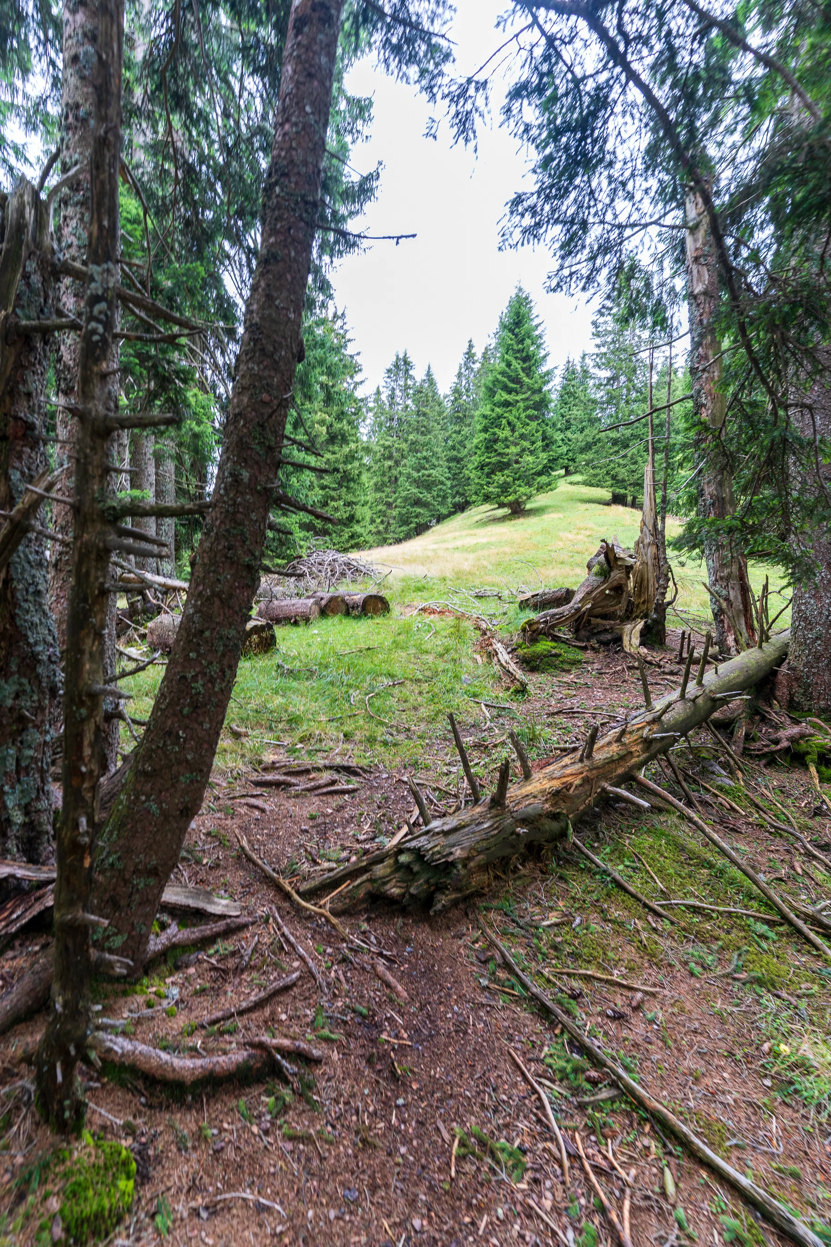 Die Strecke verläuft nun weniger spektakulär weiter am Grat entlang und folgt dann für ein Stück dem Maxweg bevor wir auf einem offensichtlich wenig begangenen Nebenweg über den Ölrain einem weiteren Grat folgend langsam über Osterfeuerspitze, Osterfeuerköpfl und Osterfeuerberg absteigen. Der Weg ist abwechslungsreich, führt über eine Schafweide, auf welcher wir ein einsames Schaf überraschen, und unter bzw. über vielen umgestürzten Bäumen entlang. Es ergeben sich einige schöne Blicke ins Tal auf Ohlstadt und Murnau im Norden aber auch auf Garmisch-Partenkirchen und die Zugspitze im Süden. Wir haben sogar das Glück, eine wilde Gams zu sehen - lustigerweise fast genau neben dem Schild, das zu deren Schutz um Nichtbetretung mancher Waldgebiete bittet.
