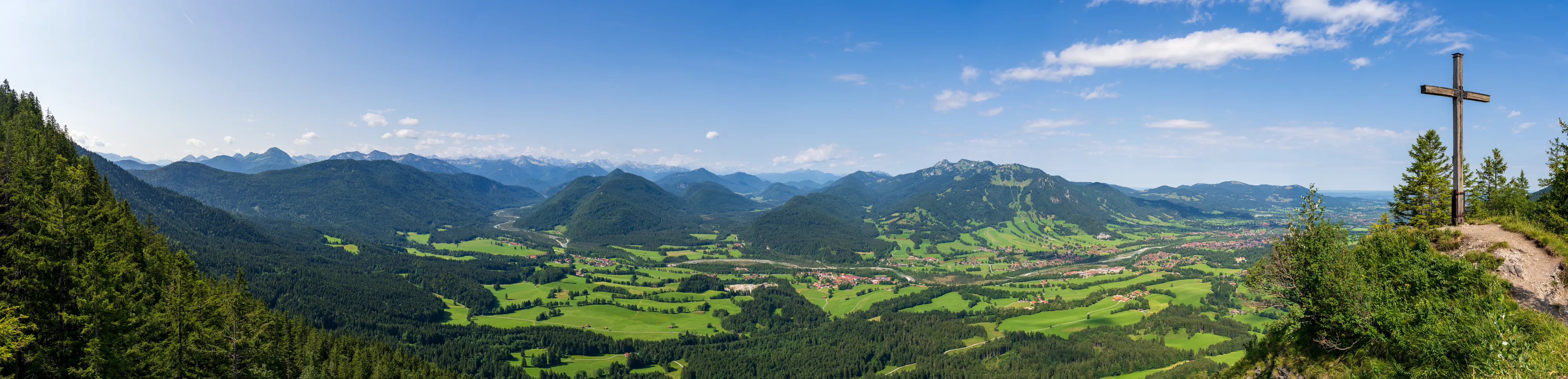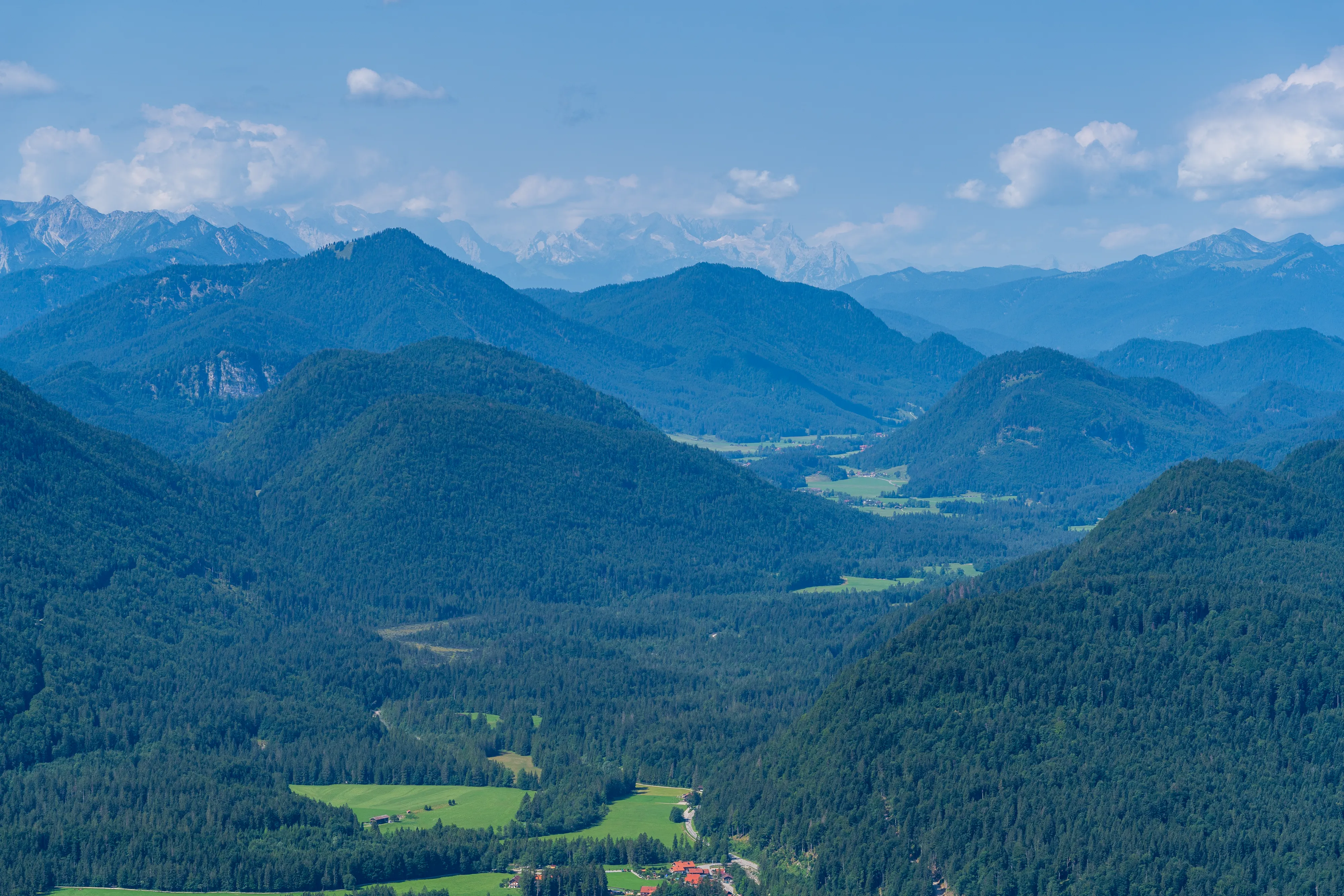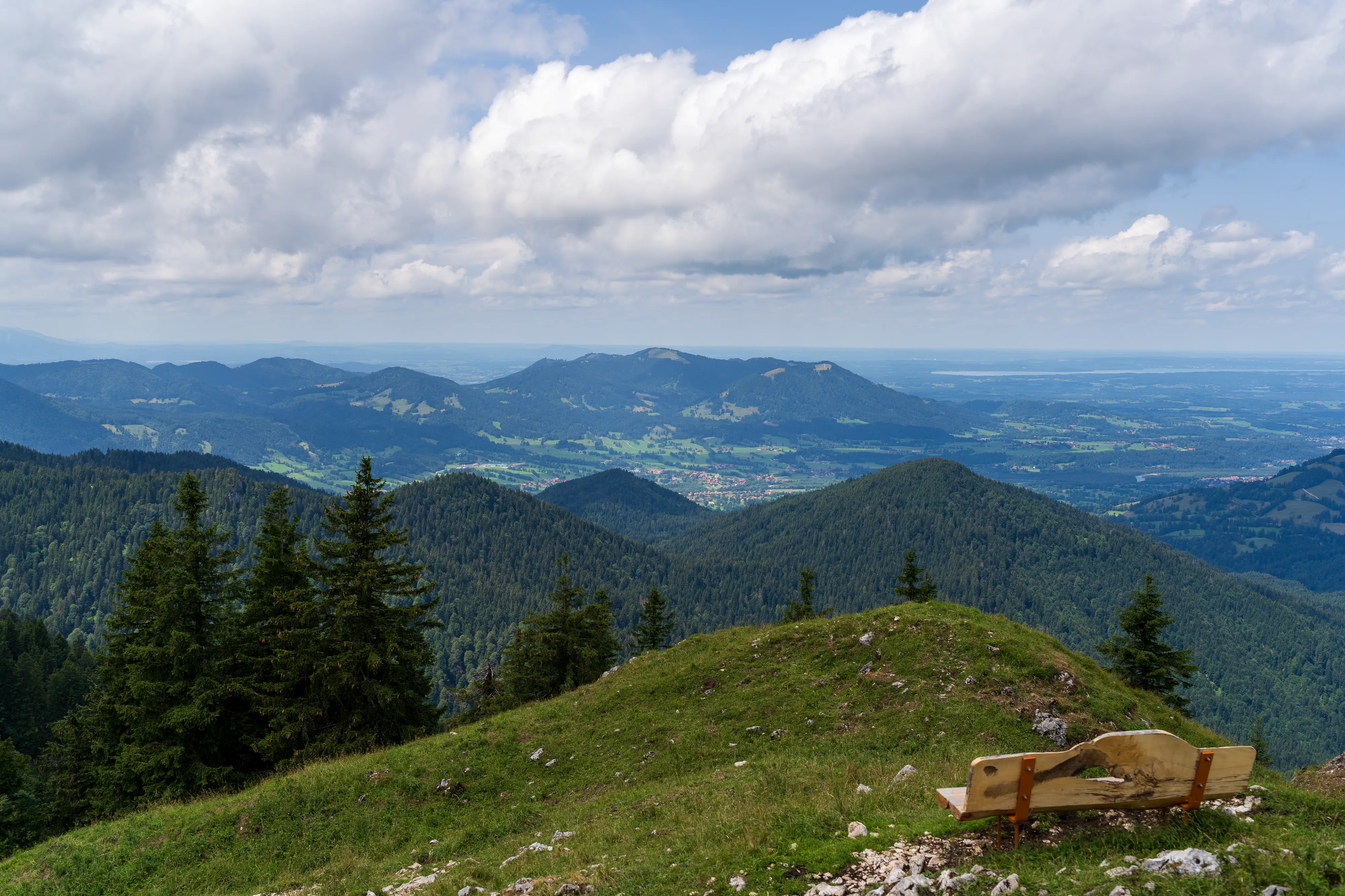 Man blickt auf das gegenüberliegende Brauneck, auf dem just an diesem Wochenende ein Gleitschirm-Flieger-Festival stattfindet. Mit zunehmender Thermik sieht man auch immer mehr Gleitschirme am Himmel. Auch die Fernsicht ist gut - so kann man zumindest den unteren Teil der Zugspitze und viele Gipfel des Karwendelgebirges sehen.