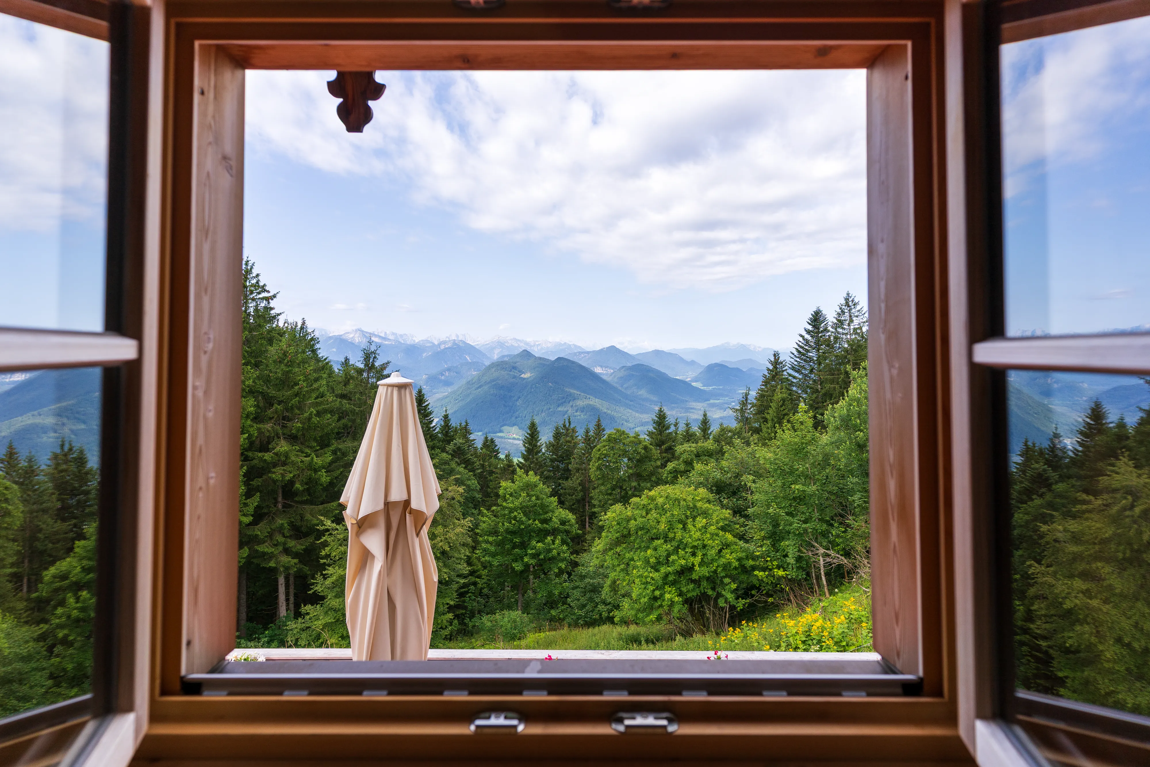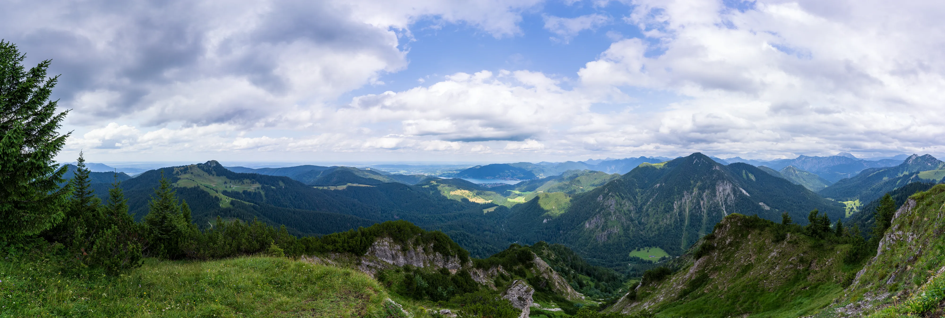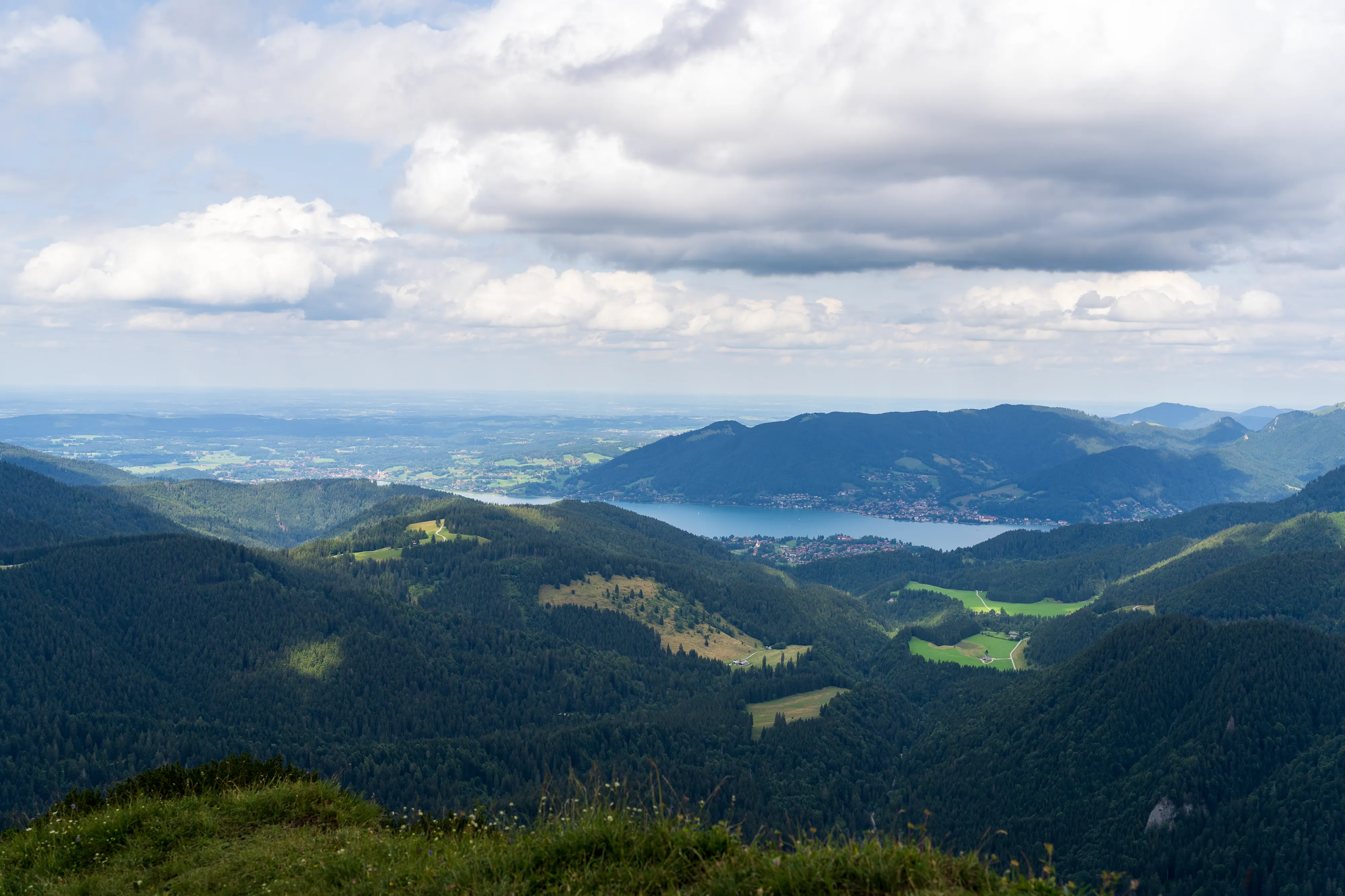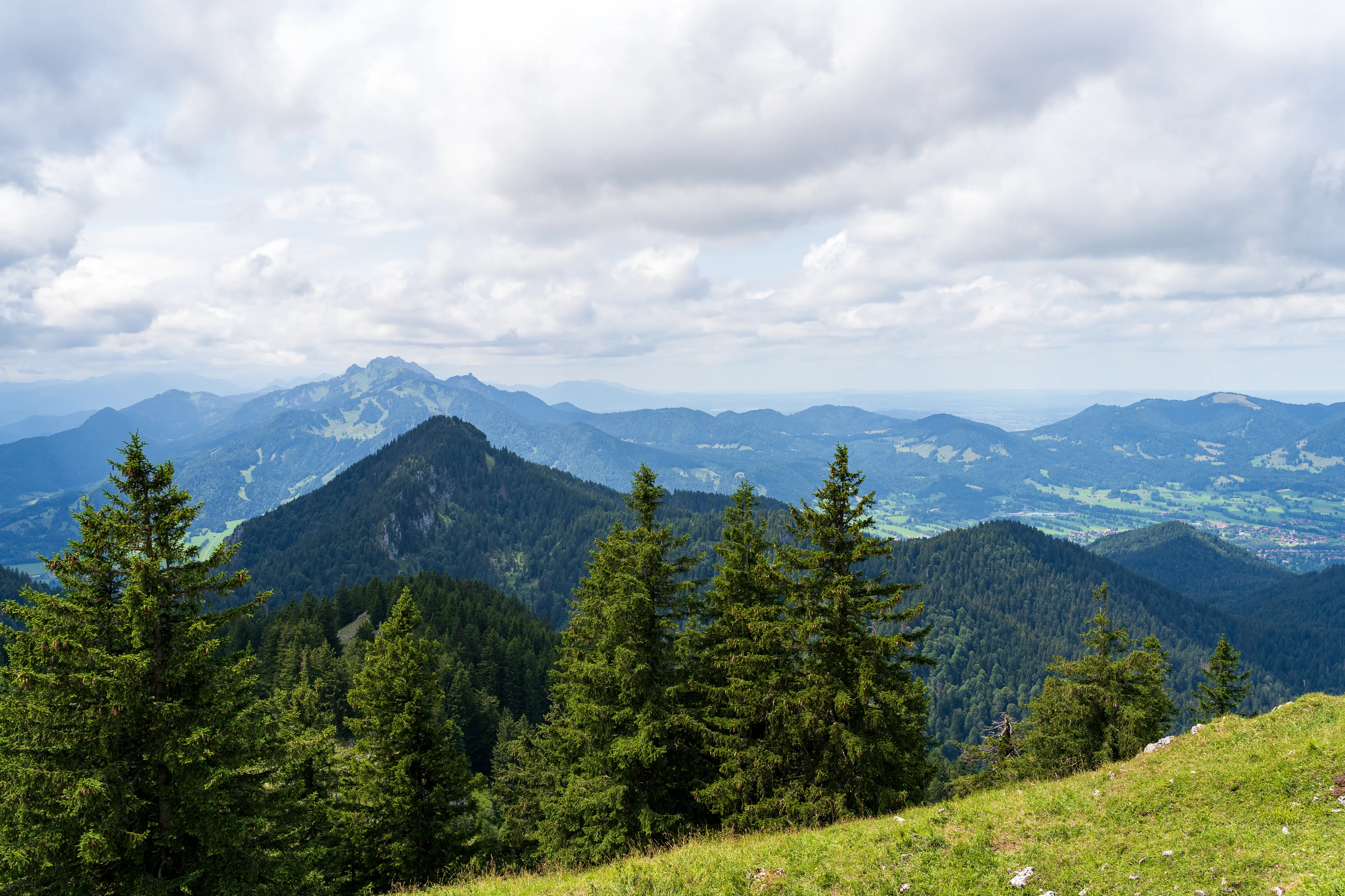 Man blickt auf das gegenüberliegende Brauneck, auf dem just an diesem Wochenende ein Gleitschirm-Flieger-Festival stattfindet. Mit zunehmender Thermik sieht man auch immer mehr Gleitschirme am Himmel. Auch die Fernsicht ist gut - so kann man zumindest den unteren Teil der Zugspitze und viele Gipfel des Karwendelgebirges sehen.