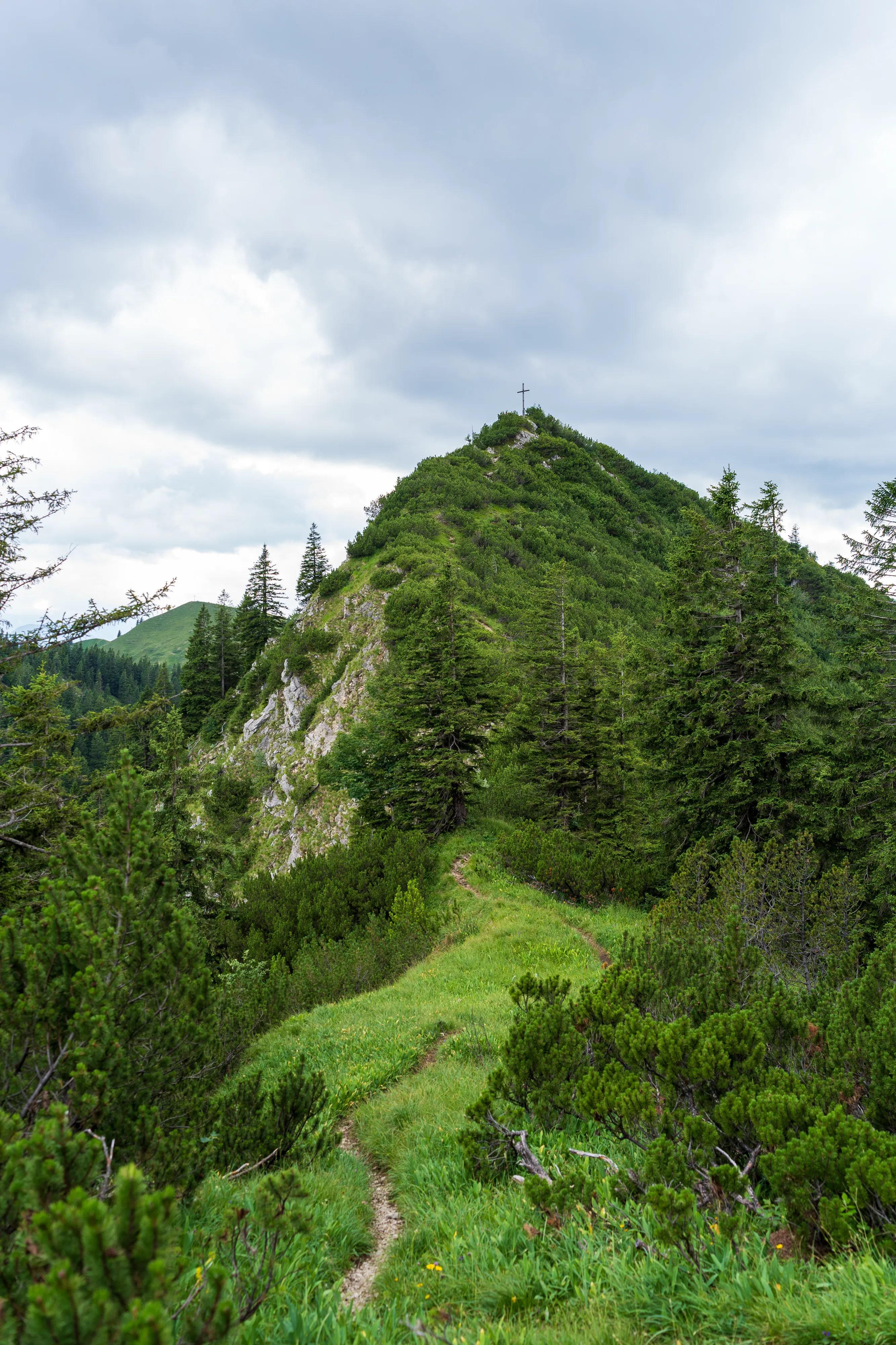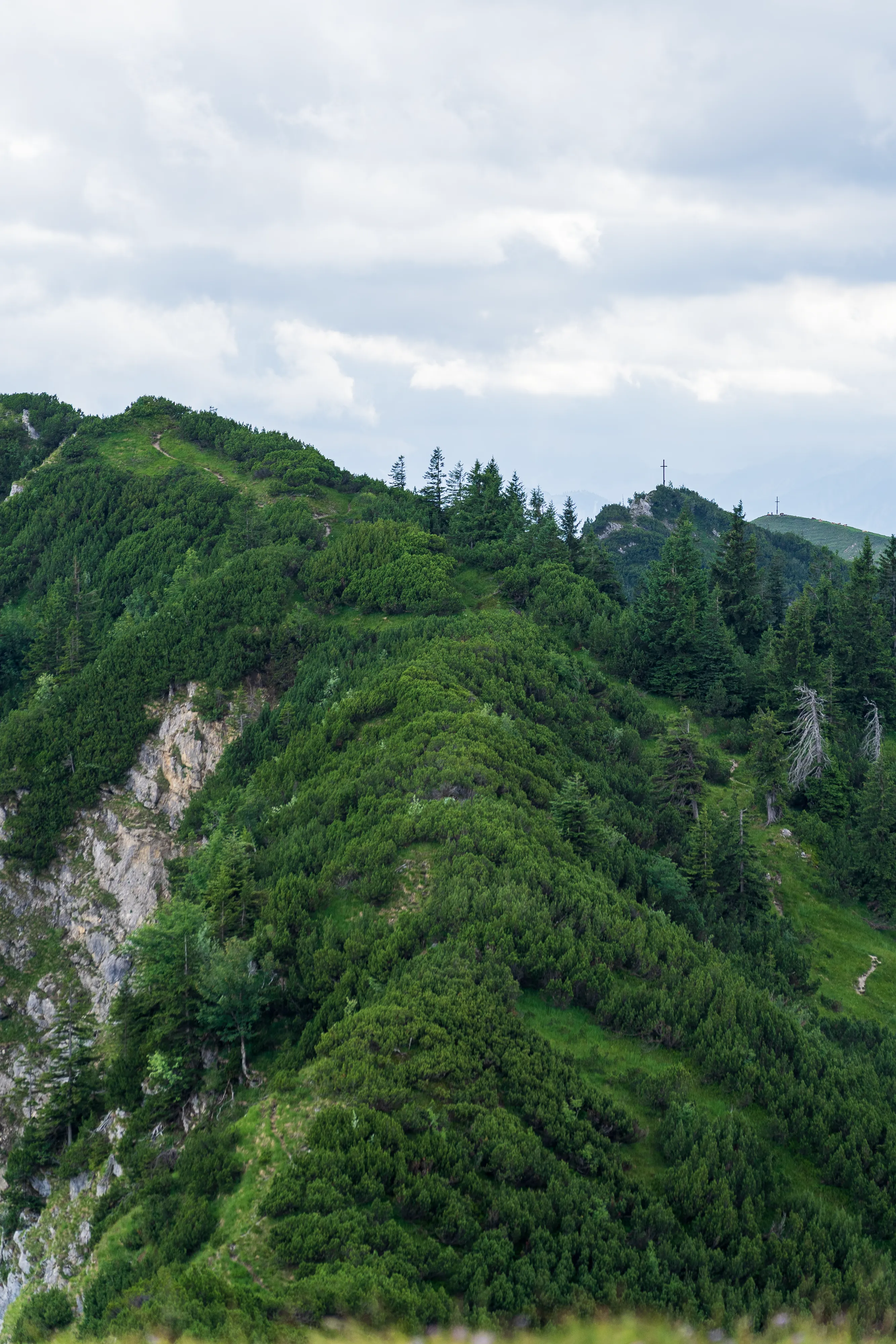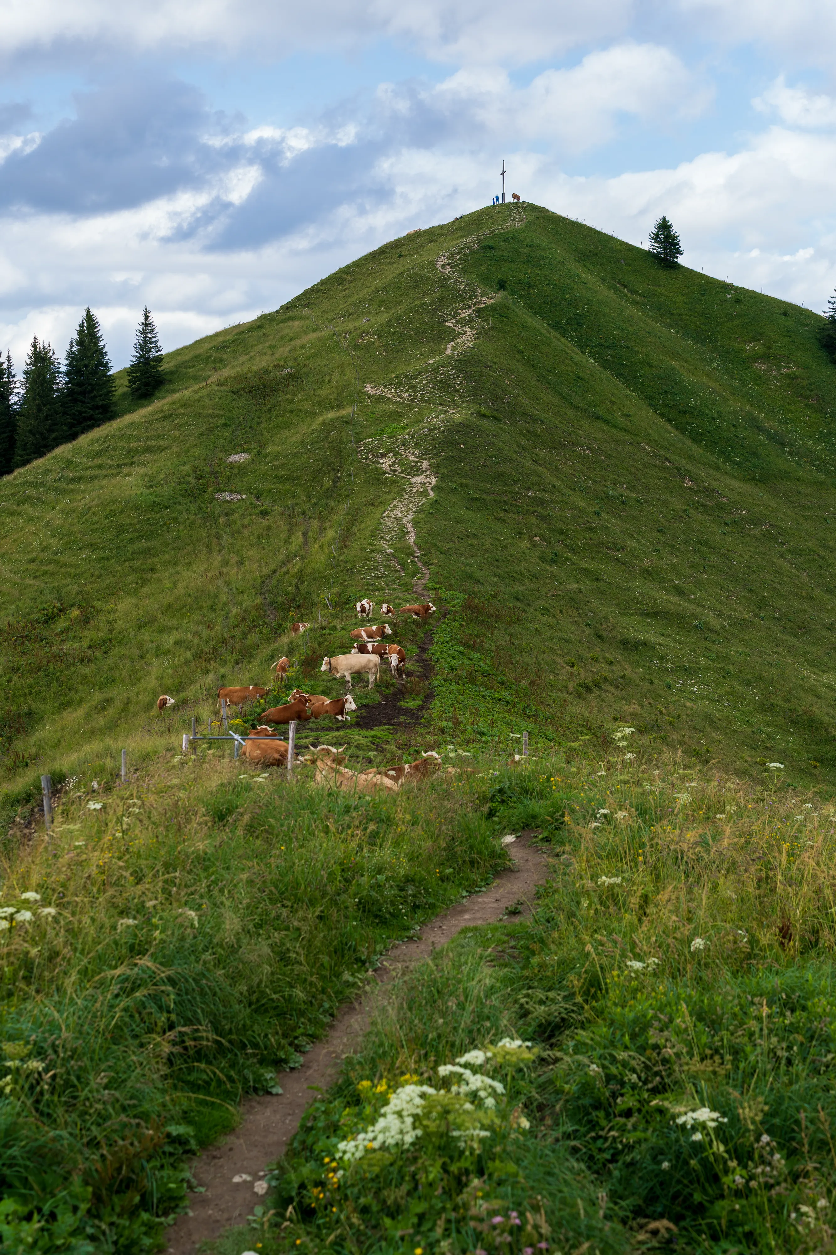 Nachdem man vom Fockenstein zum Hirschtal-Sattel abgestiegen ist, geht es nochmal steil zum Kampen mit seinen vielen, am Grat aufgereihten, Gipfeln hinauf. Diesen wandert man dann auf einem teils recht schmalen und exponierten Pfad entlang, quert einige weitere Rinderweiden und umgeht Gruppen von Weidevieh, das es sich auf dem Weg bequem gemacht hat, bevor man schließlich zur Lenggrieser Hütte absteigt.