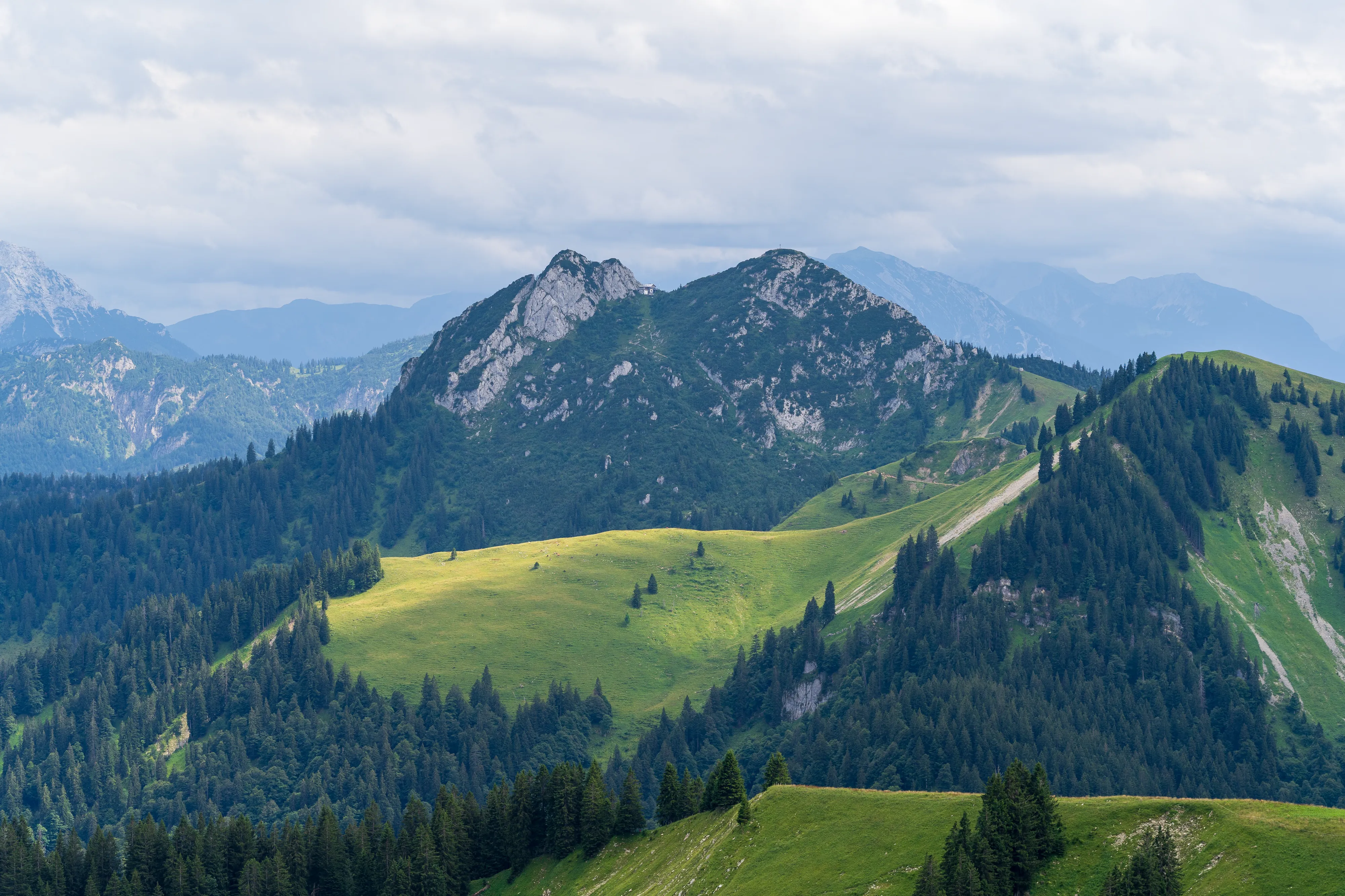 Blick vom Seekarkreuz. Bei genauem Hinsehen findet man in der Mulde das heutige Ziel: die Lenggrieser Hütte