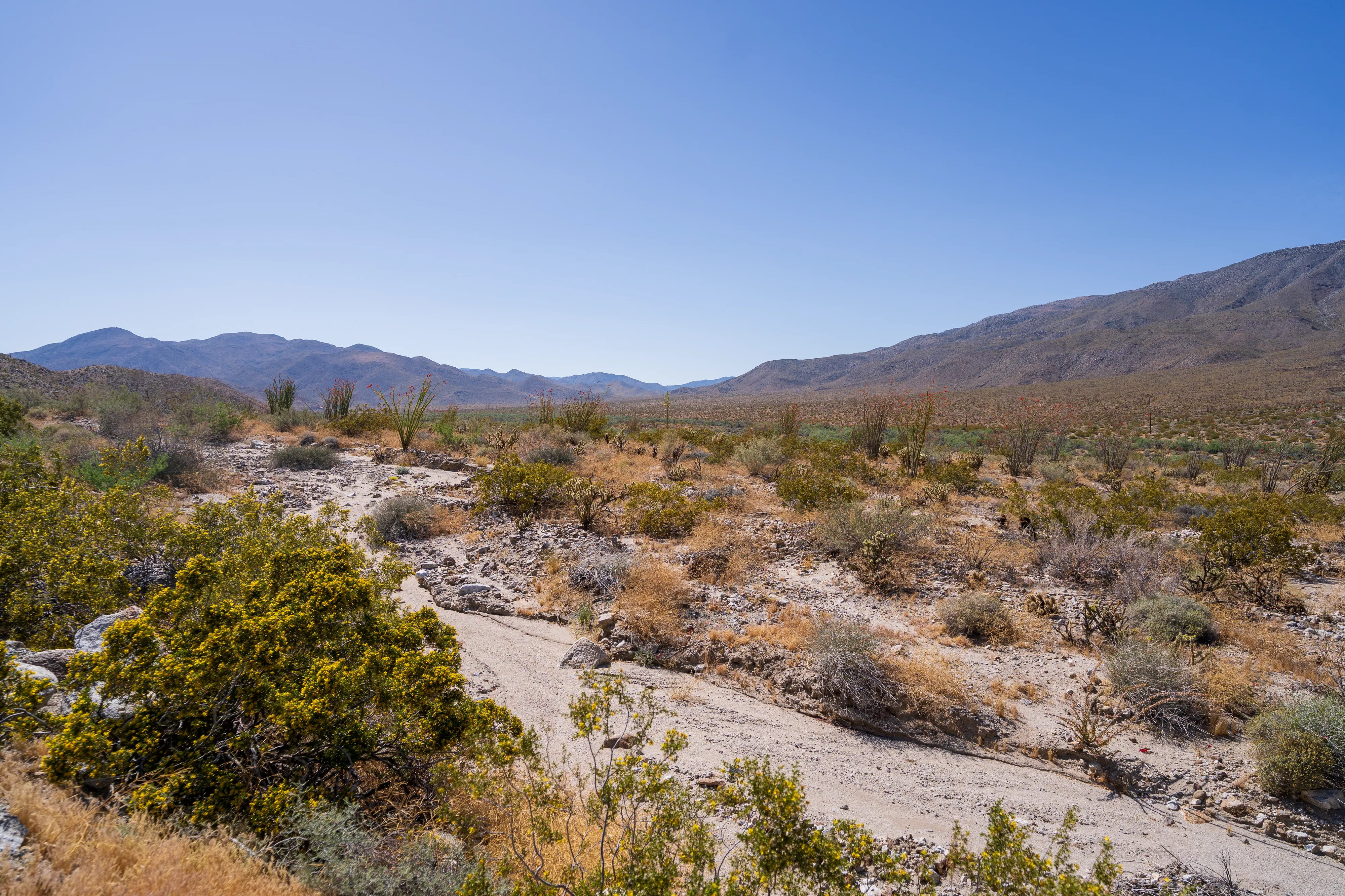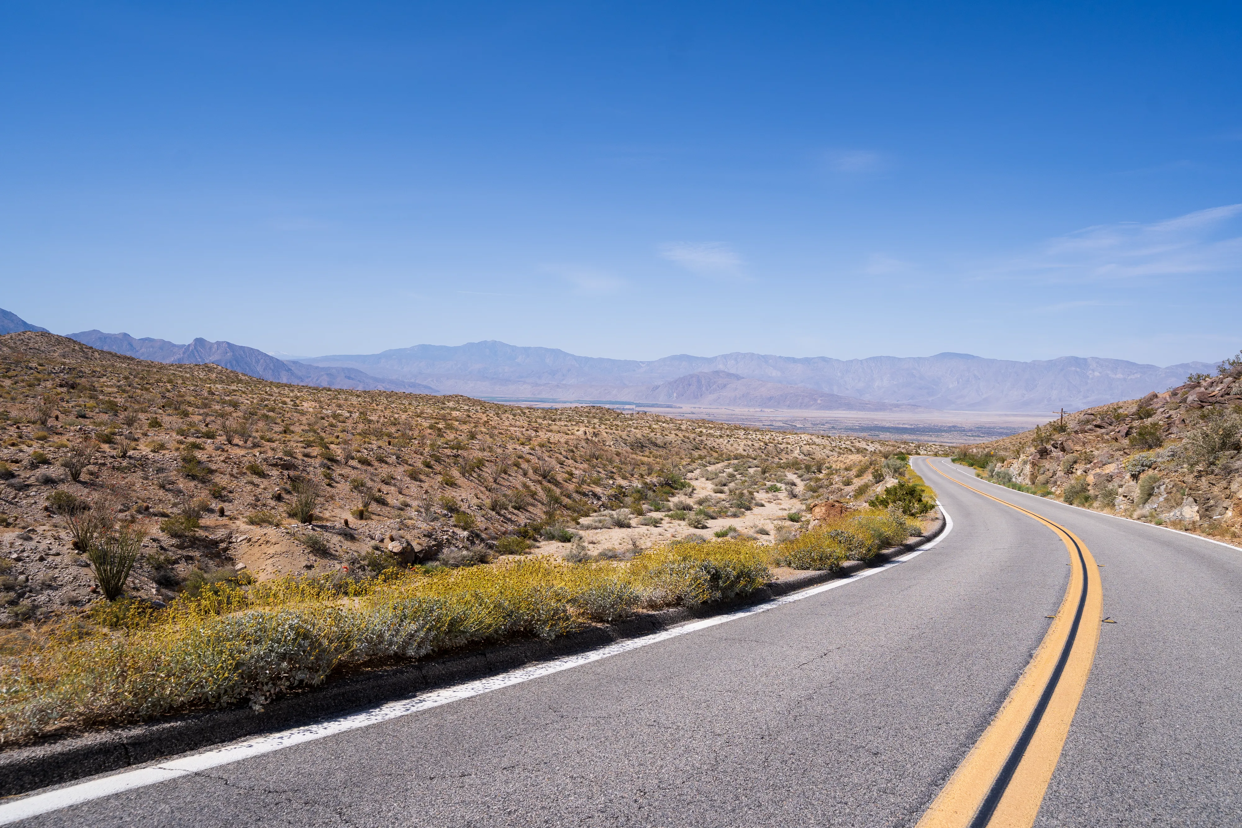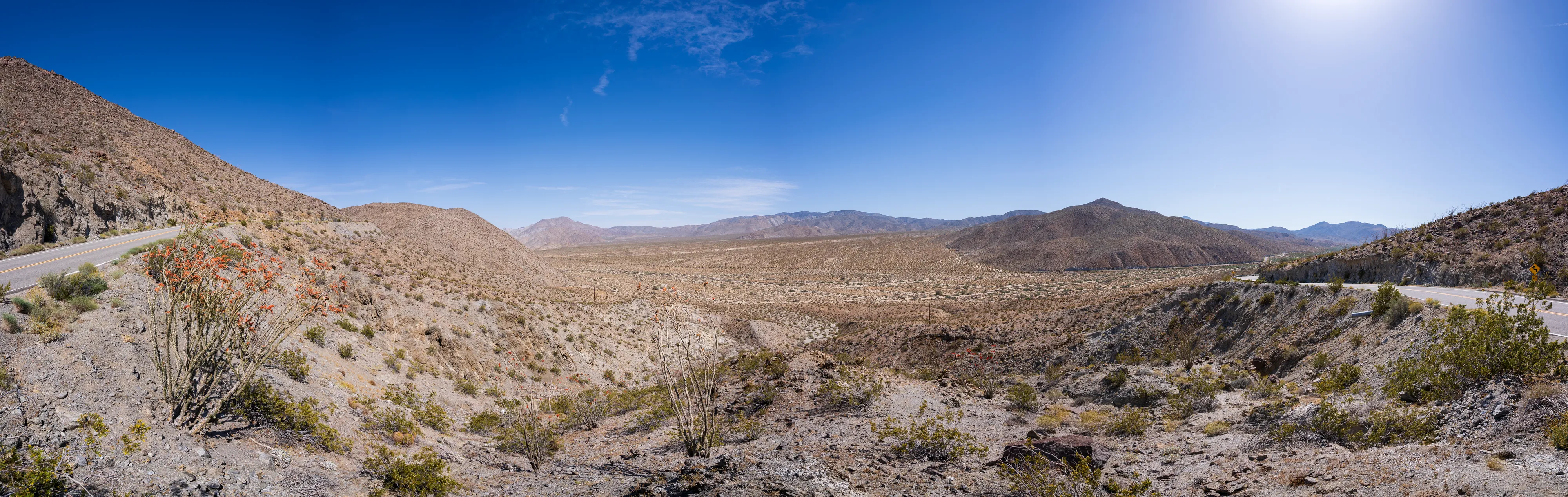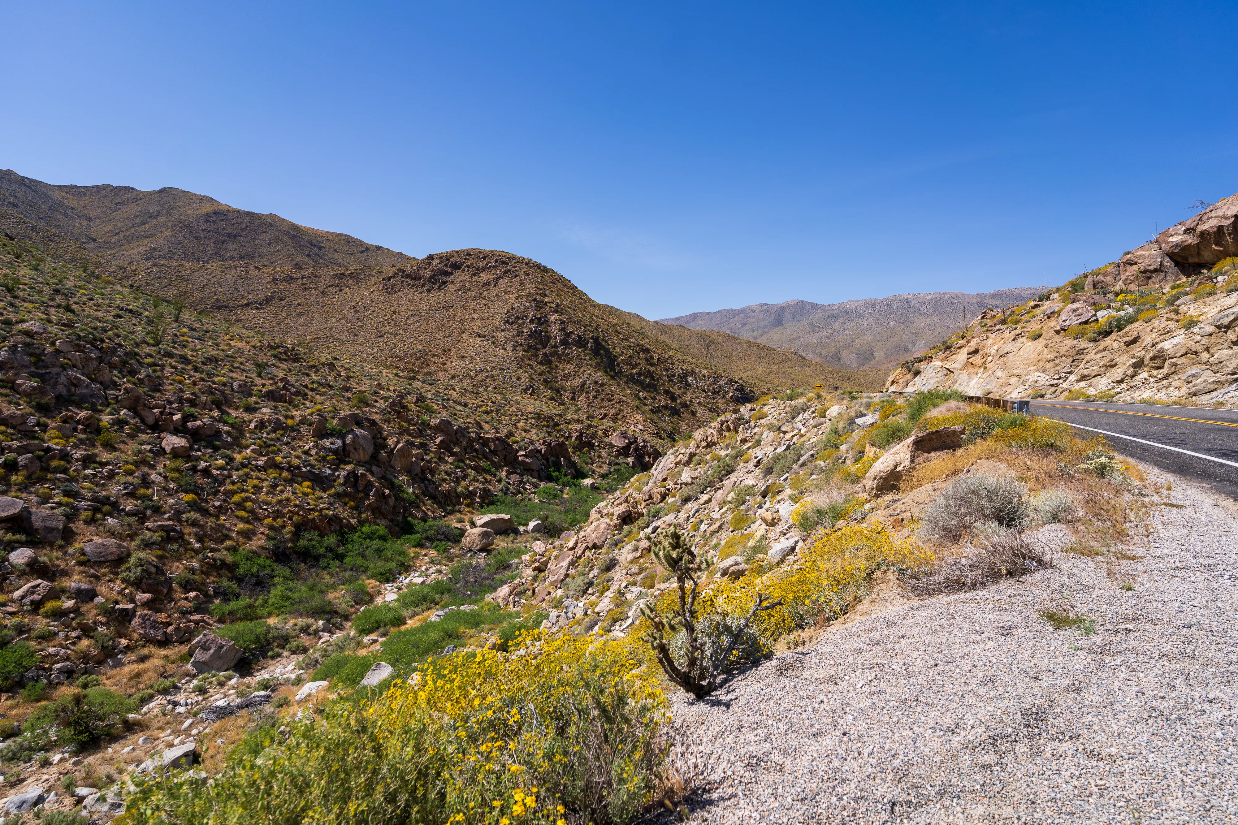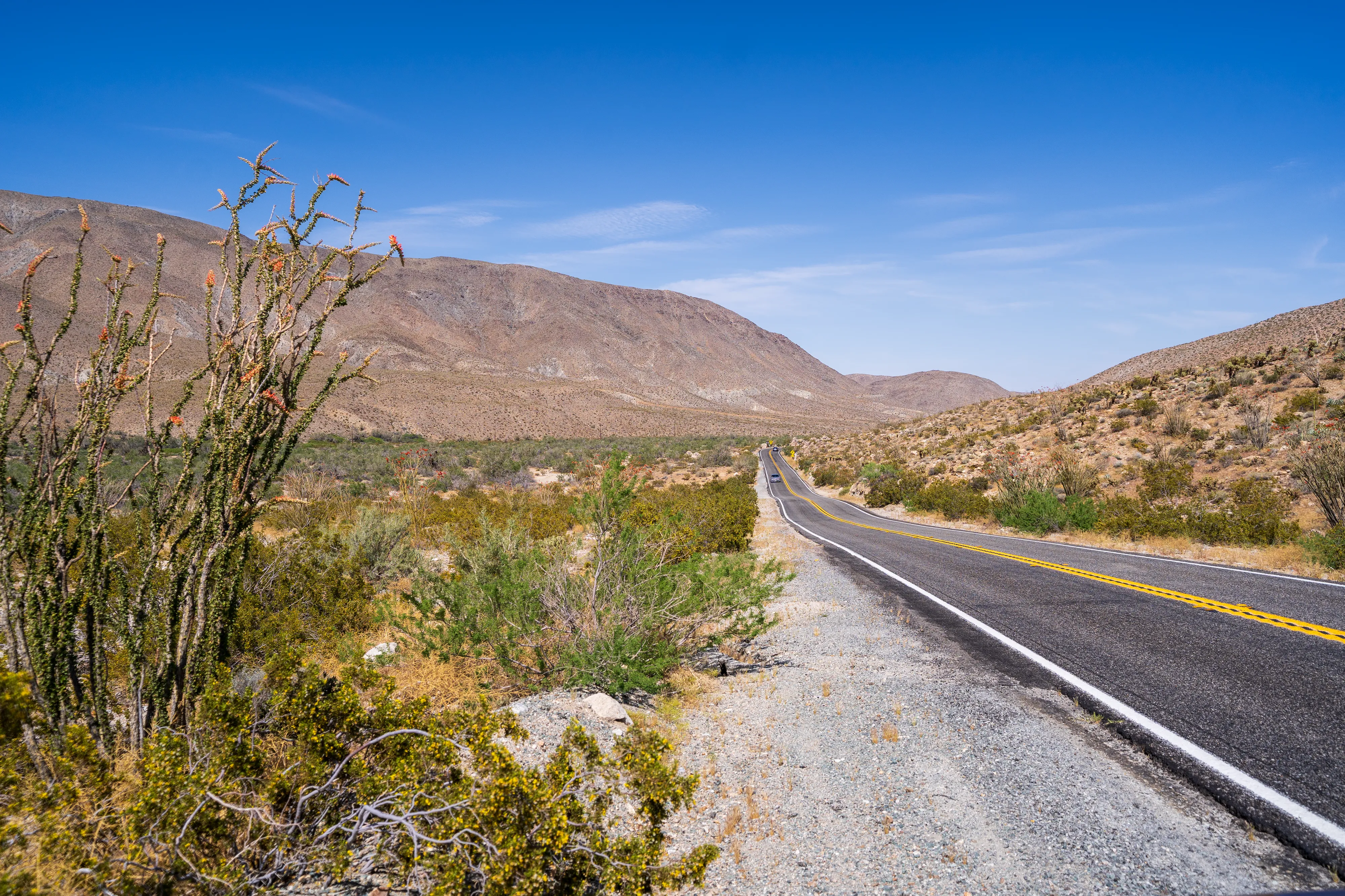 Mithilfe vieler Kurven schlängeln wir uns immer weiter hinab und die Temperaturen klettern auf über 30°, die Luft wird staubtrocken. Vor uns liegt eine riesige, von Bergen eingerahmte, Ebene mit nichts als felsigem Ödland (immerhin blühen auch hier ein paar Blumen und Sträucher!). Nach einige Zeit erreichen wir Borrego Springs im Borrego Valley, welches Teil der Sonora Desert ist. Mit grünen Plamen erscheint es uns wie eine Oase in der Wüste. Im Winter soll sich das Städtchen und seine Hotels auf grund des milden Klimas bei den Kaliforniern großer Beliebtheit erfreuen - jetzt, wo es auf den Sommer zugeht, ist es den meisten Touristen anscheinend zu heiß, denn viel ist nicht los.