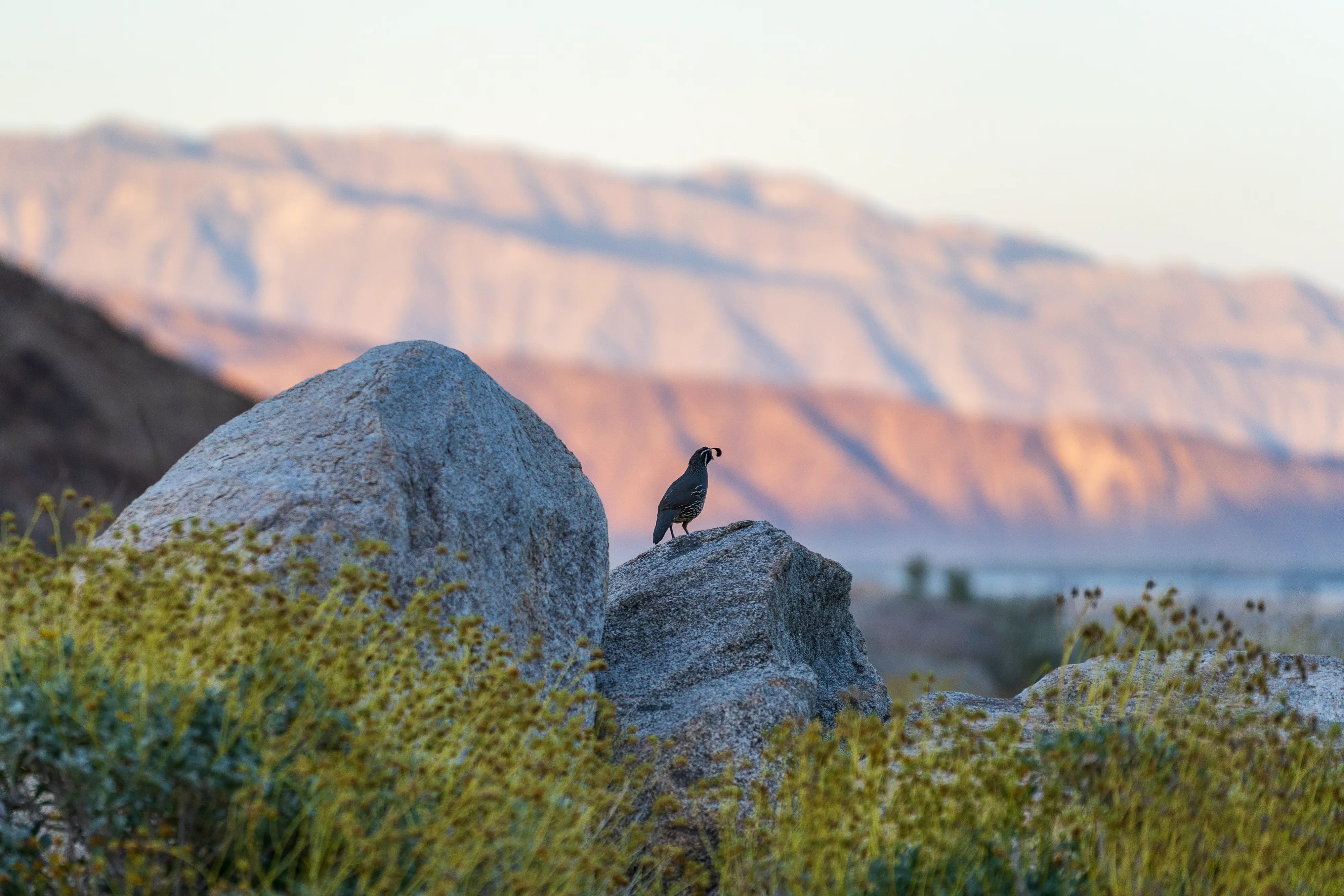 Der State Park zeigt, dass eine Wüste kein totes Ödland zu sein braucht - bzw. in den seltensten Fällen ist. Zwar gibt es, von den Palmen der Oase mal abgesehen, nur wenige große Pflanzen - dafür aber umso mehr Vögel, die morgens ein wahres Konzert veranstalten. Zur Freude des einen, zum Leid der anderen. Auch Kaninchen etc. sehen wir in der Nähe unseres Zelts.
