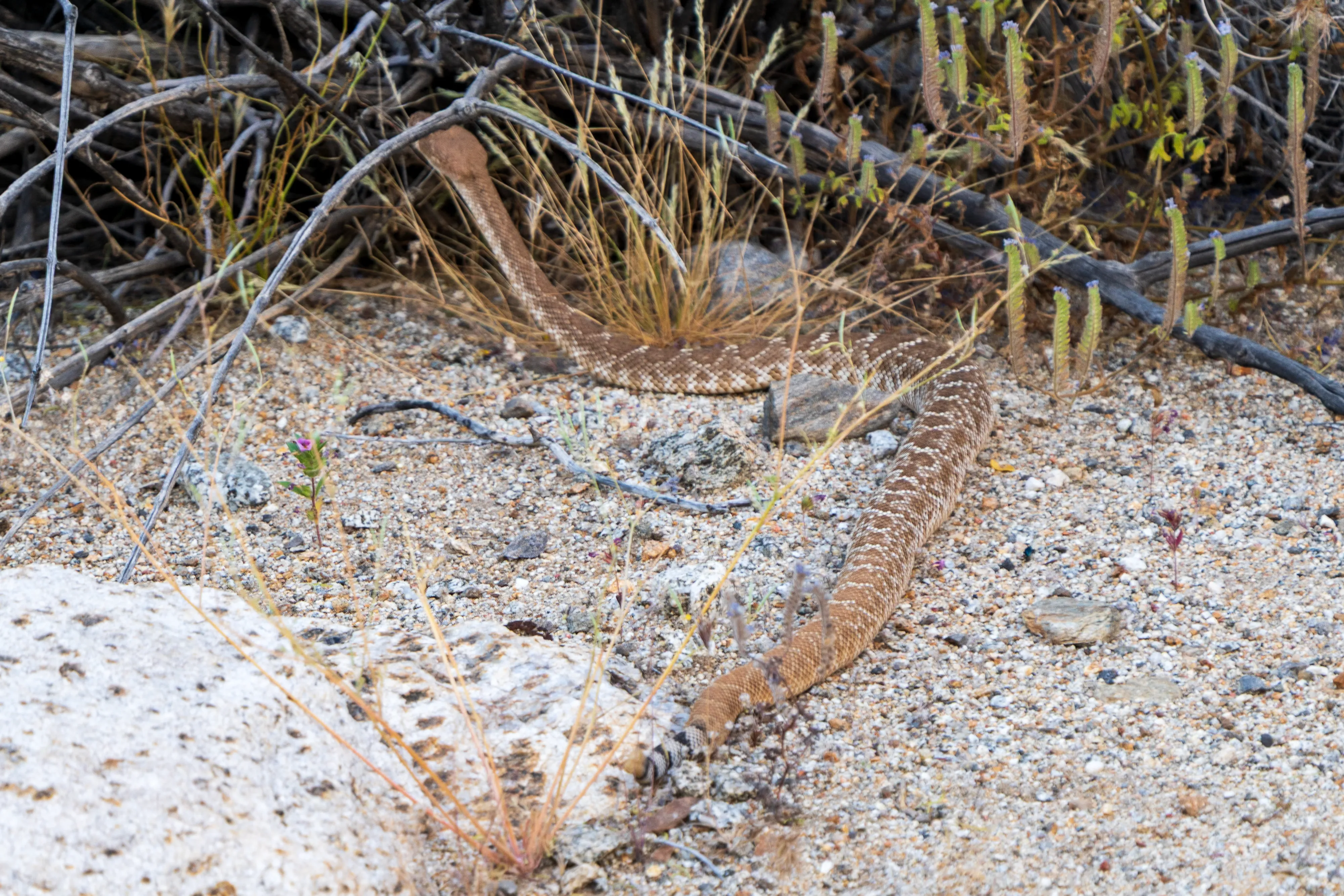 Auf der Aufnahme mit dem 600 mm Teleobjektiv erscheint die Klapperschlange dann doch näher als es in Wirklichkeit der Fall war. Leider keine gute Aufnahme - aber die Schlange wollte einfach nicht warten. :shrug: