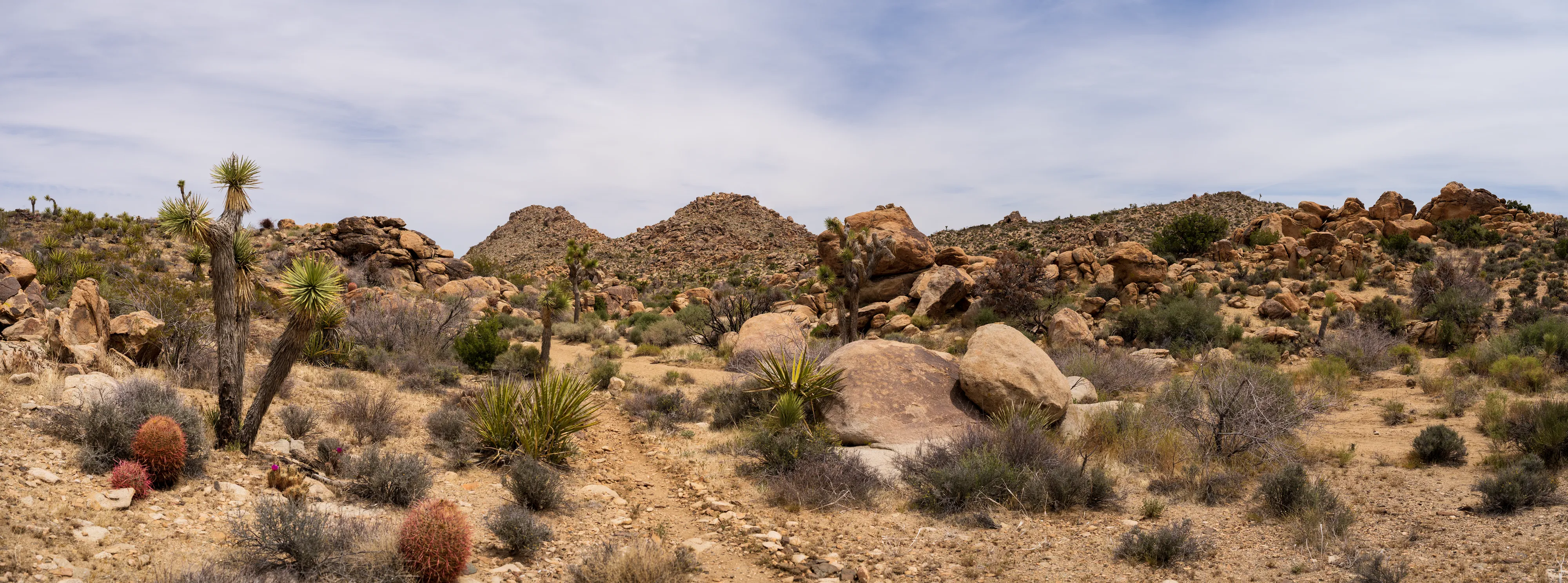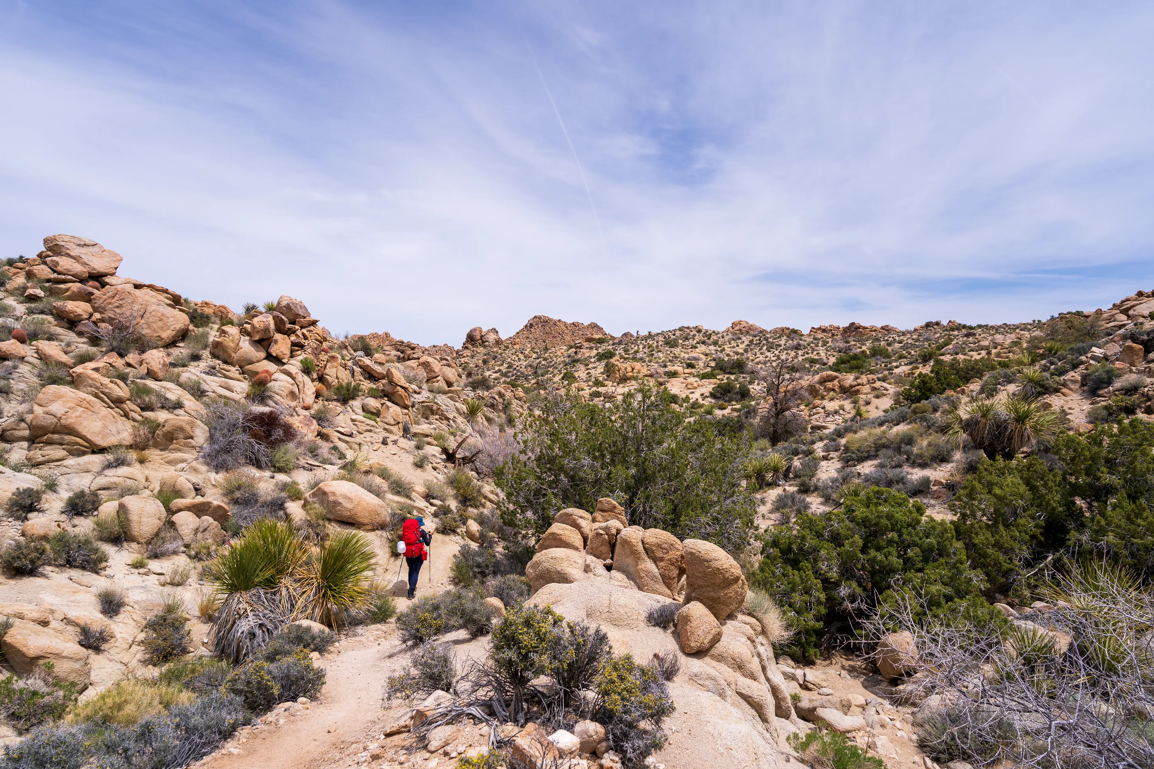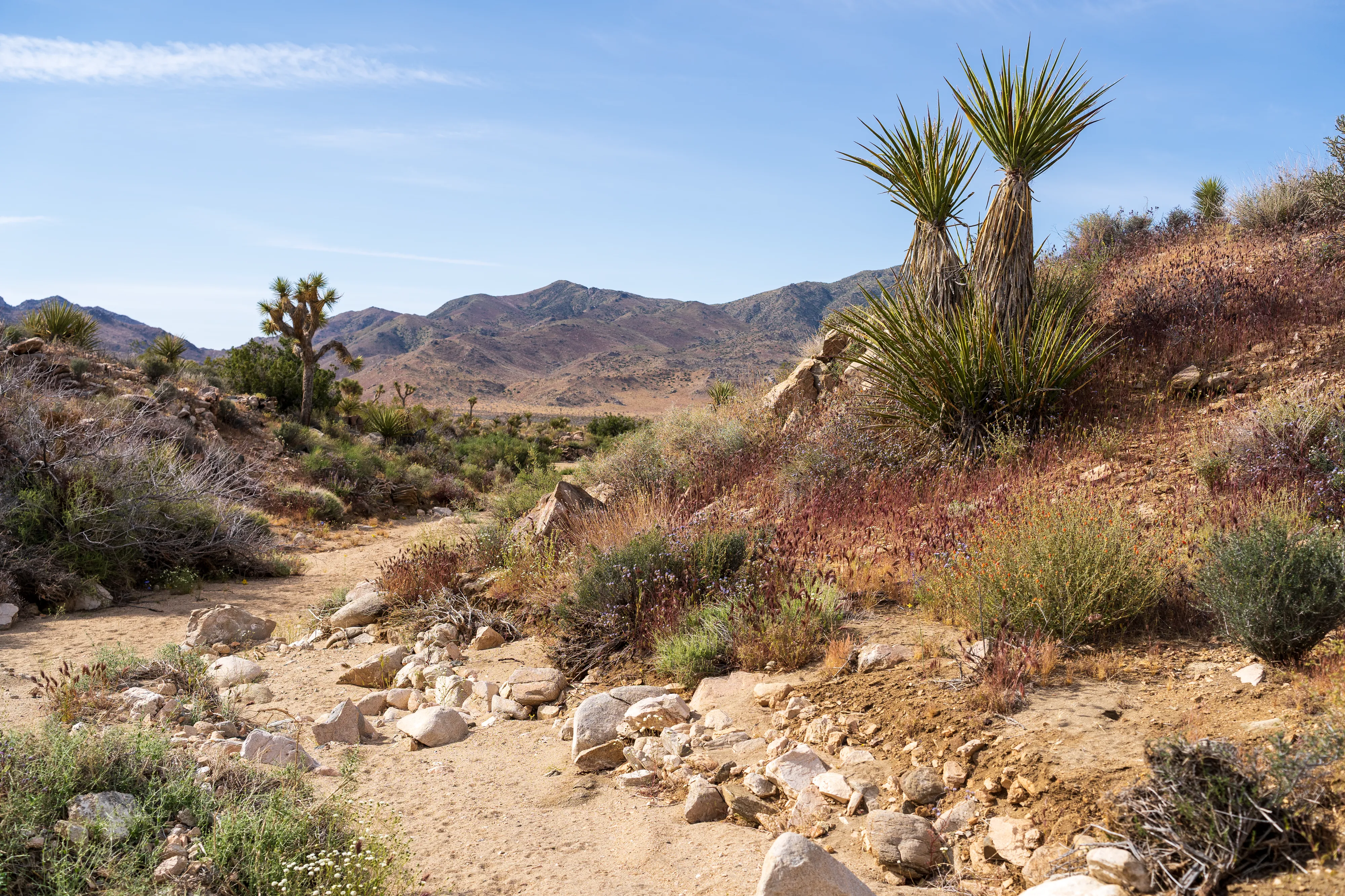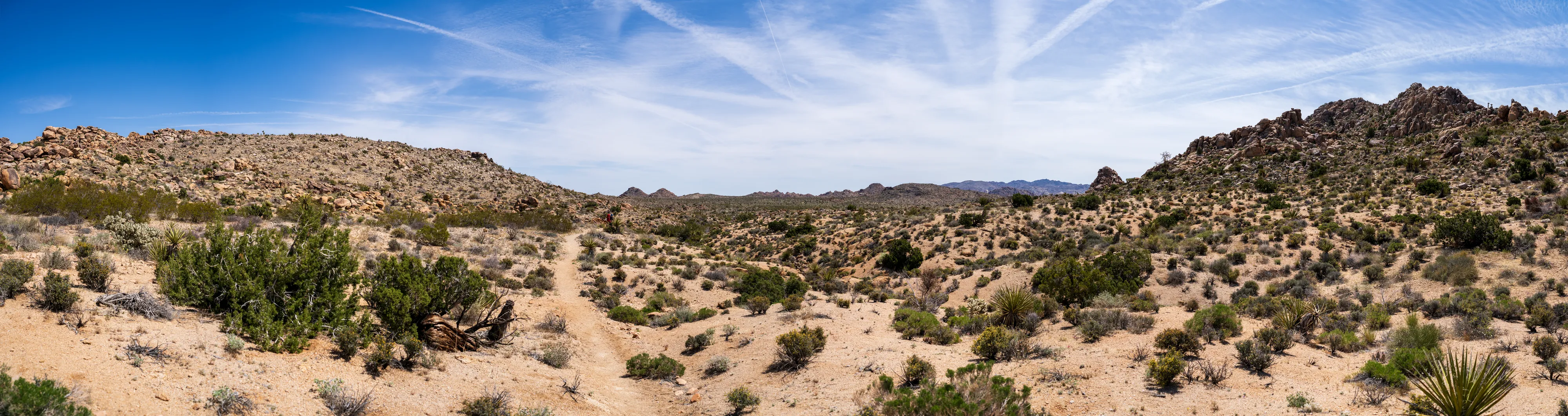 Wir wandern bei warmen, aber noch angenehmen Temperaturen durch eine wirklich schöne Landschaft: teils sandige, teils felsige Wege über Hügel mit allerlei Vegetation am Wegesrand. Joshua Trees, in verschiedenen Farben blühende Kakteen und viele andere Pflanzen, die uns biologischen Banausen nicht bekannt sind - deren Schönheit uns aber trotzdem erfreut.