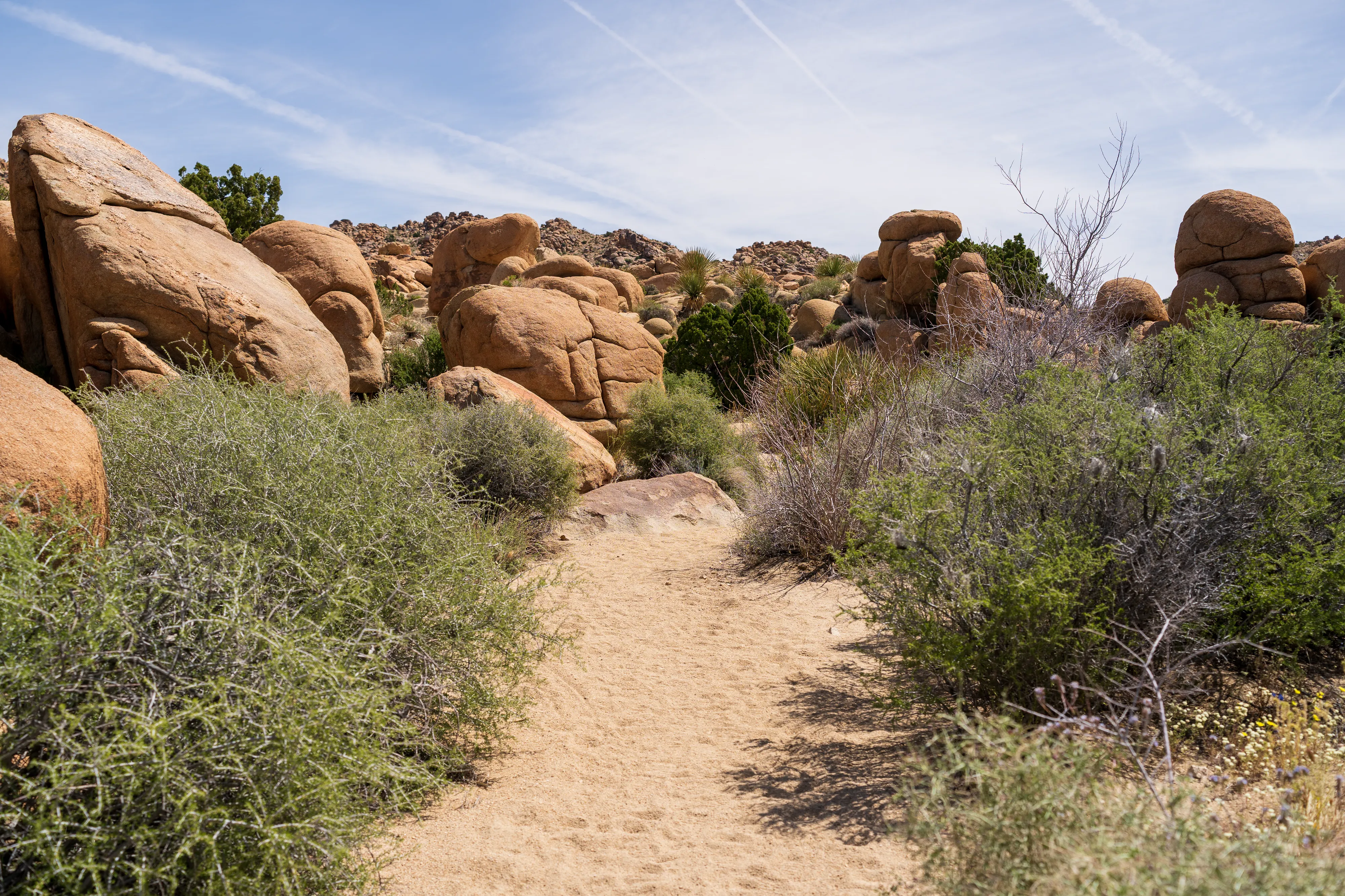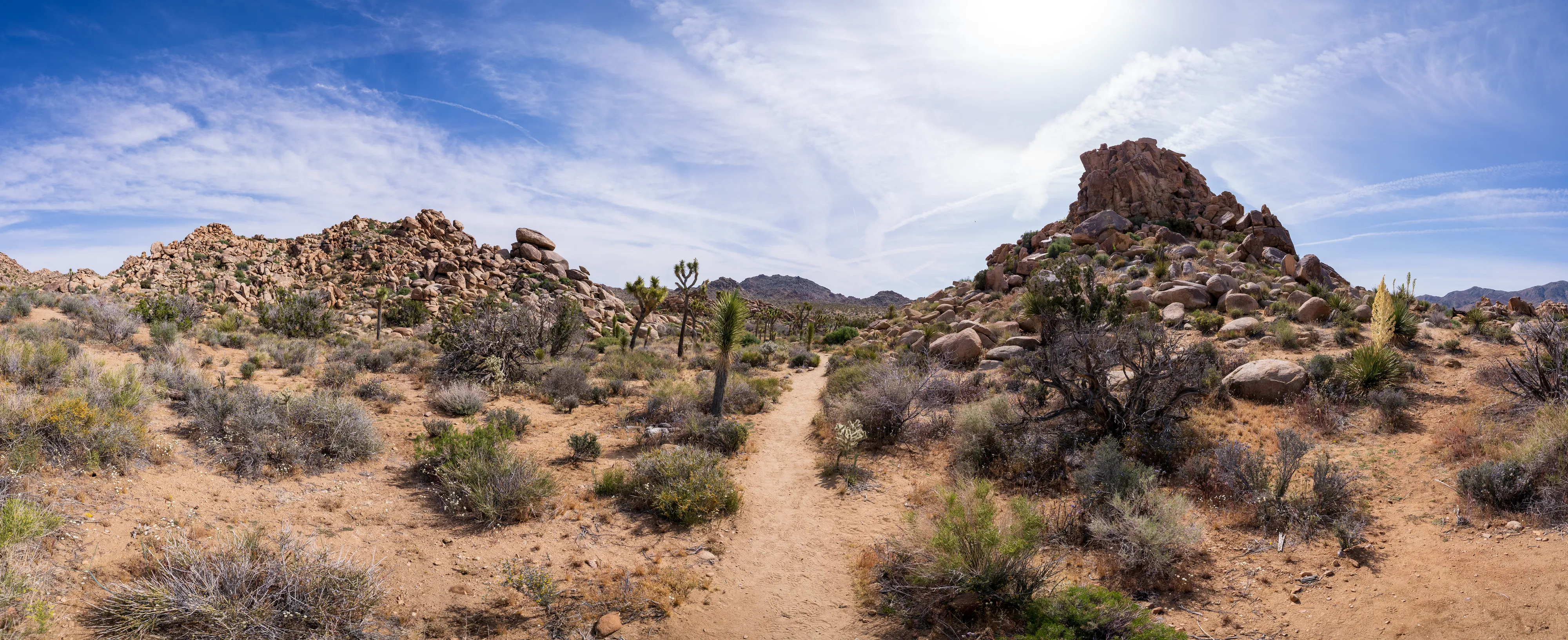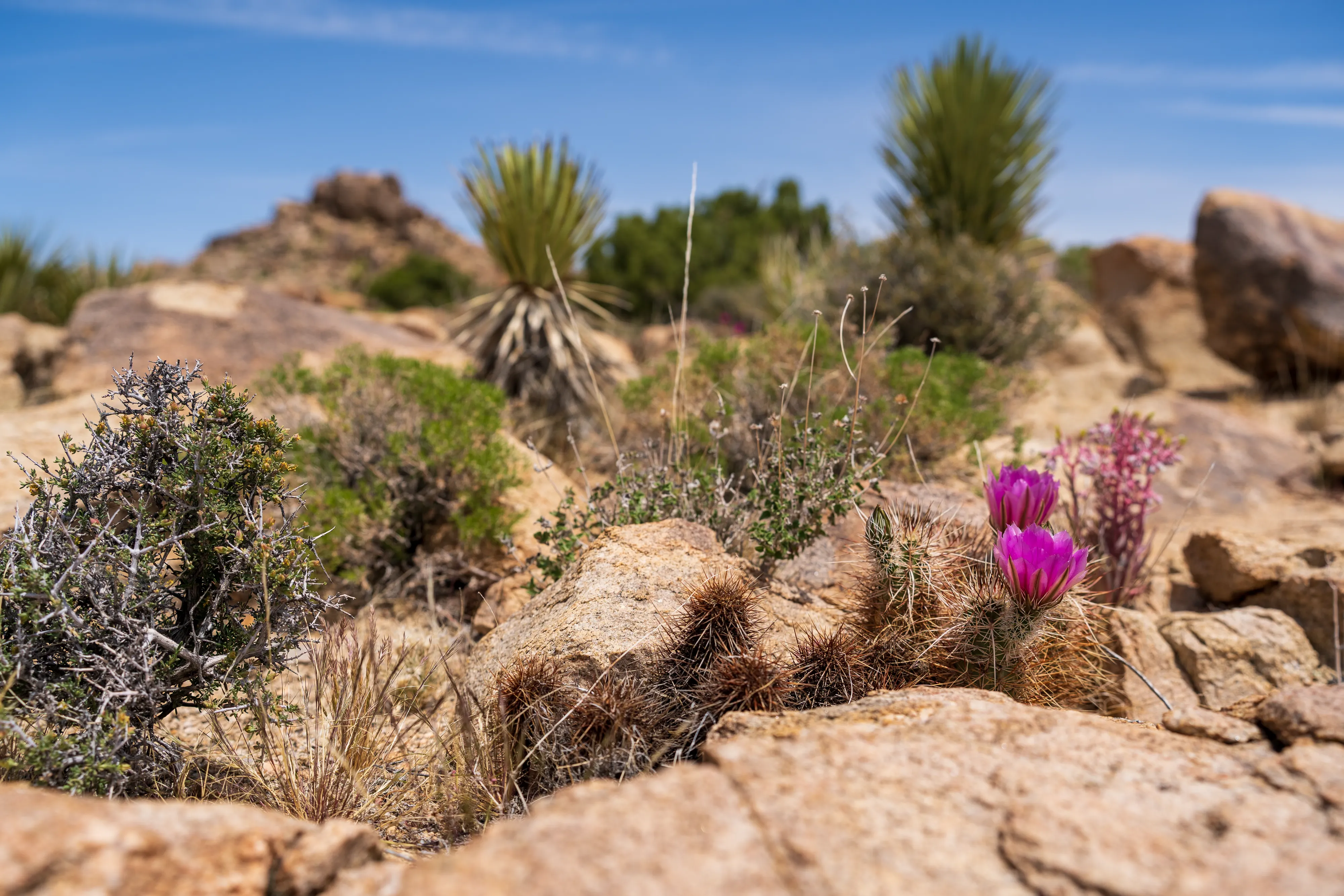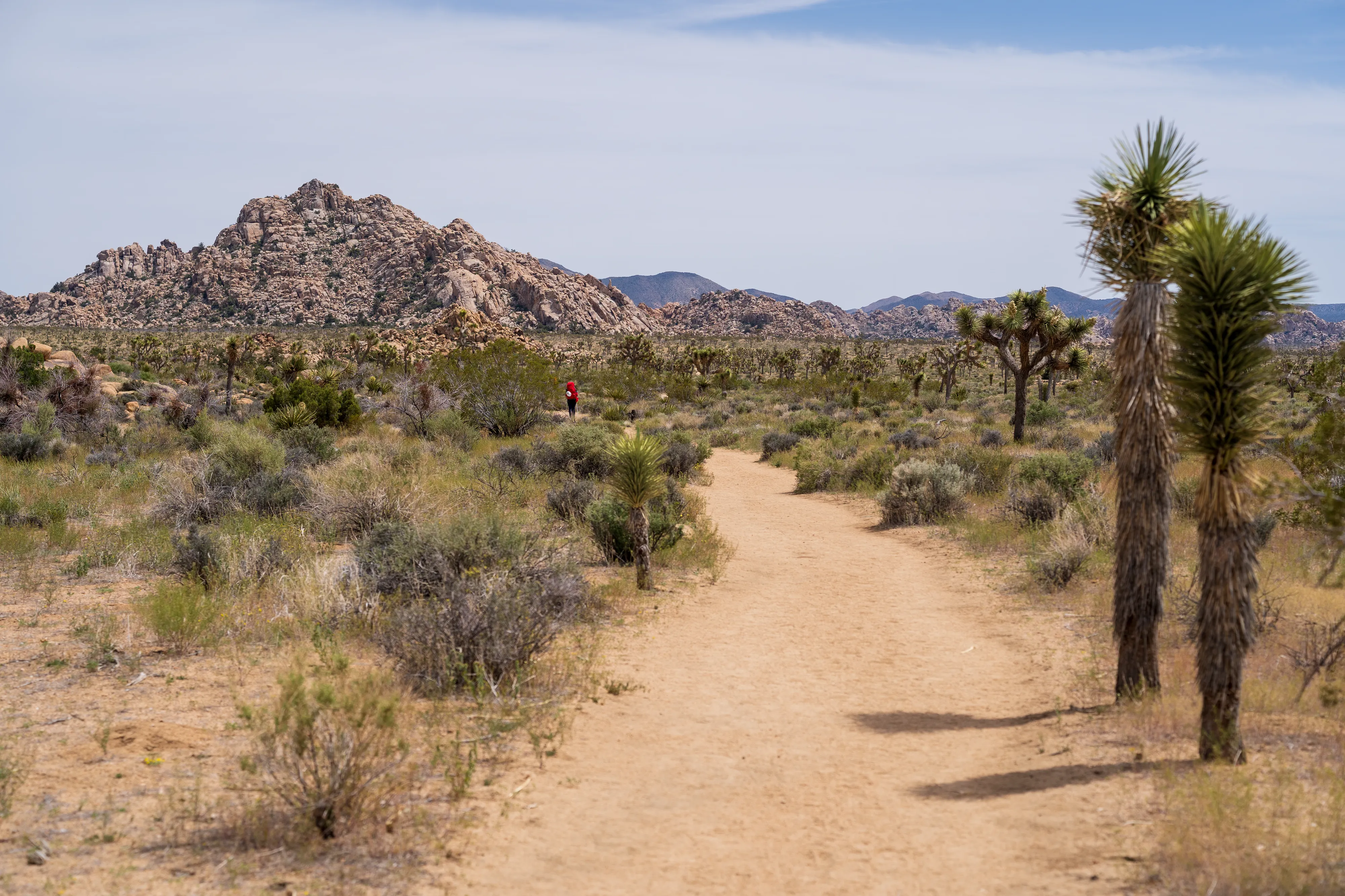 Wir wandern bei warmen, aber noch angenehmen Temperaturen durch eine wirklich schöne Landschaft: teils sandige, teils felsige Wege über Hügel mit allerlei Vegetation am Wegesrand. Joshua Trees, in verschiedenen Farben blühende Kakteen und viele andere Pflanzen, die uns biologischen Banausen nicht bekannt sind - deren Schönheit uns aber trotzdem erfreut.