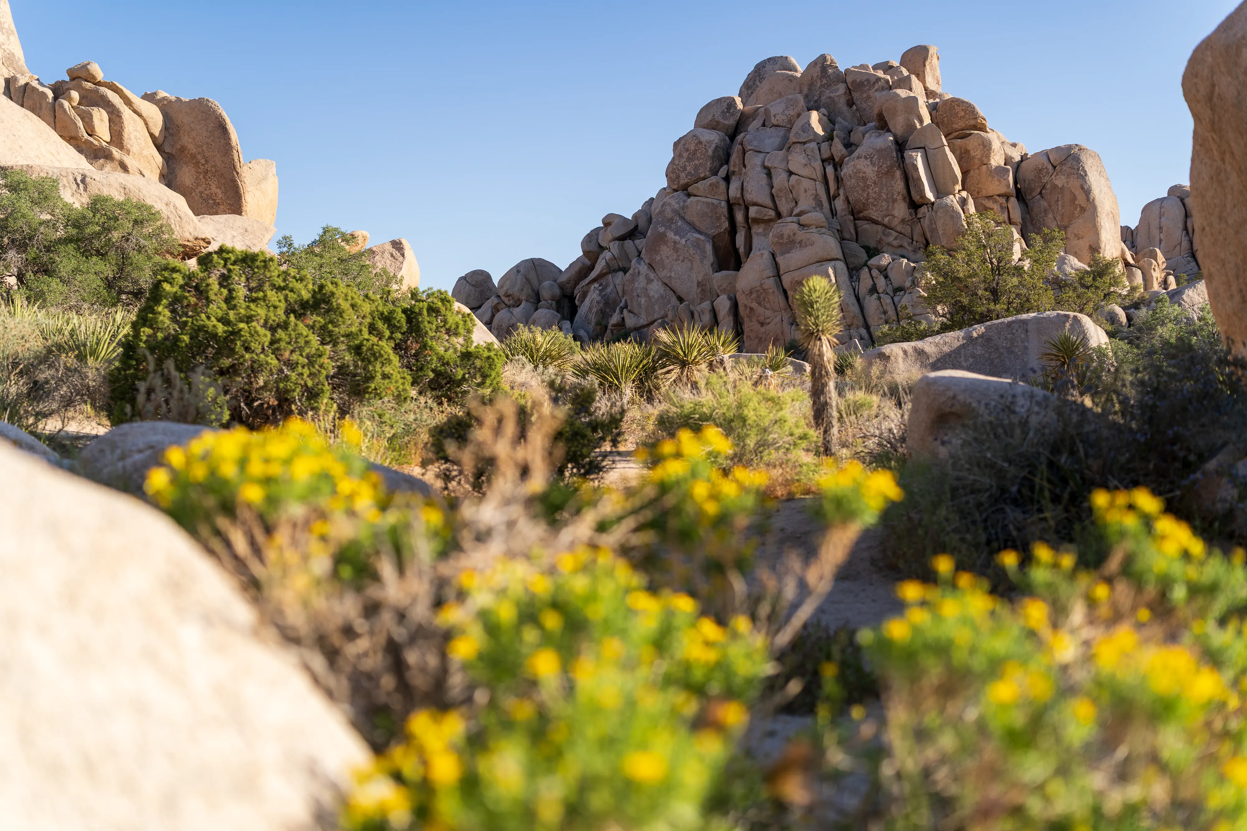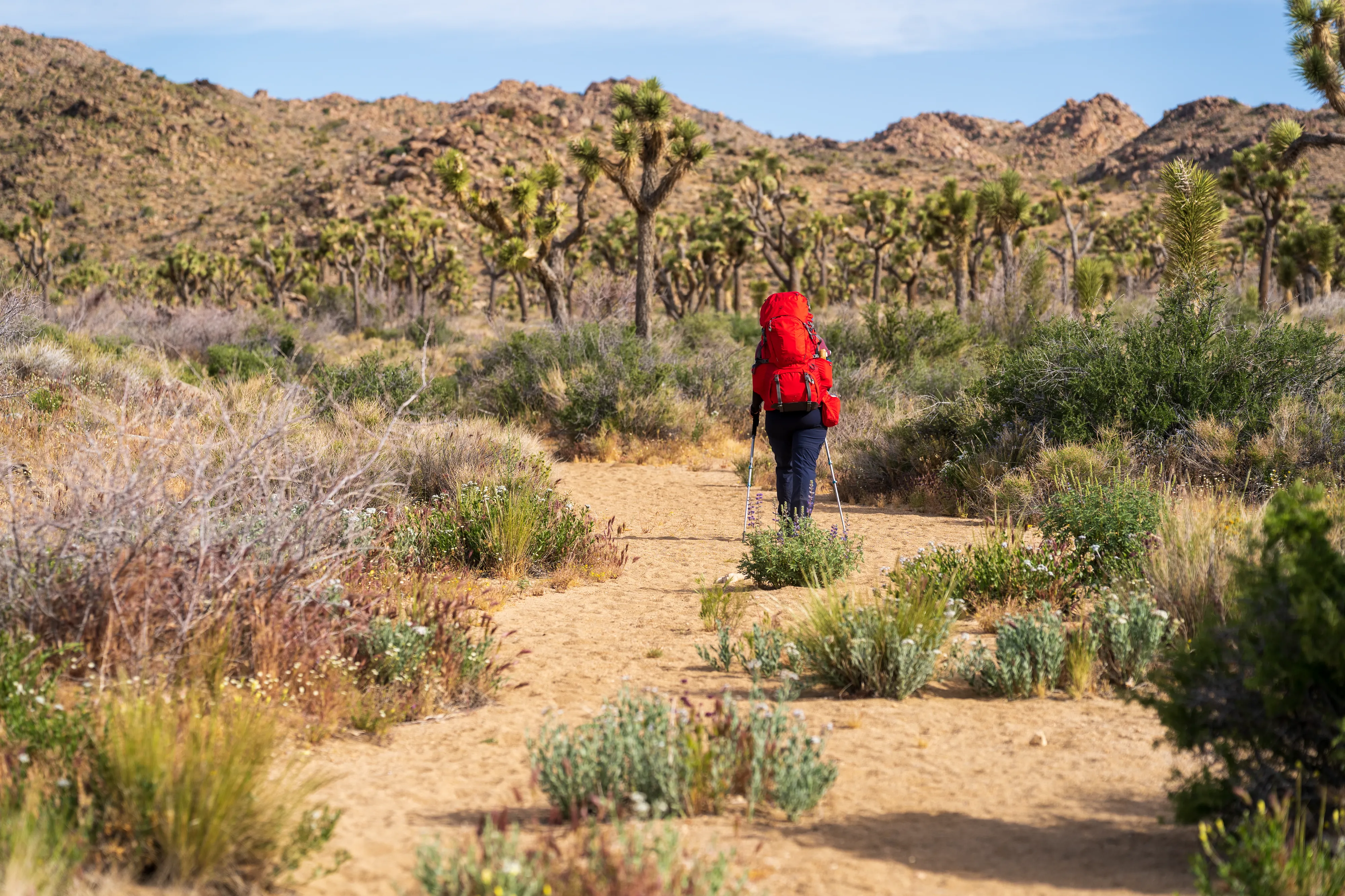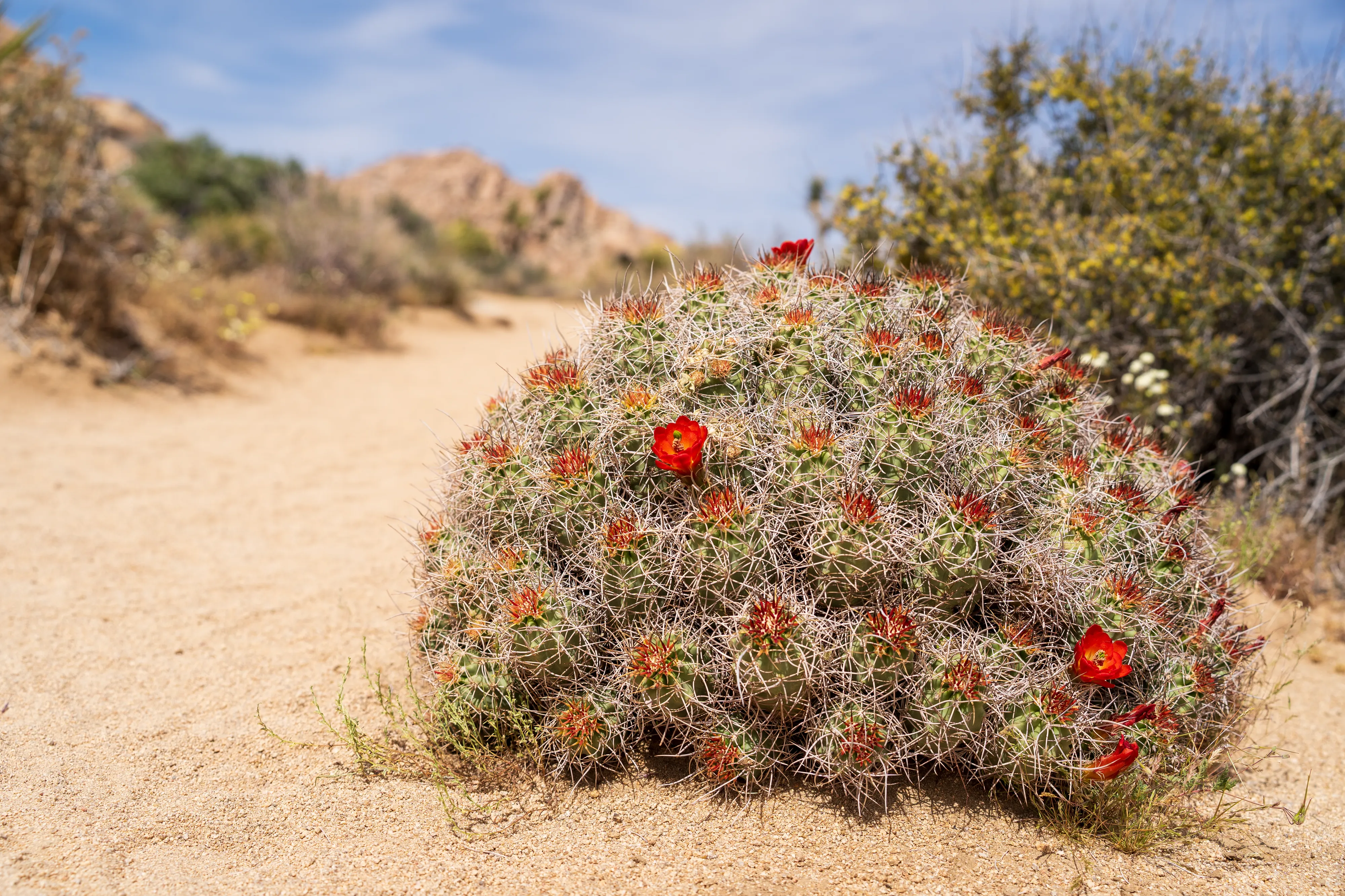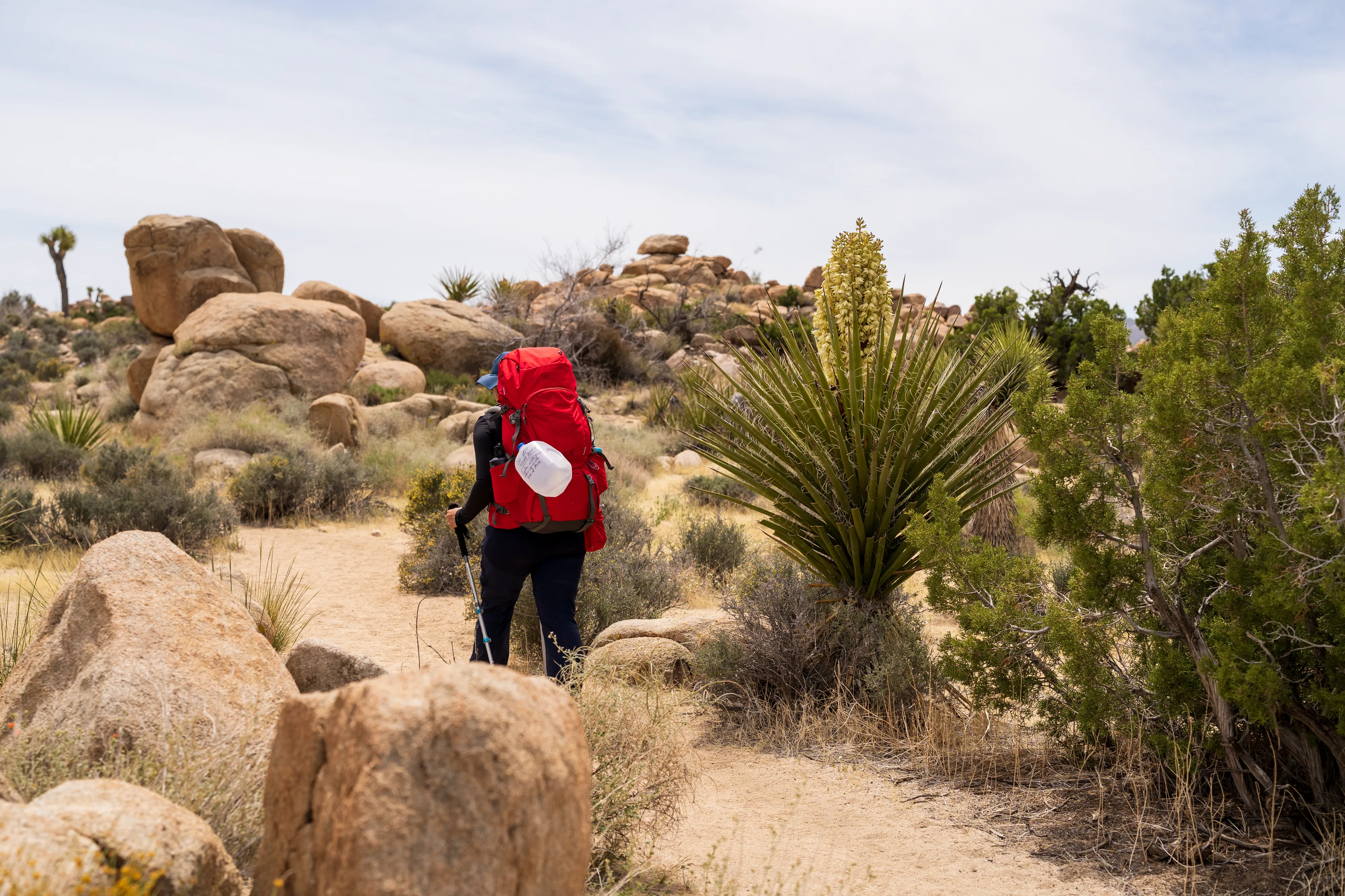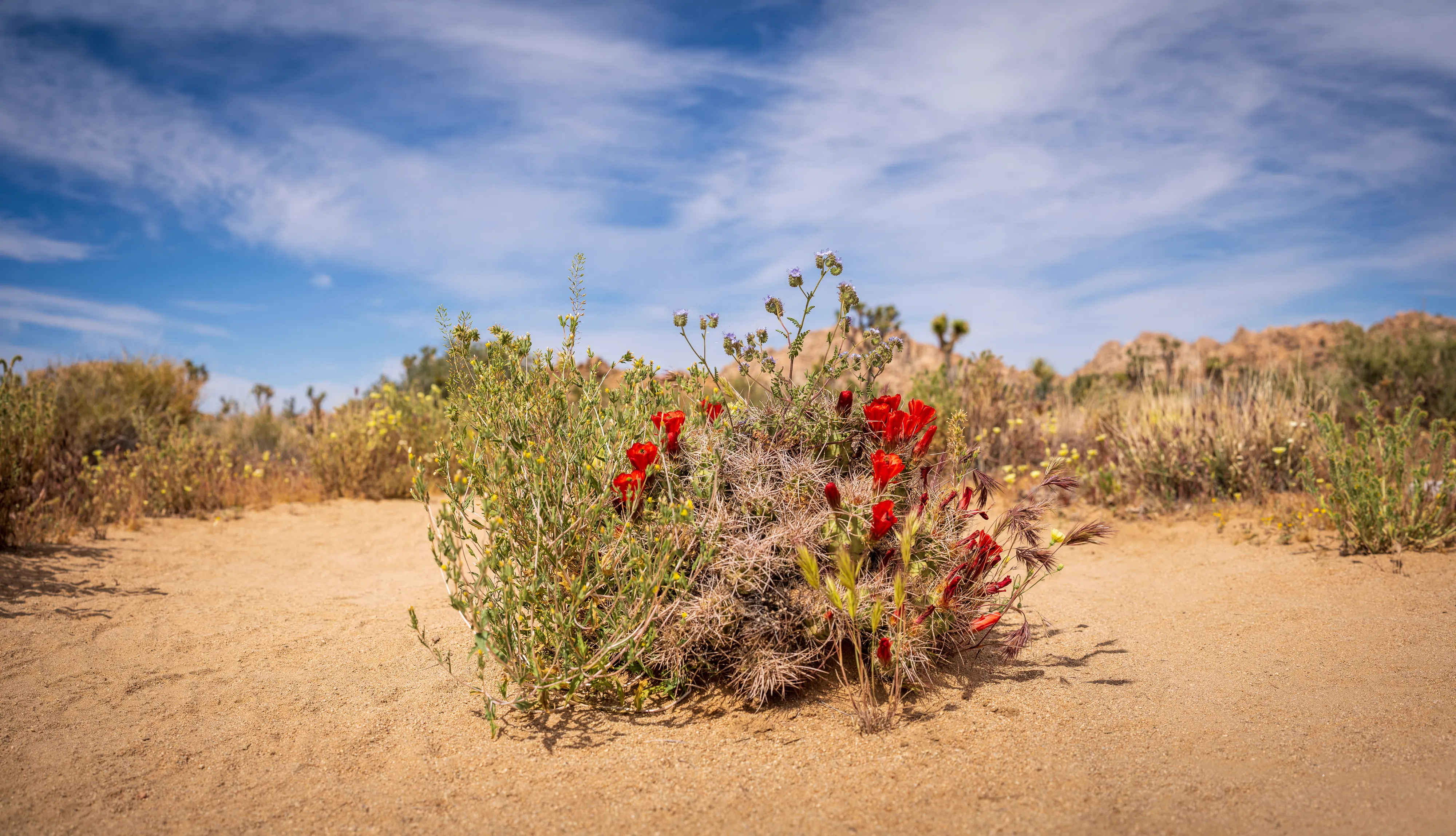 Wir wandern bei warmen, aber noch angenehmen Temperaturen durch eine wirklich schöne Landschaft: teils sandige, teils felsige Wege über Hügel mit allerlei Vegetation am Wegesrand. Joshua Trees, in verschiedenen Farben blühende Kakteen und viele andere Pflanzen, die uns biologischen Banausen nicht bekannt sind - deren Schönheit uns aber trotzdem erfreut.