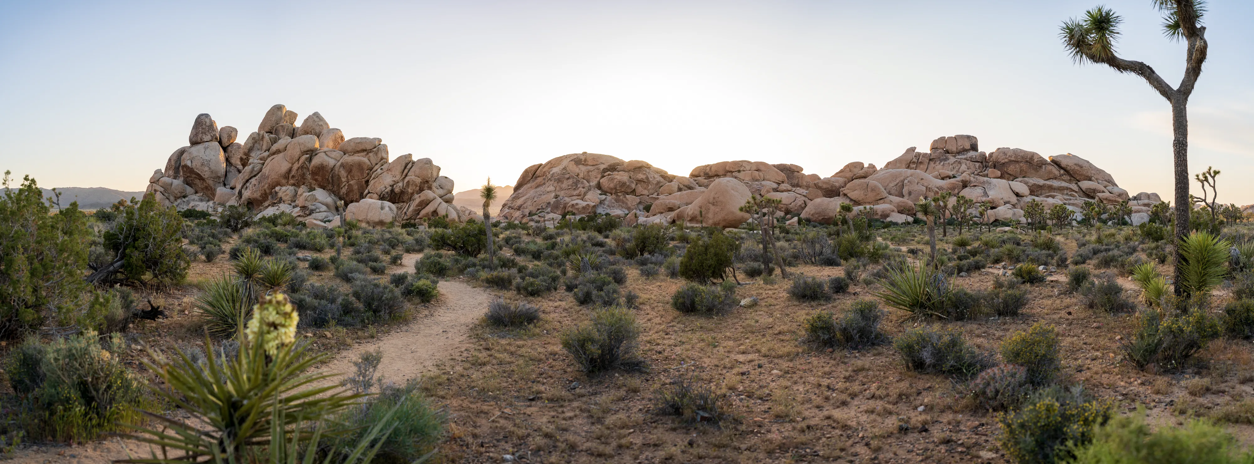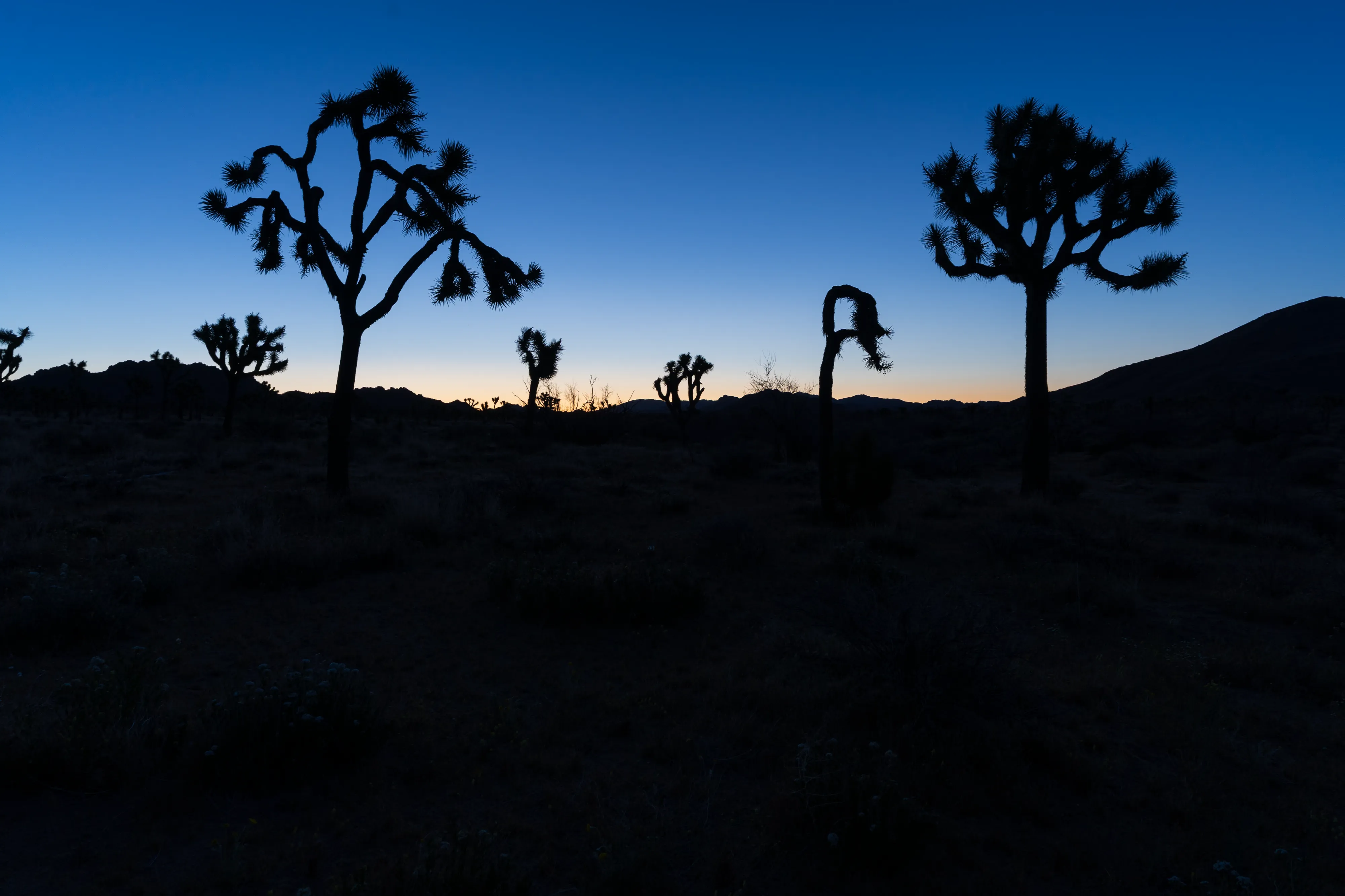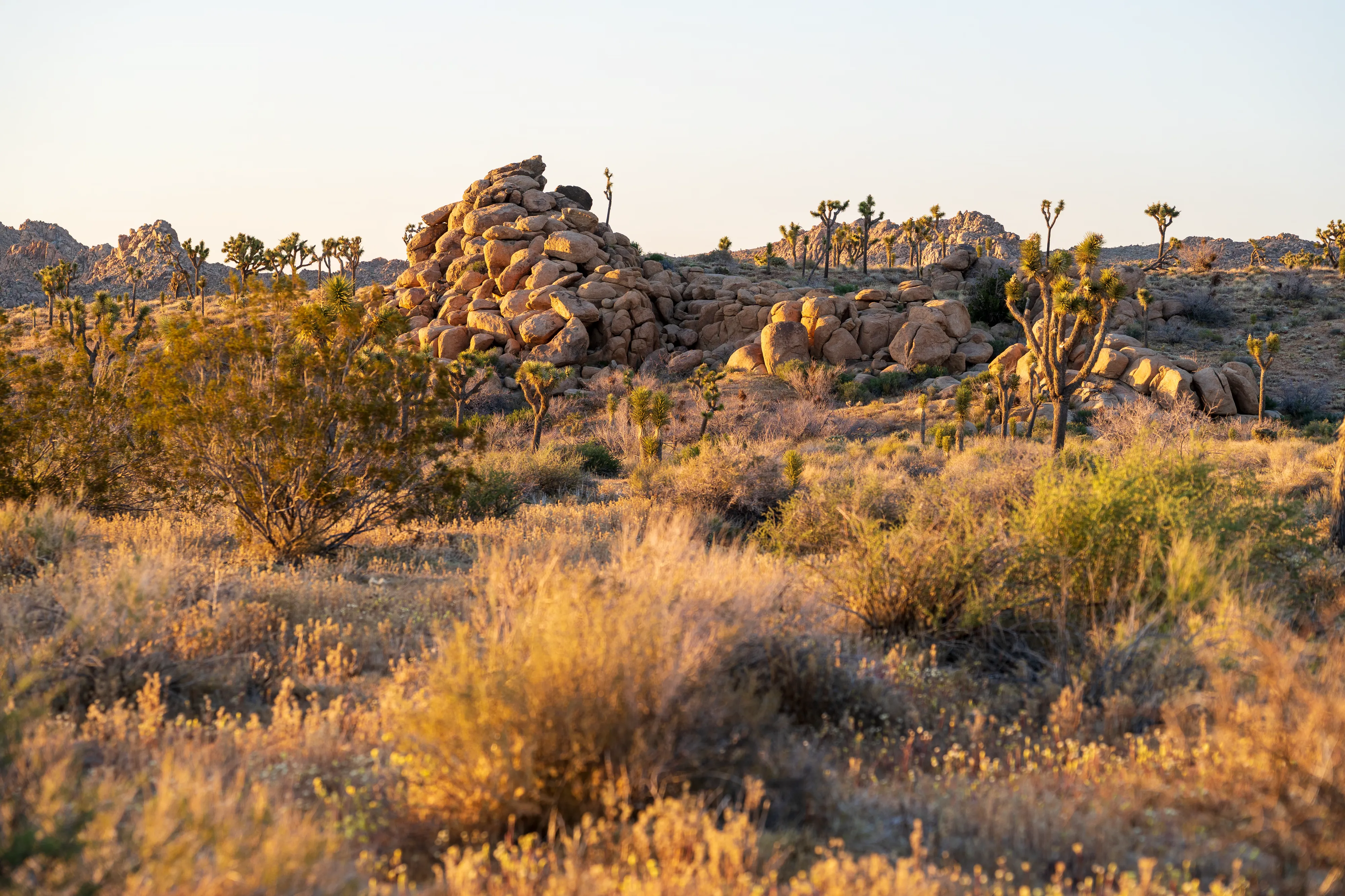 An “Felsenhaufen” vorbei, laufen wir der untergehenden Sonne entgegen und es dauernd nicht lange und wir müssen unsere Taschenlampen einschalten. Wir folgen dem Quail Wash Trail durch ein trockenes Flussbett und genießen wie die Sonne zwischen den Joshua Trees untergeht.