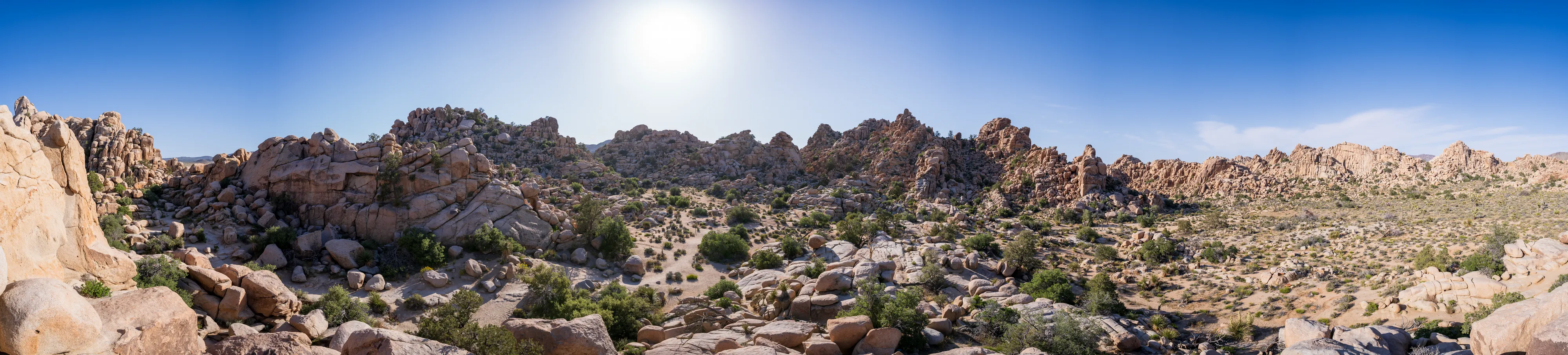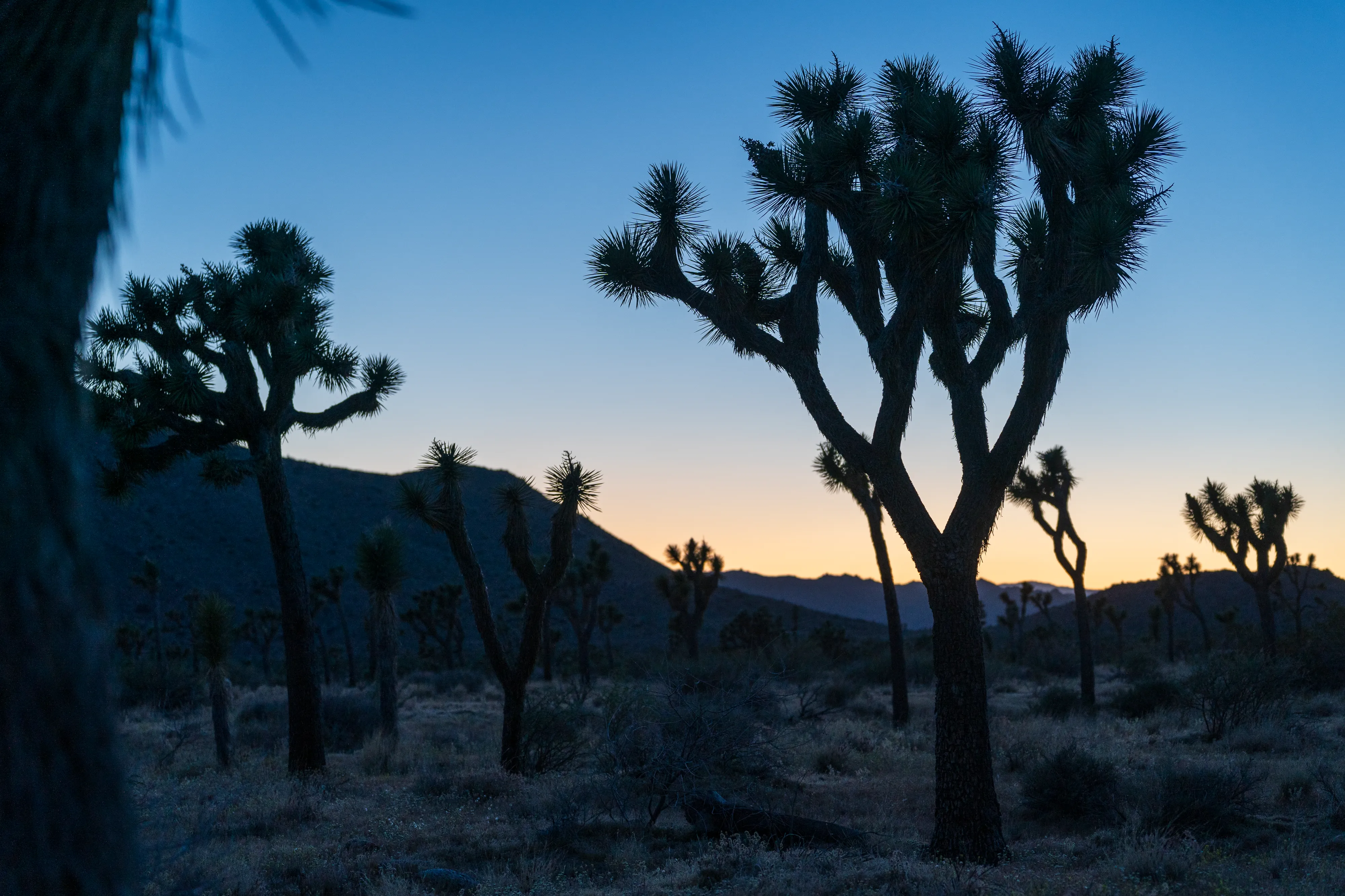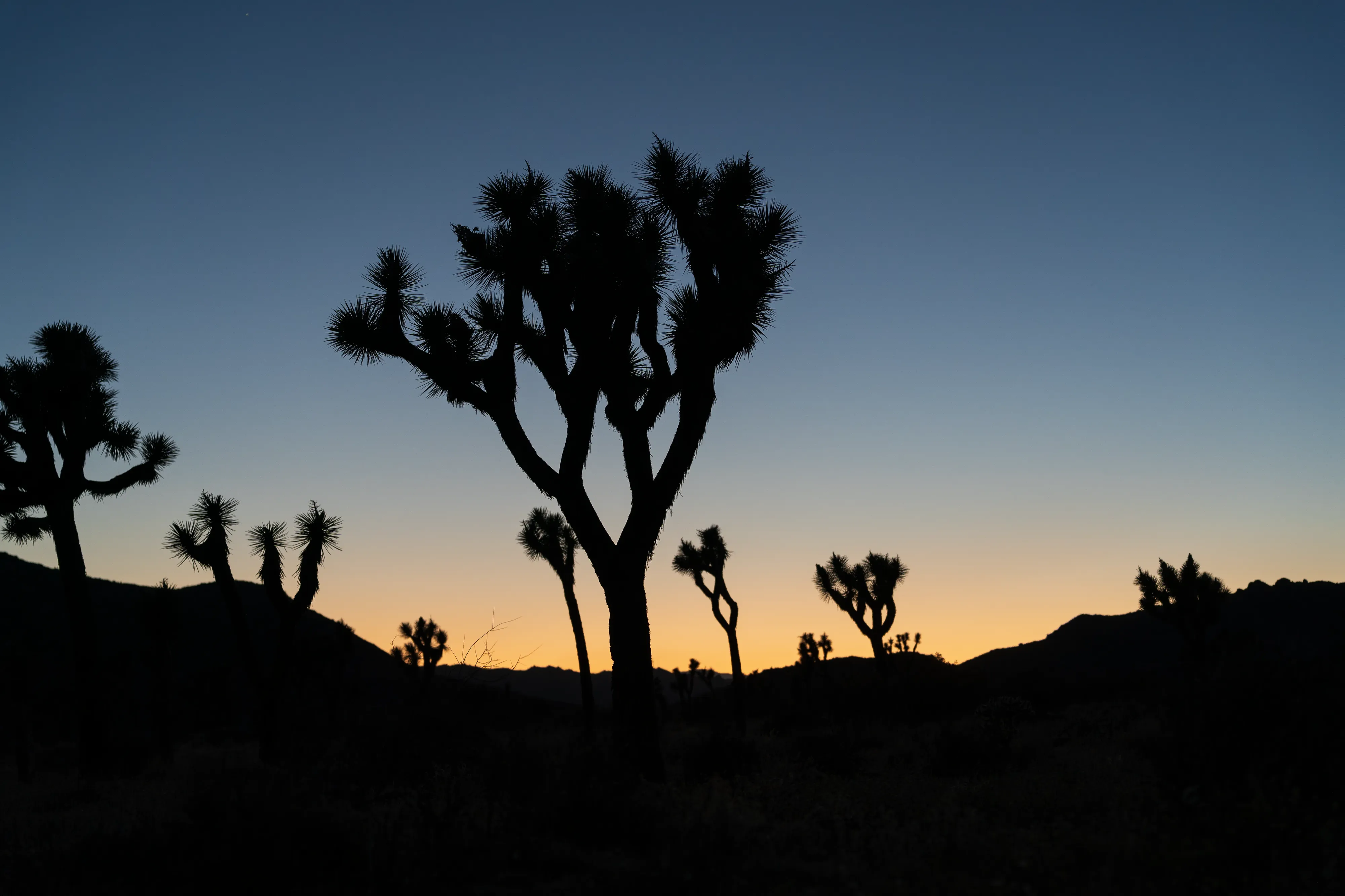 An “Felsenhaufen” vorbei, laufen wir der untergehenden Sonne entgegen und es dauernd nicht lange und wir müssen unsere Taschenlampen einschalten. Wir folgen dem Quail Wash Trail durch ein trockenes Flussbett und genießen wie die Sonne zwischen den Joshua Trees untergeht.