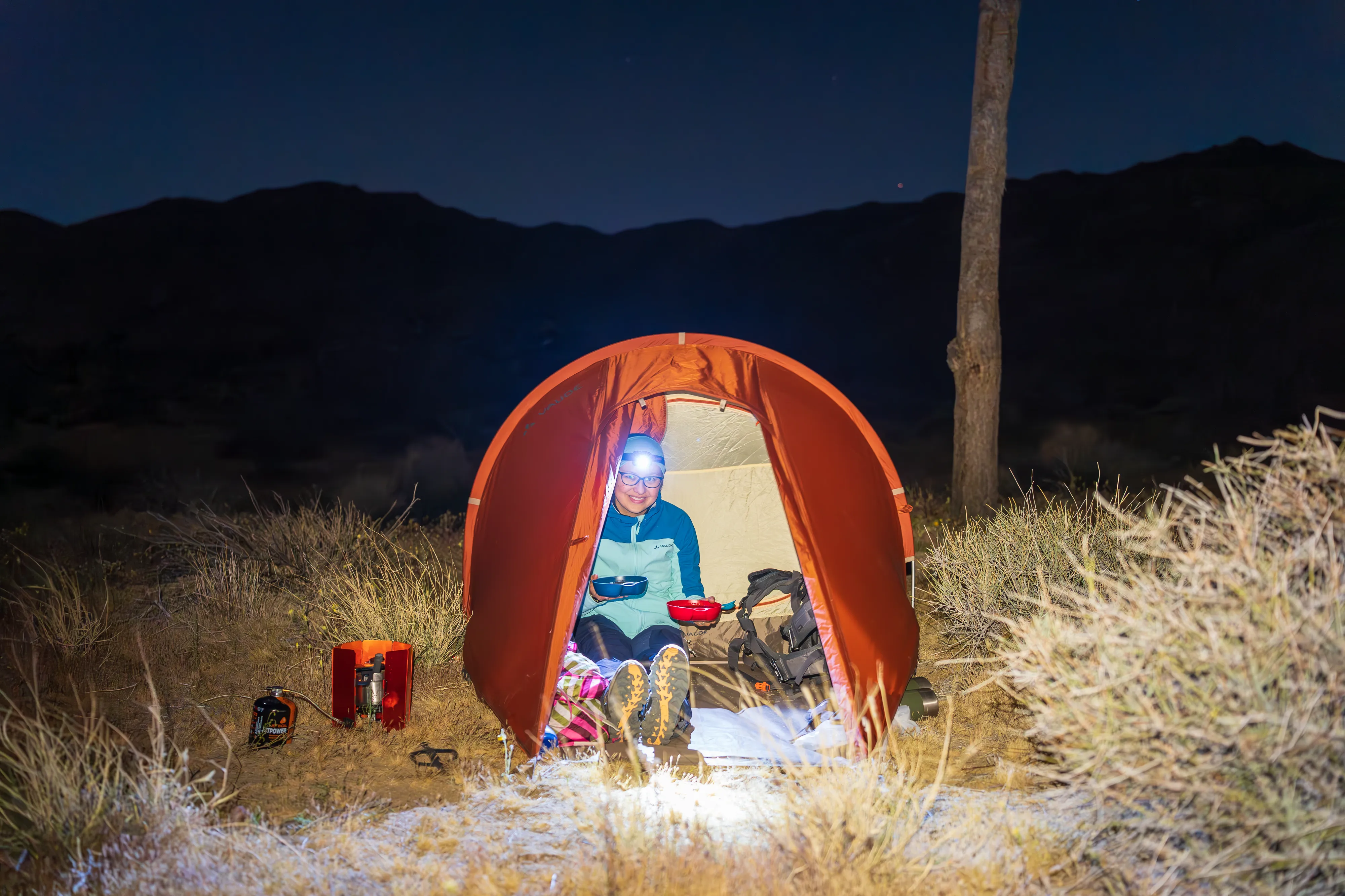 Man möchte meinen, dass es in der Wüste und nach hohen Temperaturen tagsüber nachts nicht allzu kalt werden sollte - weit gefehlt! Wind und niedrige einstellige Temperaturen treiben uns schnell ins Zelt, wo es jedoch recht angenehm ist.