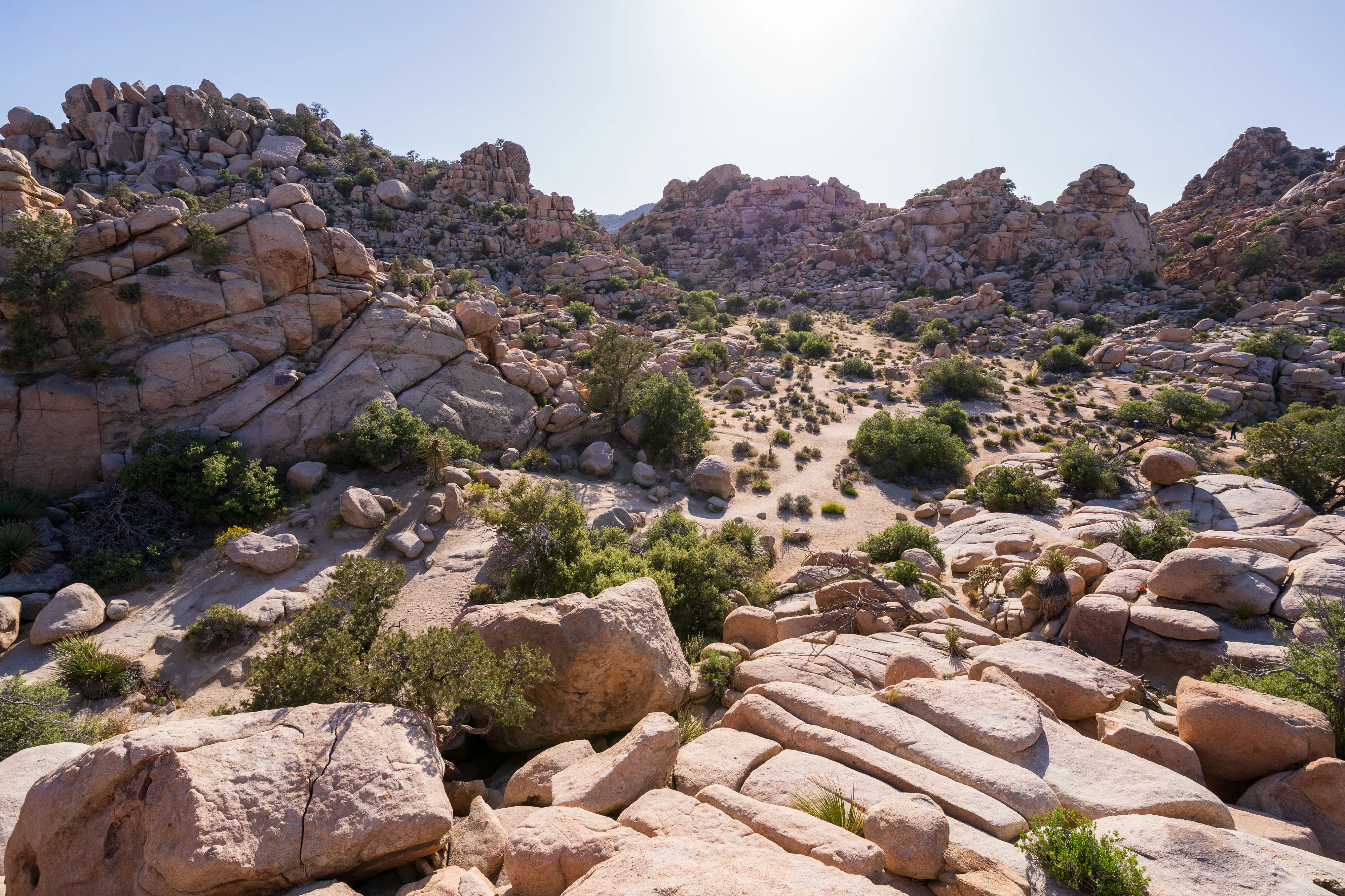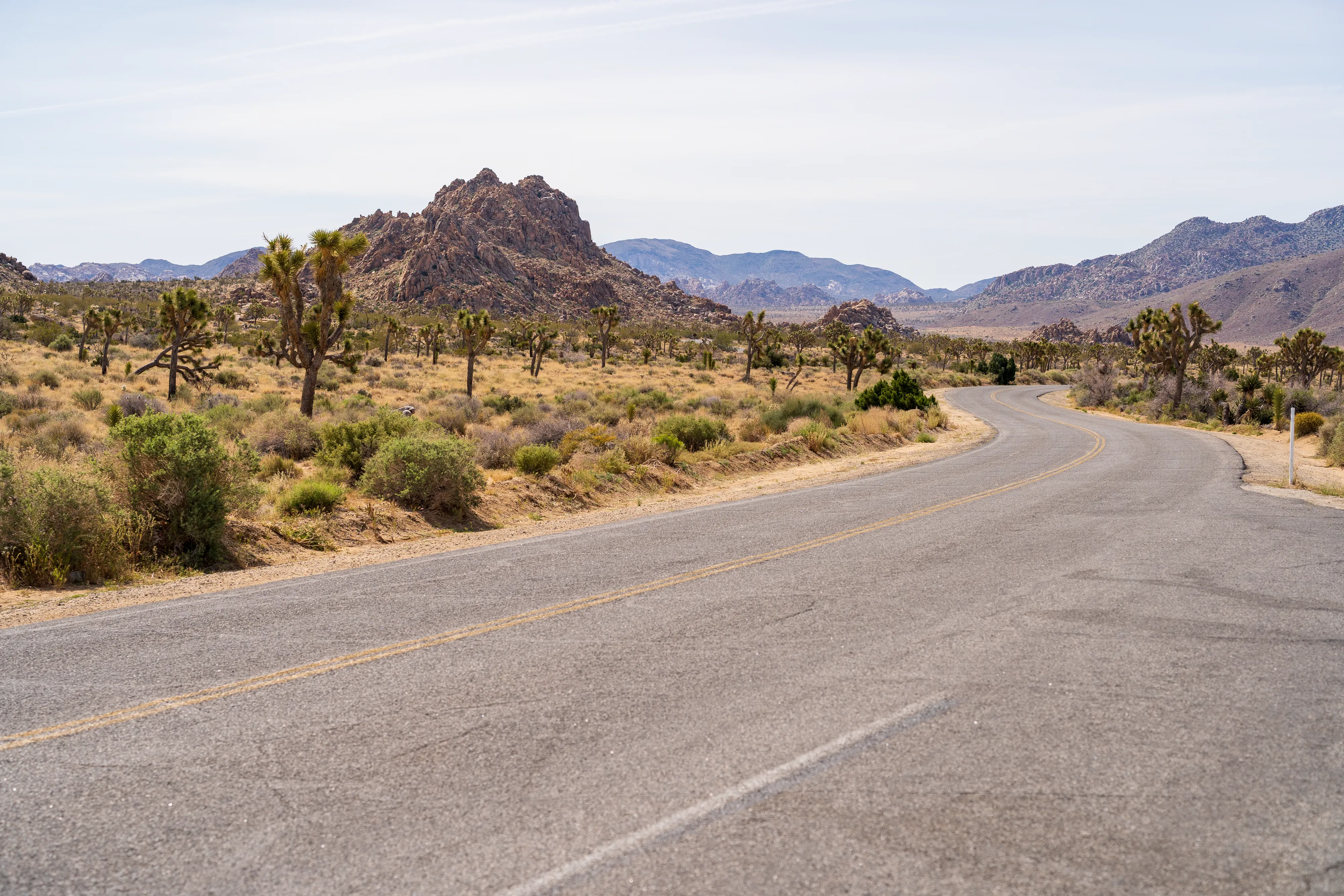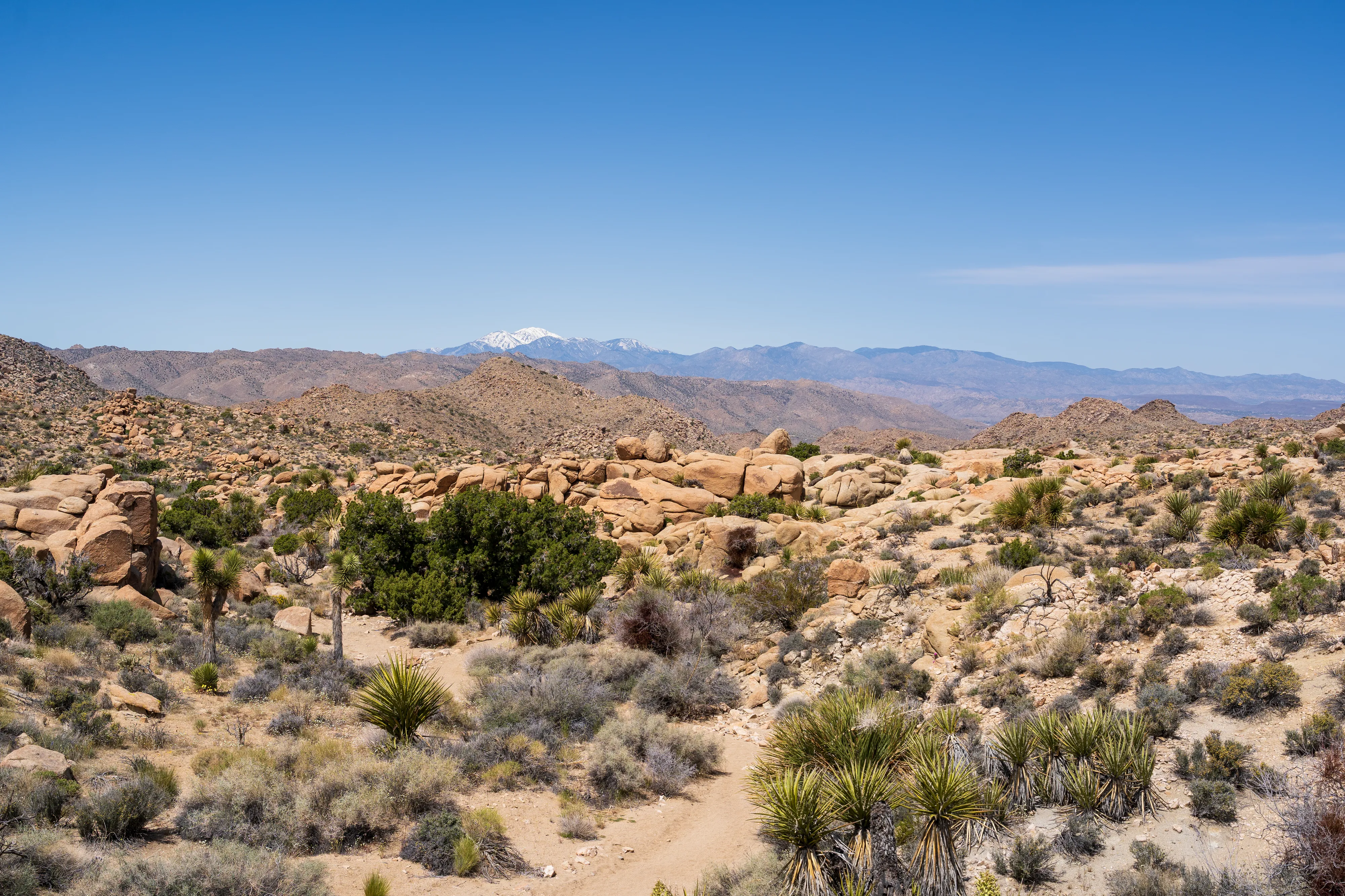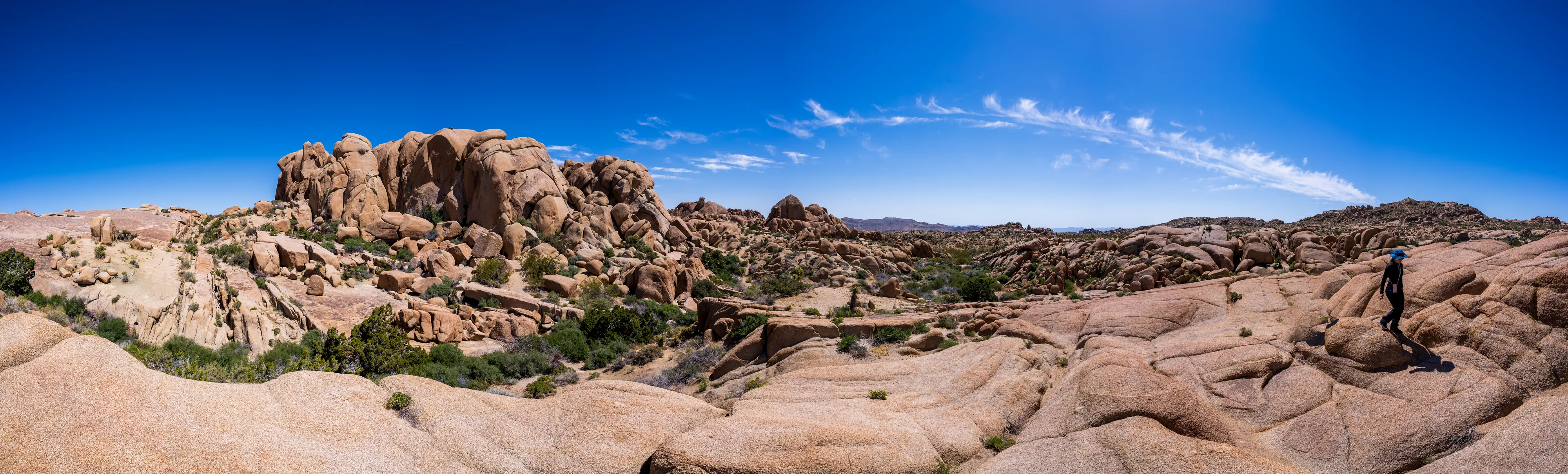 Von einer Seite der Straße zu anderen ändert sich hier die Landschaft ziemlich drastisch: sind wir bisher südlich der Straße viel zwischen Joshua Trees in der Ebene gewandert, ist es nun nördlich von ihr deutlich felsiger.