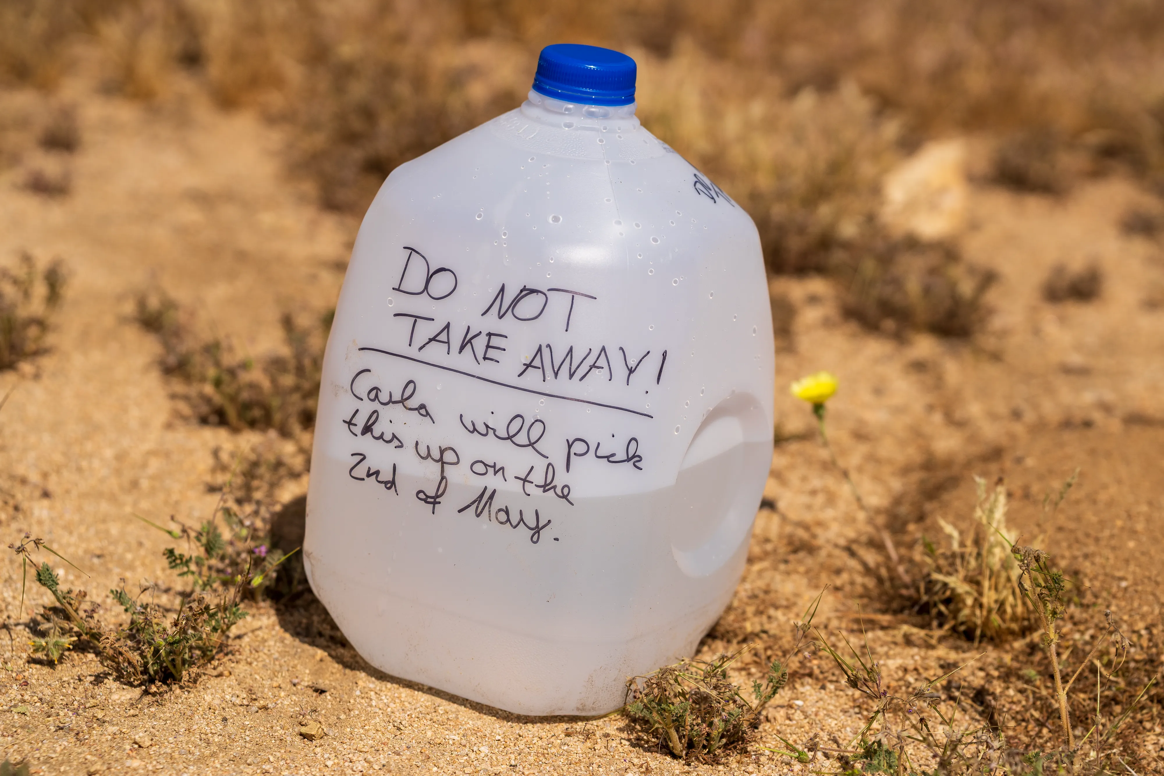 Nach einigen Kilometern erreichen wir die Stelle, an der wir am Vortag in weiser Voraussicht eine zusätzliche Gallone Wasser deponiert haben.