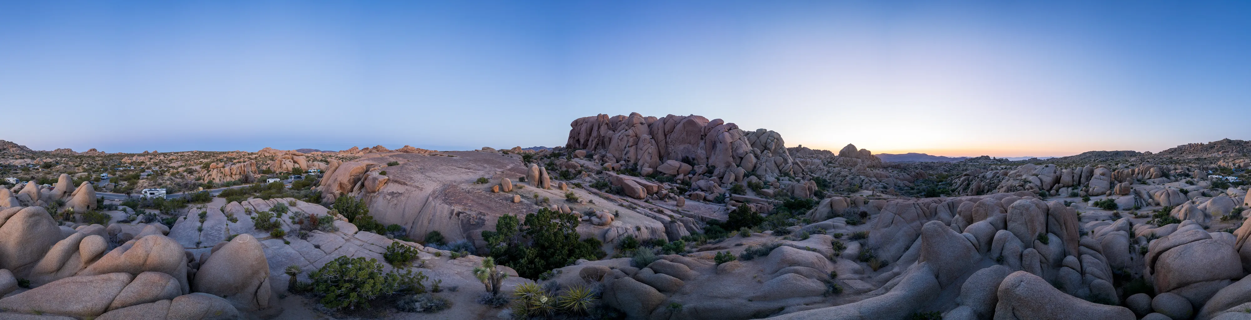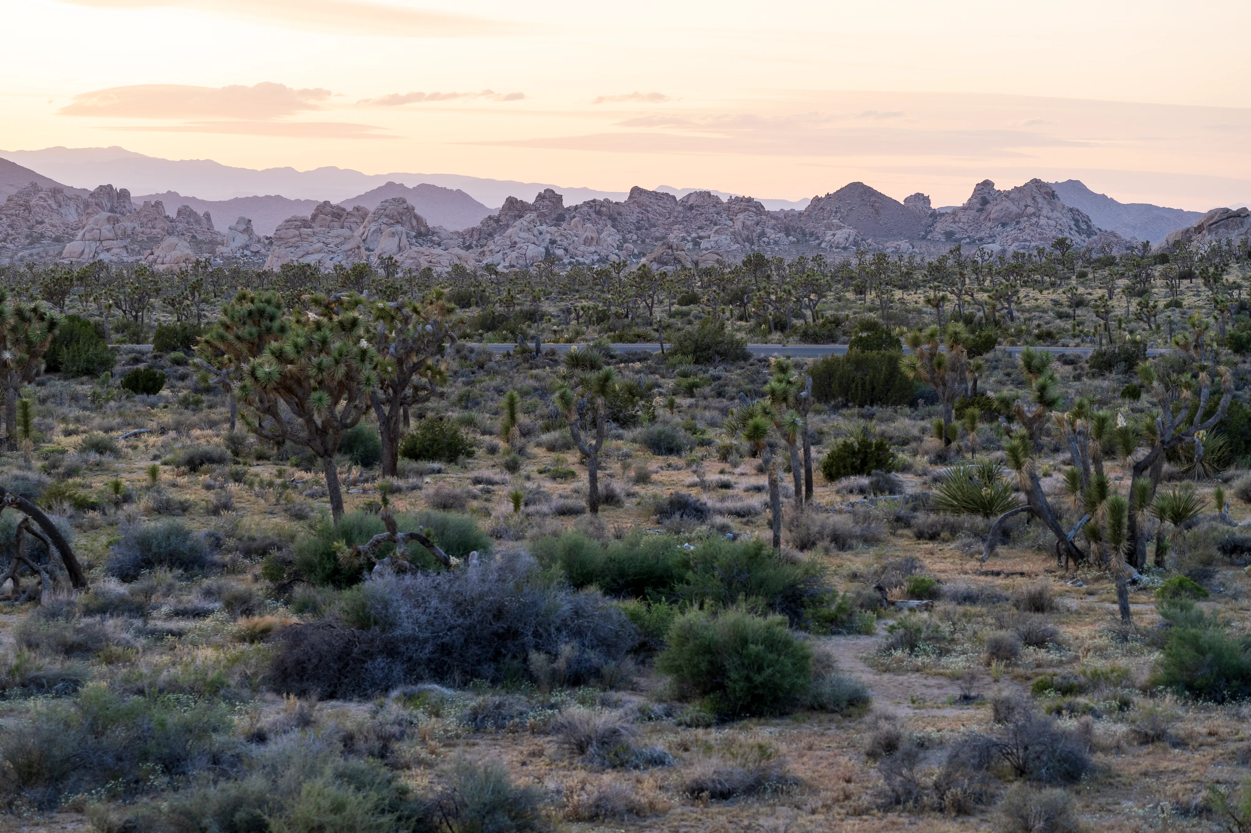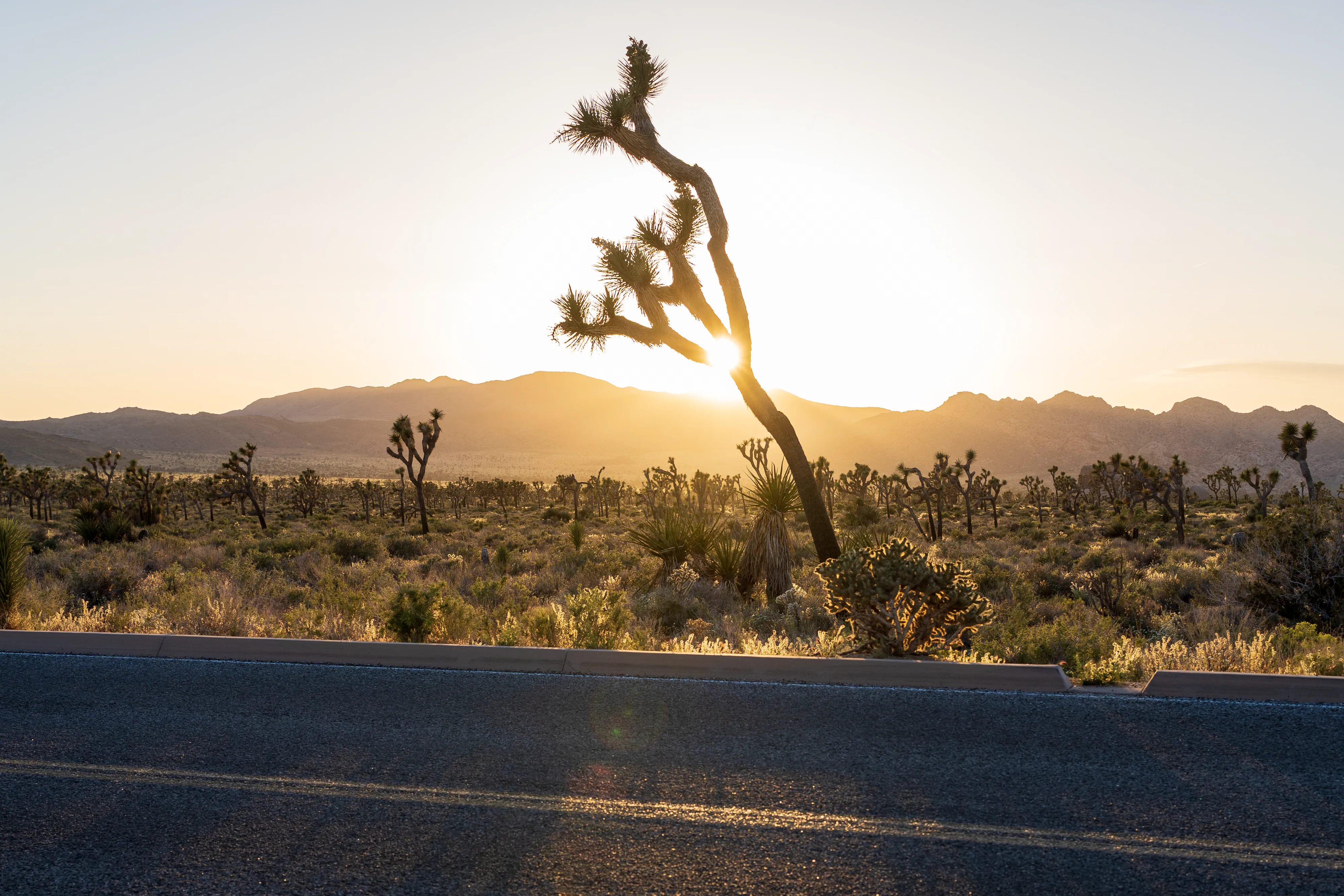 Auf dem Weg zu unserem heutigen Tagesziel, dem Jumbo Rock Campground erleben wir einen weiteren tollen Sonnenuntergang. Insbesondere die großen Granitfelsen in der Ebene des Parks sehen in der Abenddämmerung einfach fantastisch aus und geben ein grandioses Fotomotiv ab.