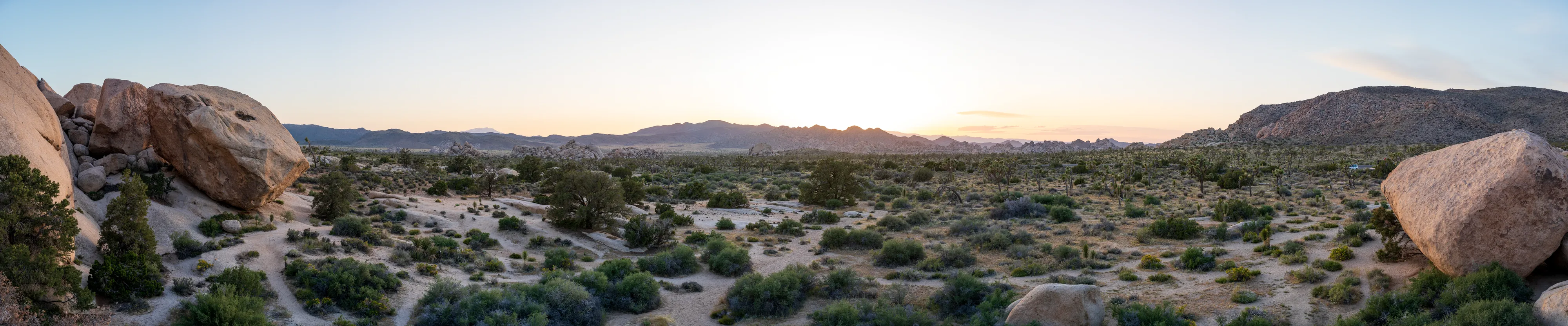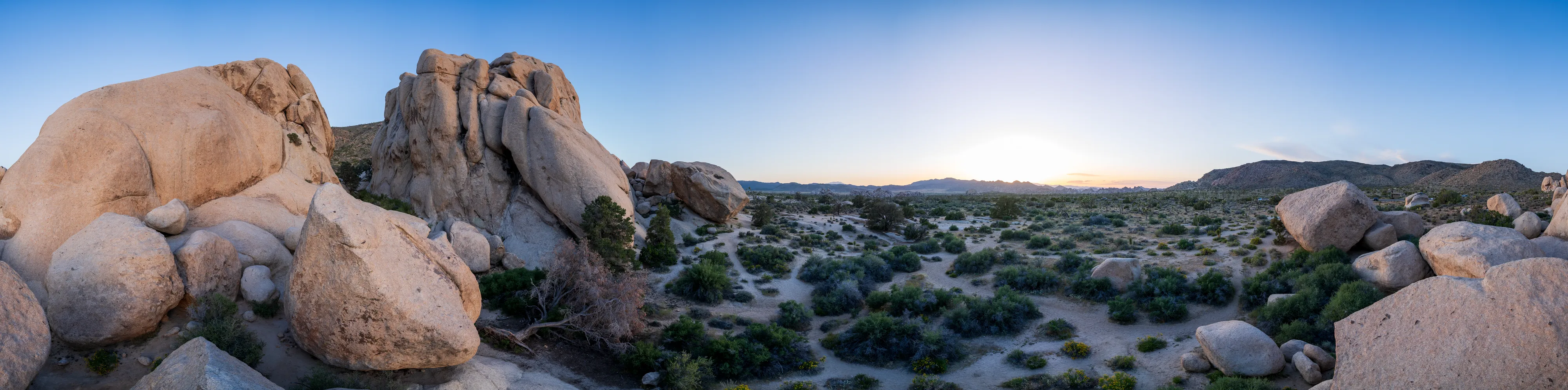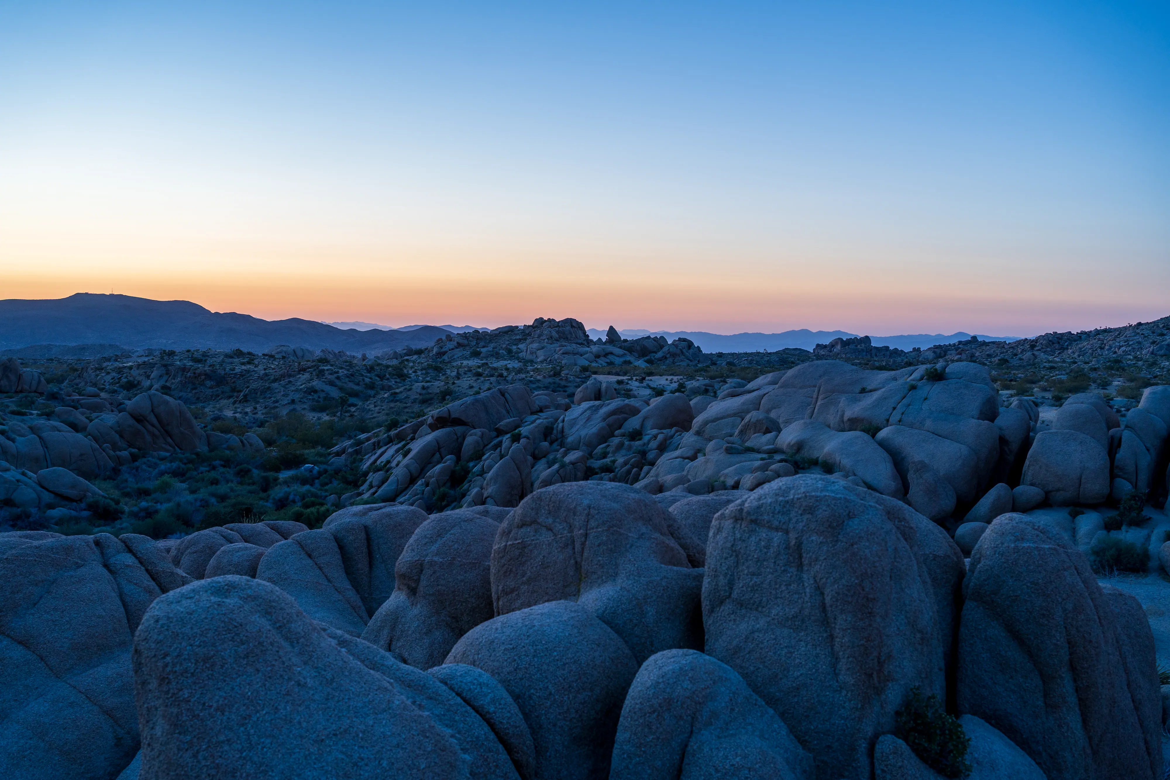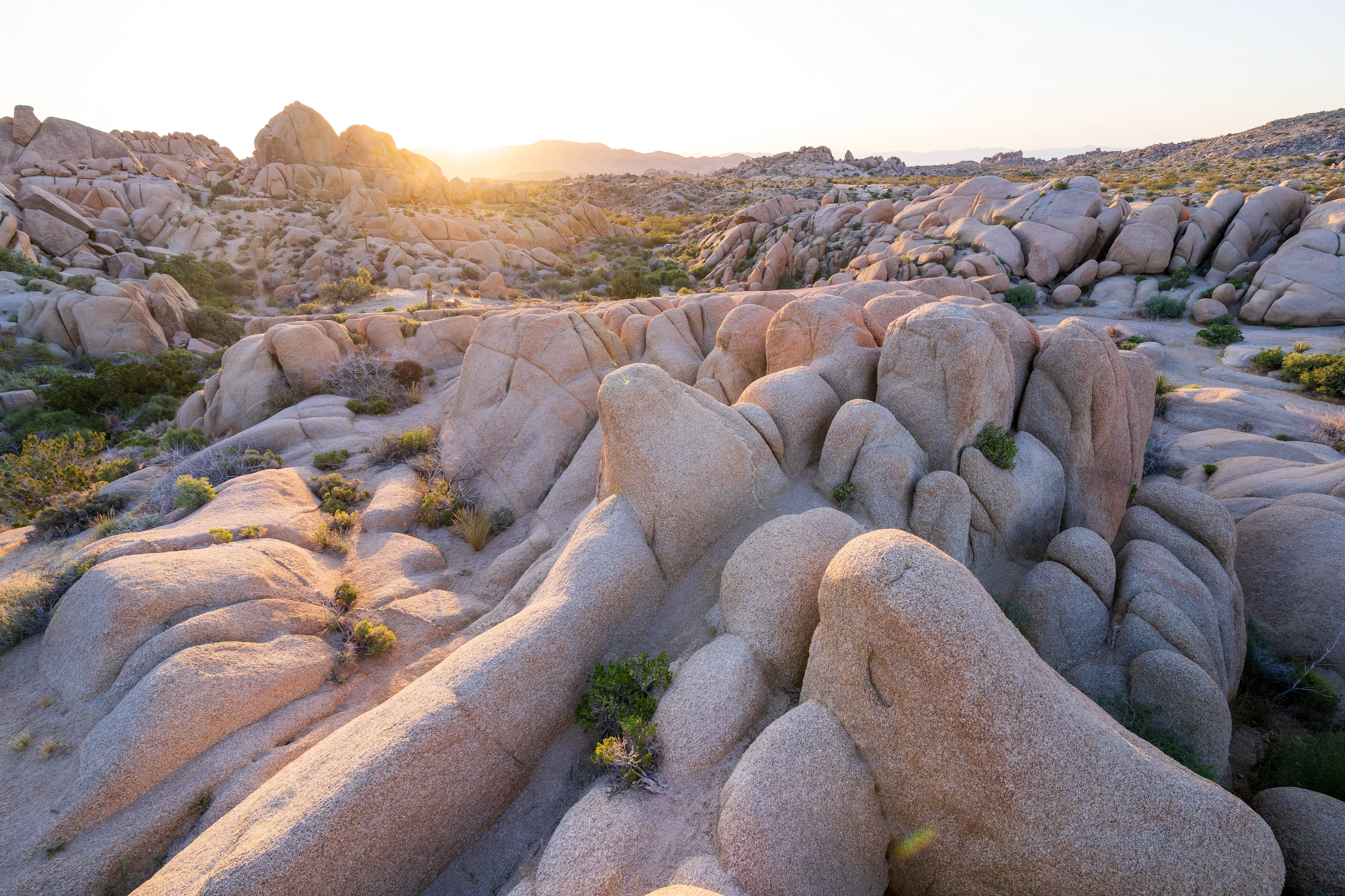 Auf dem Weg zu unserem heutigen Tagesziel, dem Jumbo Rock Campground erleben wir einen weiteren tollen Sonnenuntergang. Insbesondere die großen Granitfelsen in der Ebene des Parks sehen in der Abenddämmerung einfach fantastisch aus und geben ein grandioses Fotomotiv ab.