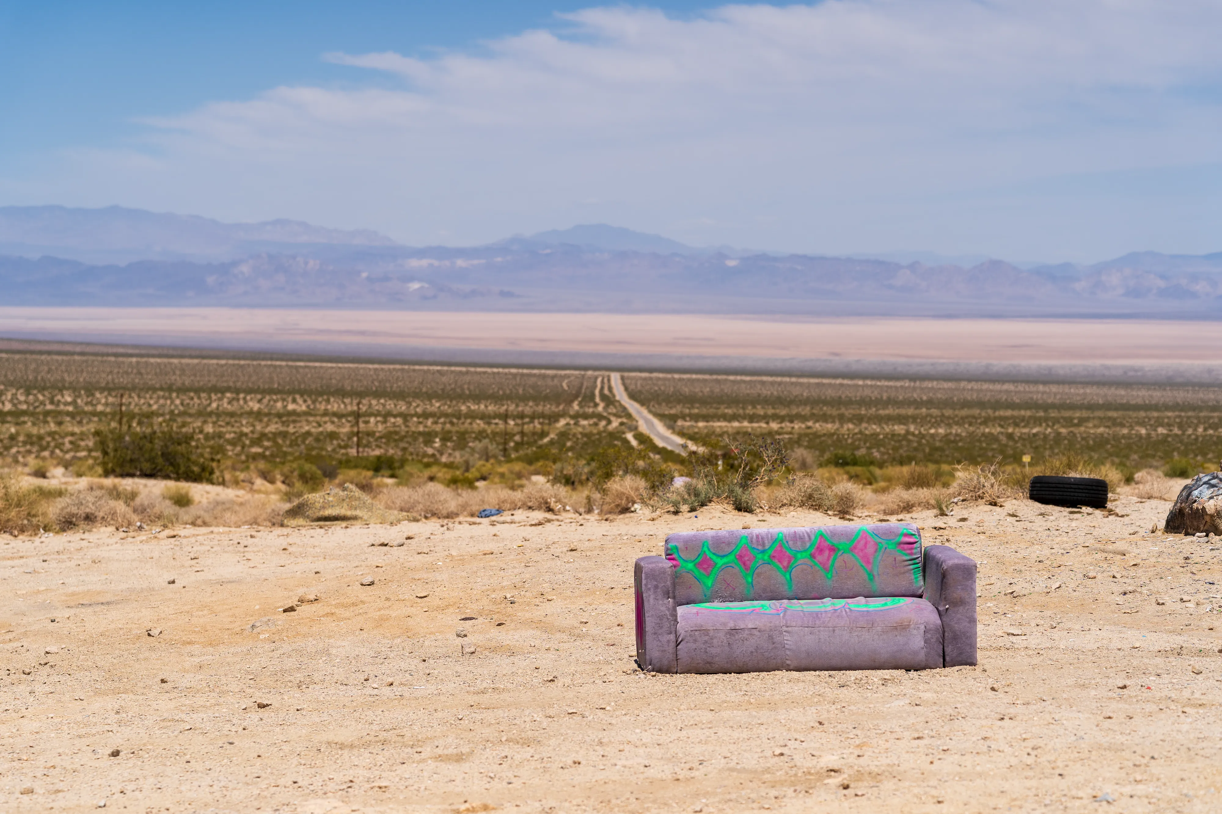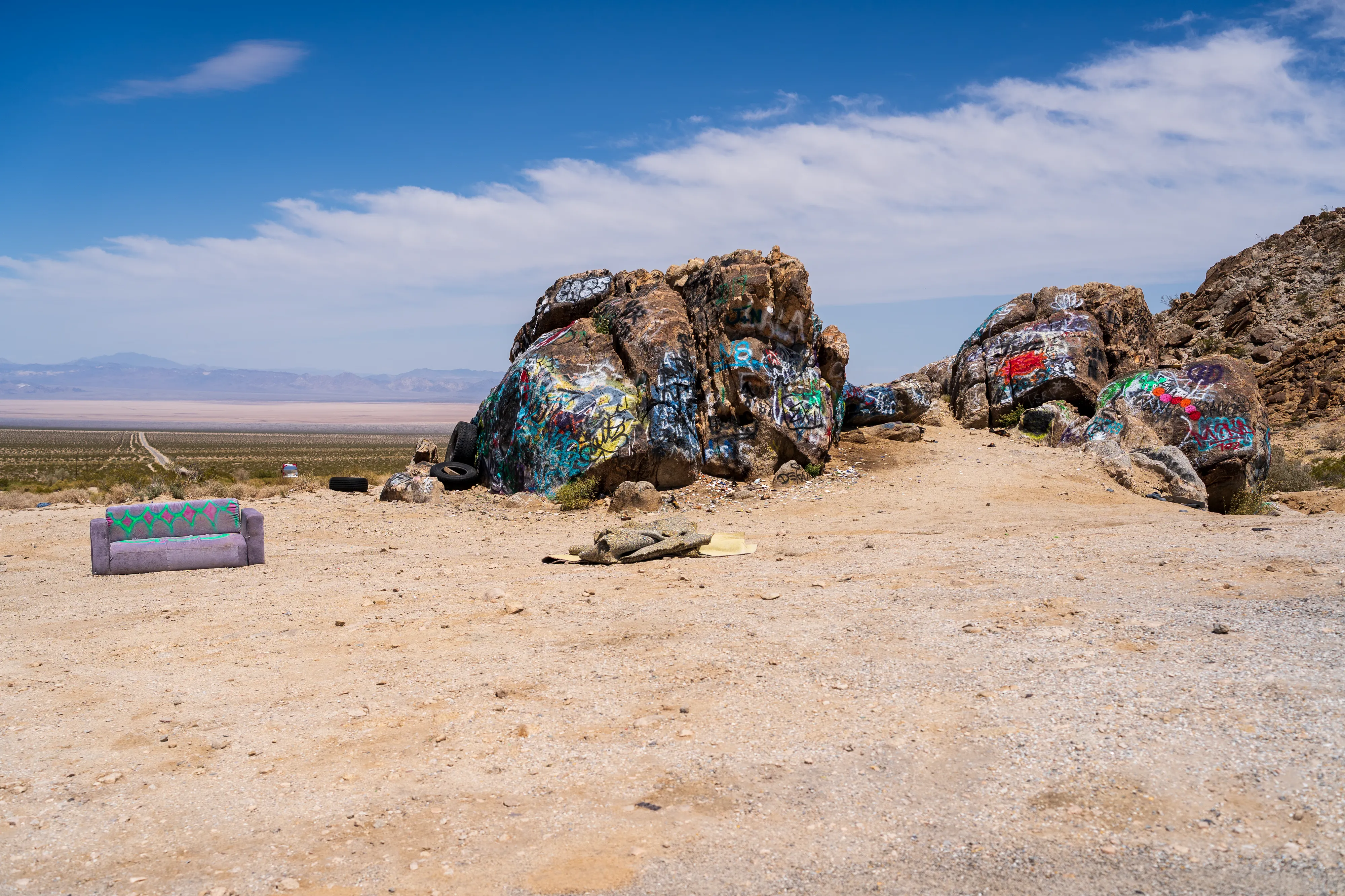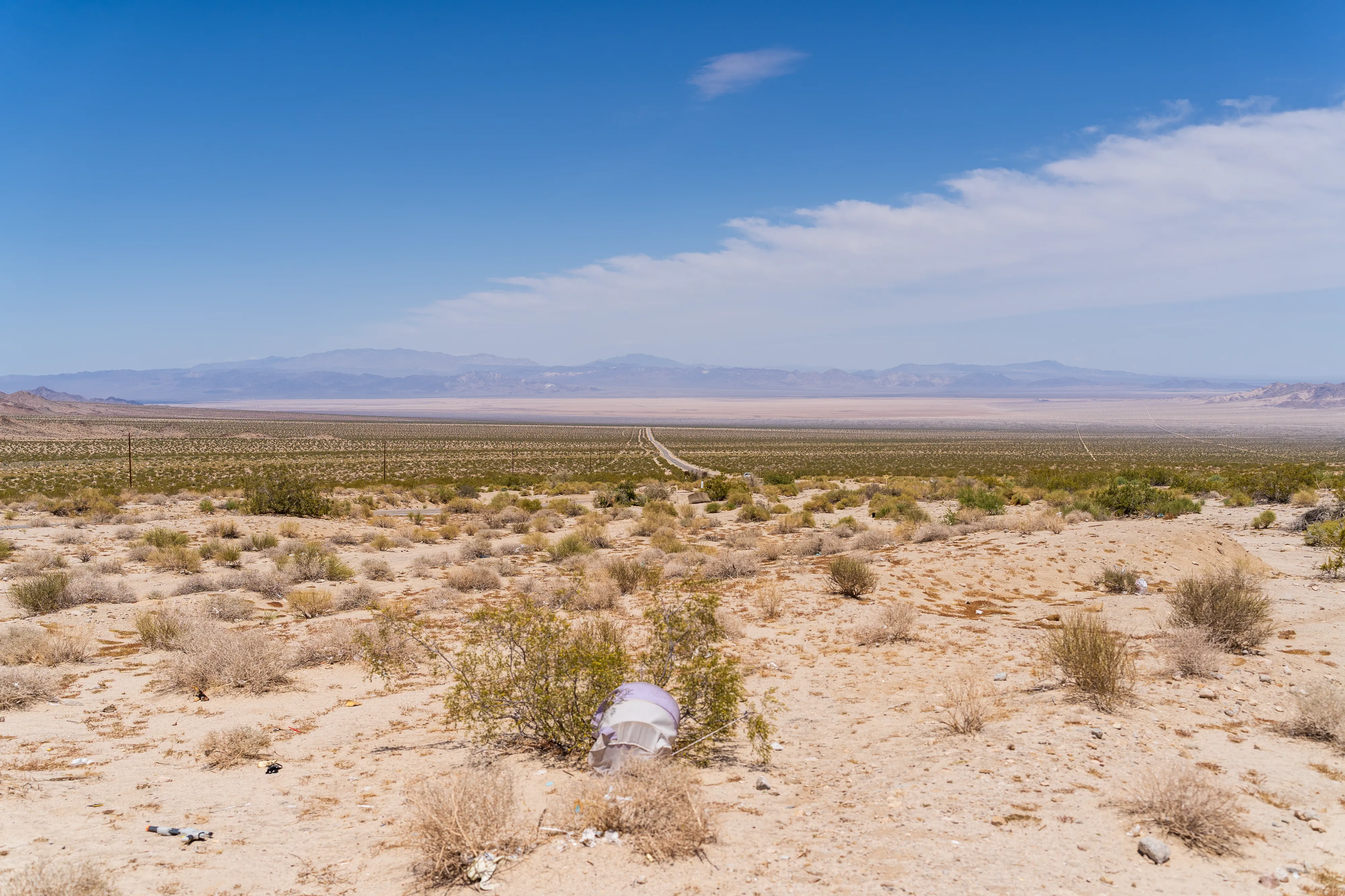 Aber der Reihe nach. Von Twentynine Palms fahren wir fast 30 km geradeaus - tatsächlich ohne eine einzige Kurve führt die Straße schnurgerade durch die Landschaft. Nicht nur die Straße bietet wenig Abwechslung, auch die Landschaft ist recht karg und die Vegetation beschränkt sich auf niedrige Büsche. Entlang der Straße scheinen jedoch einige Menschen in Bungalows zu wohnen - und wir fragen uns, was einen wohl in diese nicht gerade lebensfreundliche Landschaft verschlagen mag. Noch mehr allerdings fragen wir uns, wieso sich hier so viel Müll in der Landschaft findet. Die Tatsache, dass Menschen ihren Müll einladen, dann etliche Meilen durch die Gegend fahren, nur um sich dann seiner am Straßenrand zu entledigen, schockiert ein wenig.