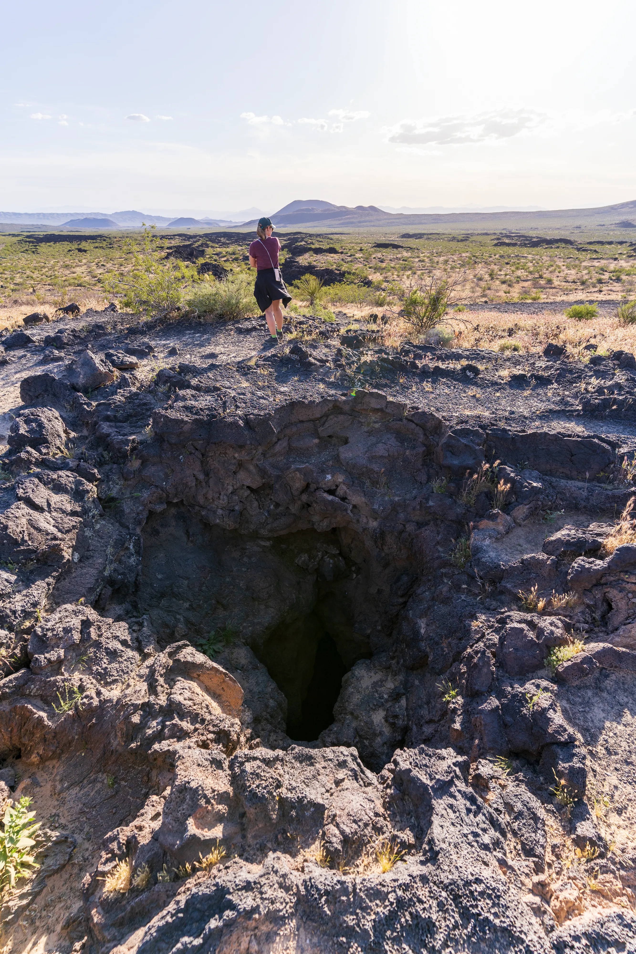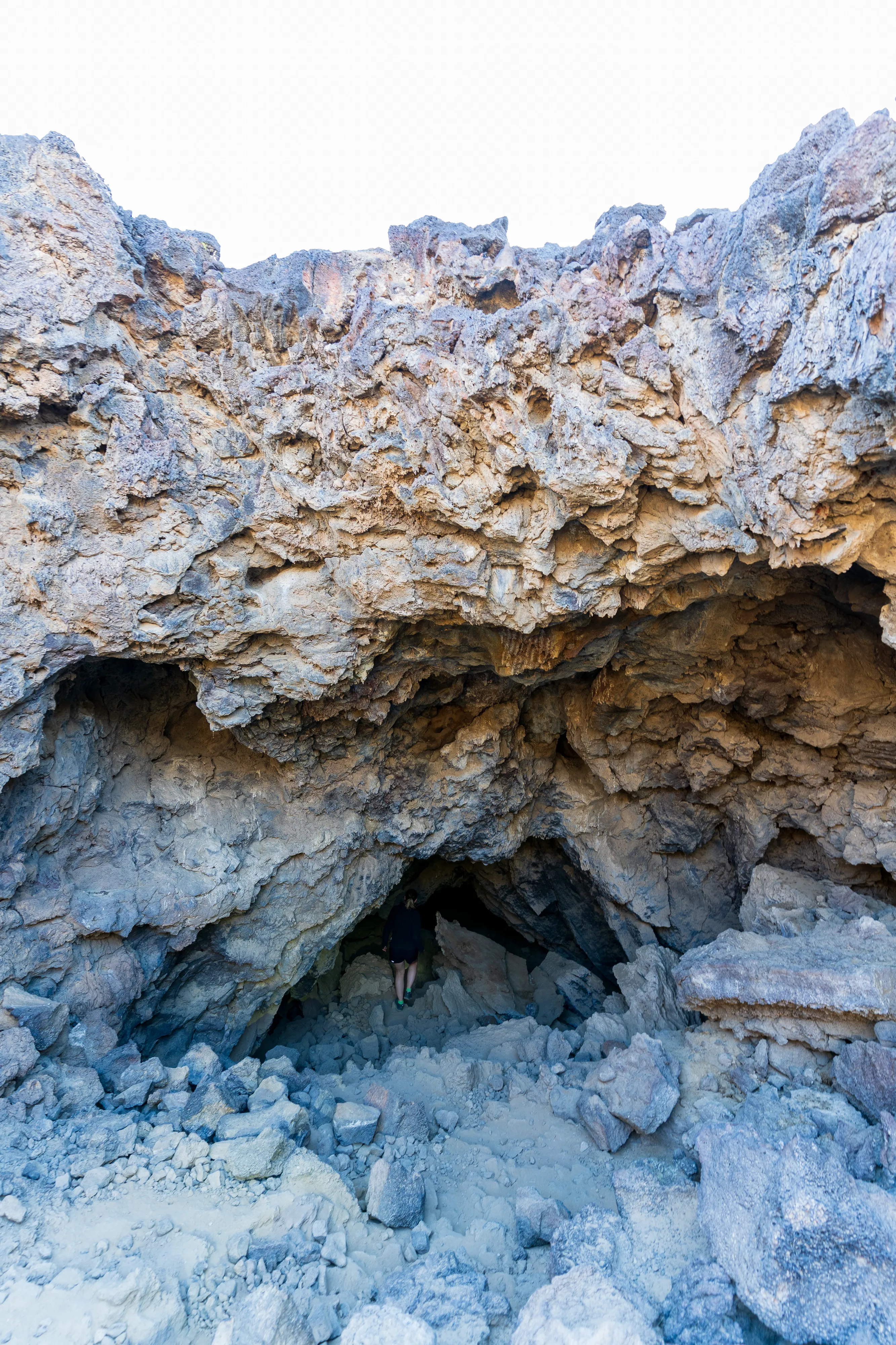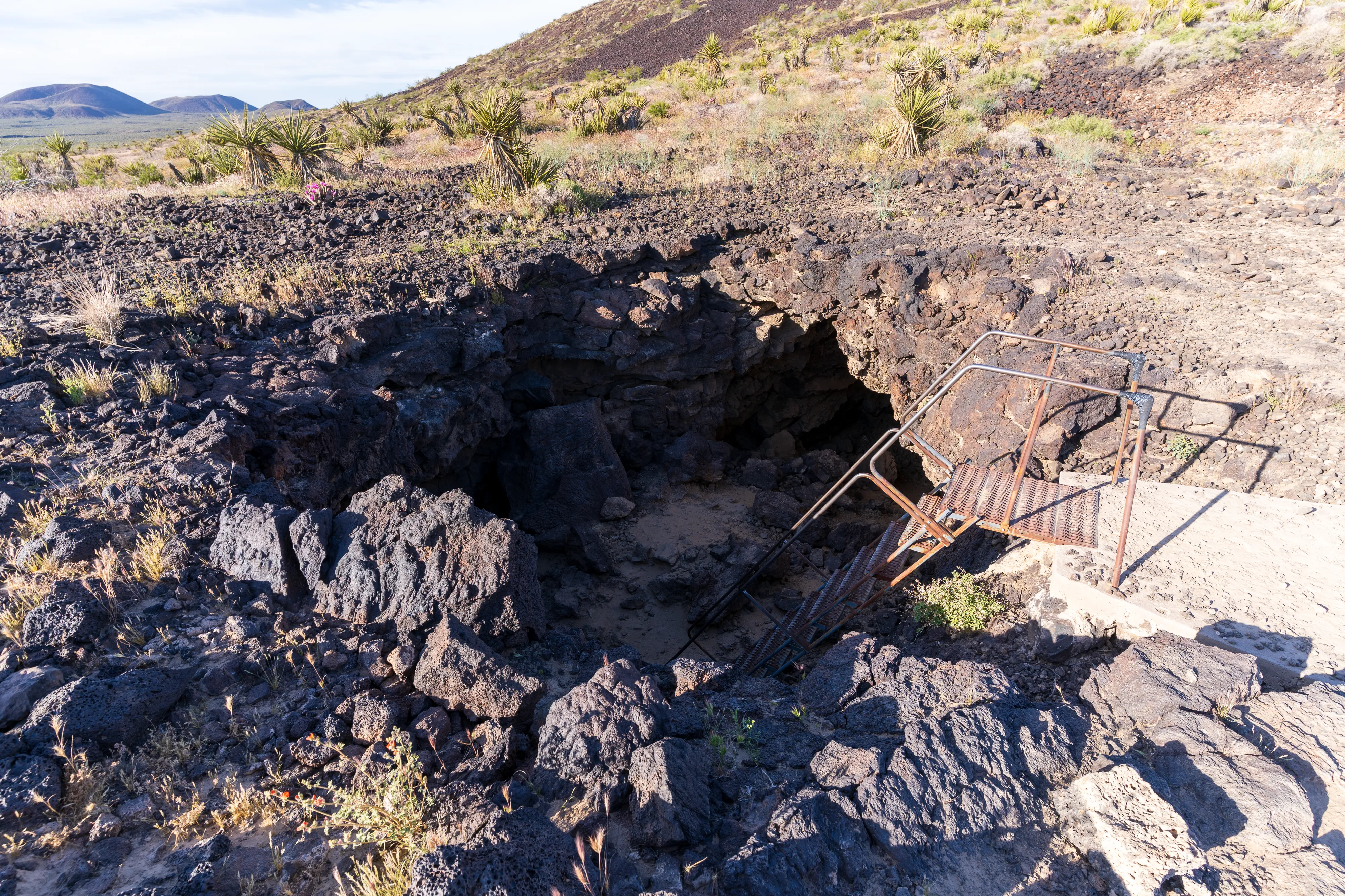 Nächster Stopp ist eine, ein paar Meilen östlich der Hauptstraße gelegene, Lava Tube. Auf der Anfahrt sind wir mehr als froh ein Auto mit viel Bodenfreiheit und Allradantrieb zu haben. Mit einem Kleinwagen wären wir vermutlich nur sehr langsam vorangekommen - immer mit der Angst, im Sand stecken zu bleiben oder aufzusetzen. In der Gegend finden sich einige Vulkane - und diese sind natürlich auch eine Voraussetzung dafür, dass sich Lava Tubes bilden. Sie entstehen, wenn ein Lavastrom einen Vulkan hinabfließt, außen abkühlt aber innen weiterfließt. So bleibt von dem Strom nur eine Hülle übrig, welche man dann begehen kann. Solche Höhlen sind vergleichsweise selten und frei begehbare Exemplare noch viel weniger. Insofern ist das schon etwas Besonderes.