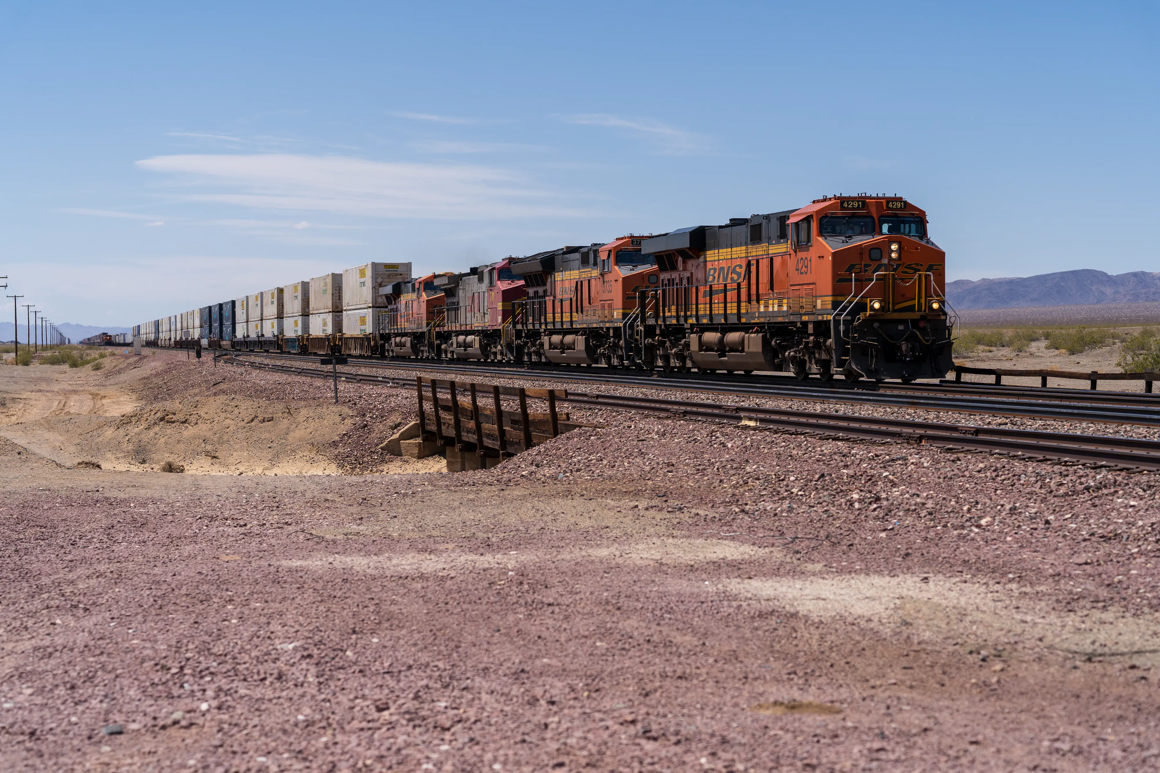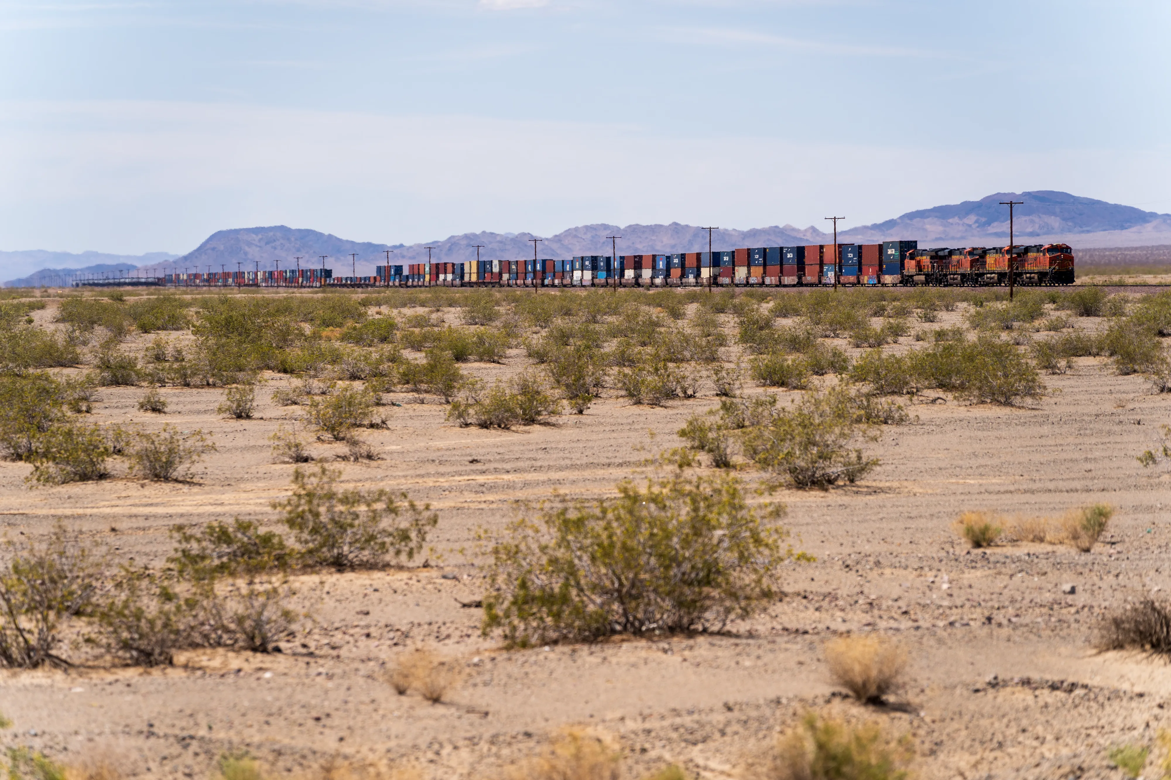 Nach vielen Meilen Einöde kreuzen wir bei dem Örtchen Amboy - wobei das eigentlich schon eine Übertreibung ist - eine wichtige Eisenbahnlinie, welche den Großraum Los Angeles mit dem Inland verbindet.