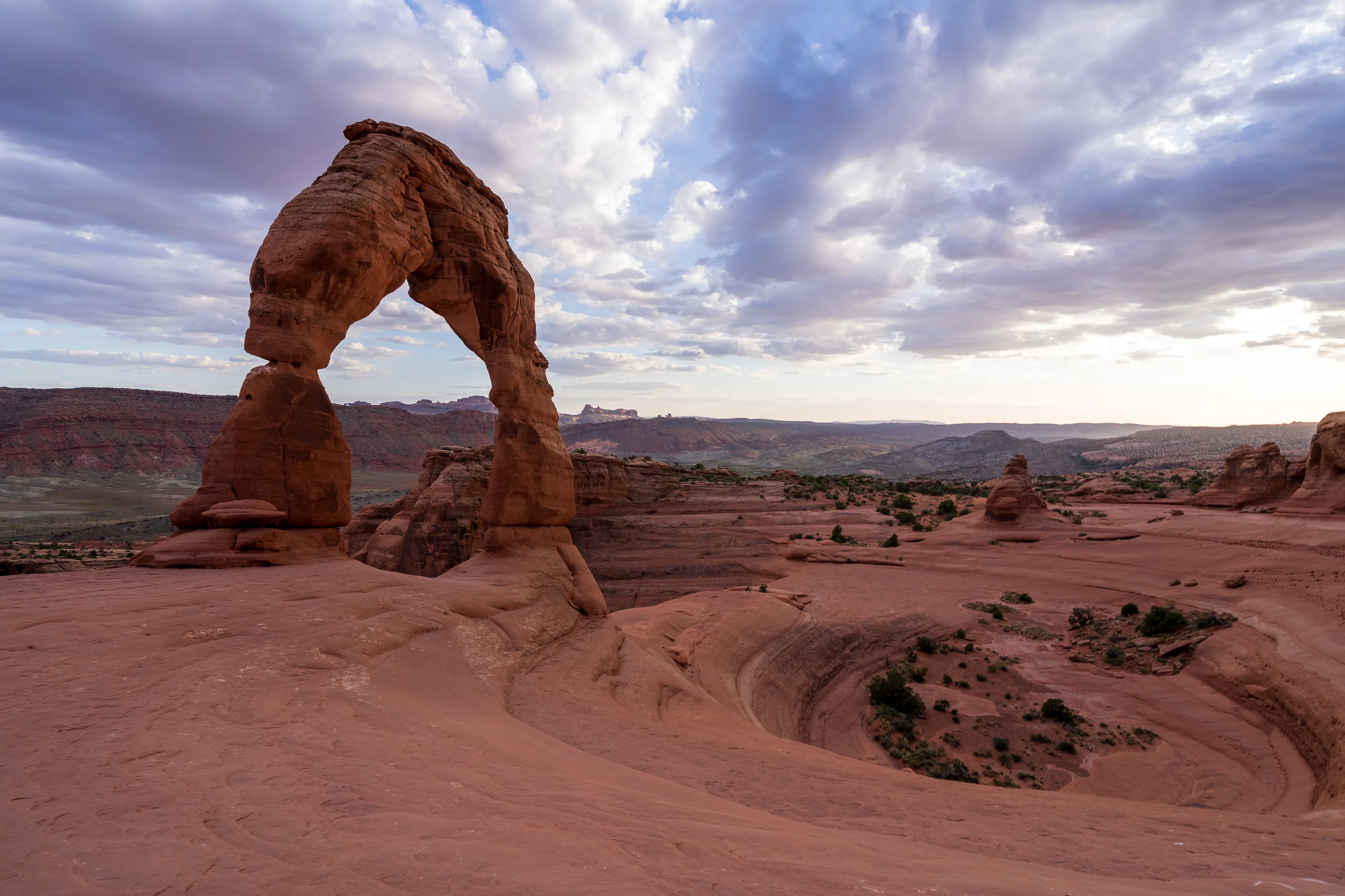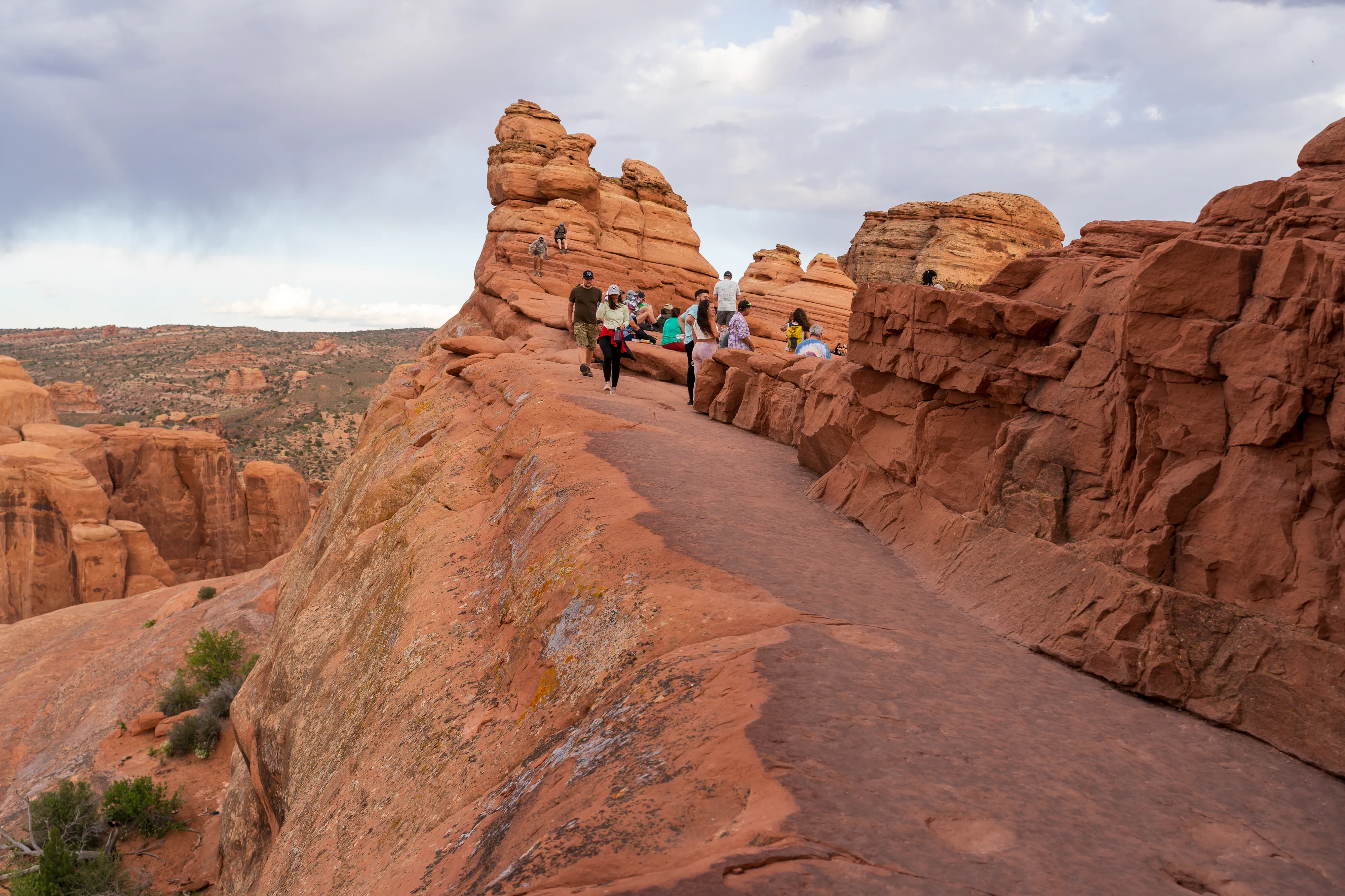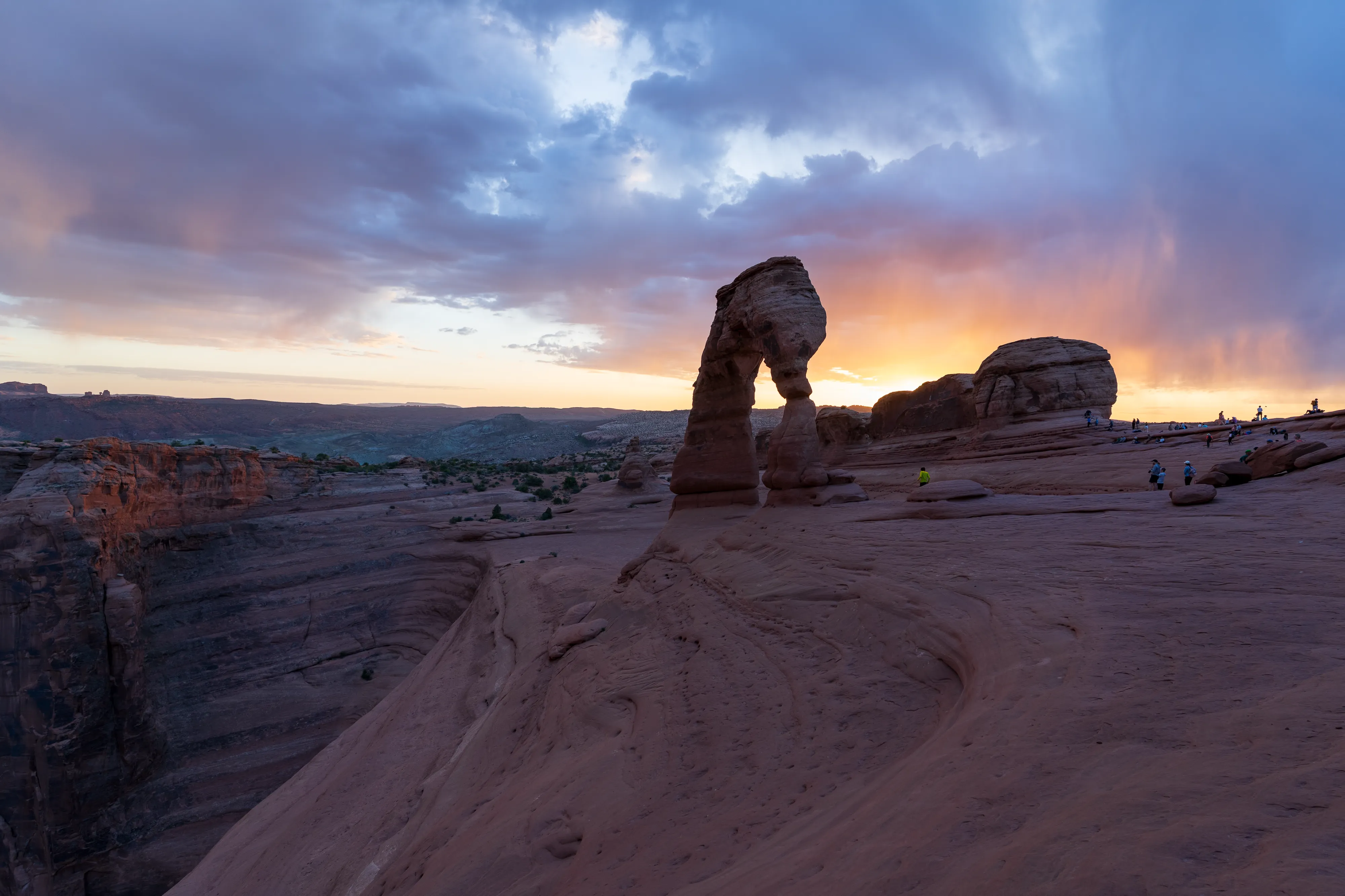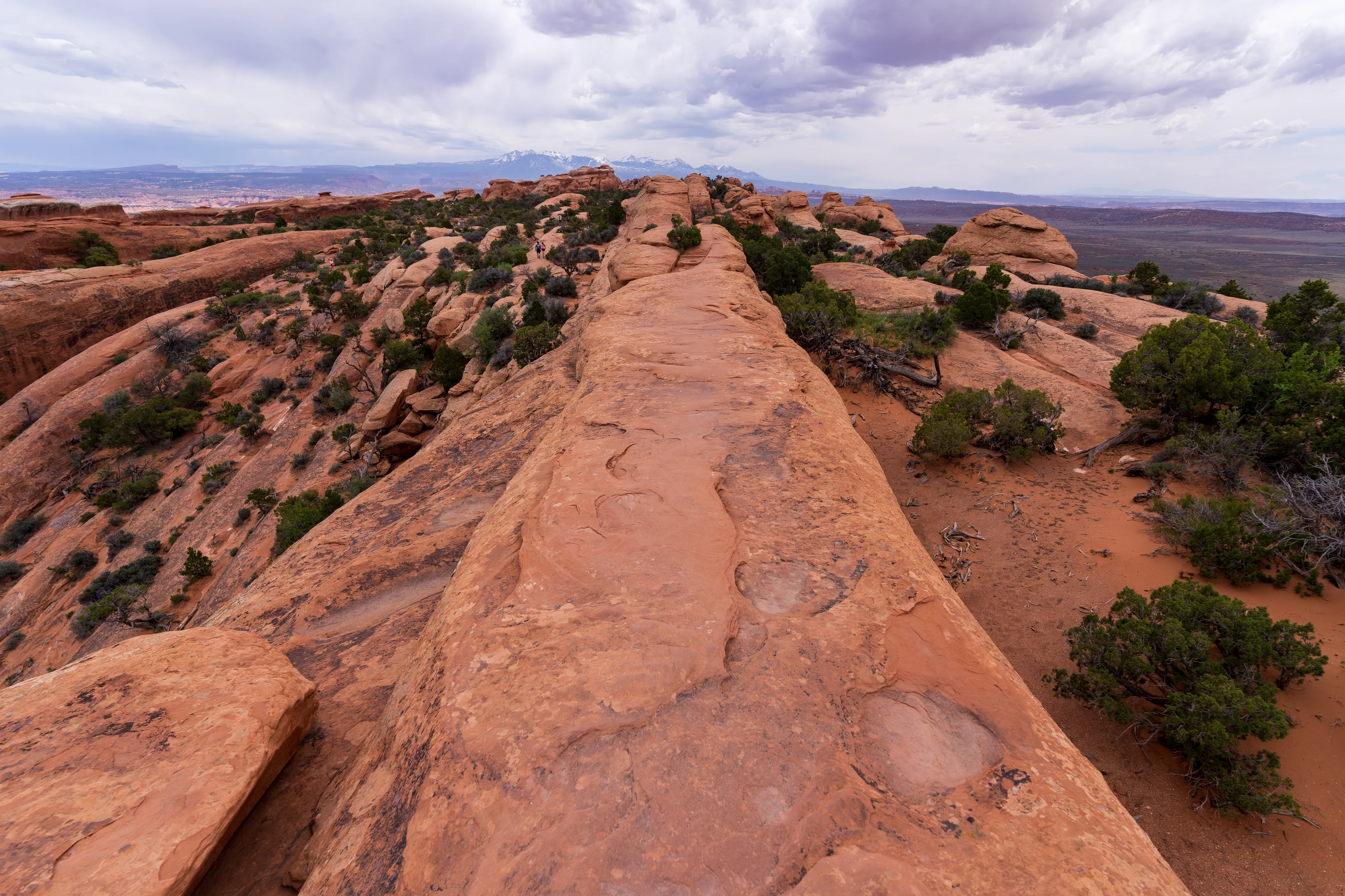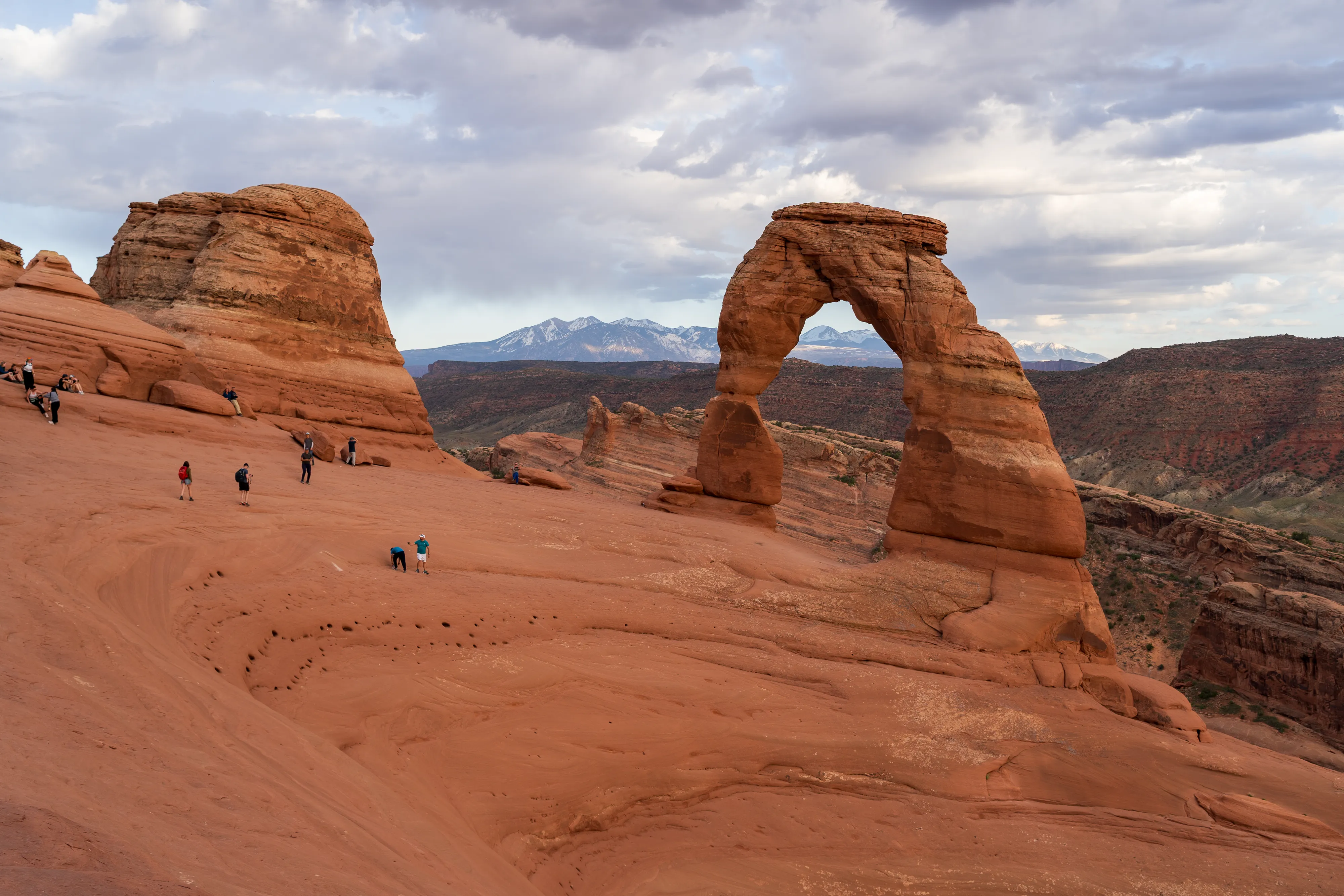Am späten Nachmittag fahren wir zum Parkplatz des zum Delicate Arch führenden Wanderwegs. Für den Fall, dass man sich tagsüber wundert, wo die ganzen Touristen in diesem beliebten NP sind - hier bekommt man die Antwort. In großer Kolonne marschieren wir also die 2,5 km zum vermutlich berühmtesten Arch der USA, welcher als Wahrzeichen Utah’s auch ein mögliches Motiv der hiesigen Nummernschilder ist. Und der Hype ist gerechtfertigt!