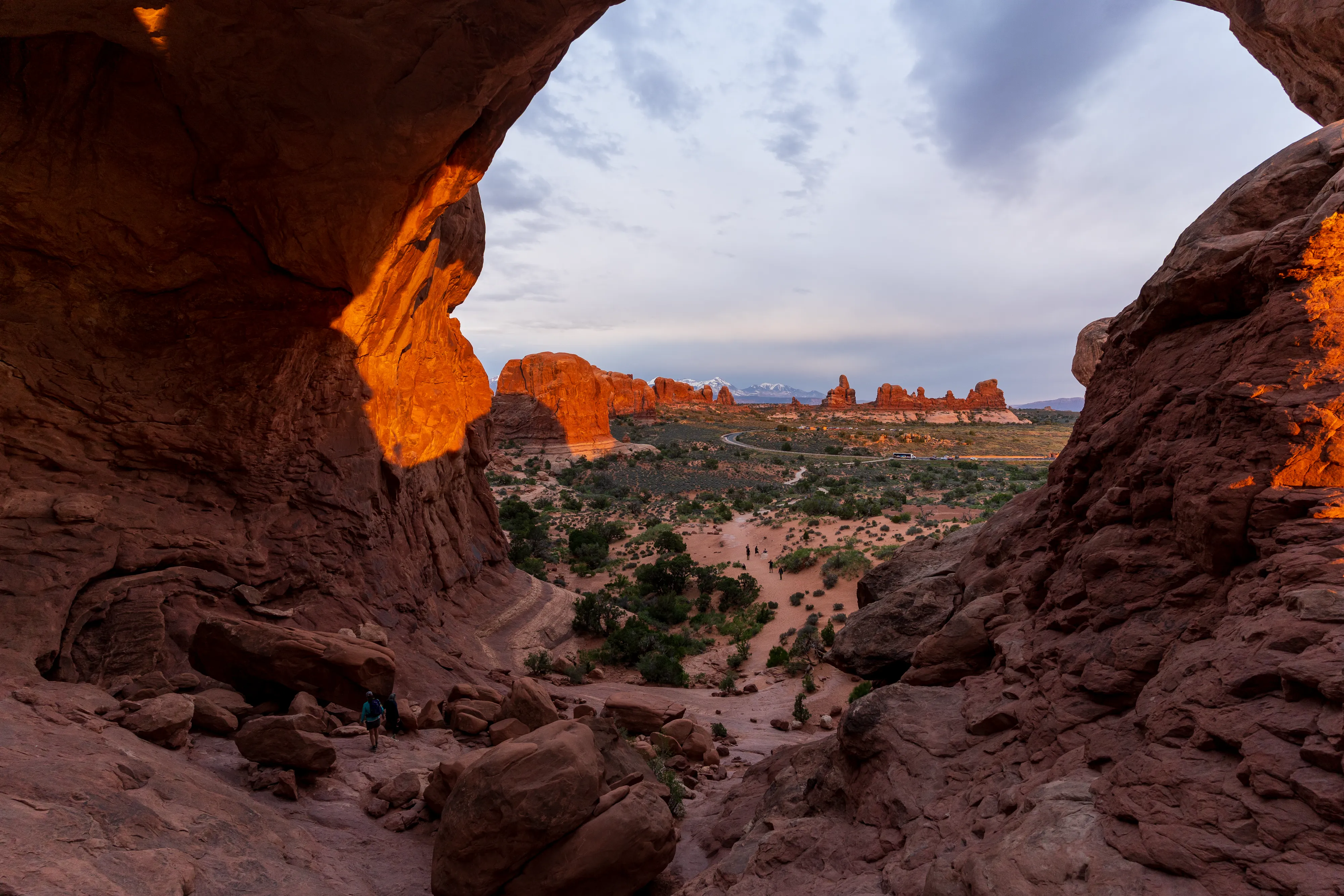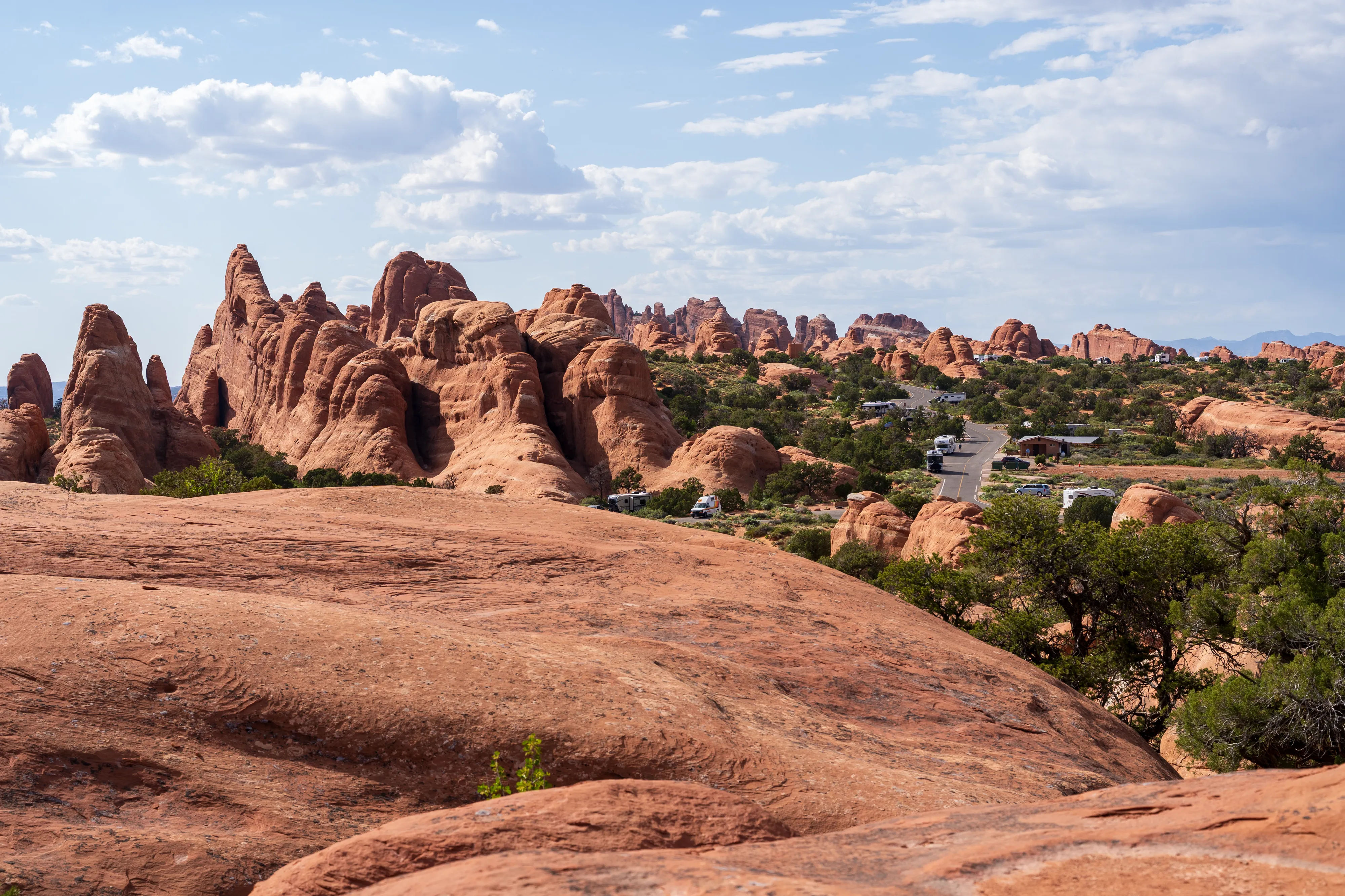 Nachdem wir die Nacht auf dem ersten und einzigen privaten Campingplatz unserer Tour verbracht haben (mehr dazu später), fahren wir zum Arches National Park. Da der Park sich enormer Beliebtheit erfreut, gibt es neuerdings ein Pilotprojekt, welches die Buchung eines “Timed Entry Tickets” erforderlich macht. Erster Stopp ist das Visitor Center, wo wir den im voraus ergatterten Permit für den Fiery Furnace abholen. Diesen konnte man lediglich 10 Tage im Voraus buchen: frühmorgens auf First-Come-First-Serve Basis. Bevor wir diesen jedoch bekommen, müssen ein “Schulungsvideo” anschauen und ein kleines Quiz bestehen. Vorrangig geht es dabei darum, den Besuchern nachträglich einzuschärfen keinen Abfall zu hinterlassen, keine Pflanzen zu beschädigen, keine Graffiti anzubringen und nicht auf Arches zu klettern. Haben wir ja aber alles nicht vor.