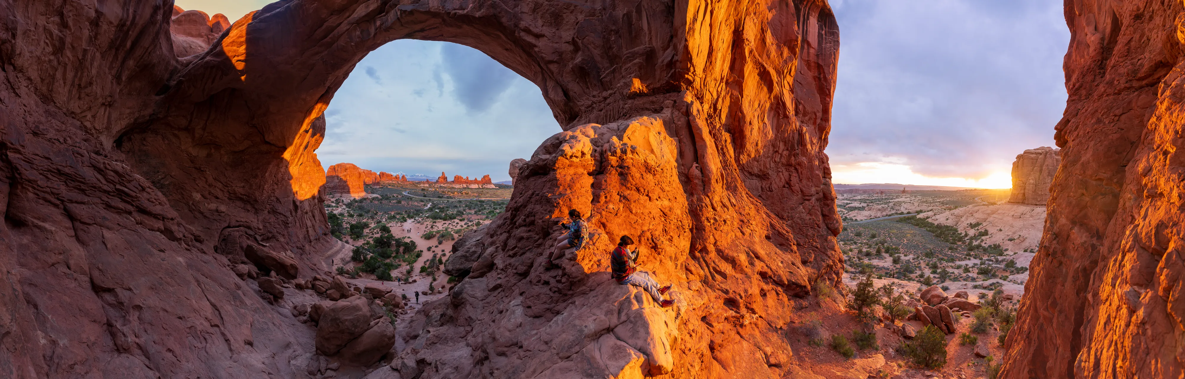 Sonnenuntergang im Double Arch. Aus der Nähe sind die Bögen dann meist noch größer und beeindruckender als es aus der Ferne (oder auf Fotos) scheinen mag.