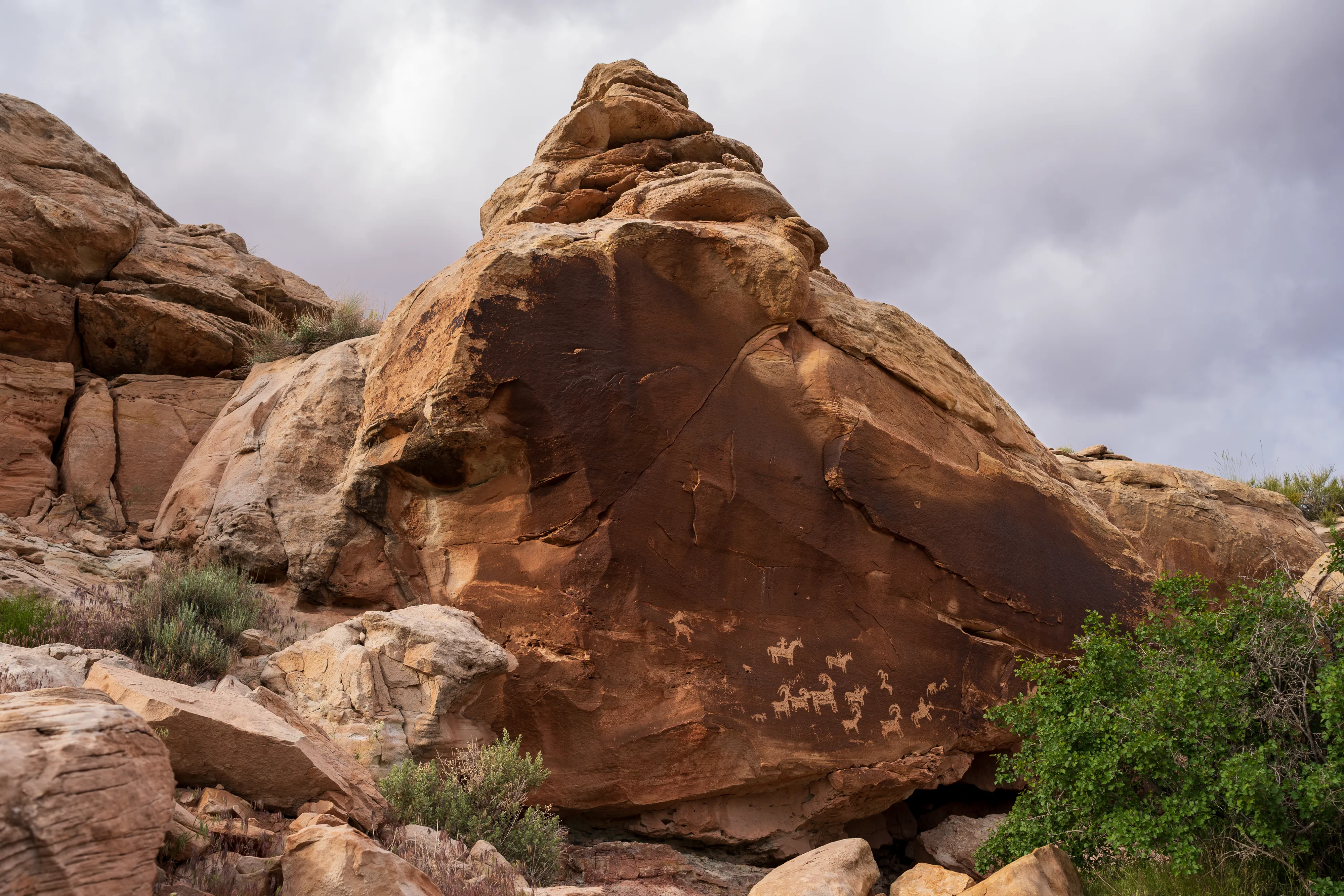 Am rechten untereren Rand des Felsen finden sich Petroglyphen der Ute, einem Stamm der Native Americans.