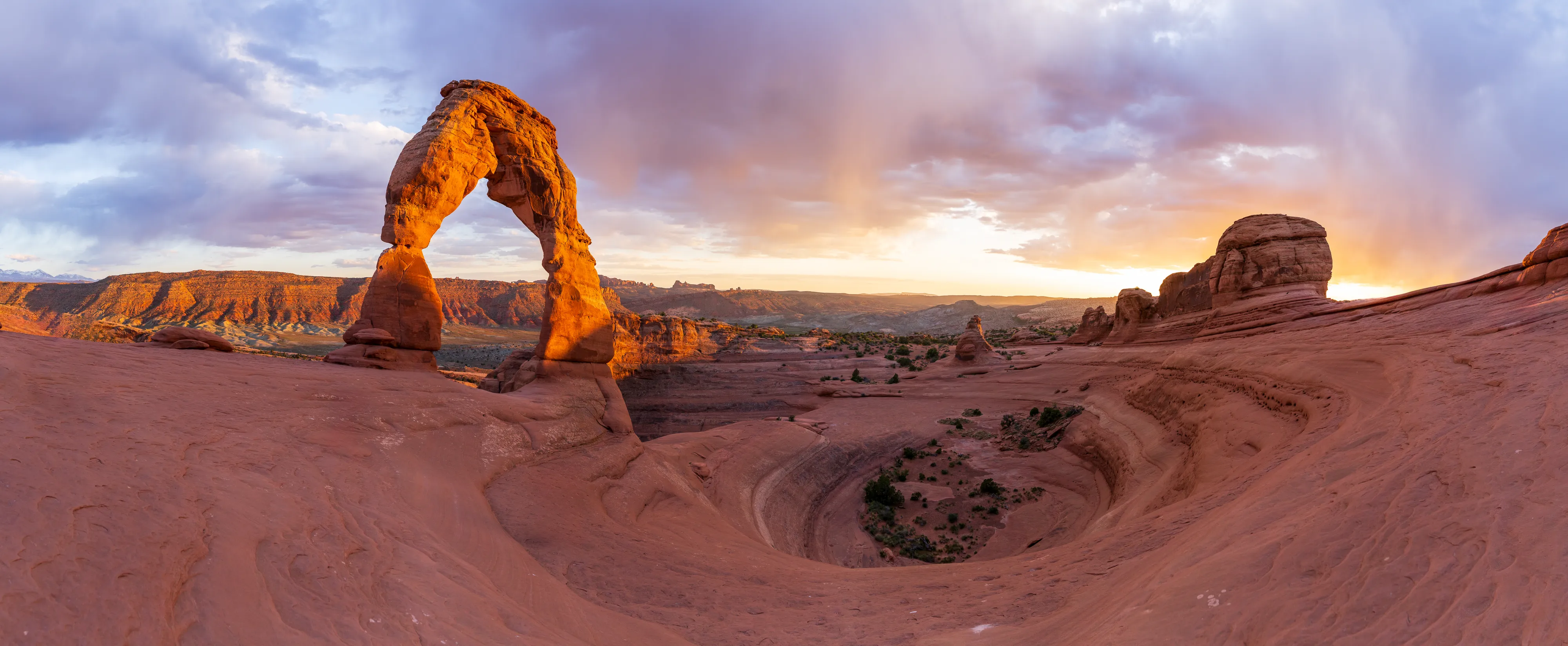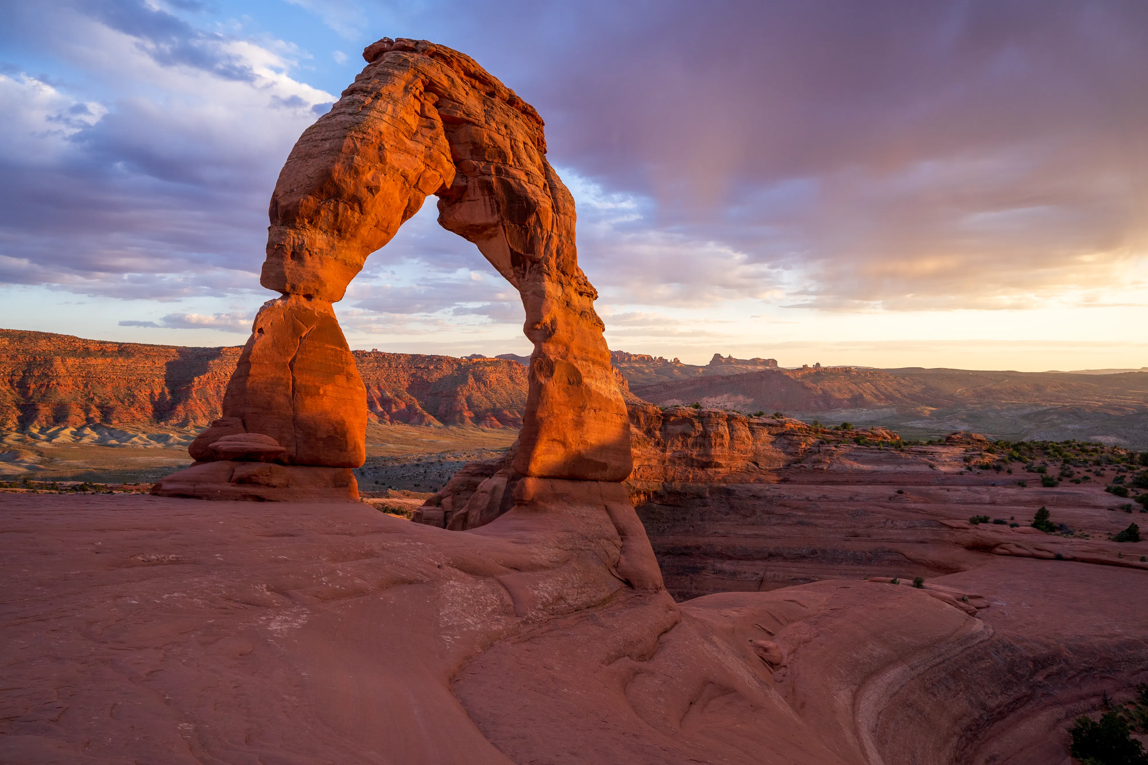 Der Delicate Arch steht am Rande eines natürlichen Amphitheaters in großartiger Kulisse gänzlich frei. Da der Bogen so grazil ist, wirkt er nicht wie ein Loch in einem Felsen - sondern eben wie ein Bogen. Dieses Wunder der Natur kombiniert mit einer untergehenden Sonne, die die Felsen in ein goldenes, warmes Licht taucht und den Himmel rötlich einfärbt, ist einfach spektakulär!