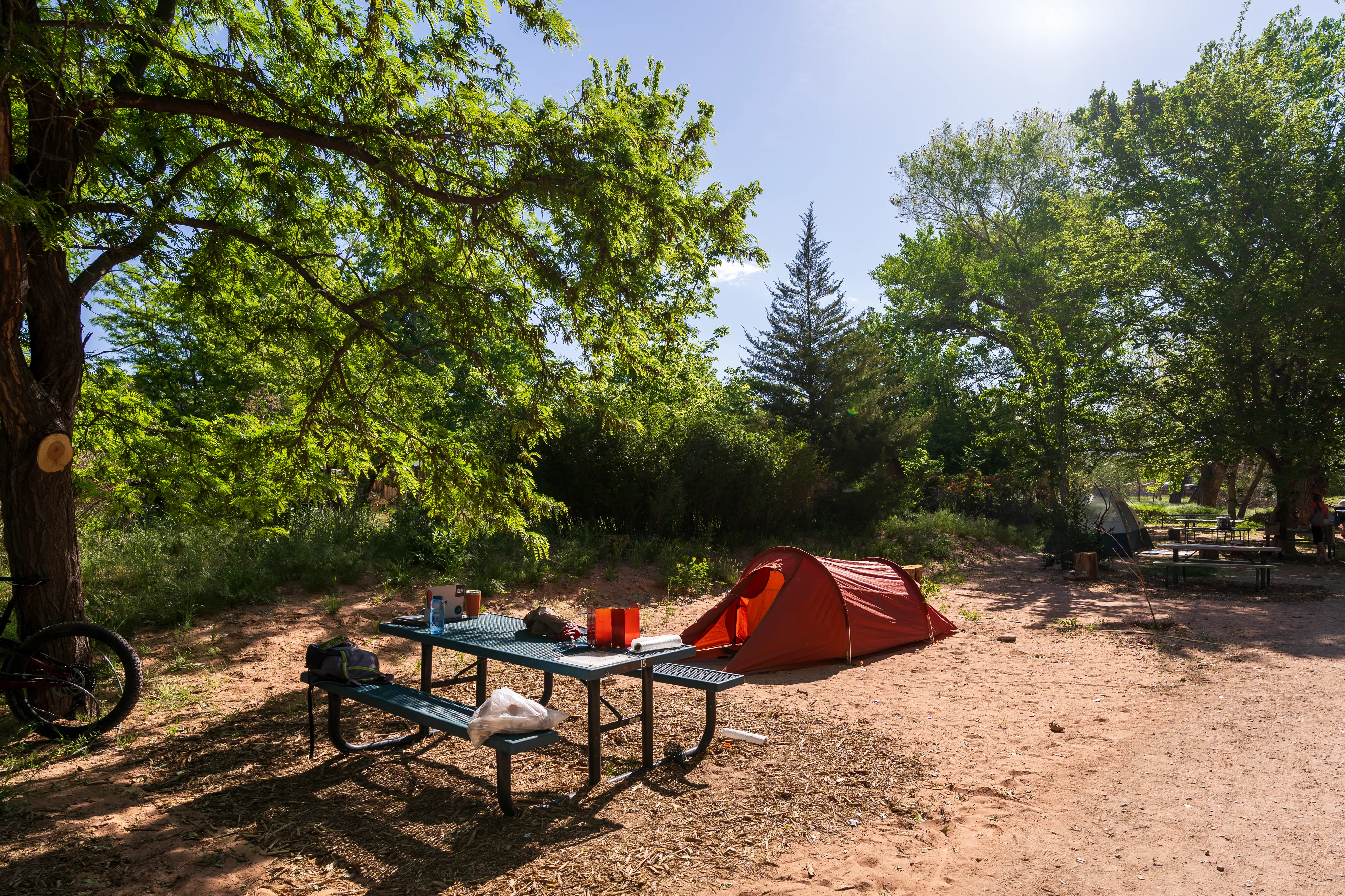 Hier hat es sich der Betreiber des Up The Creek Campground es sich unserer Ansicht nach etwas zu einfach damit gemacht, einfach einen Zettel mit “sind nicht gefährlich” aufzuhängen. Letztlich ist den kleinen Raupen damit nicht geholfen, denn die meisten Zelte werden nicht lange genug stehen bleiben für eine erfolgreiche Verpuppung. Generell würden wir diesen Campingplatz nicht empfehlen, es sei denn, man möchte unbedingt in Moab selbst zelten: Die Plätze sind, für die hiesigen Maßstäbe, recht klein und man liegt Platz an Platz mit seinen Nachbarn. Es gibt Tische, aber je nach Platz keinen Schatten und auch keinen Schutz bei Regen. Bei den State und National Parks, bzw. den angeschlossenen Campingplätzen, haben wir oft dergleichen vorgefunden - und das für deutlich weniger Geld. Beim nächsten Mal würden wir uns sicher ein schönes Plätzchen Public Land suchen.