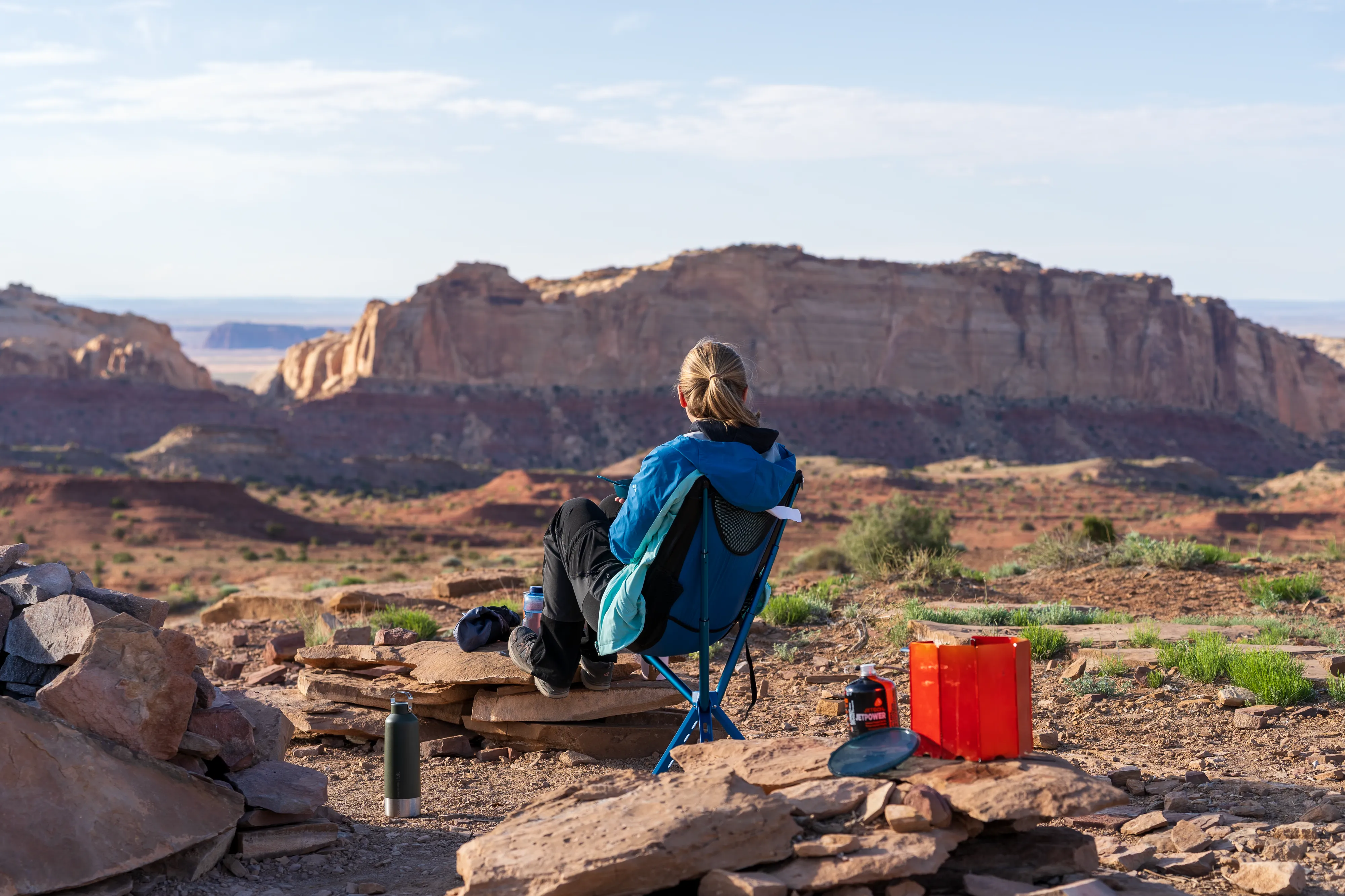 Nach einer Nacht auf Public Land mit grandioser Kulisse, einer gewissen Abgeschiedenheit und ohne Tent Caterpillars - genau das, was wir nach den drei Nächten in Moab gesucht haben - frühstücken wir mit Blick auf den Temple Mountain.