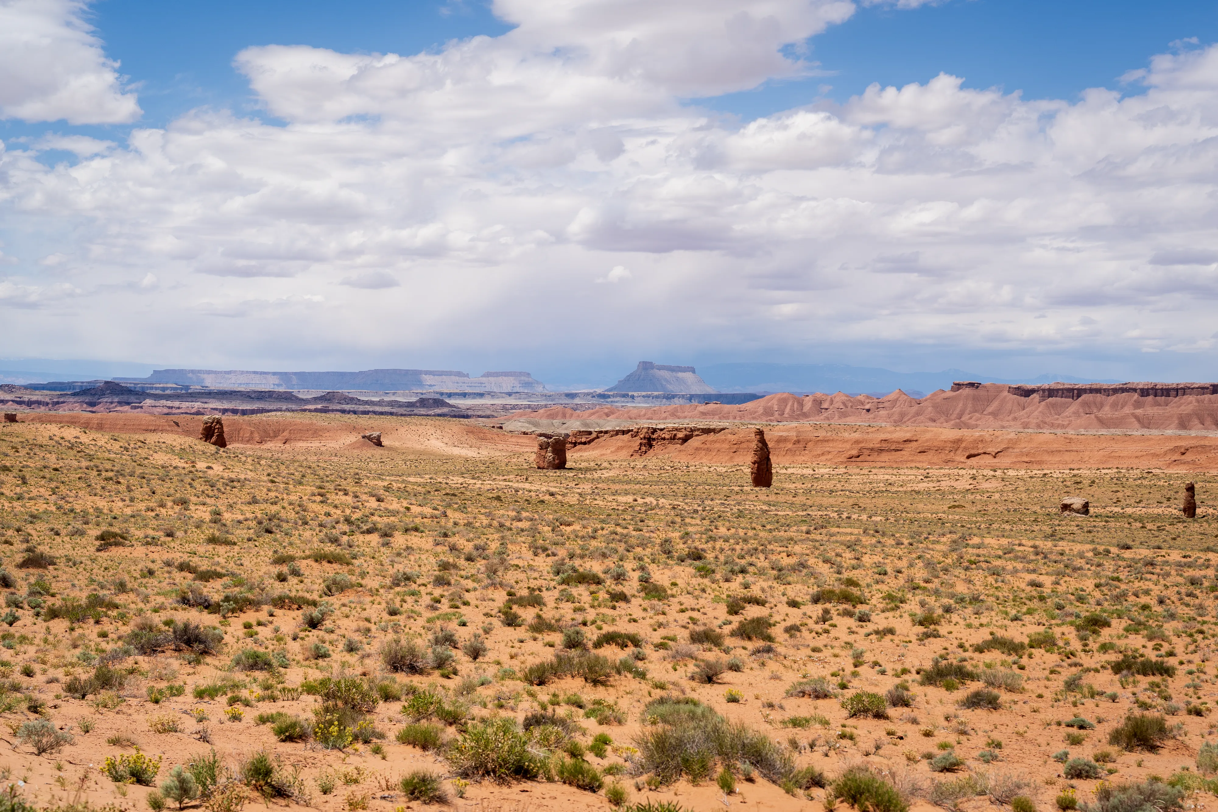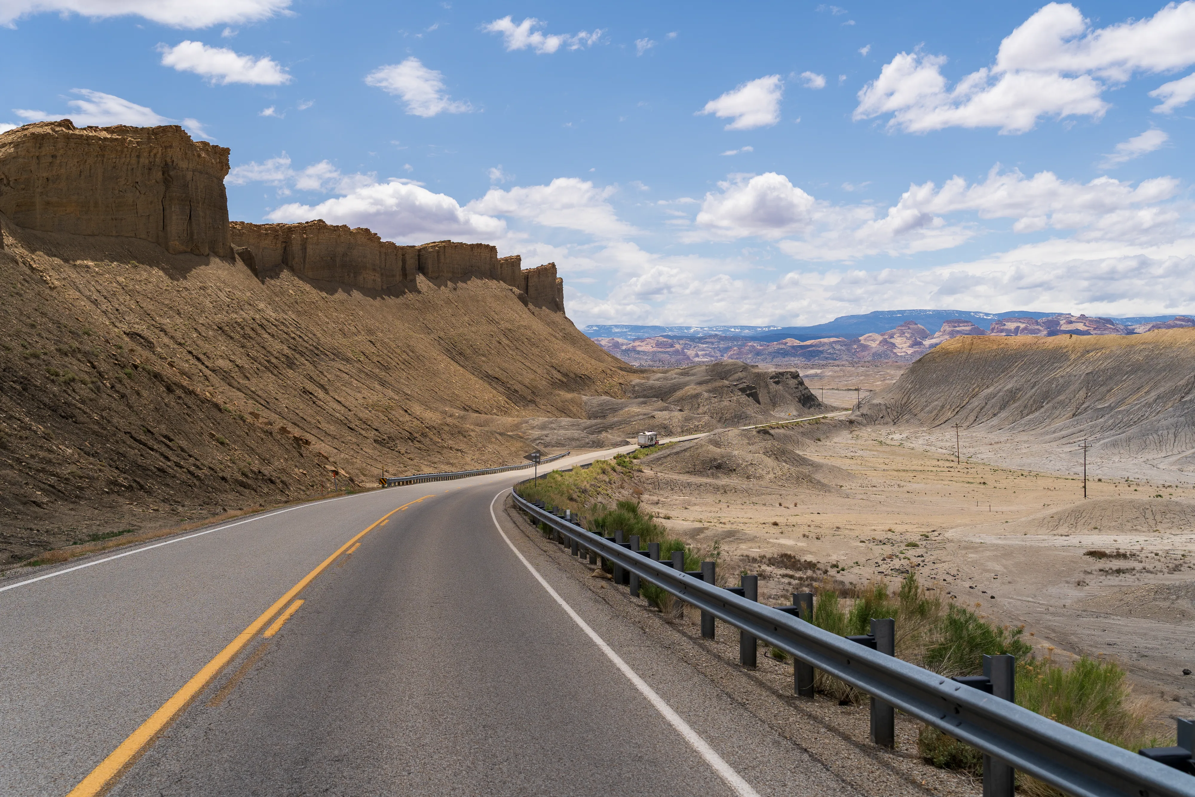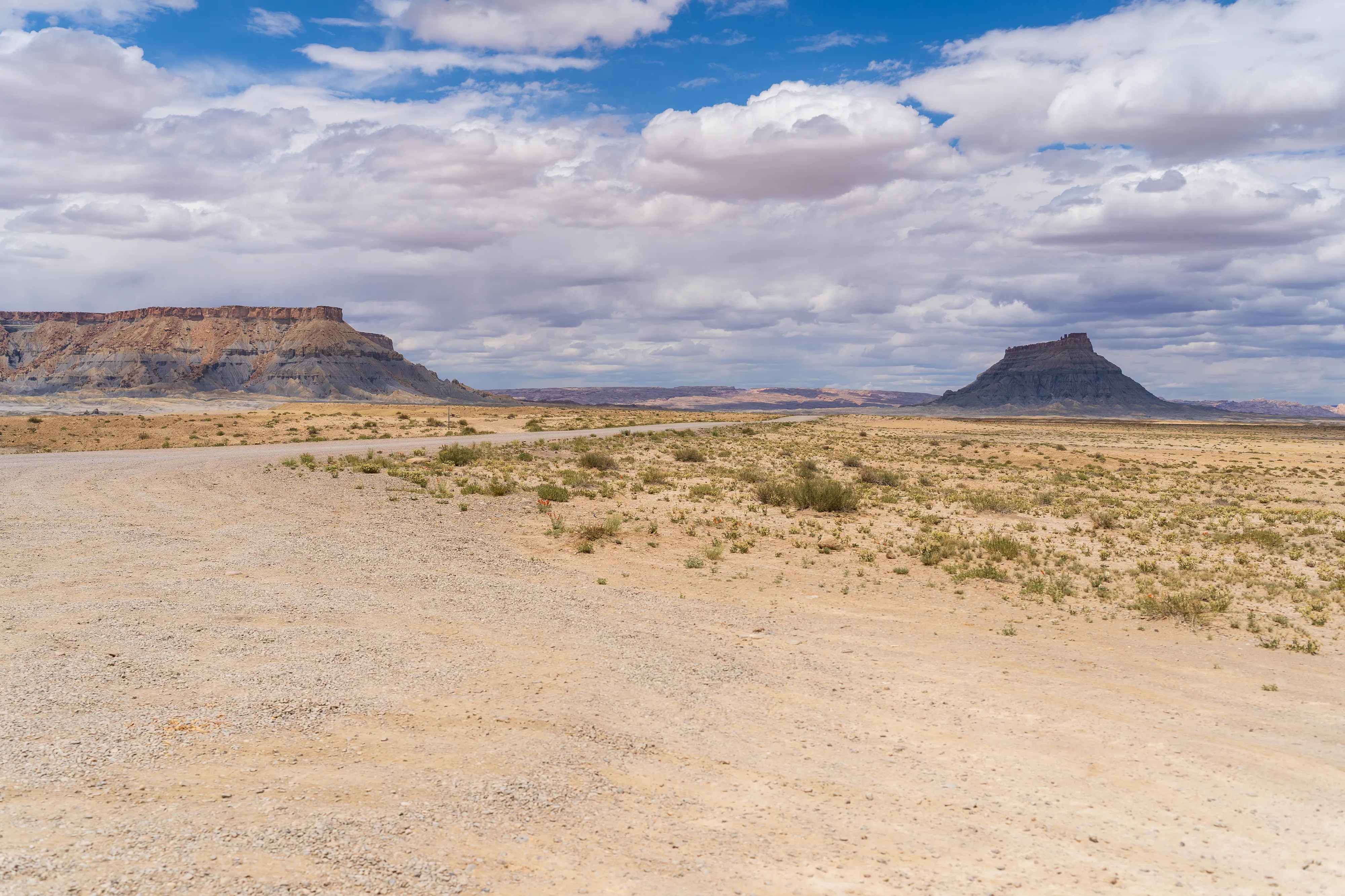 Wir setzen unsere Fahrt Richtung Capitol Reef National Park auf der Utah State Route 24 über Hanksville fort. Am Horizont sehen wir den Factory Butte, einen sehr schmalen, langgestreckten Felsen, der hoch aus der umgebenden Ebene aufragt.