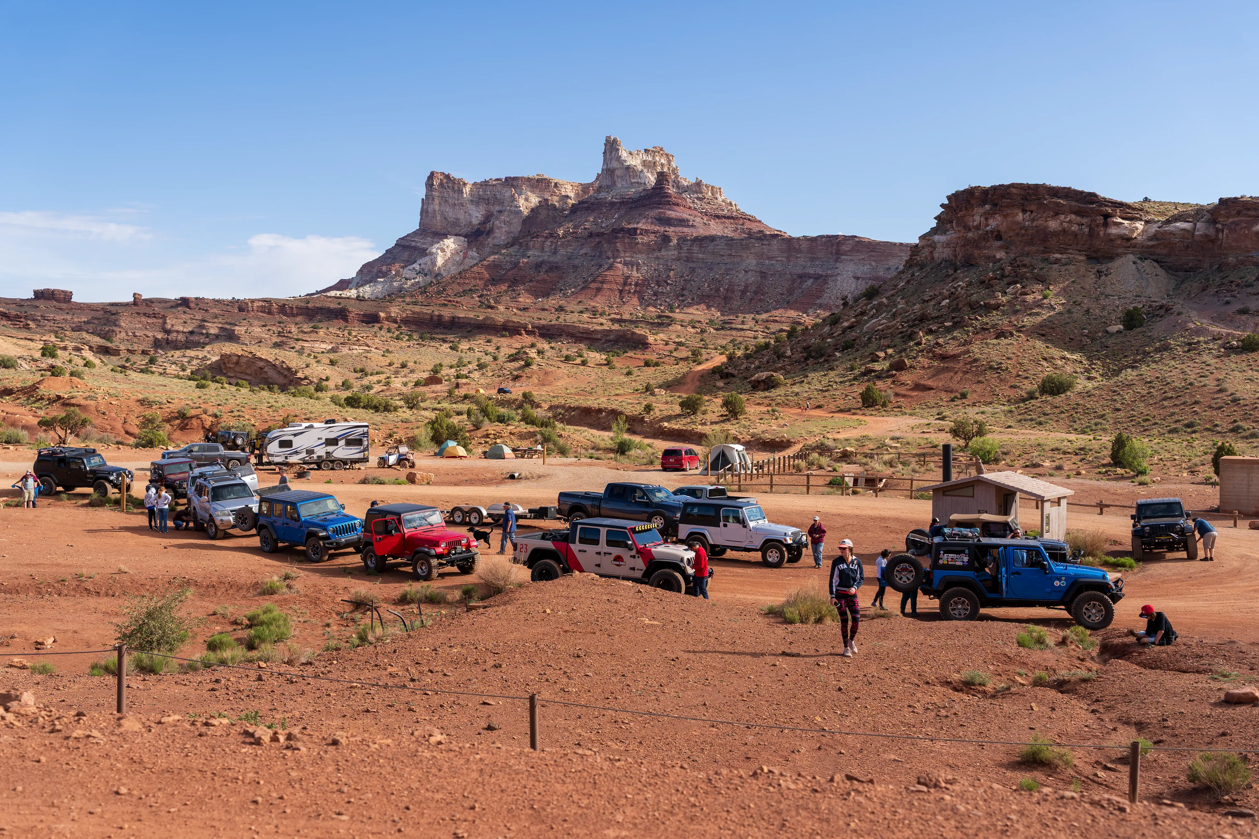 Das Gebiet rund um den Temple Mountain wird vom BLM verwaltet und bietet, entlang einer Vielzahl von Schotterstraßen, Campingmöglichkeiten. Am Eingang des Gebiets finden sich sogar einige Plumpsklos - ein netter Service. Der auffällige Temple Mountain verdankt seinen Namen der (angeblichen) Ähnlichkeit mit dem Salt Lake Temple, der Kathedrale der Mormonen in Salt Lake City. Die Geschichte des Ortes ist jedoch deutlich profaner: in der Gegend wurden bis in die 50er Jahre in großen Mengen radioaktive Elemente wie Radium und Uran abgebaut. Erze von hier wurden auch an Marie Curie nach Frankreich geliefert. Es gibt Aufzeichnungen, die belegen, dass Curie sogar selbst die Gegend besucht haben soll, um zu sehen, wo Erz solcher Güte abgebaut wird.