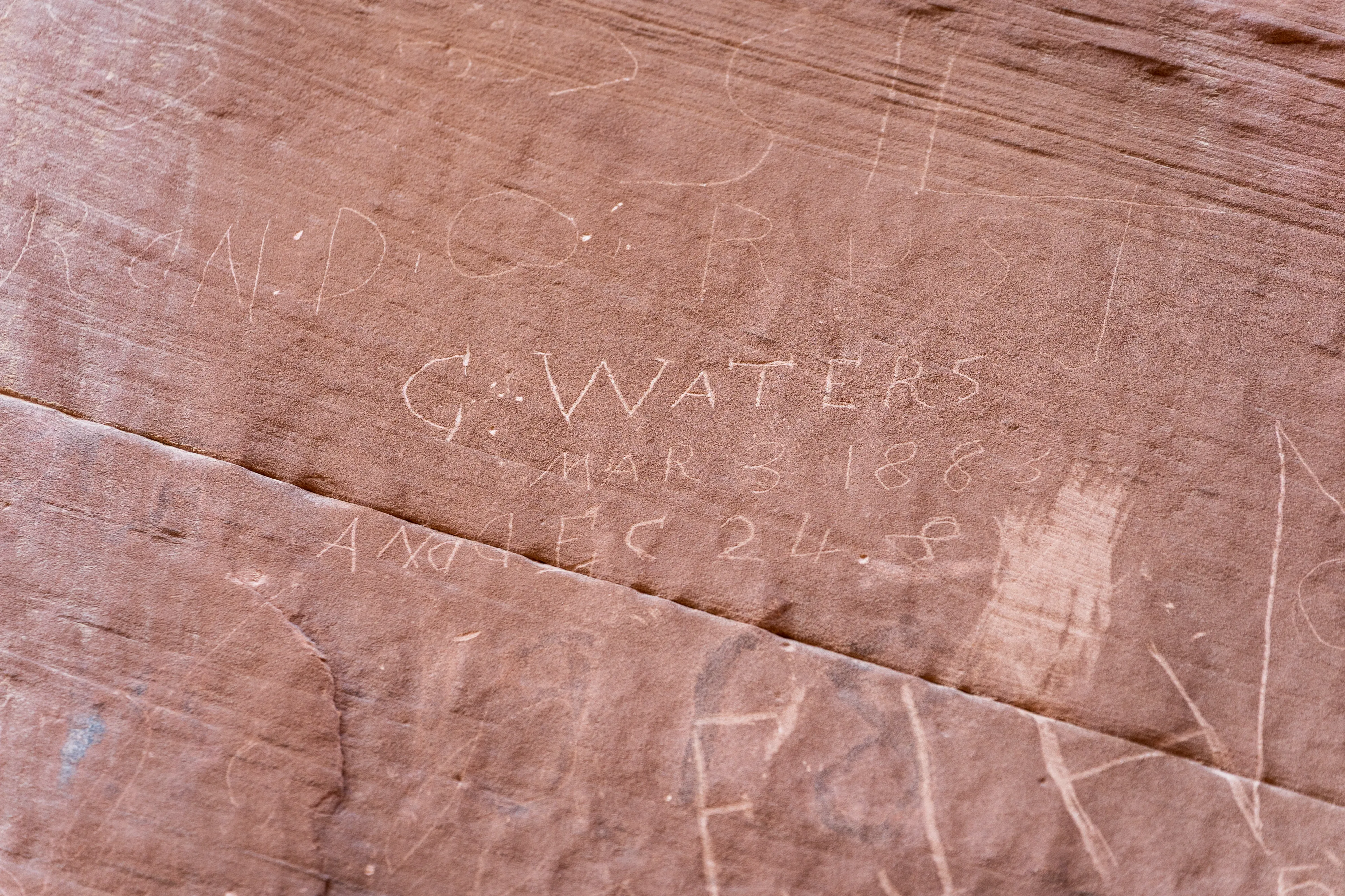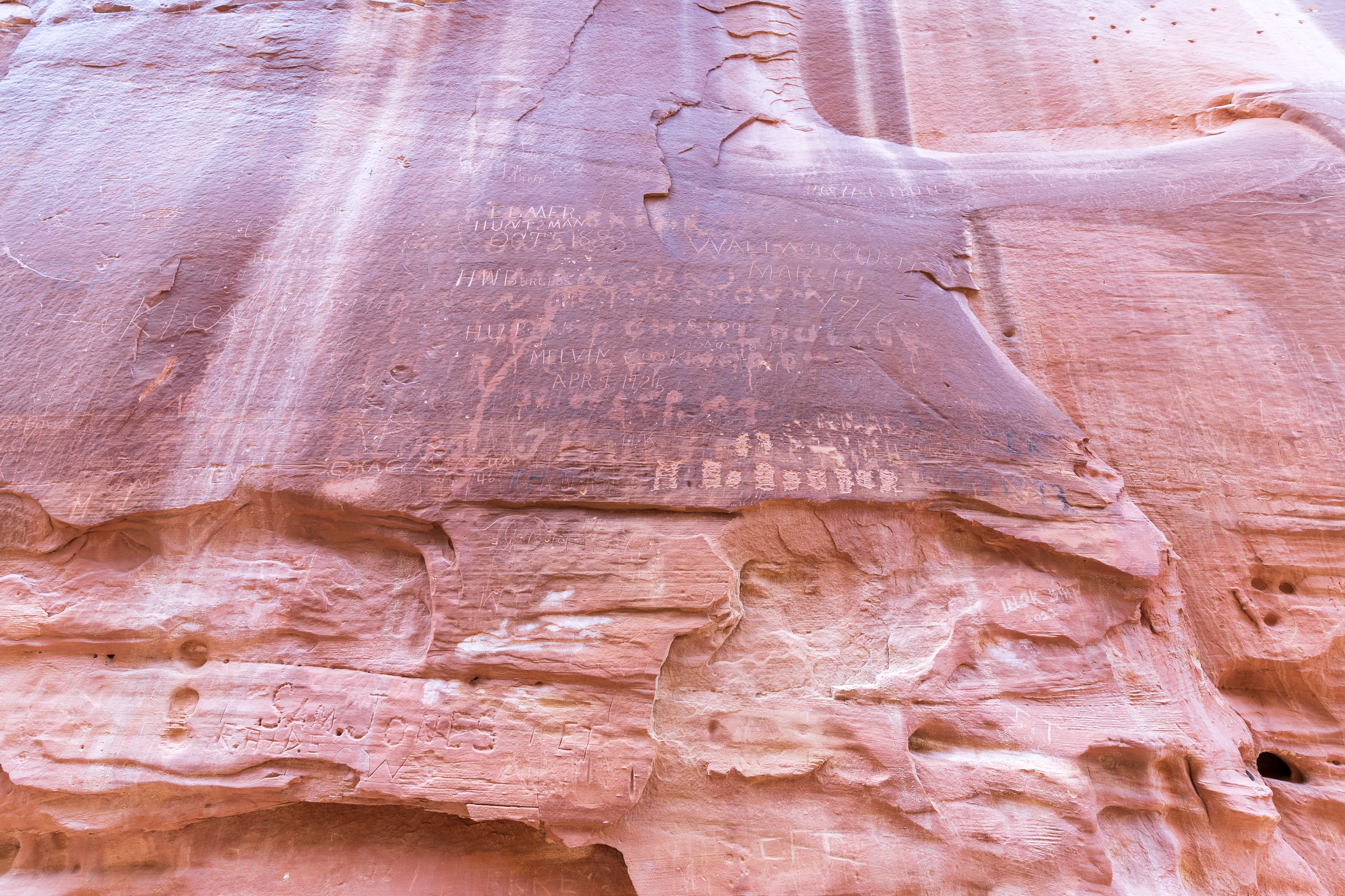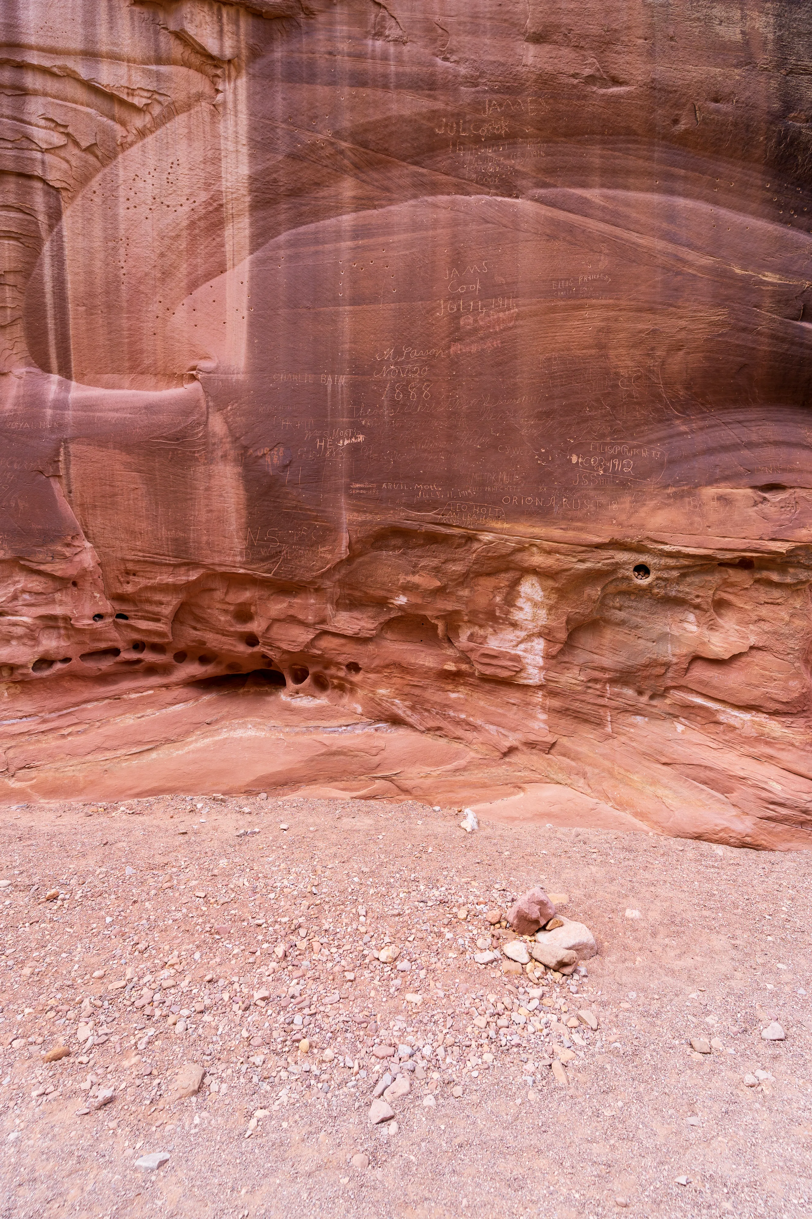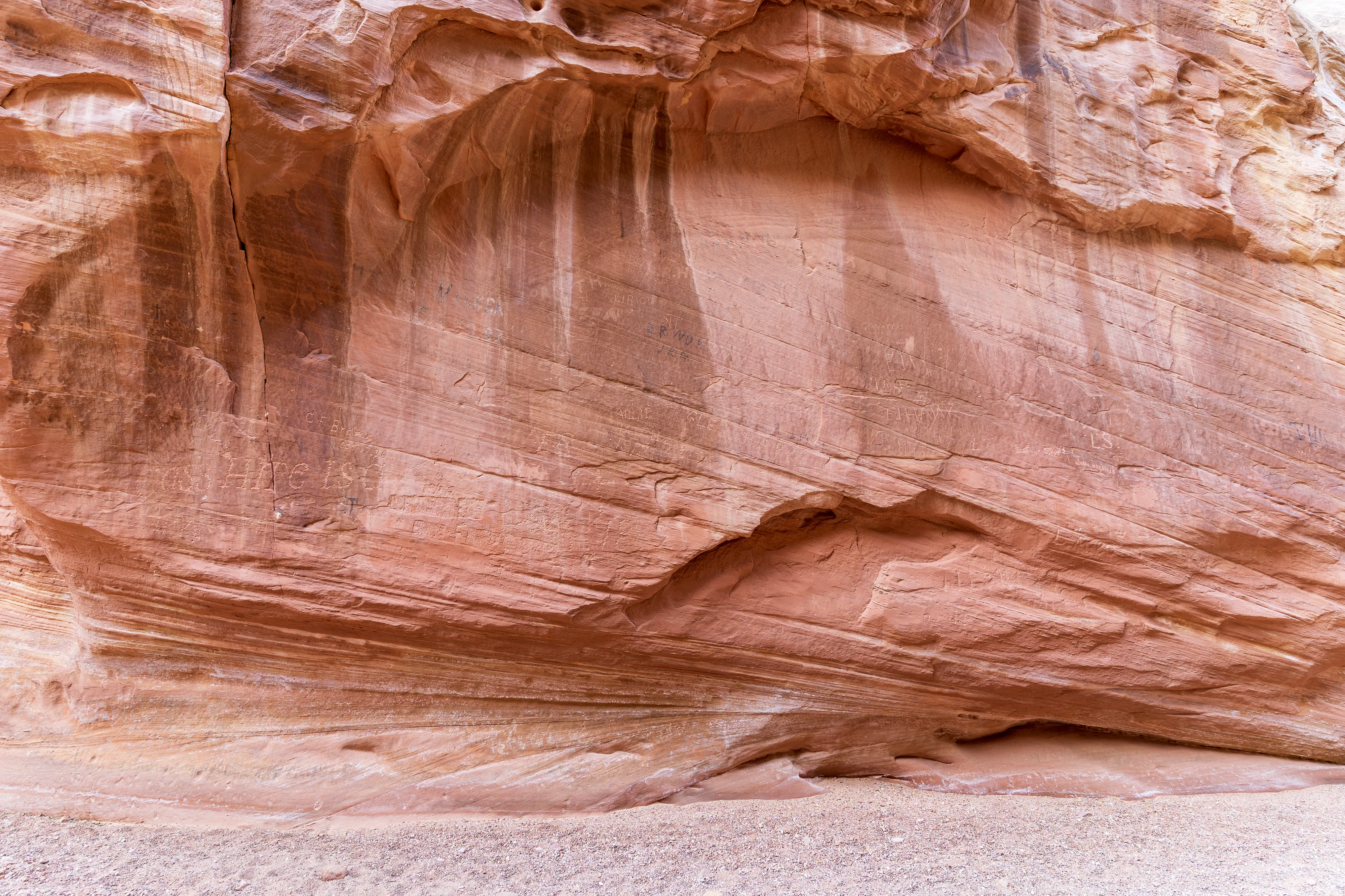 Soweit möglich fahren wir in die Capitol Gorge hinein - und gehen dann zu Fuss weiter zum Pioneer Register, einer Ansammlung von Gravuren und Inschriften von Reisenden aus dem Zeitraum 1871-1949. Dieser, von den Bewohnern Fruitas ausgebaute, Pfad war damals die einzige Verbindung gen Osten - denn die von uns befahrene Utah State Route 24 wurde erst 1962 errichtet. Alle Pioniere auf dem Weg nach Westen kamen also hier vorbei und viele hinterließen ihre Namen, das Datum und Anmerkungen im Fels.