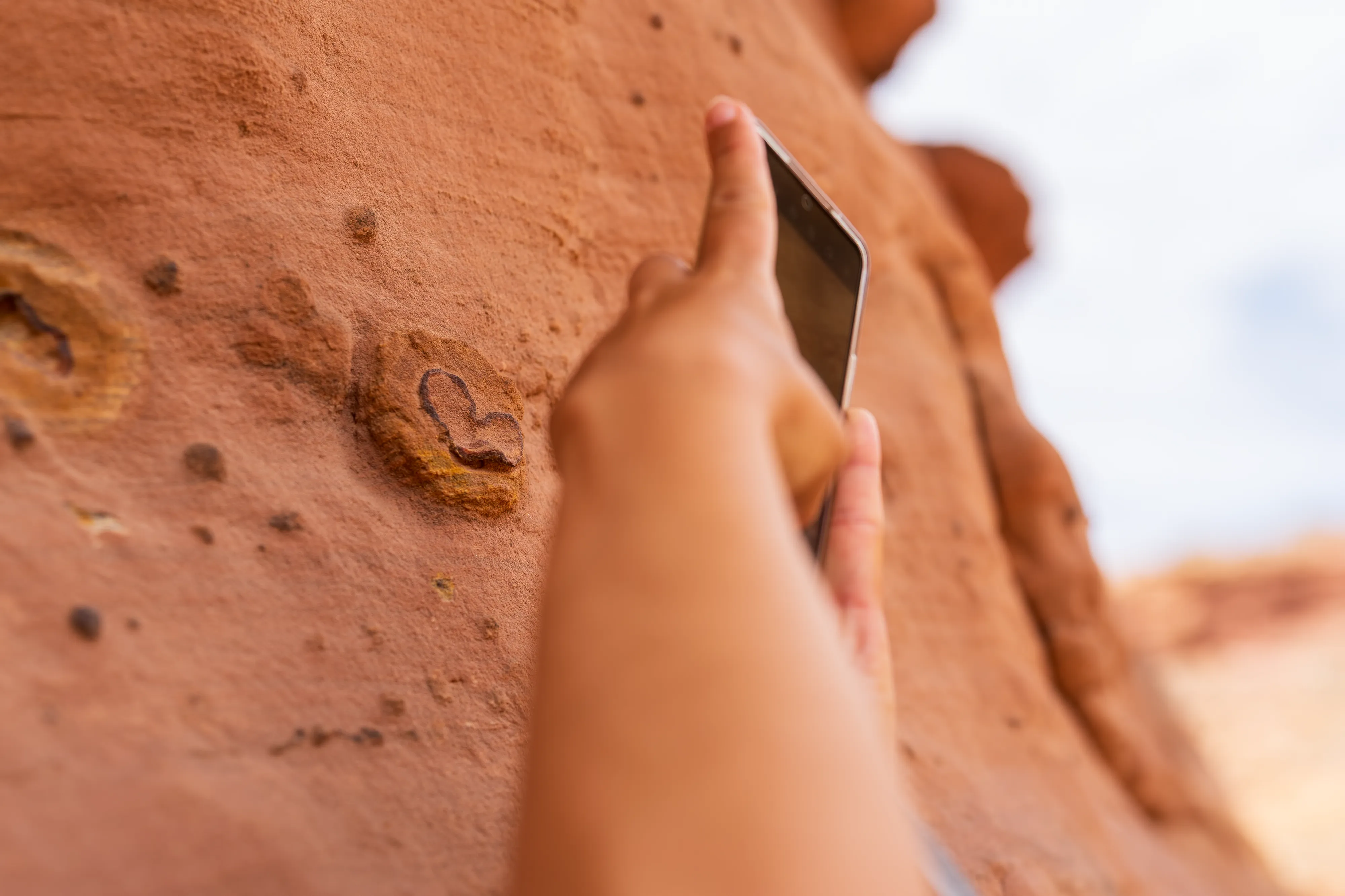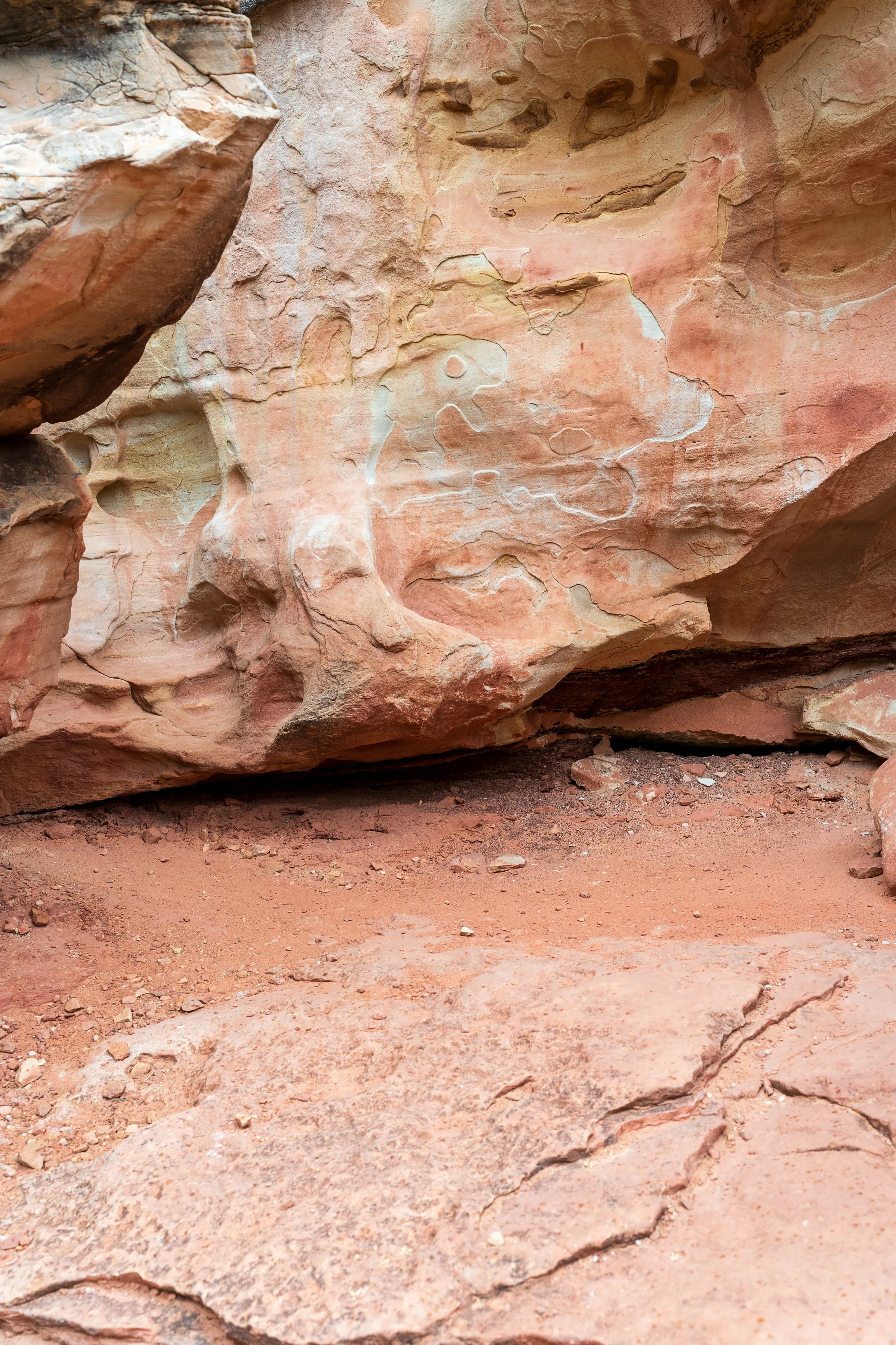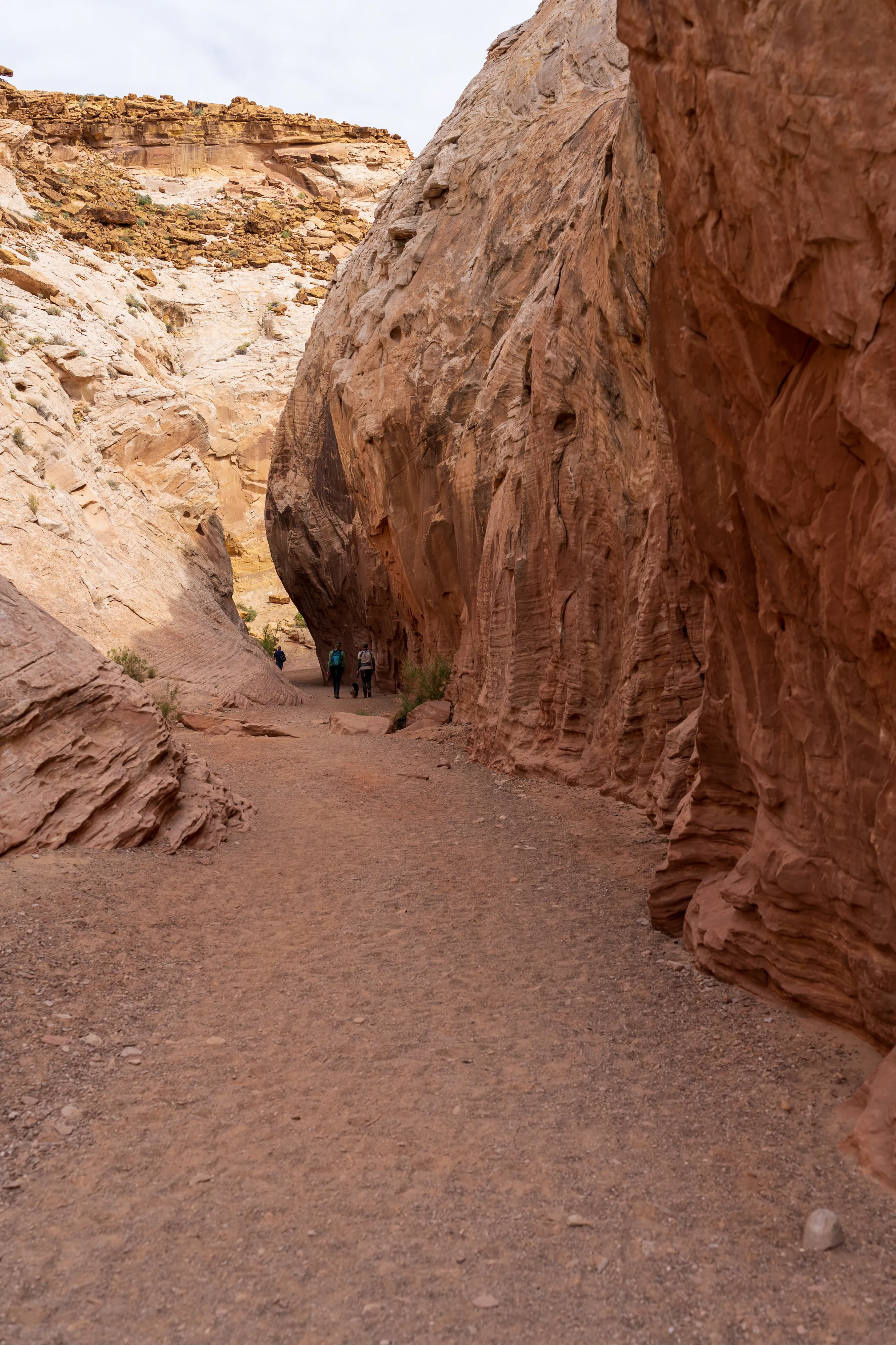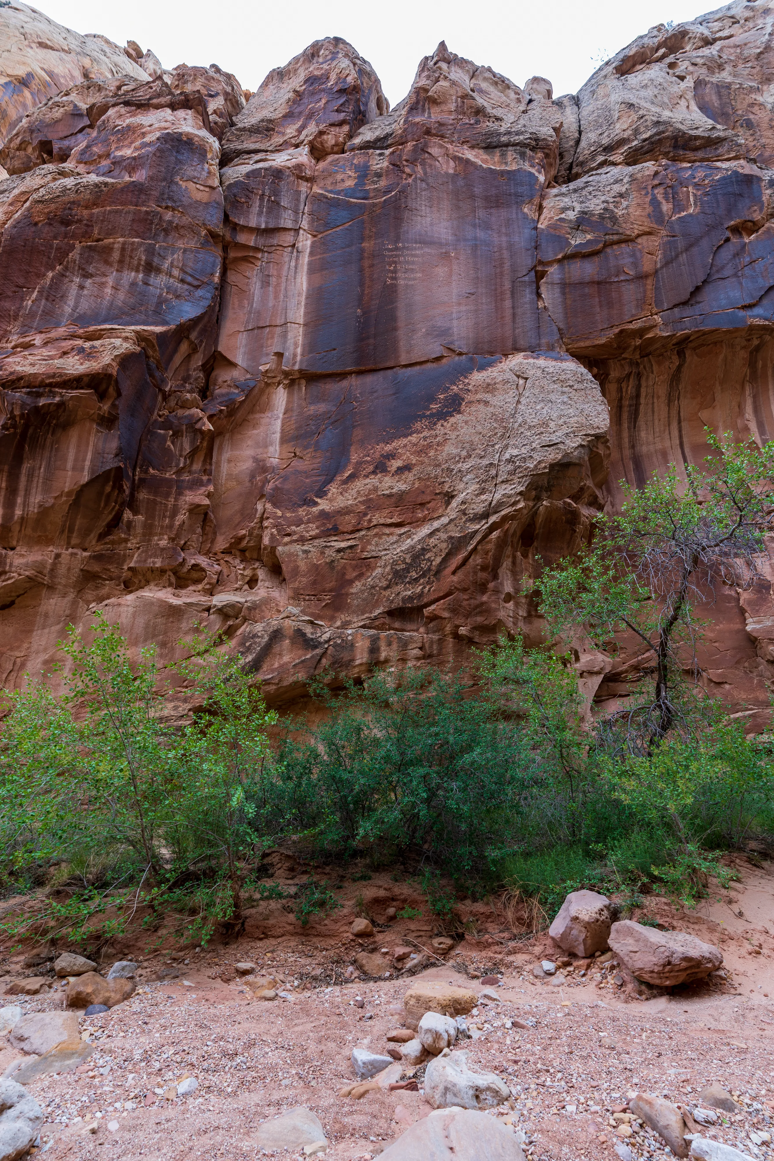Soweit möglich fahren wir in die Capitol Gorge hinein - und gehen dann zu Fuss weiter zum Pioneer Register, einer Ansammlung von Gravuren und Inschriften von Reisenden aus dem Zeitraum 1871-1949. Dieser, von den Bewohnern Fruitas ausgebaute, Pfad war damals die einzige Verbindung gen Osten - denn die von uns befahrene Utah State Route 24 wurde erst 1962 errichtet. Alle Pioniere auf dem Weg nach Westen kamen also hier vorbei und viele hinterließen ihre Namen, das Datum und Anmerkungen im Fels.