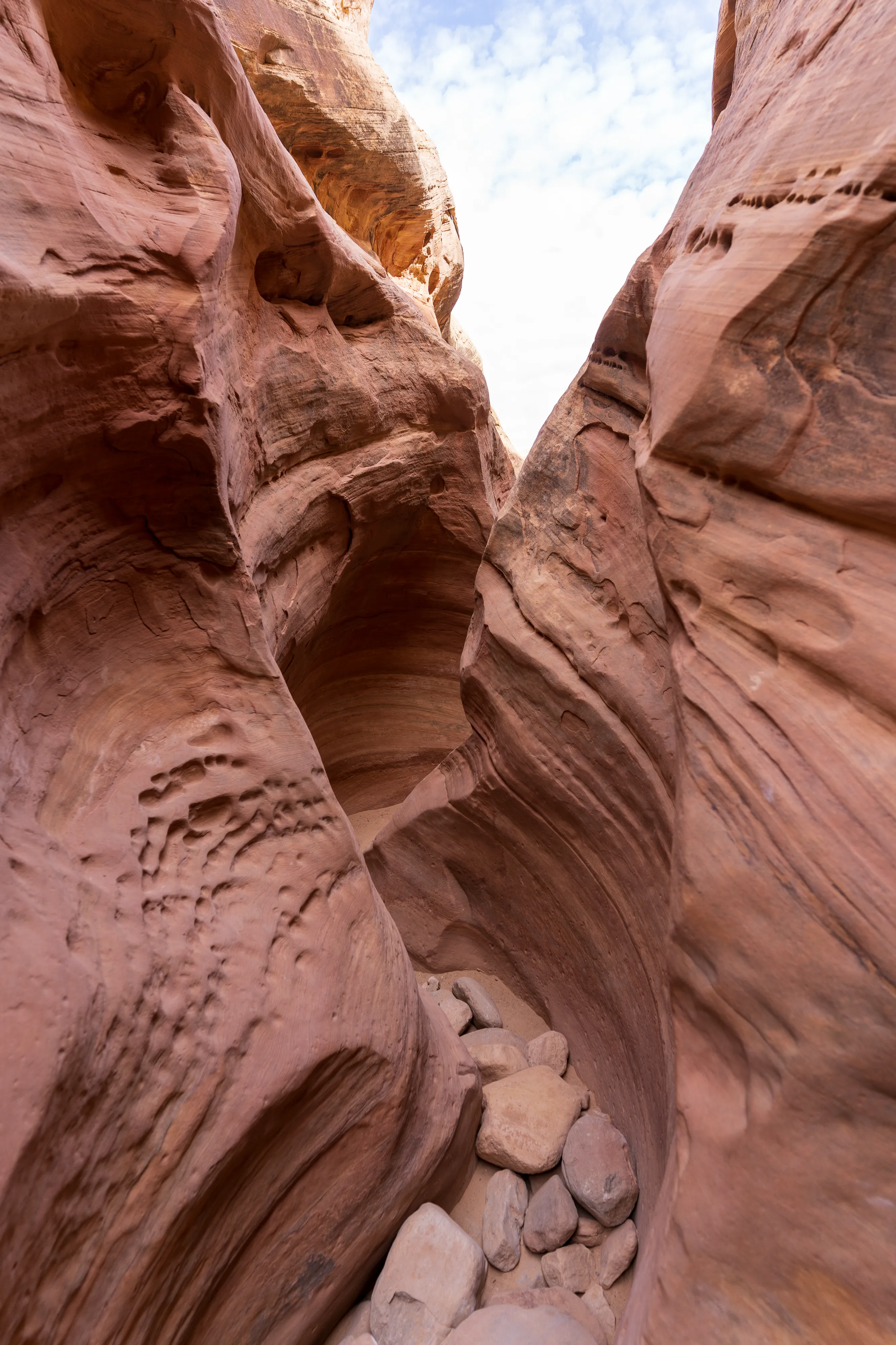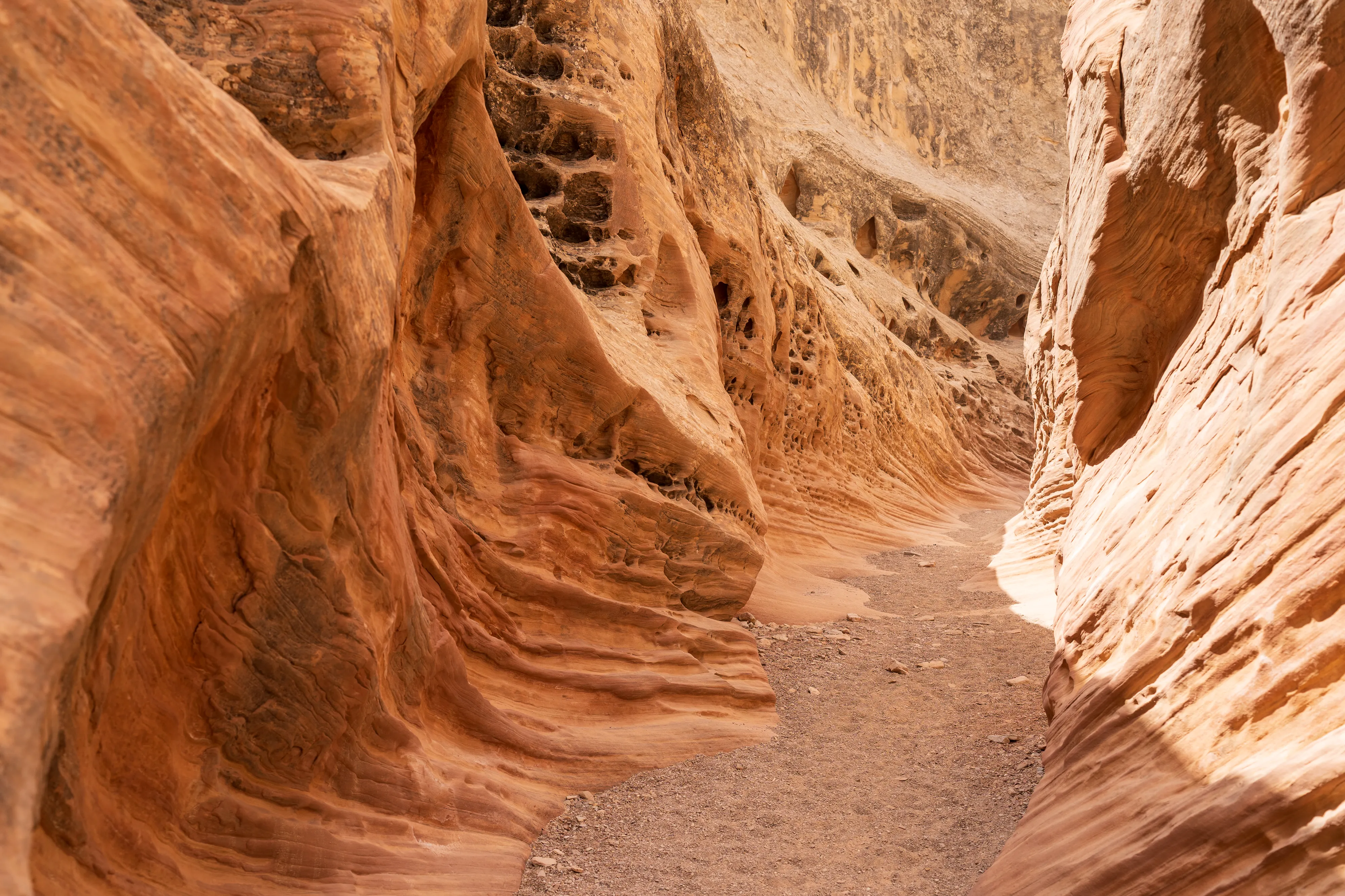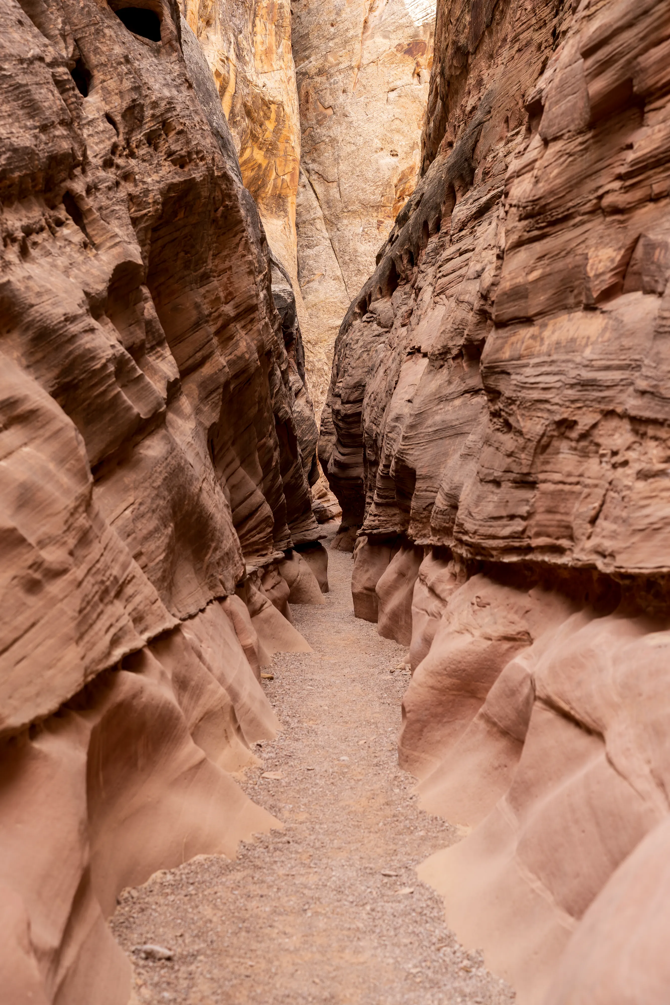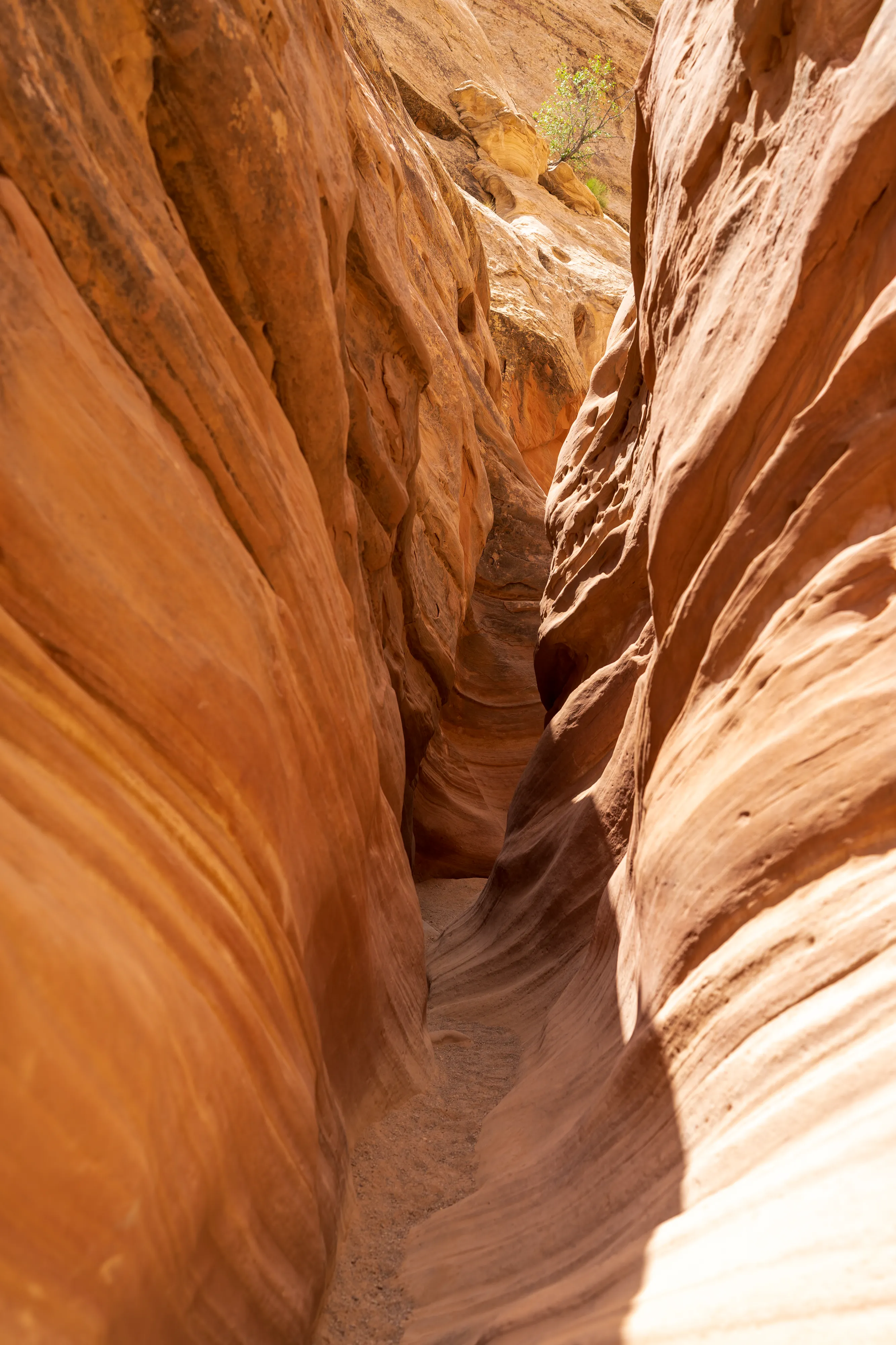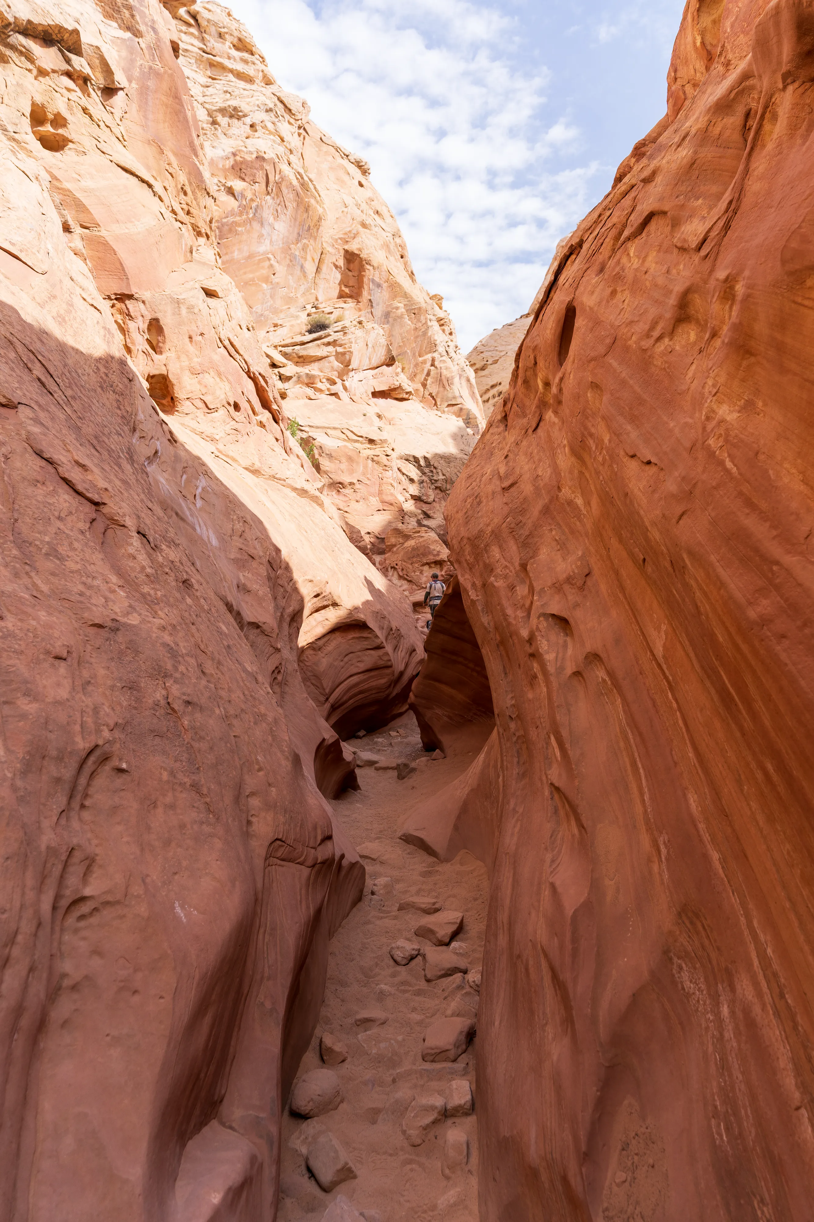 Dieser Canyon befindet sich, wie der Goblin Valley State Park, in welchem wir gestern waren, ebenfalls in direkter Nähe zum Gebiet um den Temple Mountain. Das Besondere an ihm ist, dass es sich um einen sogenannten “Slot-Canyon” handelt: Dies sind besonders enge, vom Wasser geschaffene Canyons. Sie sind typisch für das Colorado-Plateau. Der vermutlich berühmteste Slot-Canyon ist der Antelope Canyon bei Paige (den wir mangels Zeit, übermäßigem Touristenandrang und lachhaften Ticketpreisen ausgelassen haben). Es gibt sowohl trockene als auch mit Wasser gefüllte Slot-Canyons. Der Little Wild Horse Canyon gehört zu ersteren - zumindest heute. Selbst bei mäßigen Regenfällen kommt es aber schnell zu Springfluten - die diese Canyons dann zu sehr gefährlichen Fallen werden lassen, da dass Wasser aufgrund der Enge eine enorme Kraft entfaltet. Heute scheint jedoch die Sonne, keine Wolke ist in Sicht - alles gut also.