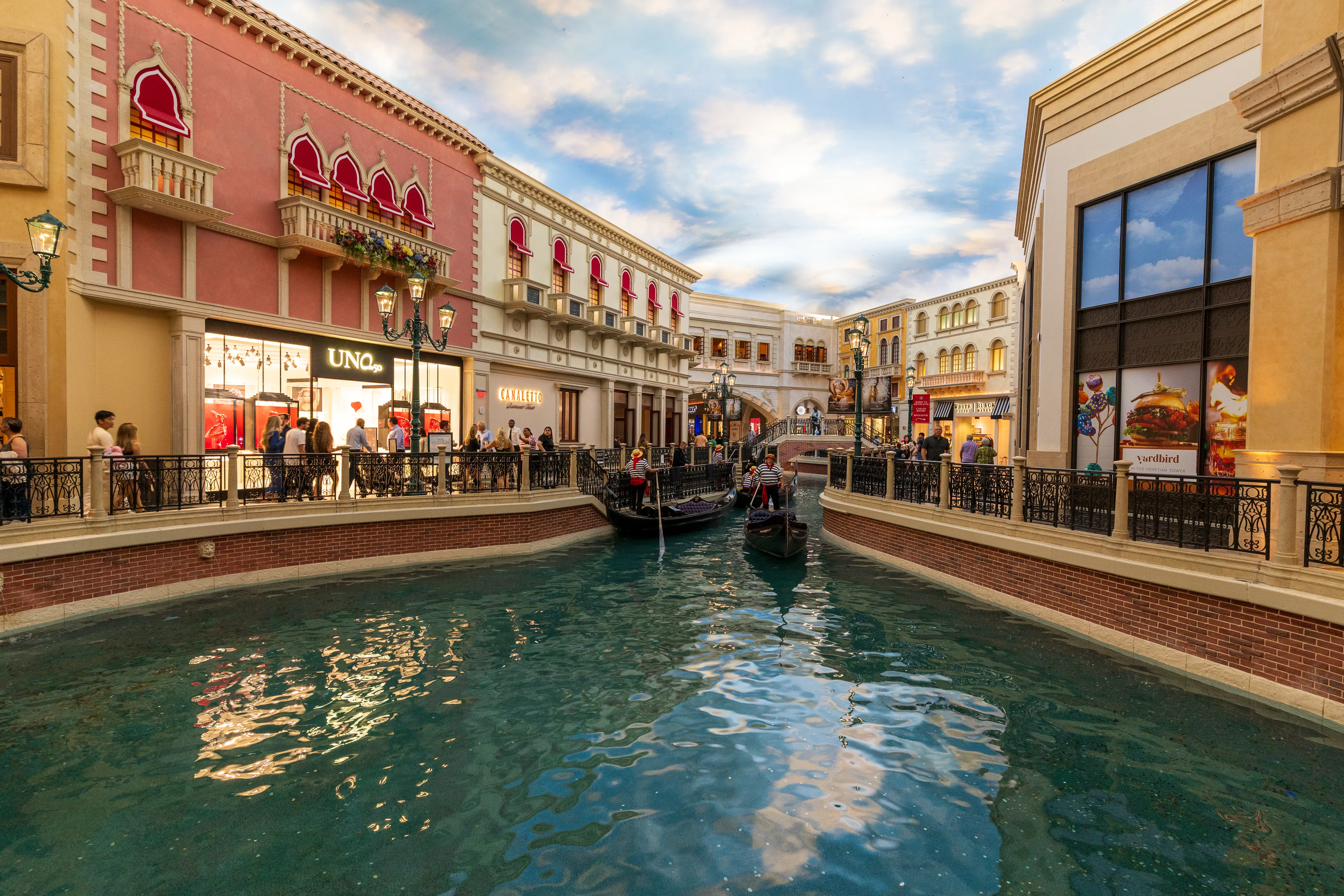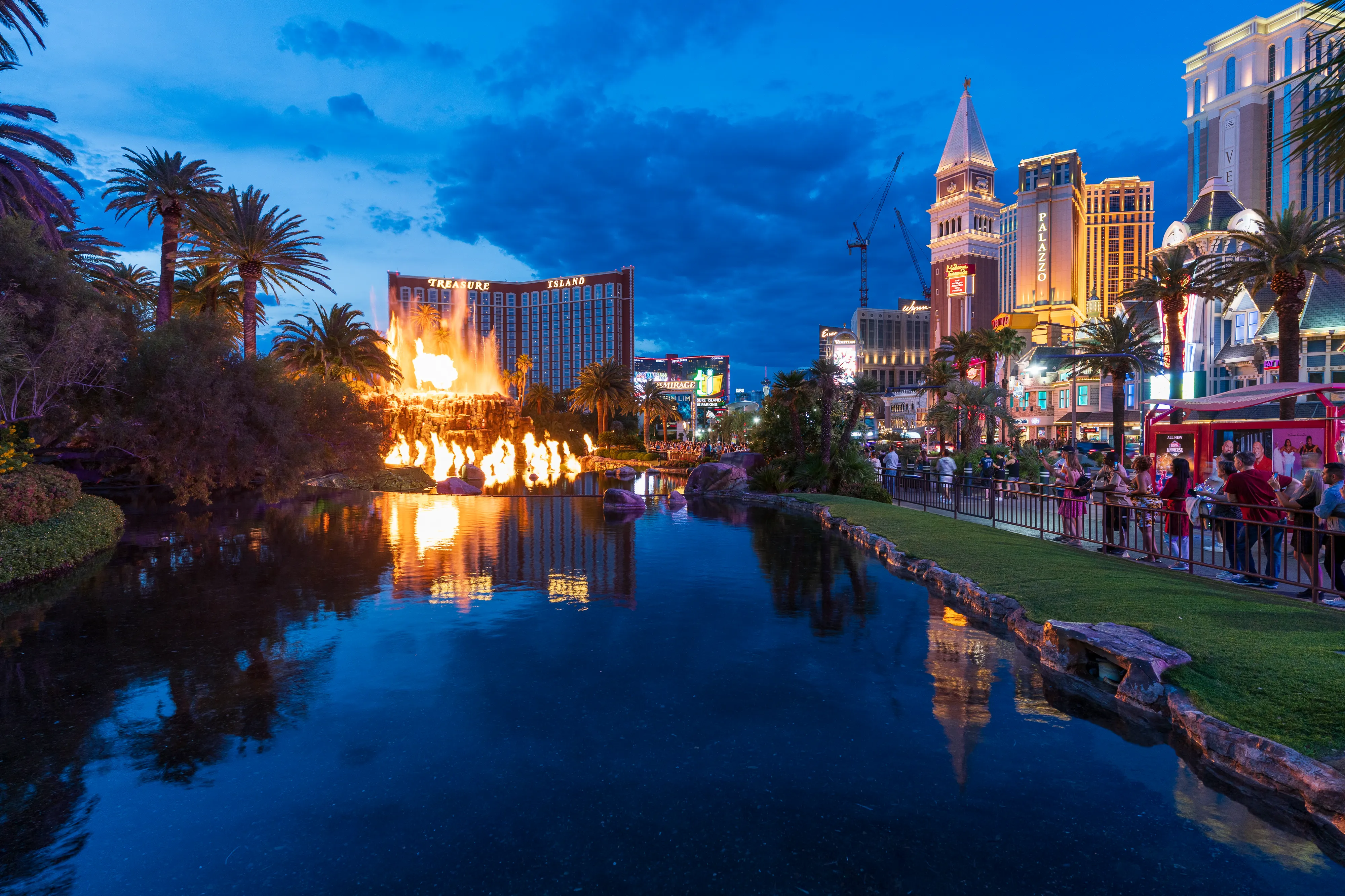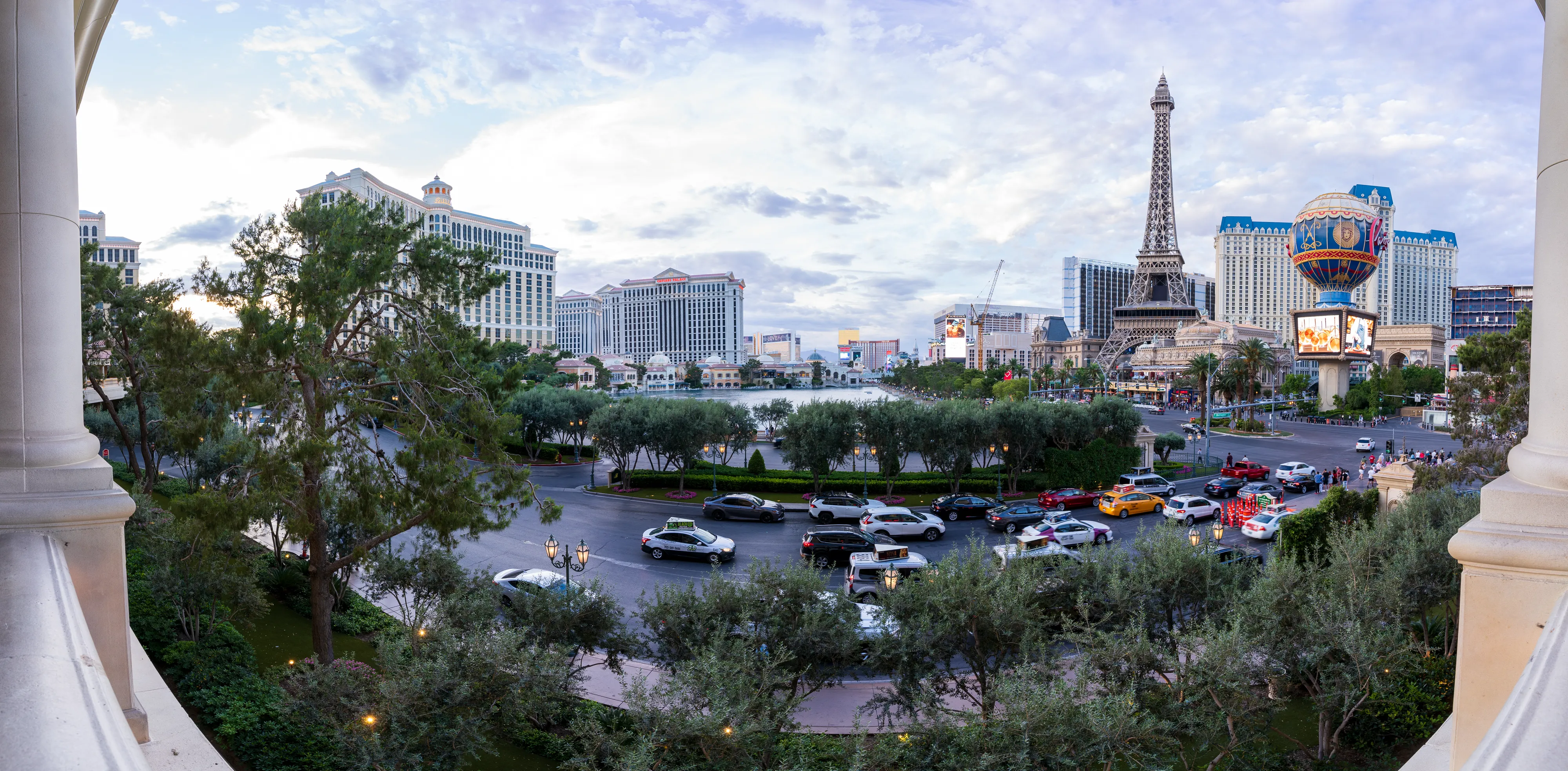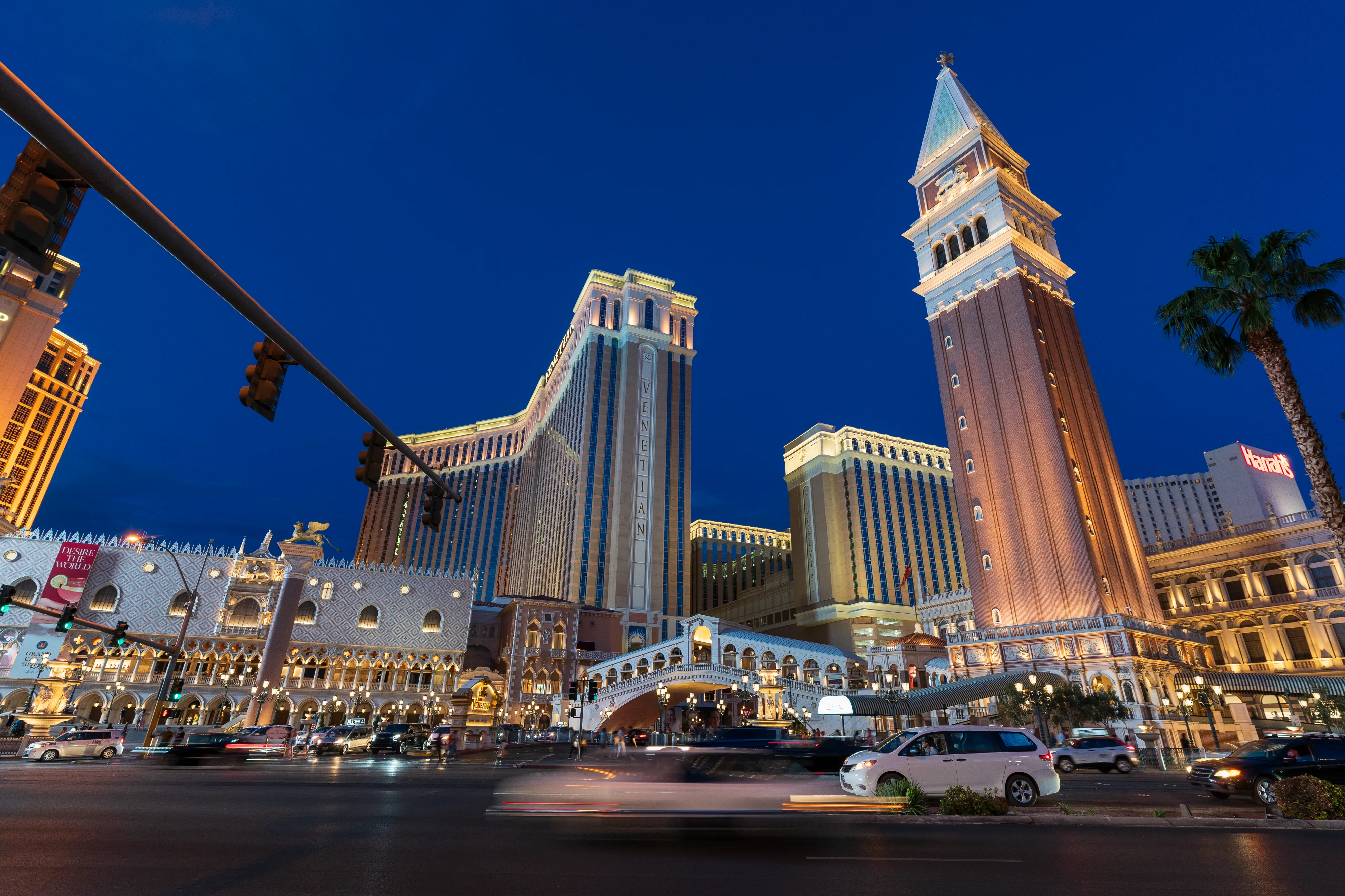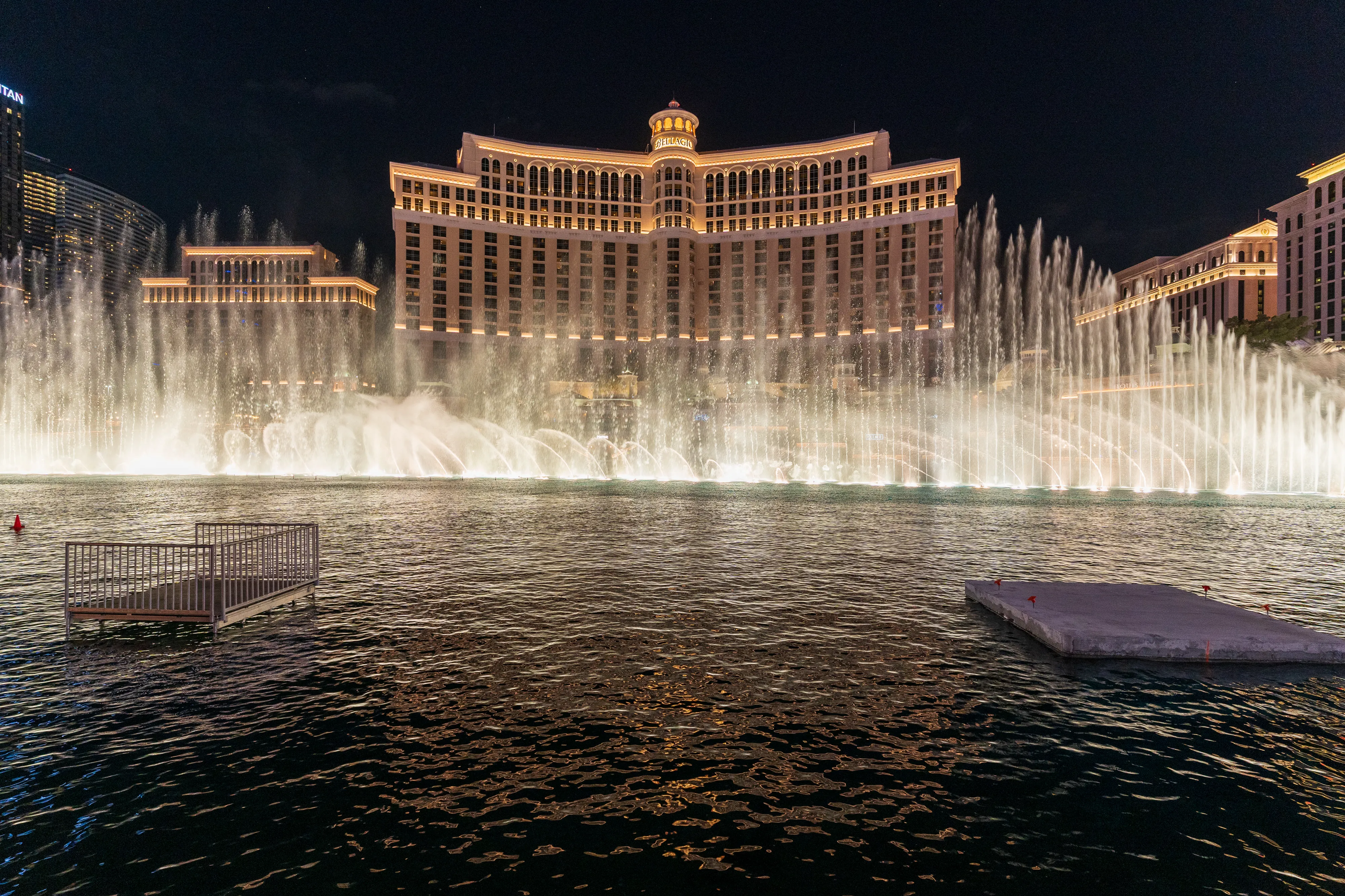 Auf dem Rückweg legen wir noch einen Stopp bei einem großen Outdoorgeschäft ein, um ein wenig Ausrüstung zu shoppen. Nachmittags sind wir dann zurück am Hotel und machen uns bei warmen 30 Grad auf den Weg zum Strip. Wir schauen uns die großen Kasinos wie z.B. das Excalibur, das Bellagio und das The Venetian von innen an, spielen ein paar Runde Roulette (und hören mit einem kleinen aber sehr befriedigenden Gewinn auf) und bestaunen die nachgebauten Städte und Sehenswürdigkeiten: Venedig, New York, Paris. Besonders das The Venetian beeindruckt mit einem nachgebauten Kanal im Gebäudeinnern: inklusive pseudo-italienischer Gondolieri, Rialtobrücke und Markusturm – alles unter einem dauerblauen Himmel. Auch die turmreiche Burg des Excalibur, die Wasserspiele und der weltgrößte Schokoladenbrunnen beim Bellagio sowie die Feuershow beim The Mirage zeigen den exzentrischen Charakter dieser Stadt.