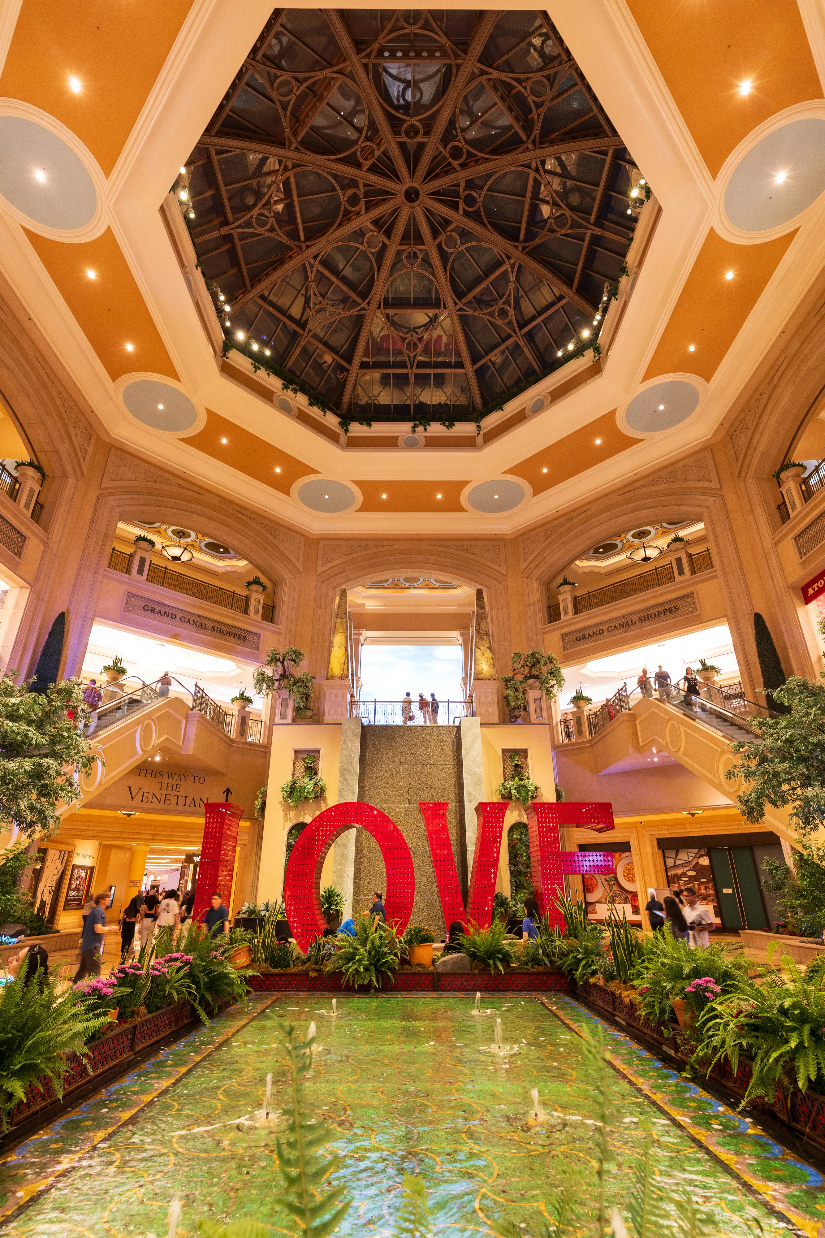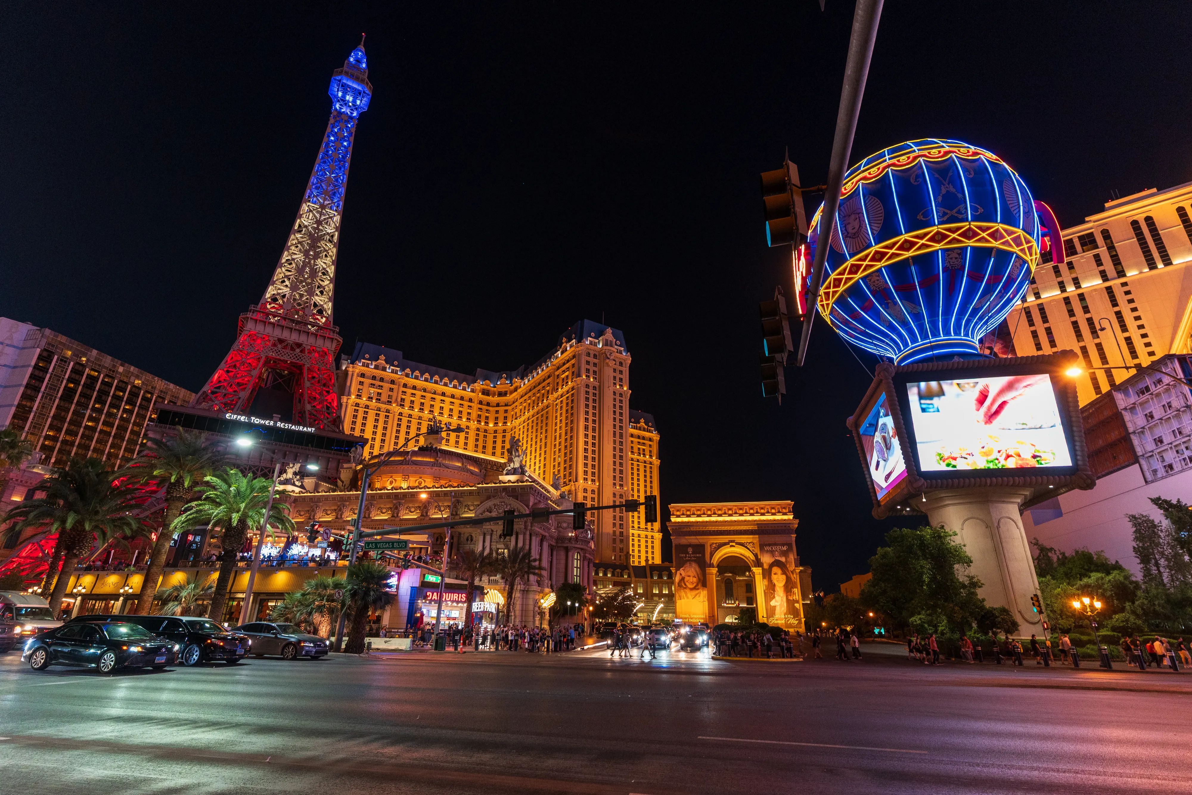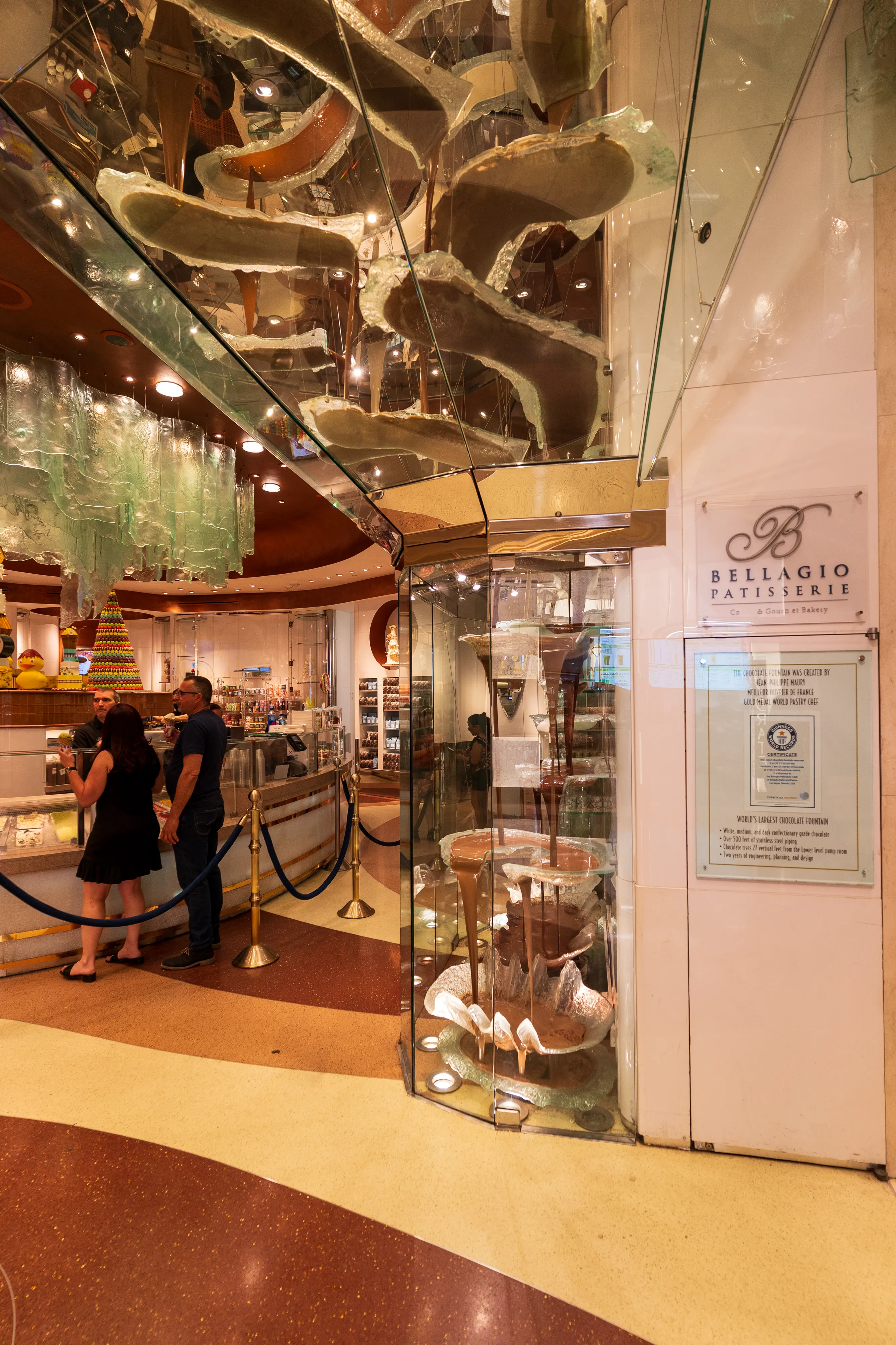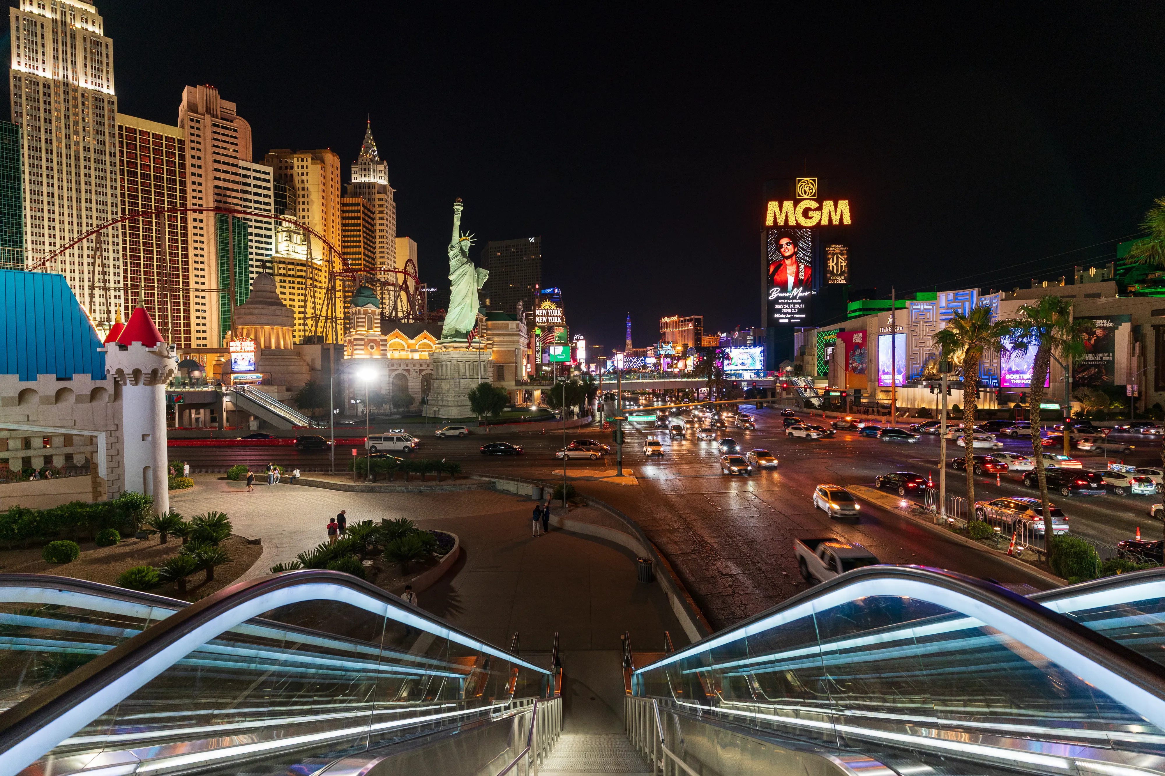 Auf dem Rückweg legen wir noch einen Stopp bei einem großen Outdoorgeschäft ein, um ein wenig Ausrüstung zu shoppen. Nachmittags sind wir dann zurück am Hotel und machen uns bei warmen 30 Grad auf den Weg zum Strip. Wir schauen uns die großen Kasinos wie z.B. das Excalibur, das Bellagio und das The Venetian von innen an, spielen ein paar Runde Roulette (und hören mit einem kleinen aber sehr befriedigenden Gewinn auf) und bestaunen die nachgebauten Städte und Sehenswürdigkeiten: Venedig, New York, Paris. Besonders das The Venetian beeindruckt mit einem nachgebauten Kanal im Gebäudeinnern: inklusive pseudo-italienischer Gondolieri, Rialtobrücke und Markusturm – alles unter einem dauerblauen Himmel. Auch die turmreiche Burg des Excalibur, die Wasserspiele und der weltgrößte Schokoladenbrunnen beim Bellagio sowie die Feuershow beim The Mirage zeigen den exzentrischen Charakter dieser Stadt.