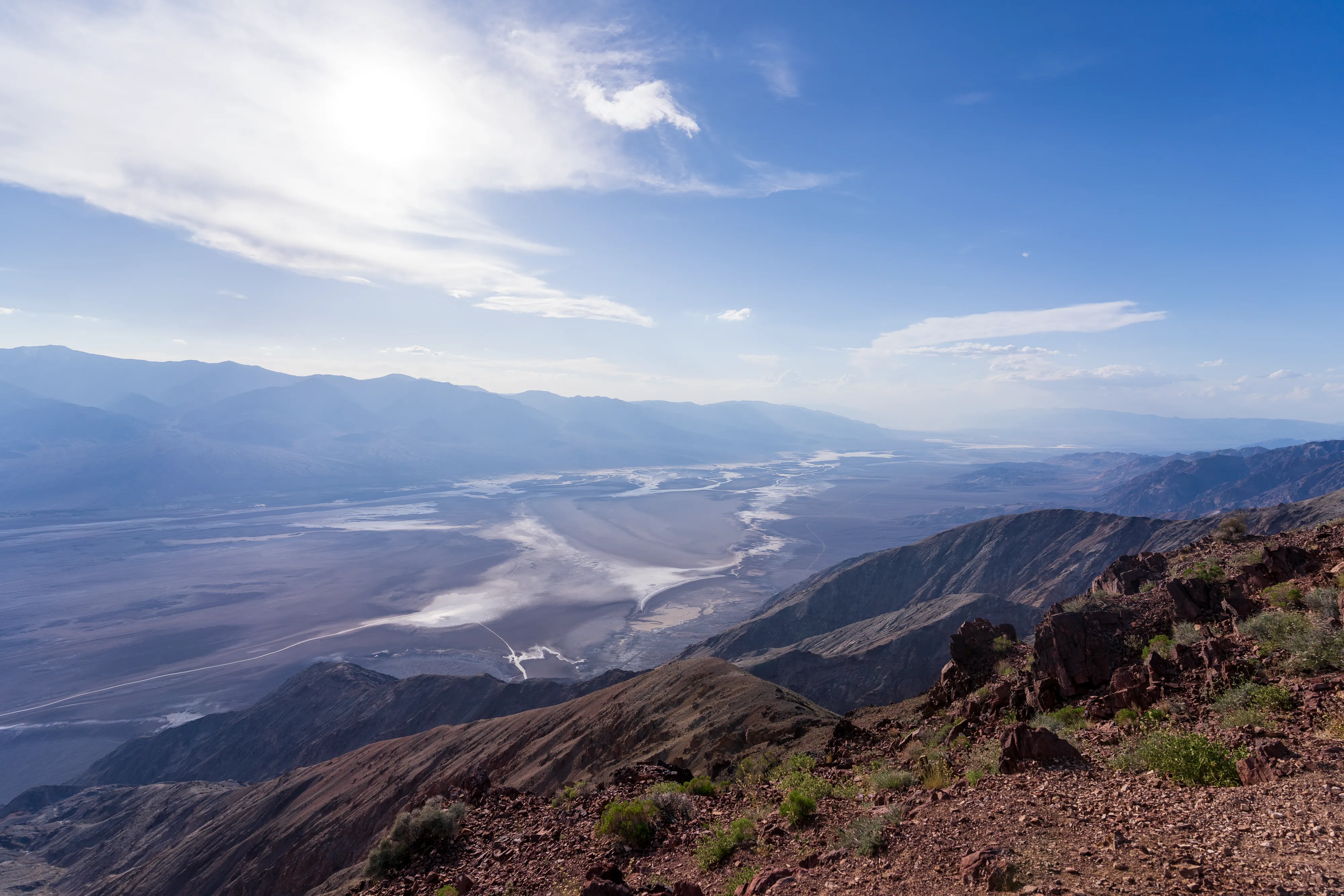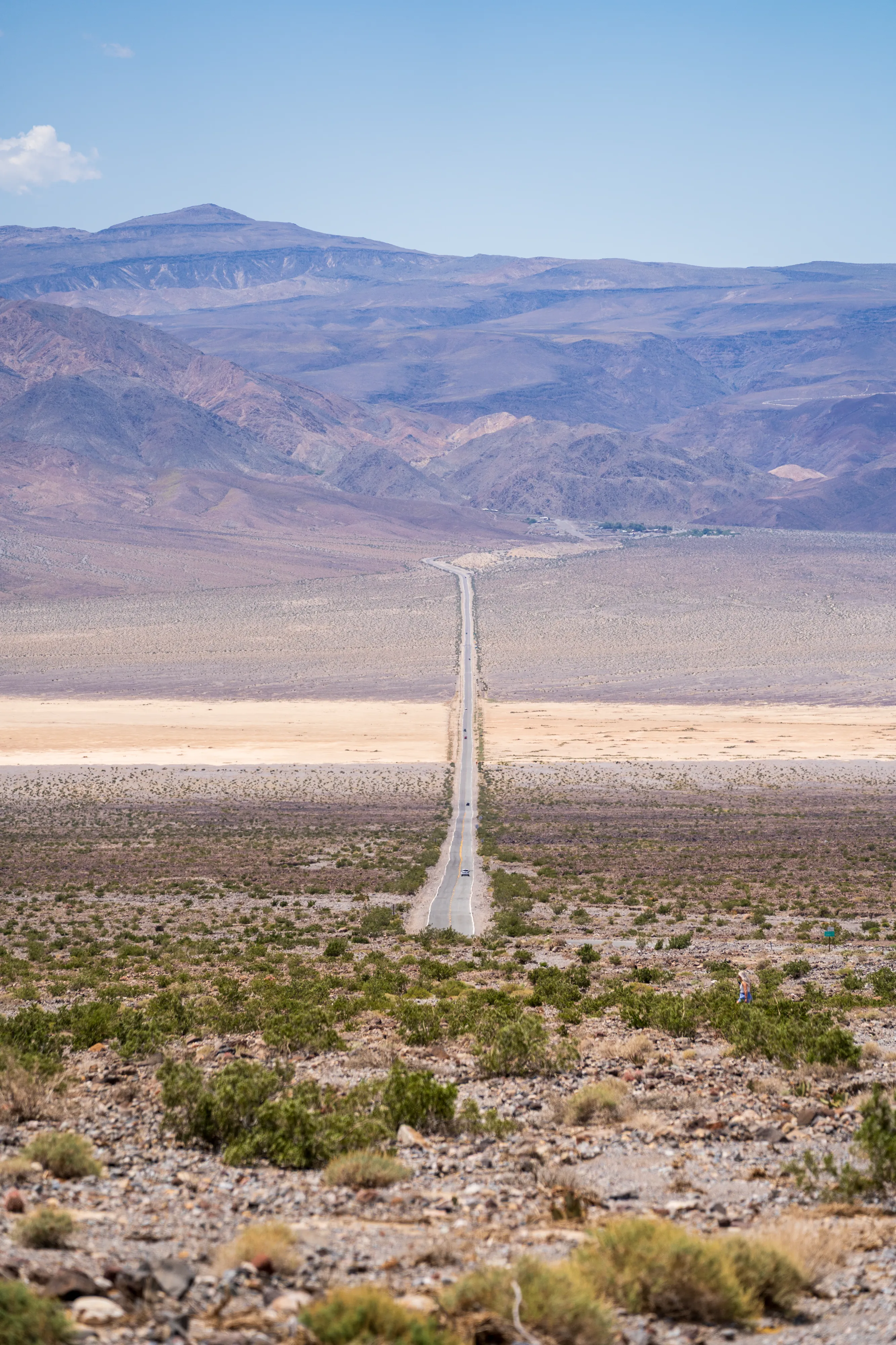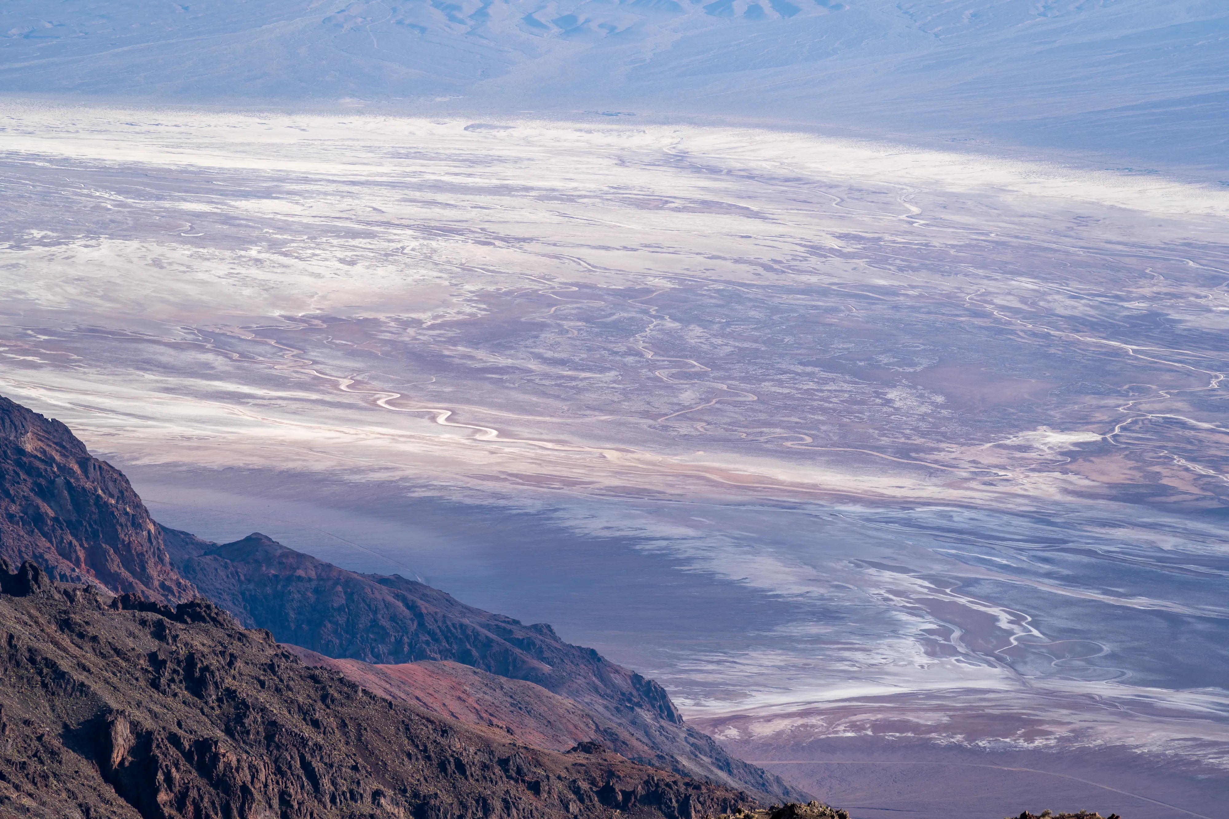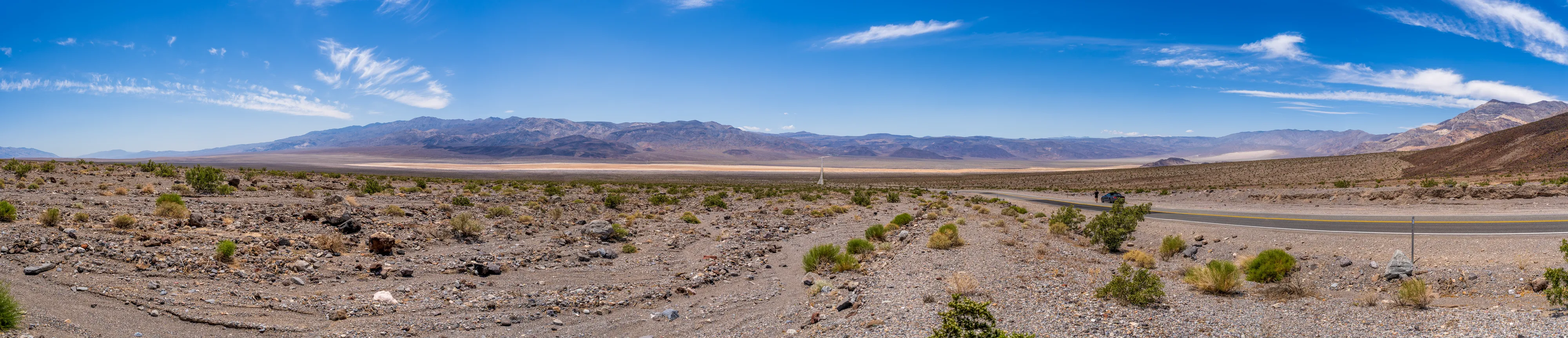 Aber eben dieses Klima macht den Death Valley Nationalpark auch so besonders: hier finden sich sowohl Fels-, Sand- und Salzwüste sowie einige andere Überraschungen der Natur. Unsere Route führt uns von Süden in den NP und wir fahren als Erstes zum, auf circa 1650 m gelegenen, Dante’s View, von wo aus man einen guten Ausblick über Badwater Basin hat.
