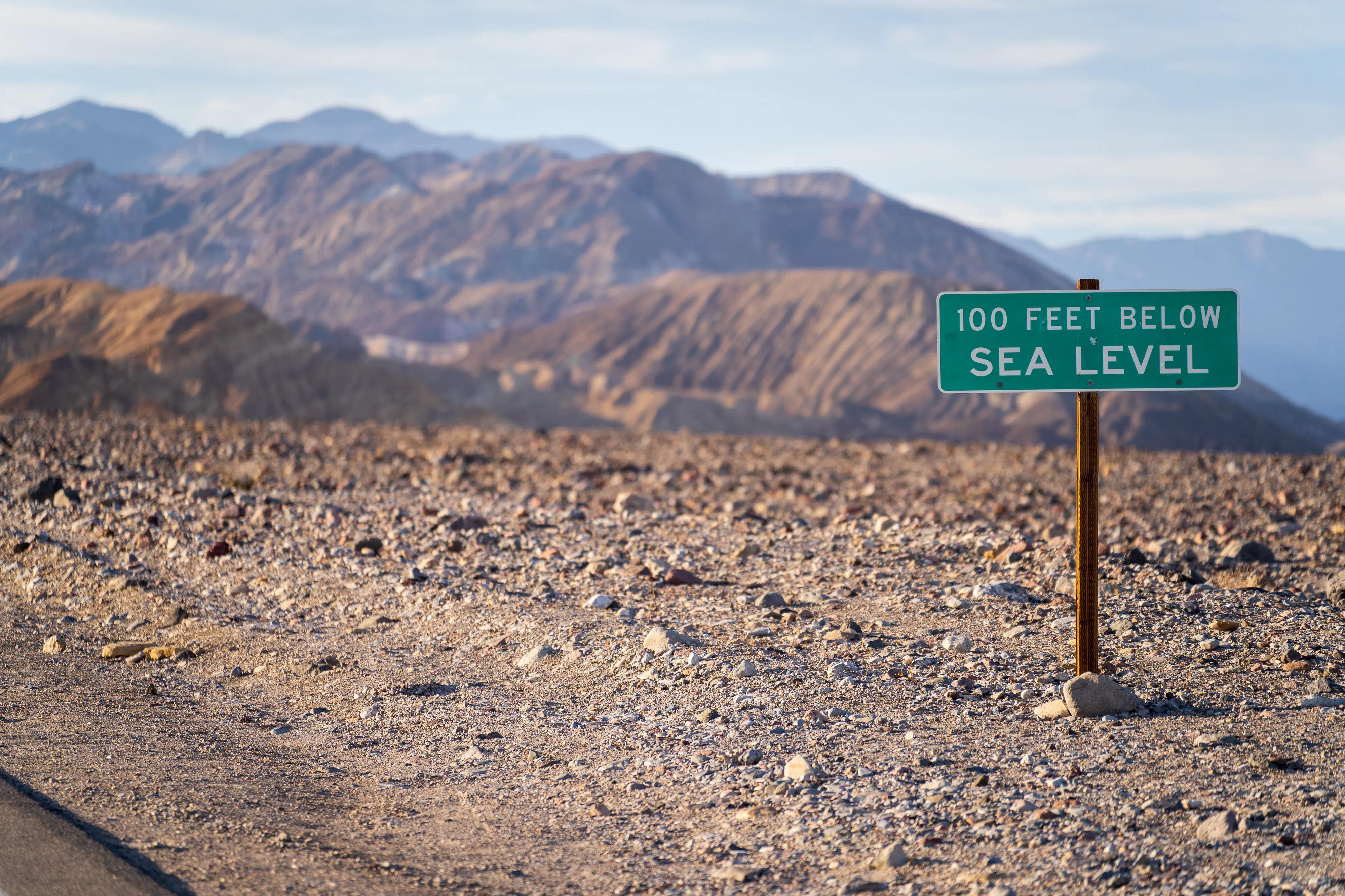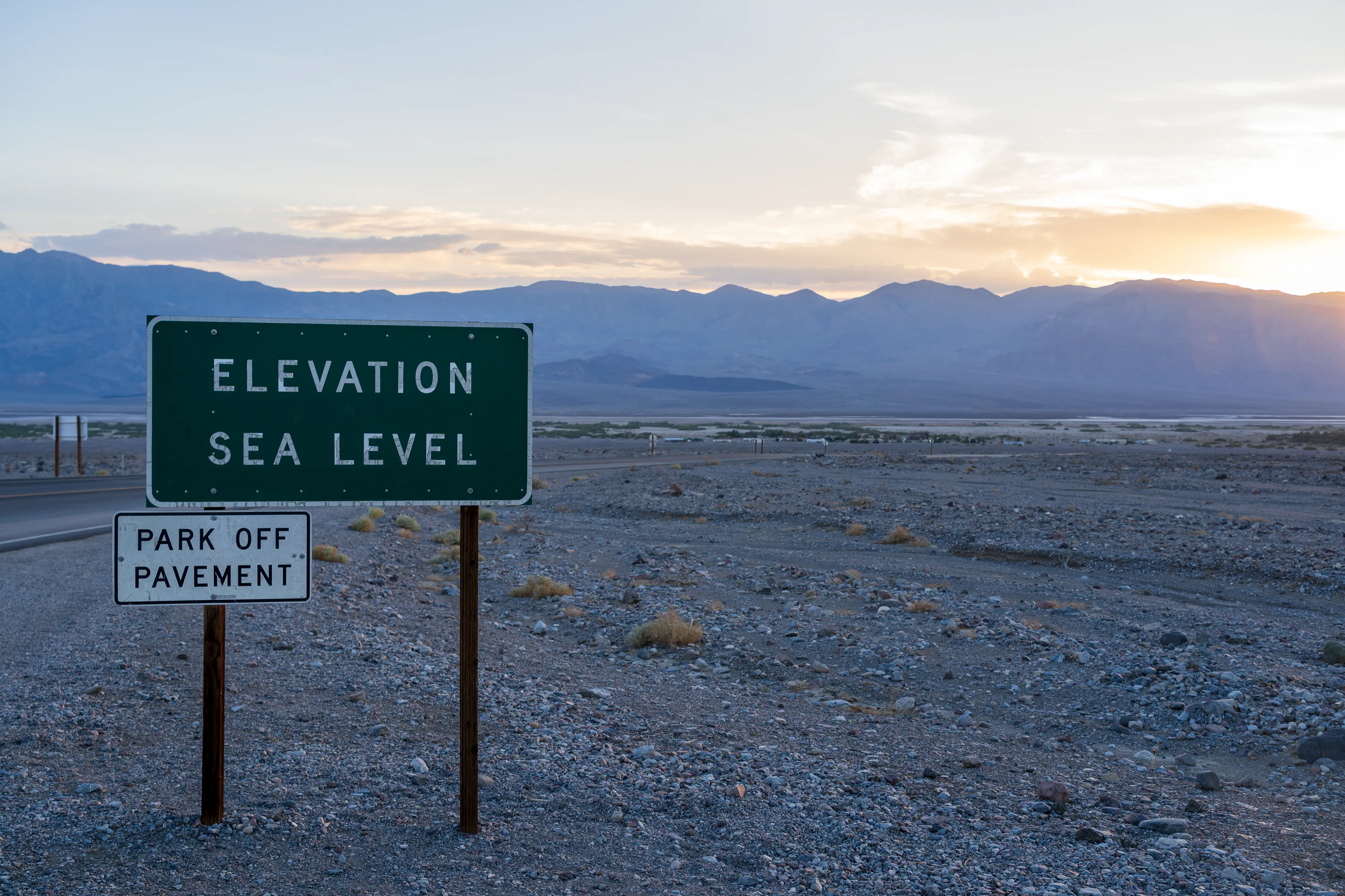 Anschließend fahren wir weiter hinab ins Tal bis auf Höhe des Meeresspiegels (der tiefste Punkt des Tales ist mit fast 86 m unterhalb des Meeresspiegels zugleich die tiefste begehbare Stelle Nordamerikas), machen ein Bild des Schilds und nehmen die letzten Meter nach Furnace Creek in Angriff.