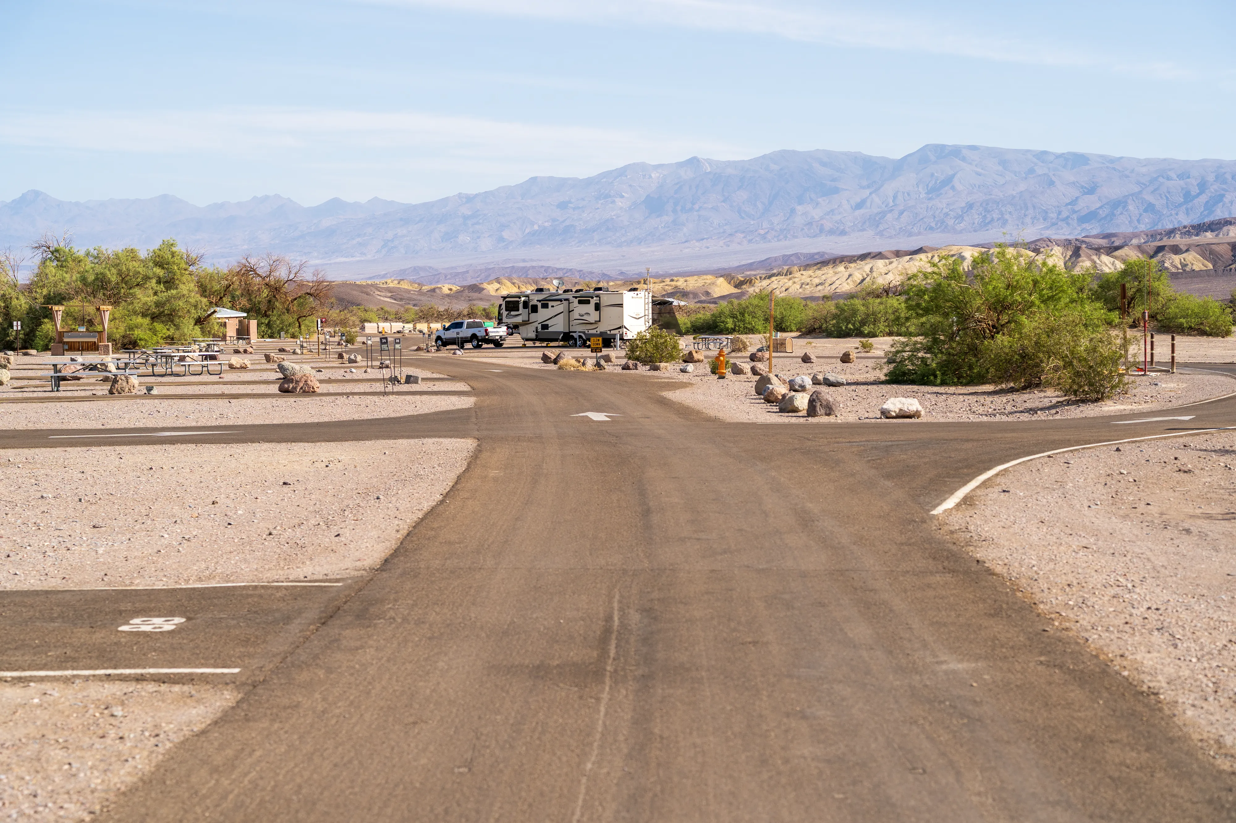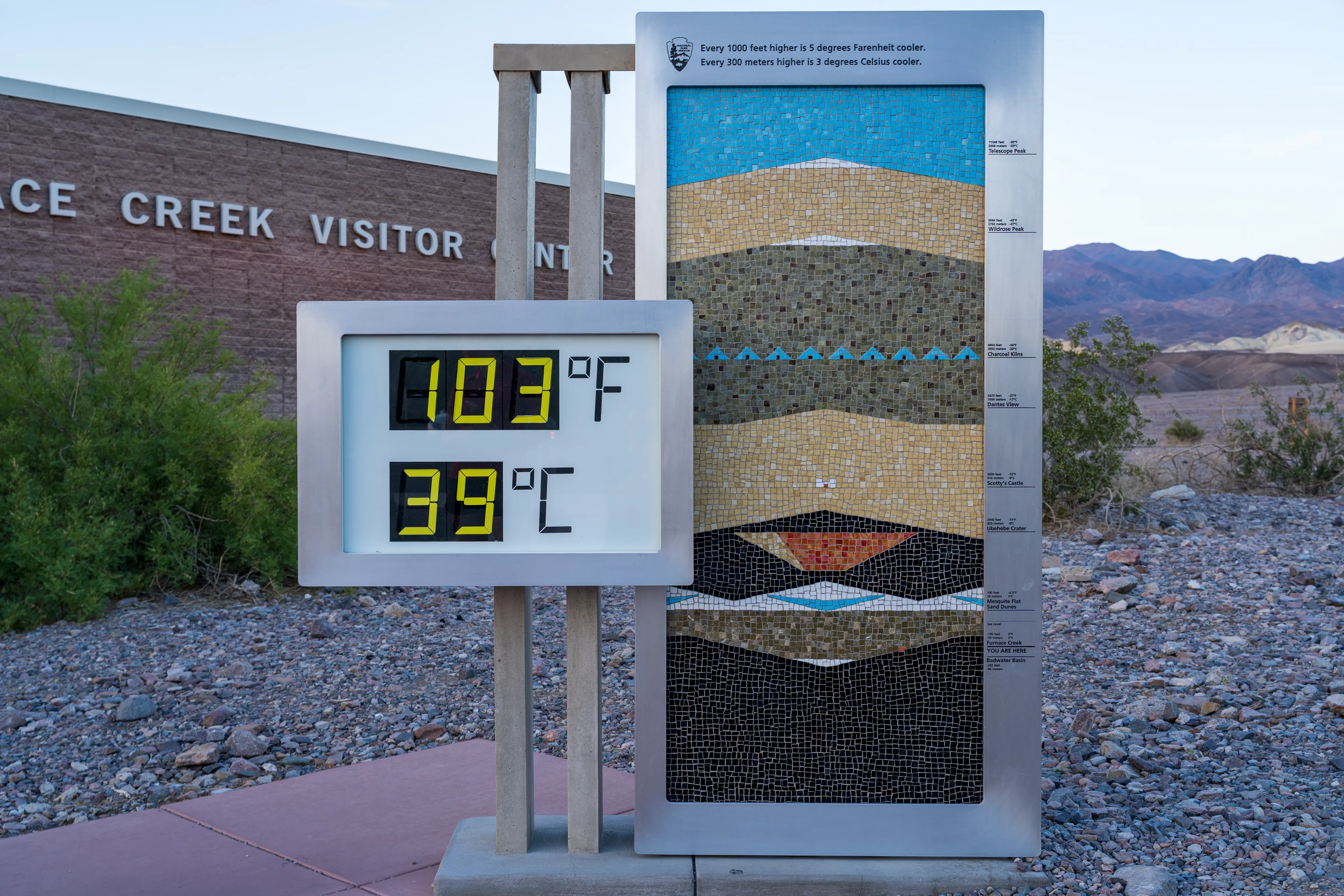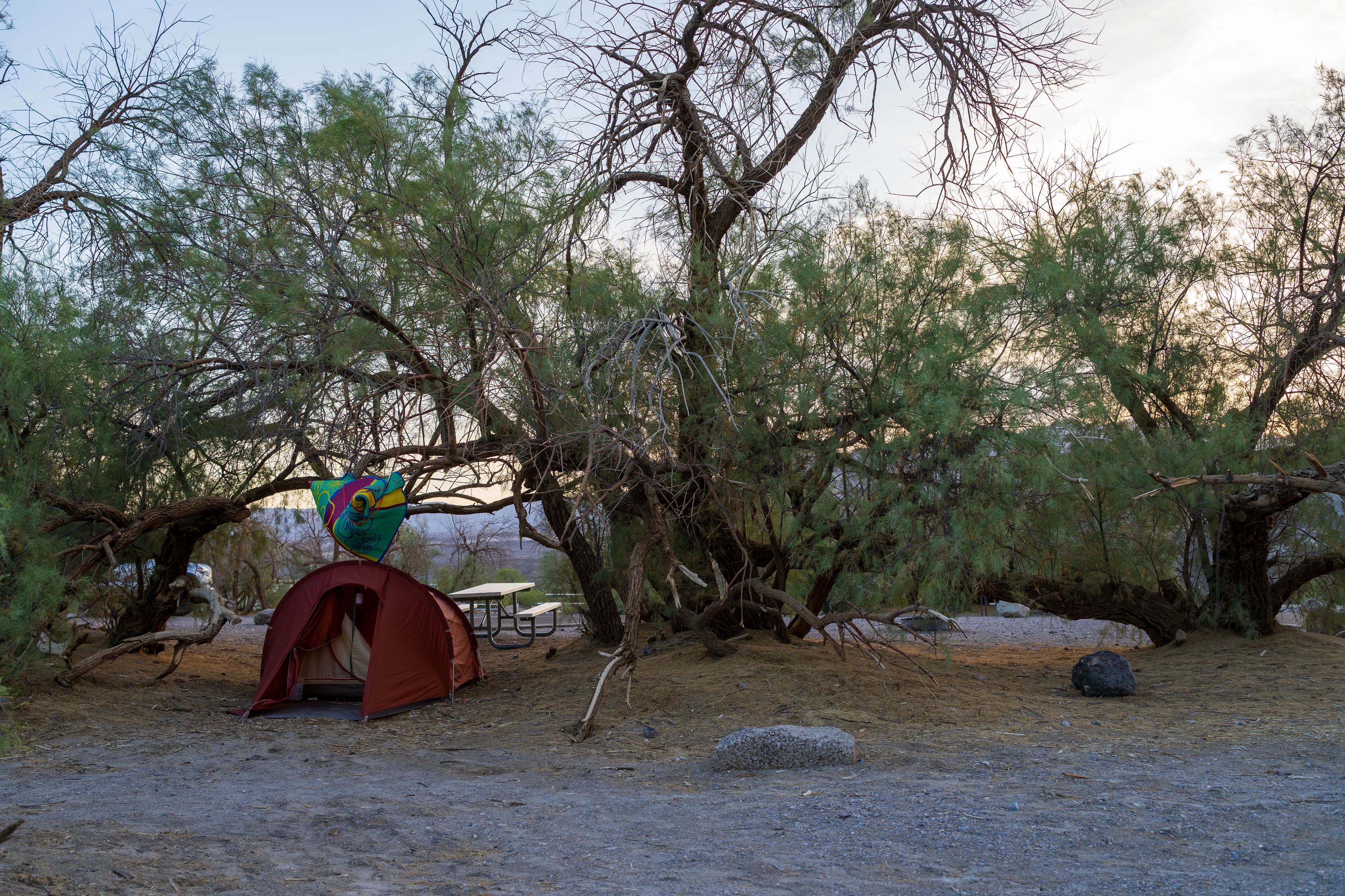 Hier sind die Temperaturen aufgrund der niedrigen Höhe und Lage meist am höchsten, weshalb direkt vor dem Visitor Center ein großes Thermometer angebracht ist. Bei unserer Ankunft am 23. Mai um kurz nach 19:30 zeigt es immer noch 39 °C an – ganz schön warm! Zumindest für uns; für das Death Valley noch recht moderat. Wir wollten uns eigentlich einen Schlafplatz in den etwas höher gelegenen - und deshalb auch kühleren Gegenden suchen - entscheiden uns aber spontan dazu auf dem Campingplatz in Furnace Creek zu übernachten. Der Furnace Creek Campground arbeitet um diese Jahreszeit bereits auf First-Come-First-Serve Basis und es sind noch sehr viele freie Plätze vorhanden. Kein Wunder, bei immer noch knackigen 30 °C gegen 22:00 Uhr und etwa 25 °C als Tiefsttemperatur. So ist diese Nacht eher ein Schwitzen als ein erholsames Schlafen - aber dennoch die Erfahrung wert.