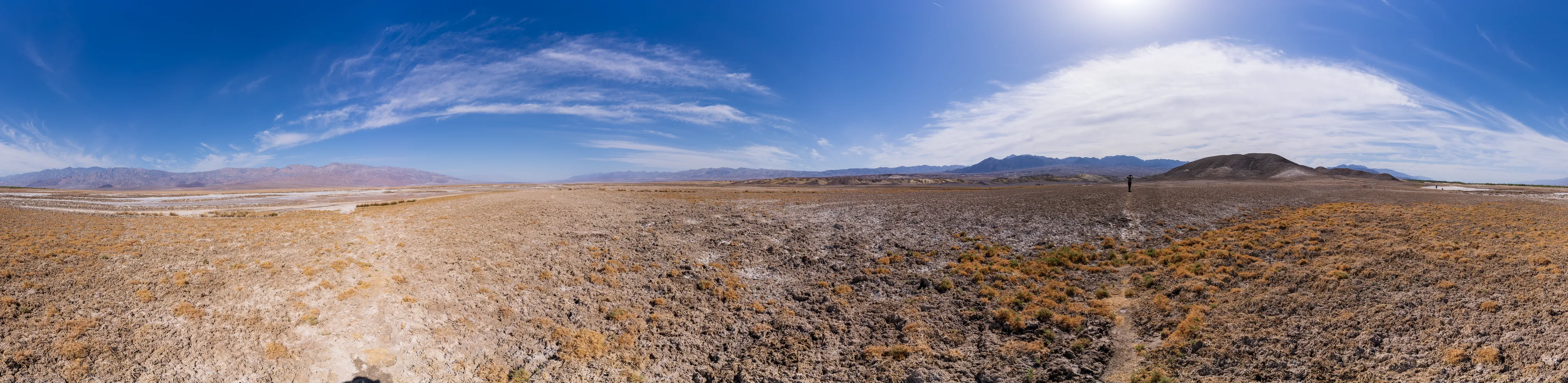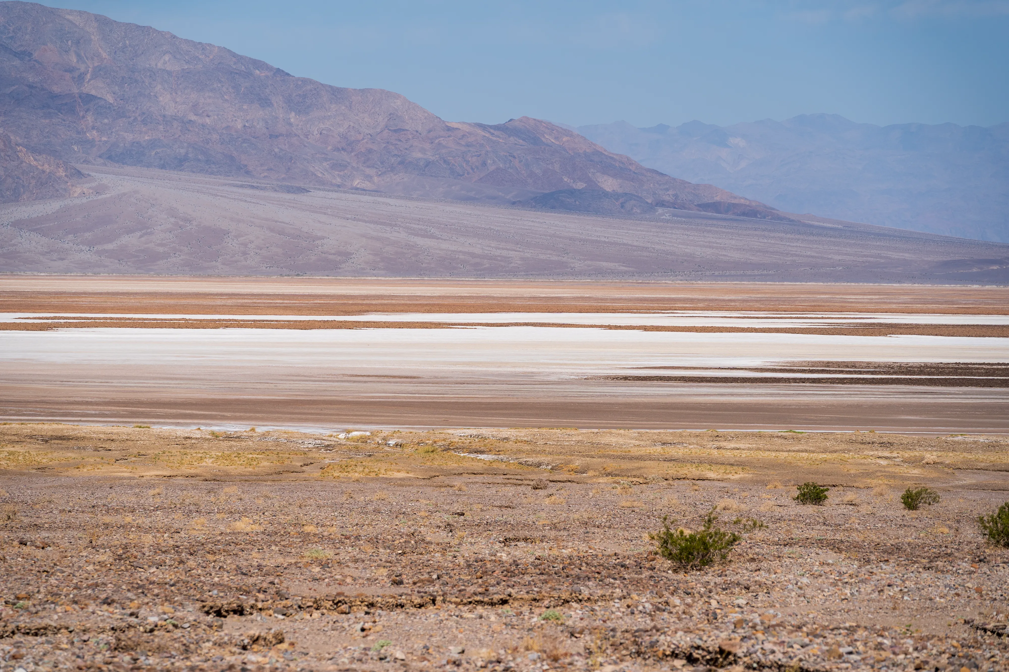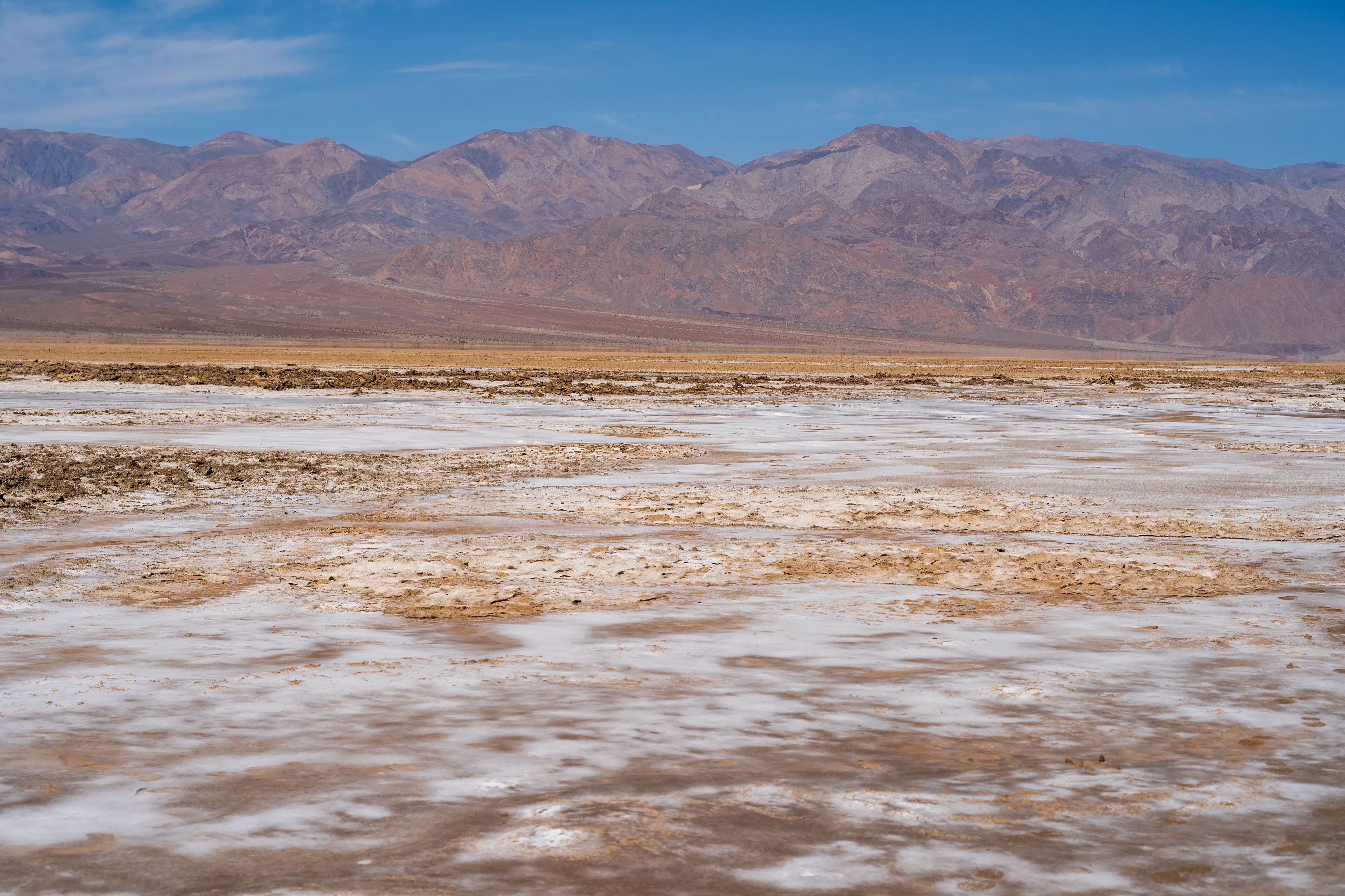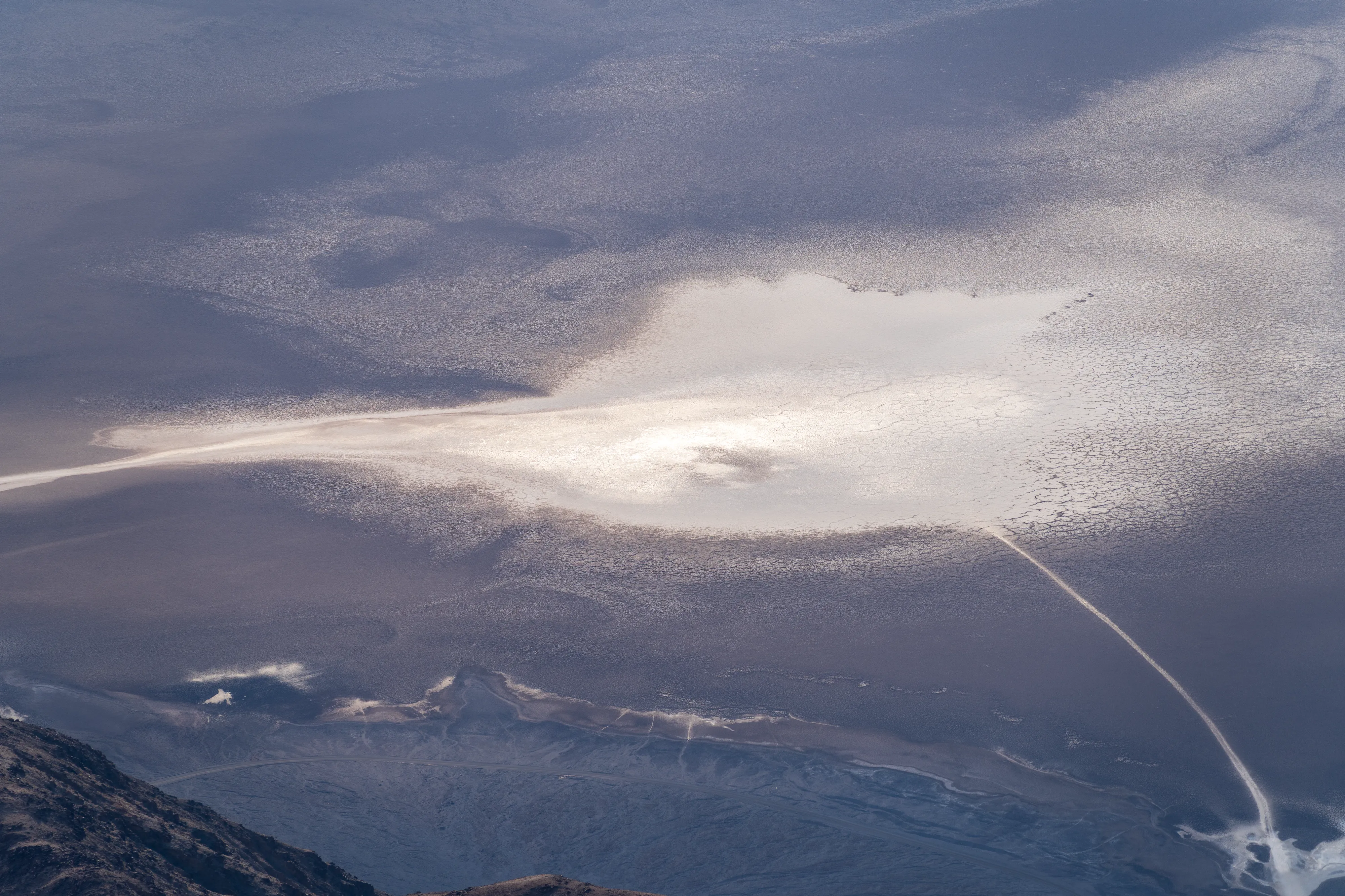 Badwater Basin ist eine Salzwüste in der Ebene, welche teilweise sogar unterhalb des Meeresspiegels liegt. Hier kann man zu manchen Jahreszeiten die bekannten Salzpolygone (sechseckige Salzkristalle) bestaunen. Das Besondere hieran: es bilden sich nicht nur Sechsecke mit 2 - 2,5 m Durchmesser, sondern diese sind wiederum Teil einer großen sechseckigen Struktur. Zum Zeitpunkt unseres Besuchs war die Badwater Basin Road allerdings leider wegen Überflutung gesperrt. Es regnet zwar recht regelmäßig im Death Valley - aber eben nur sehr wenig. Und regnet es dann einmal mehr, so kann der ausgetrocknete Boden das Wasser nicht aufnehmen und es kommt zu Überflutungen.
