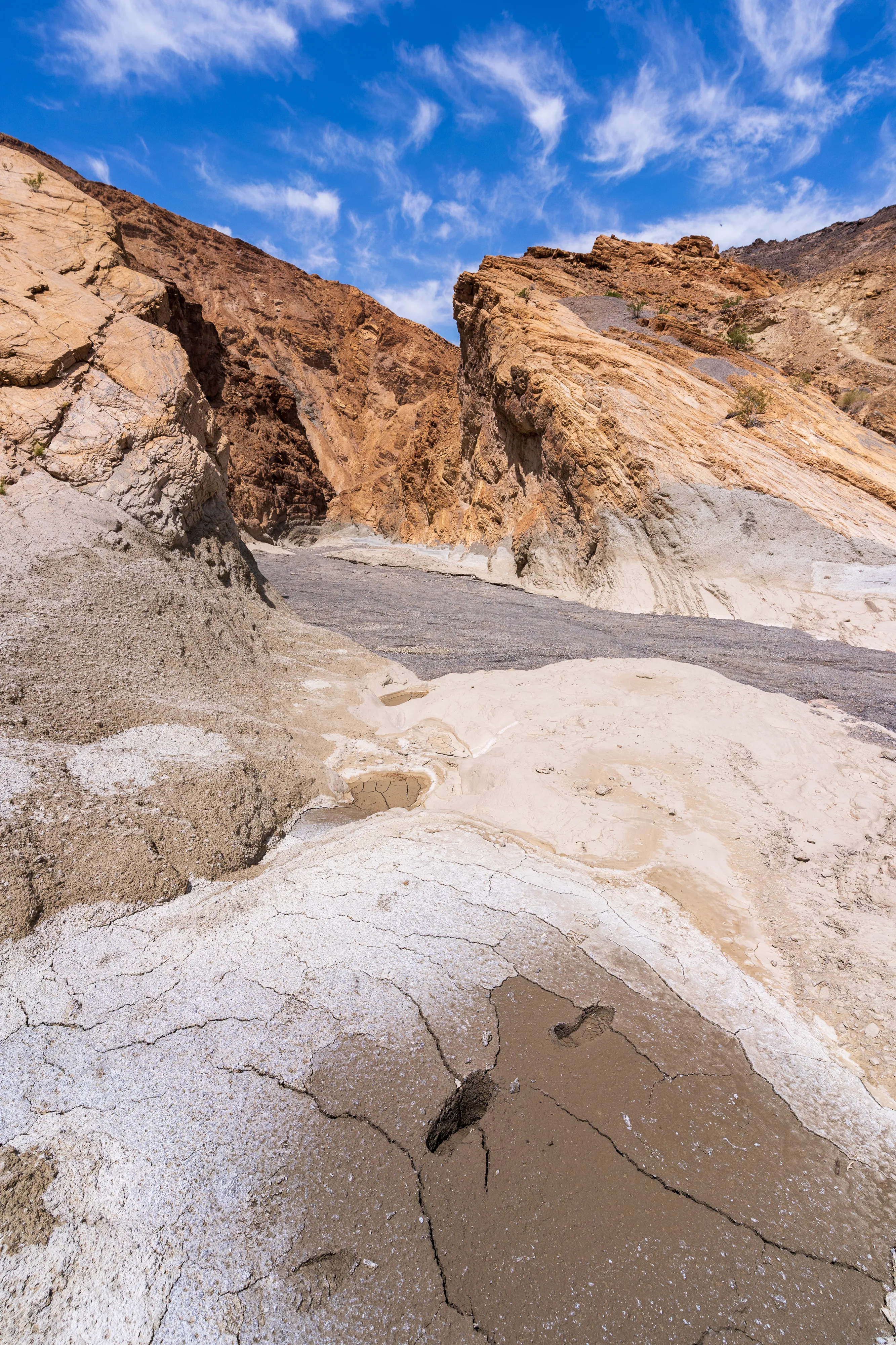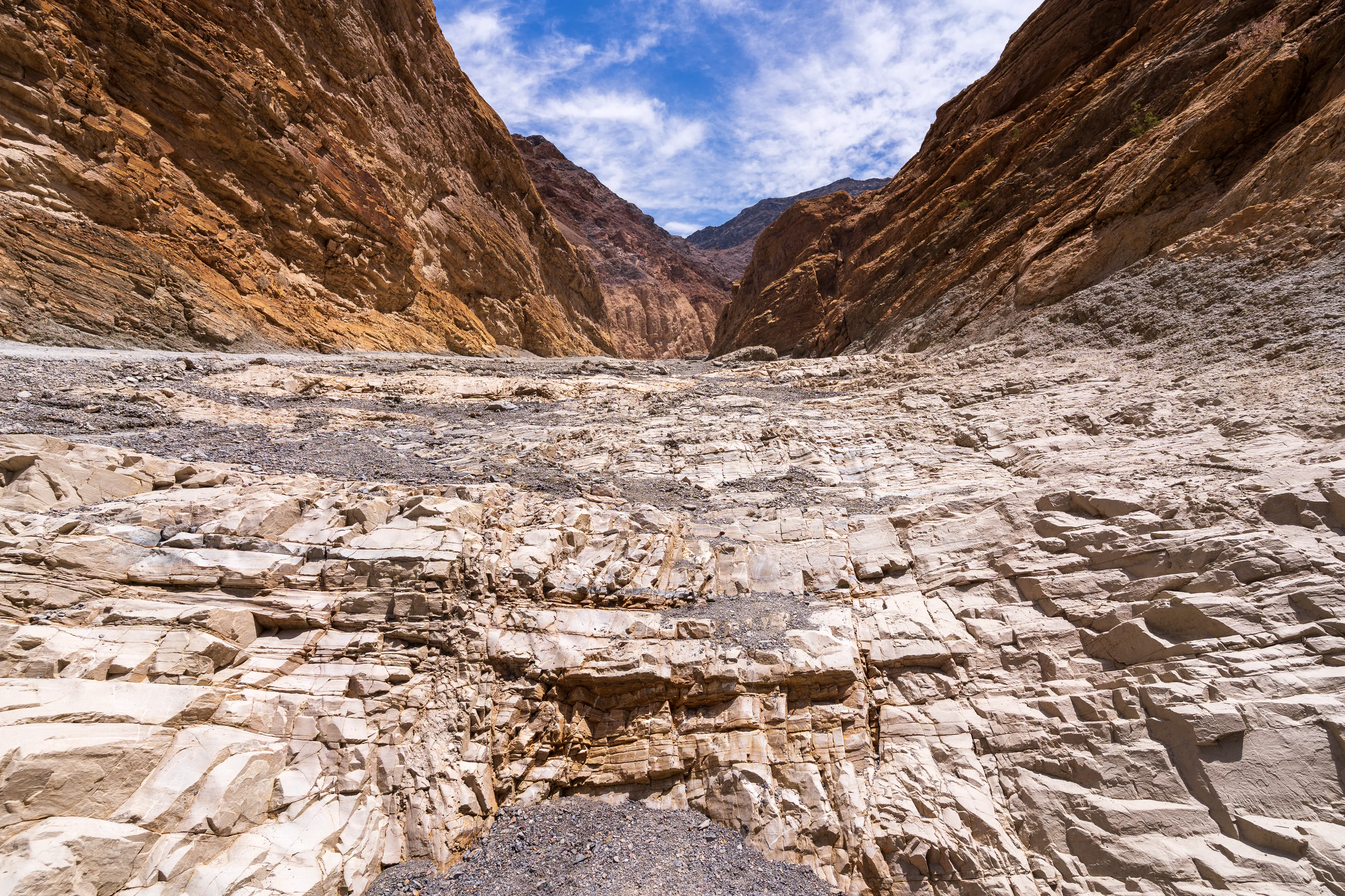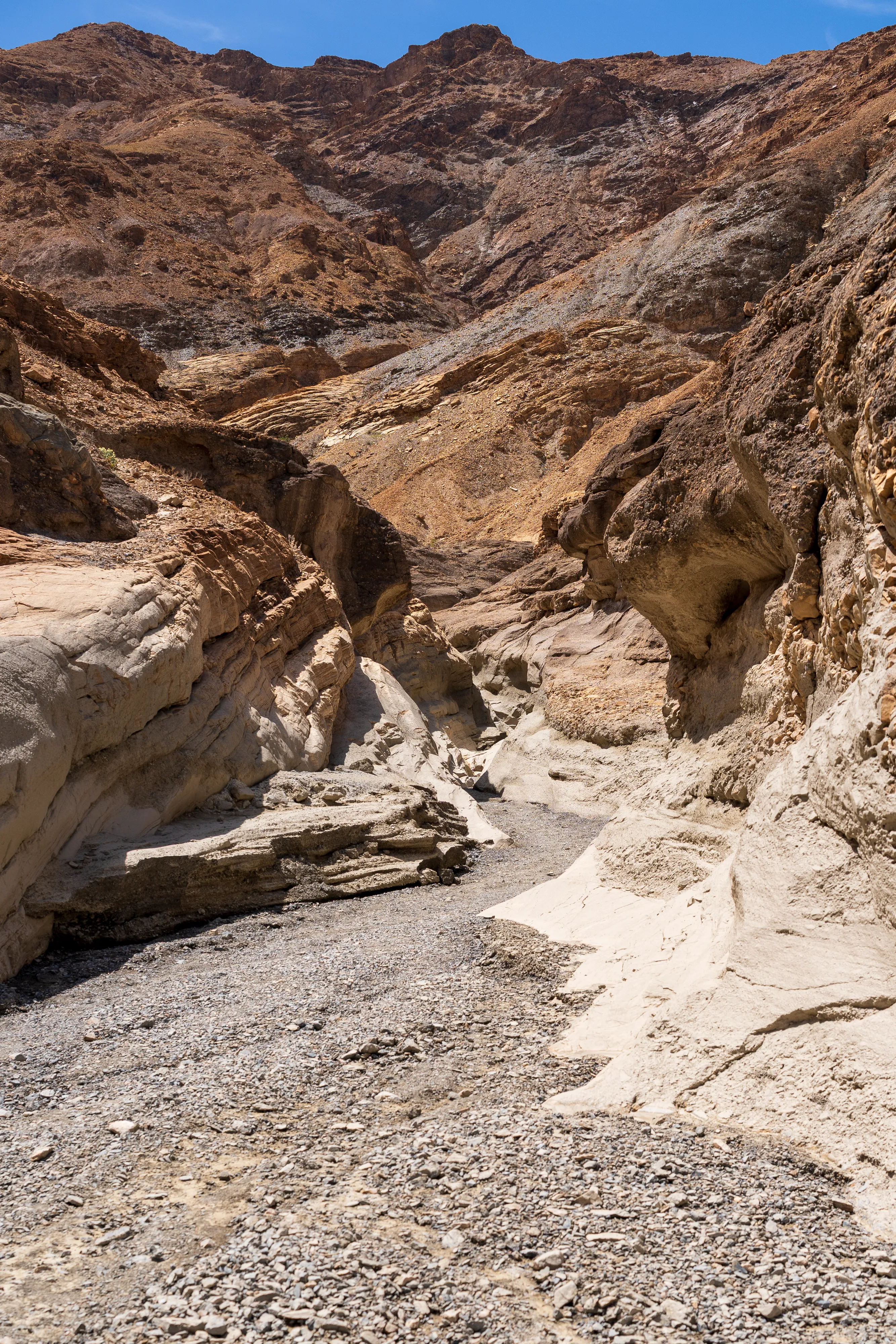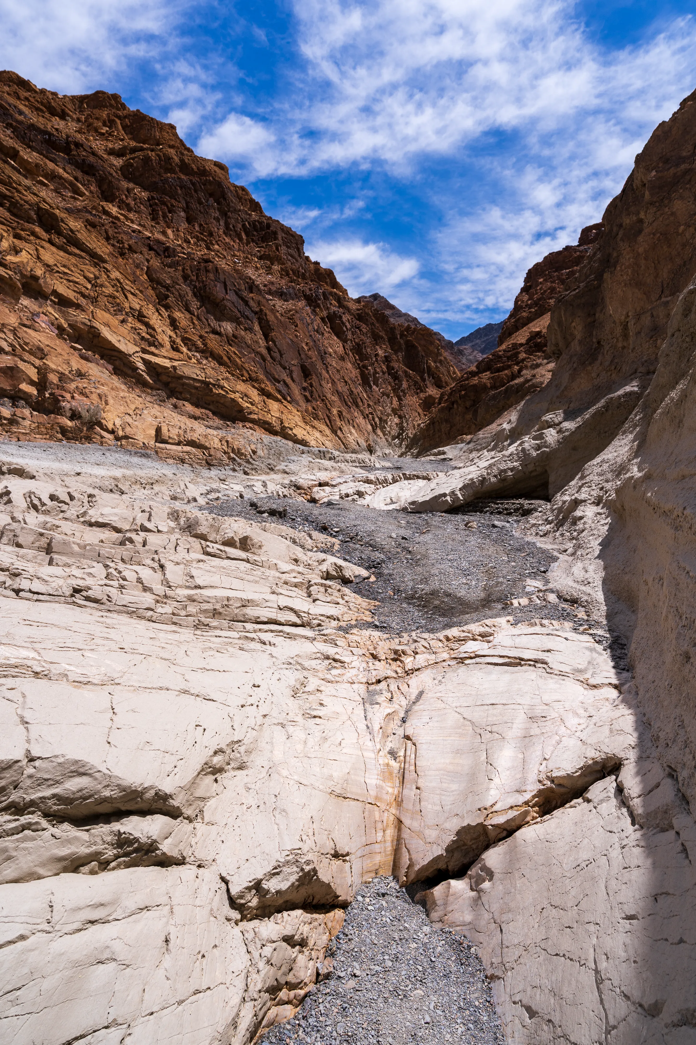 Weiterhin wollten wir uns eine kürzere Wanderung in den Mosaic Canyon nicht entgehen lassen. Hier befinden sich gestreifte Marmorfelsen, welche allerdings von einer getrockneten Schlammschicht überzogen und daher wenig auffällig sind. Die Maserung ist nur an den sauberen Stellen zu erkennen - während eines reinigenden Regens vermutlich gut zu sehen.
