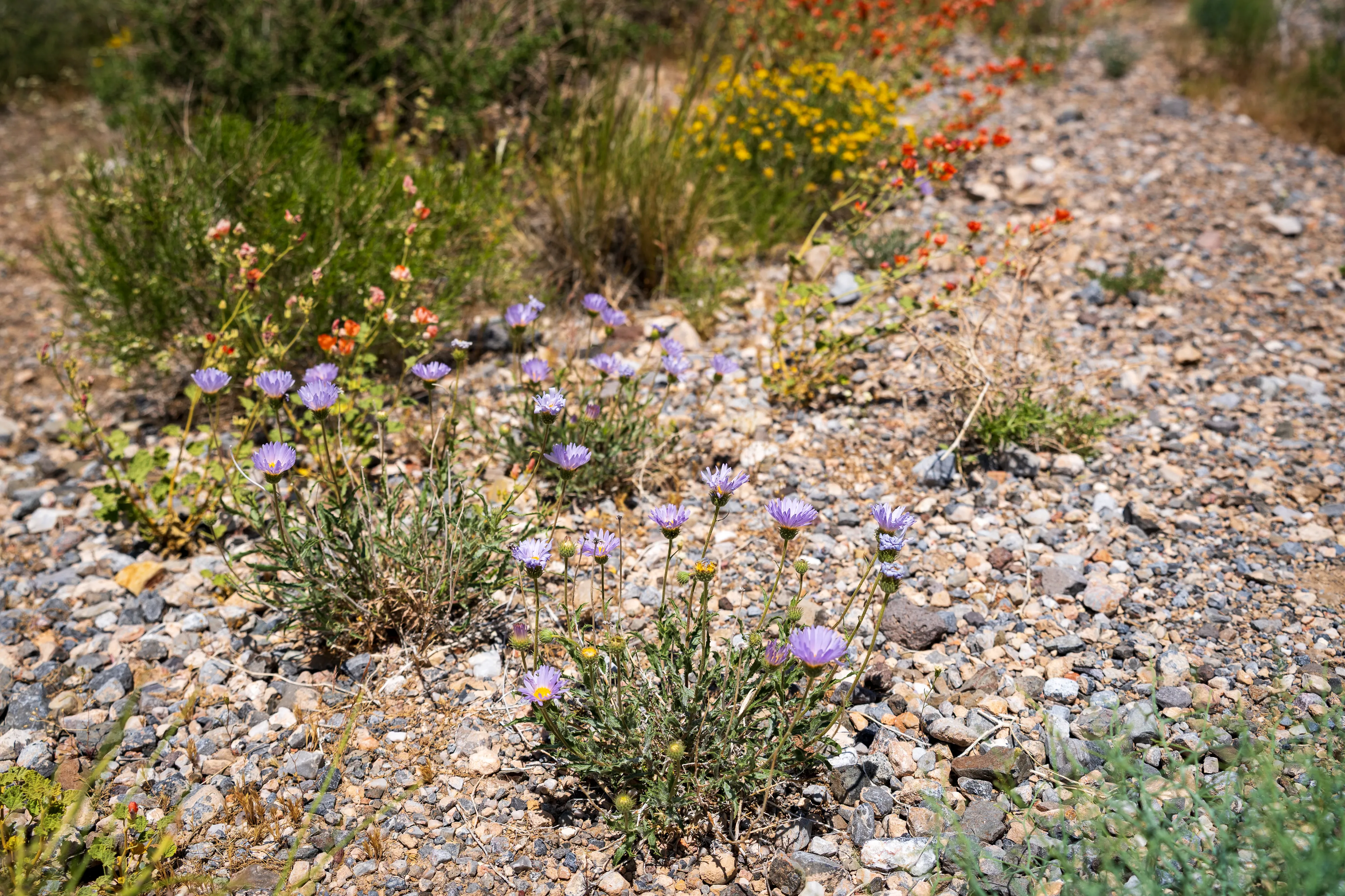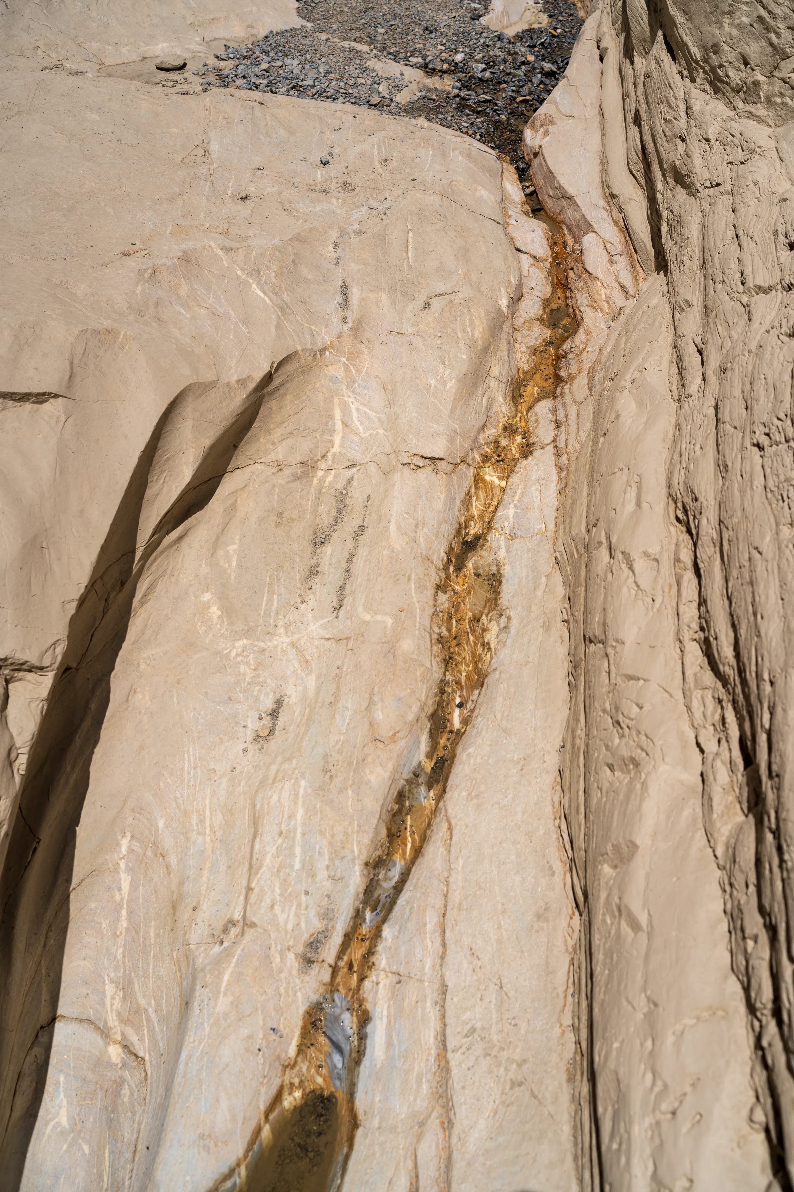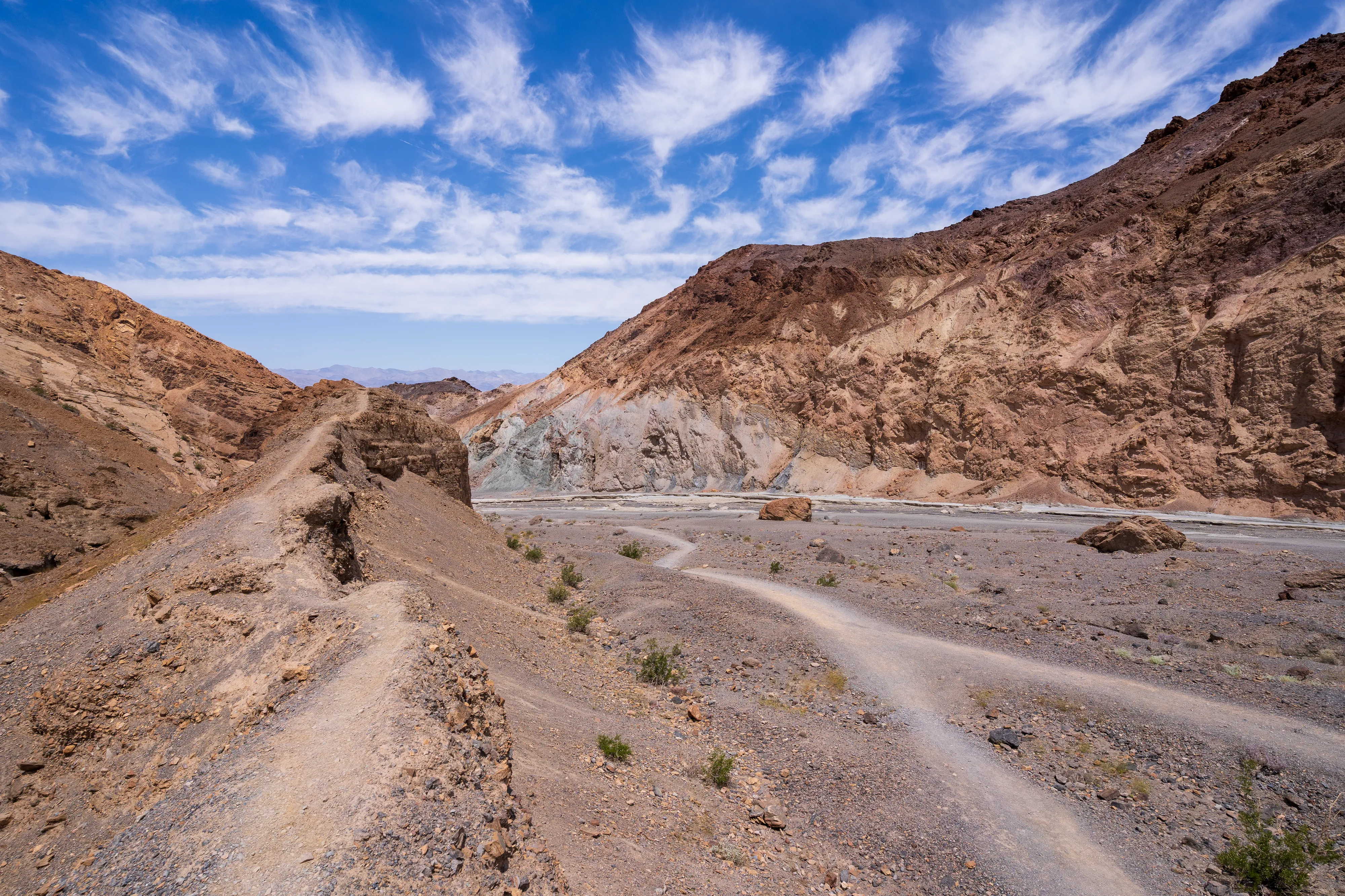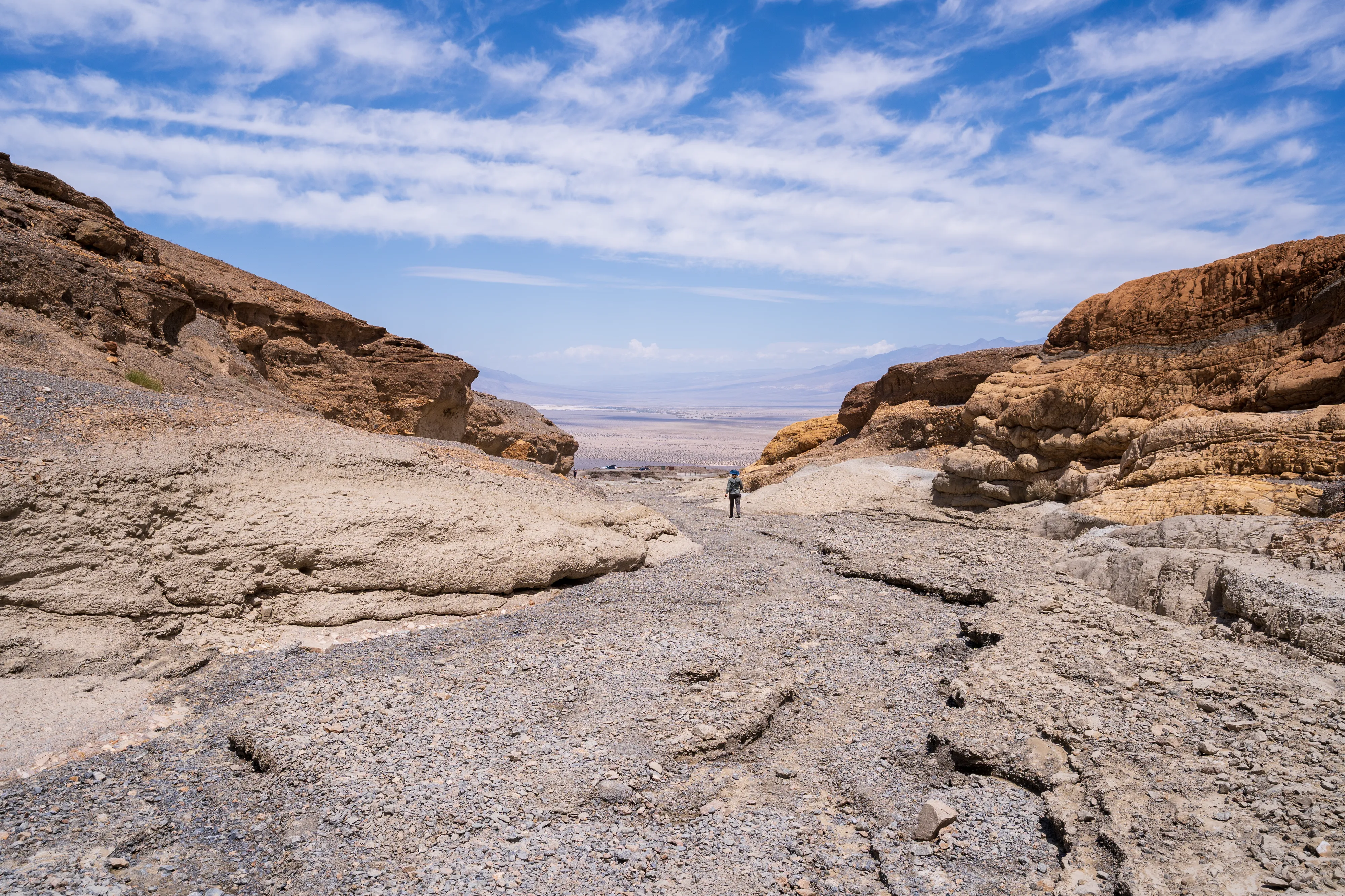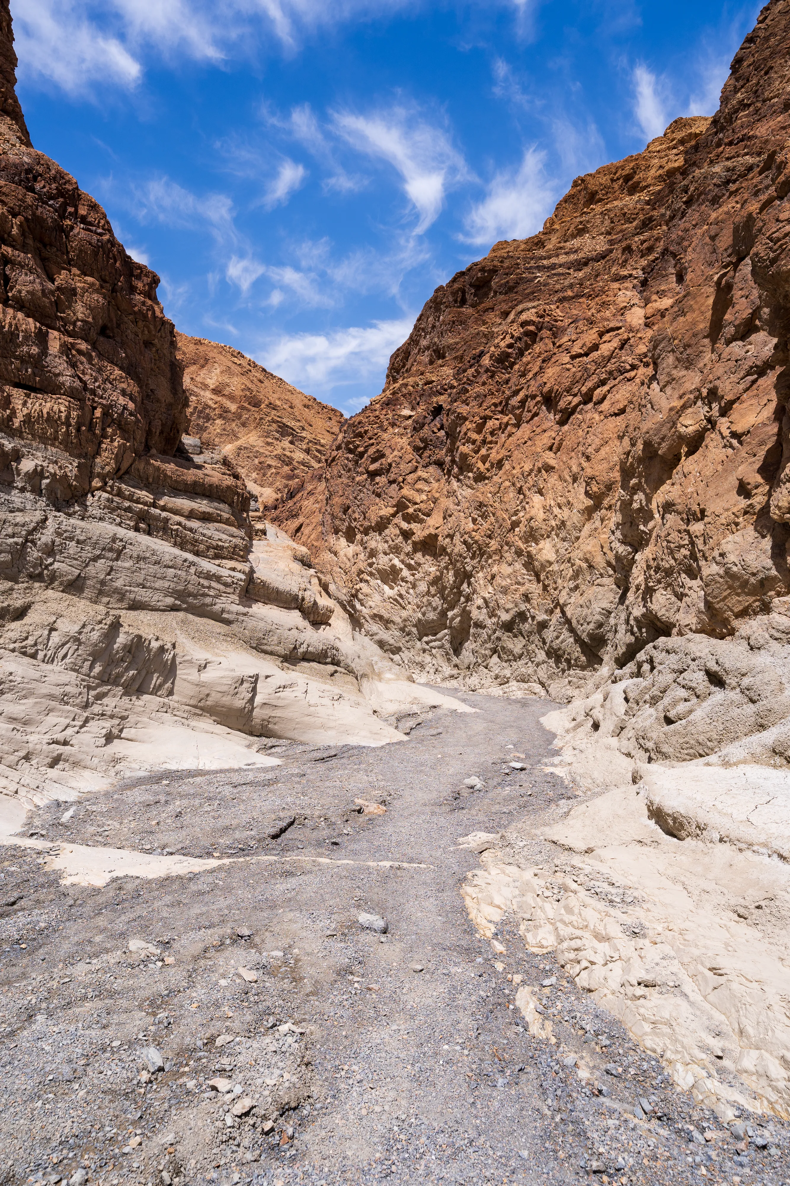 Weiterhin wollten wir uns eine kürzere Wanderung in den Mosaic Canyon nicht entgehen lassen. Hier befinden sich gestreifte Marmorfelsen, welche allerdings von einer getrockneten Schlammschicht überzogen und daher wenig auffällig sind. Die Maserung ist nur an den sauberen Stellen zu erkennen - während eines reinigenden Regens vermutlich gut zu sehen.
