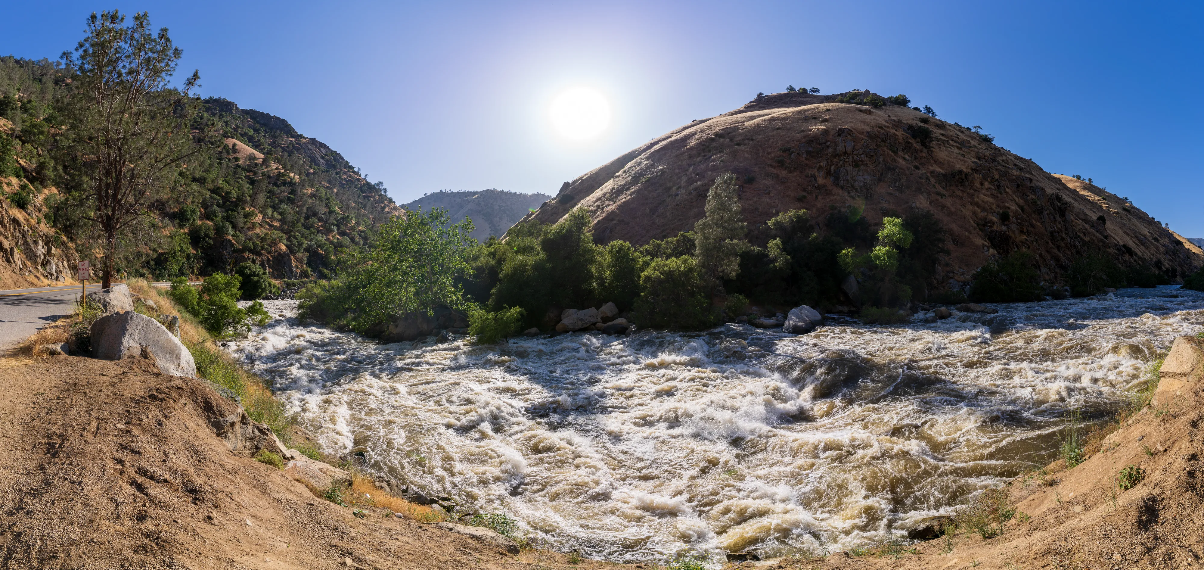 Ursprünglich wollten wir über Bishop, Mono Lake und den Tioga Pass zu unserem nächsten Ziel, dem Yosemite Nationalpark, fahren, allerdings ist die Passstraße aufgrund besonders viel Schneefall noch nicht vollständig geräumt und somit müssen wir uns dem Yosemite National Park von Westen her nähern. Schade, denn das bedeutet sowohl einen mehrstündigen Umweg als auch, dass wir die angepriesene Tioga Pass Road dieses Mal nicht fahren können. Aber die Verstimmung legt sich schnell, denn das südliche Ende der Sierra Nevada ist durchaus auch sehenswert und die mit viel Schmelzwasser gefüllten Flüsse sind beeindruckend.