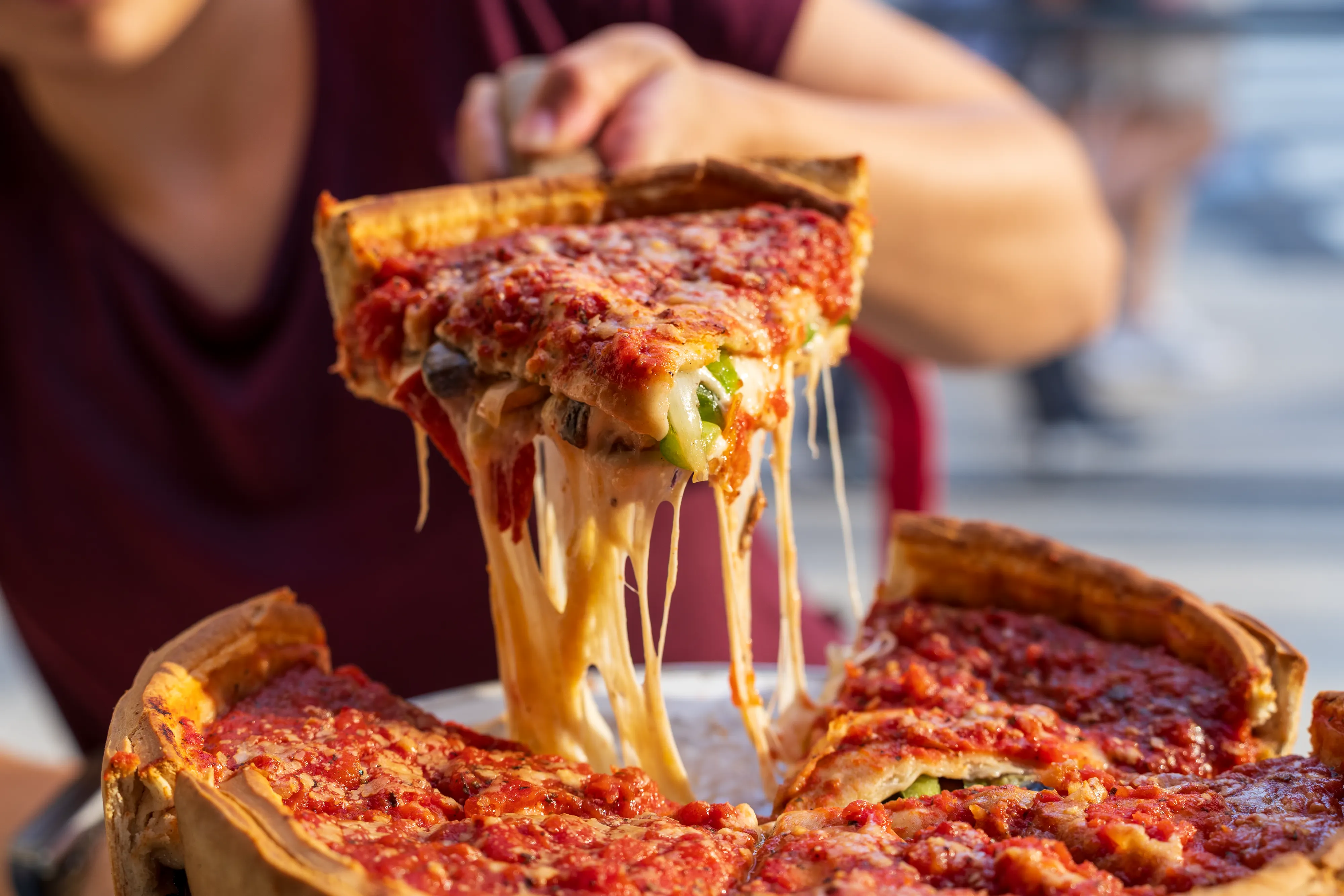 Diese für Chicago typische “Pizza” hat mit einer italienischen Pizza außer der Tomatensoße und der Tatsache, dass sie im Ofen gebacken wird, eigentlich nichts gemein: Der Käse ist unter der Tomatensoße, als Teig wird ein Mürbeteig verwendet und die Pizza wird in eine Pfanne gebacken.