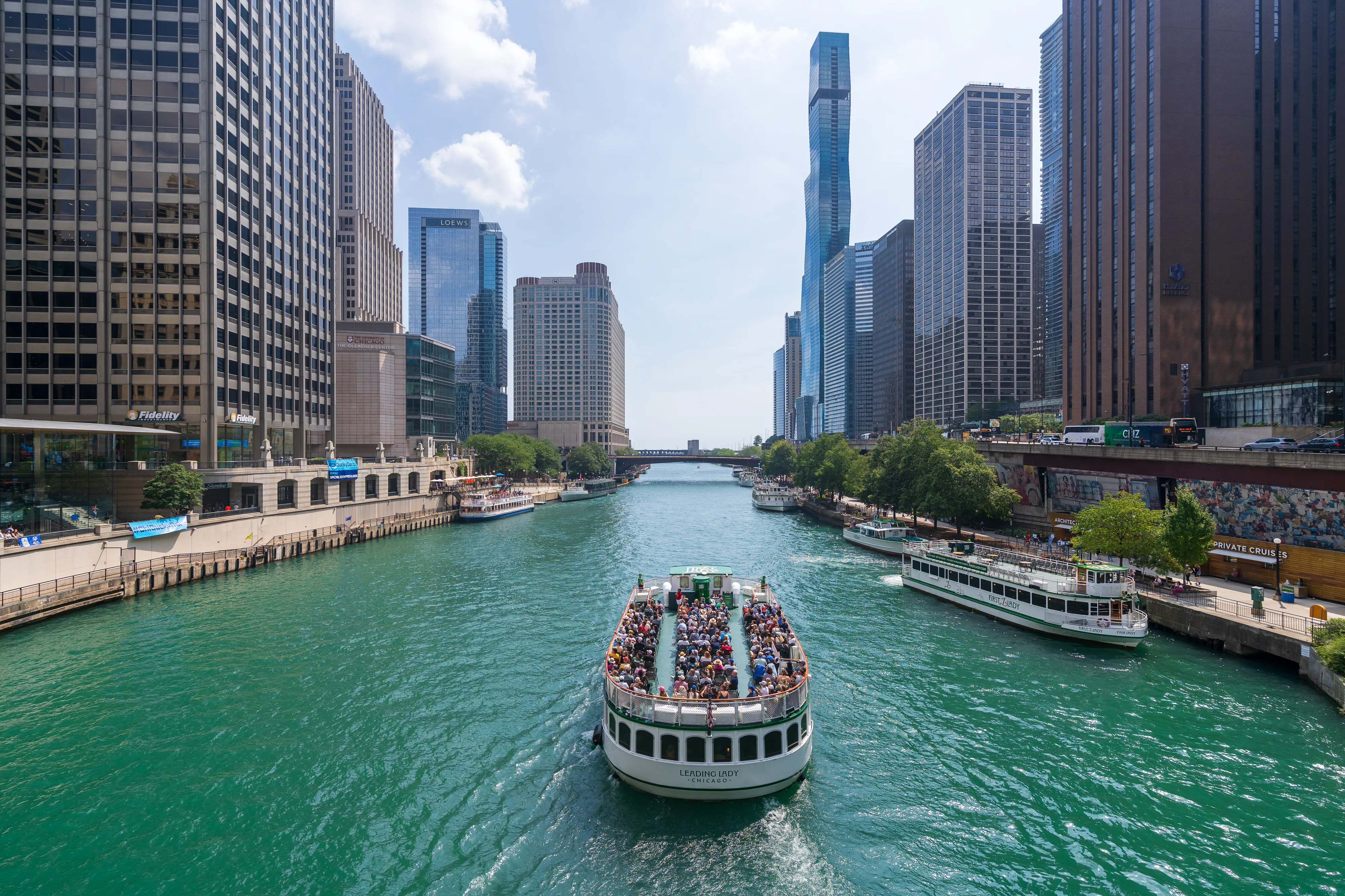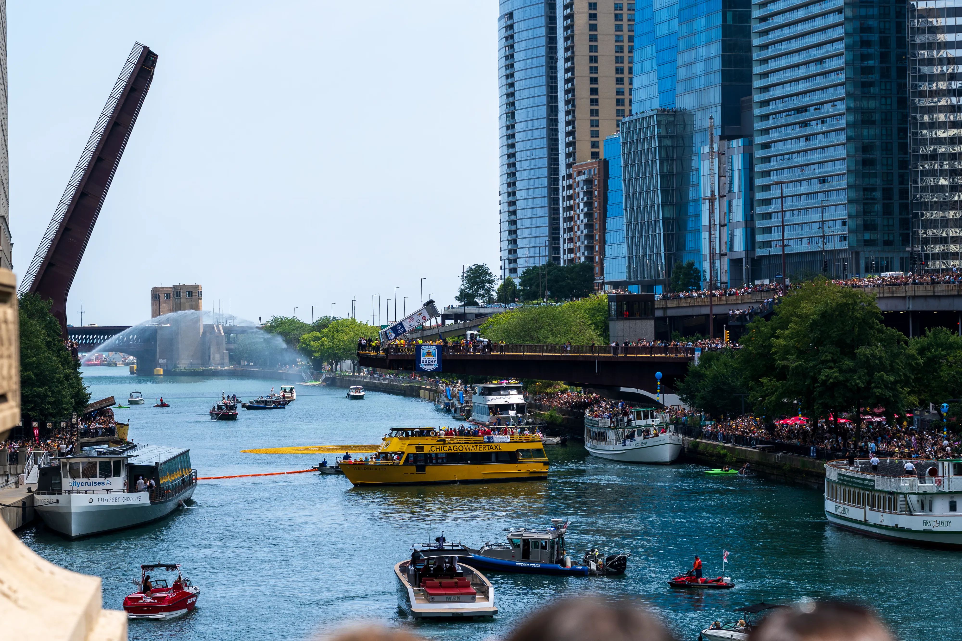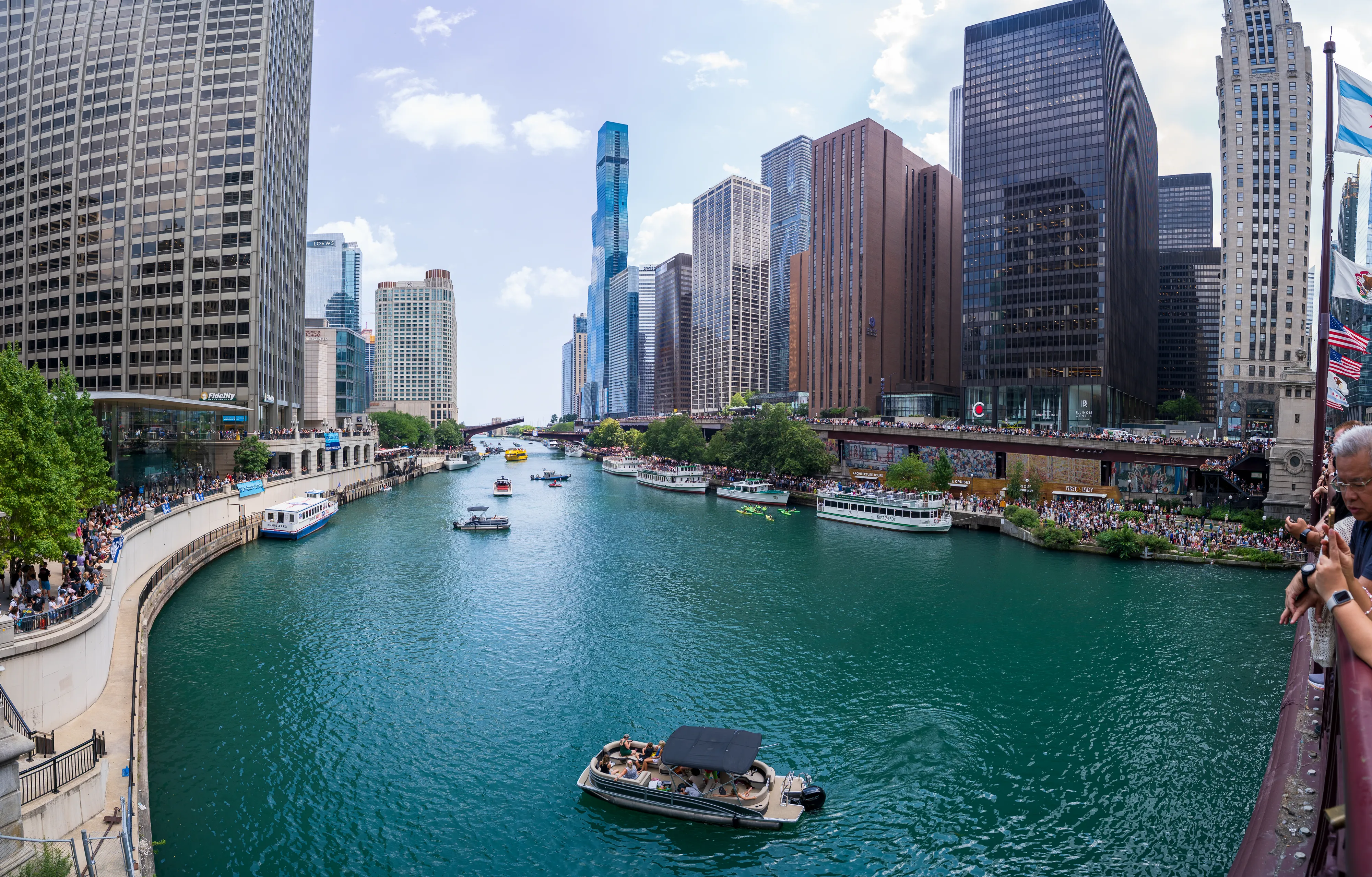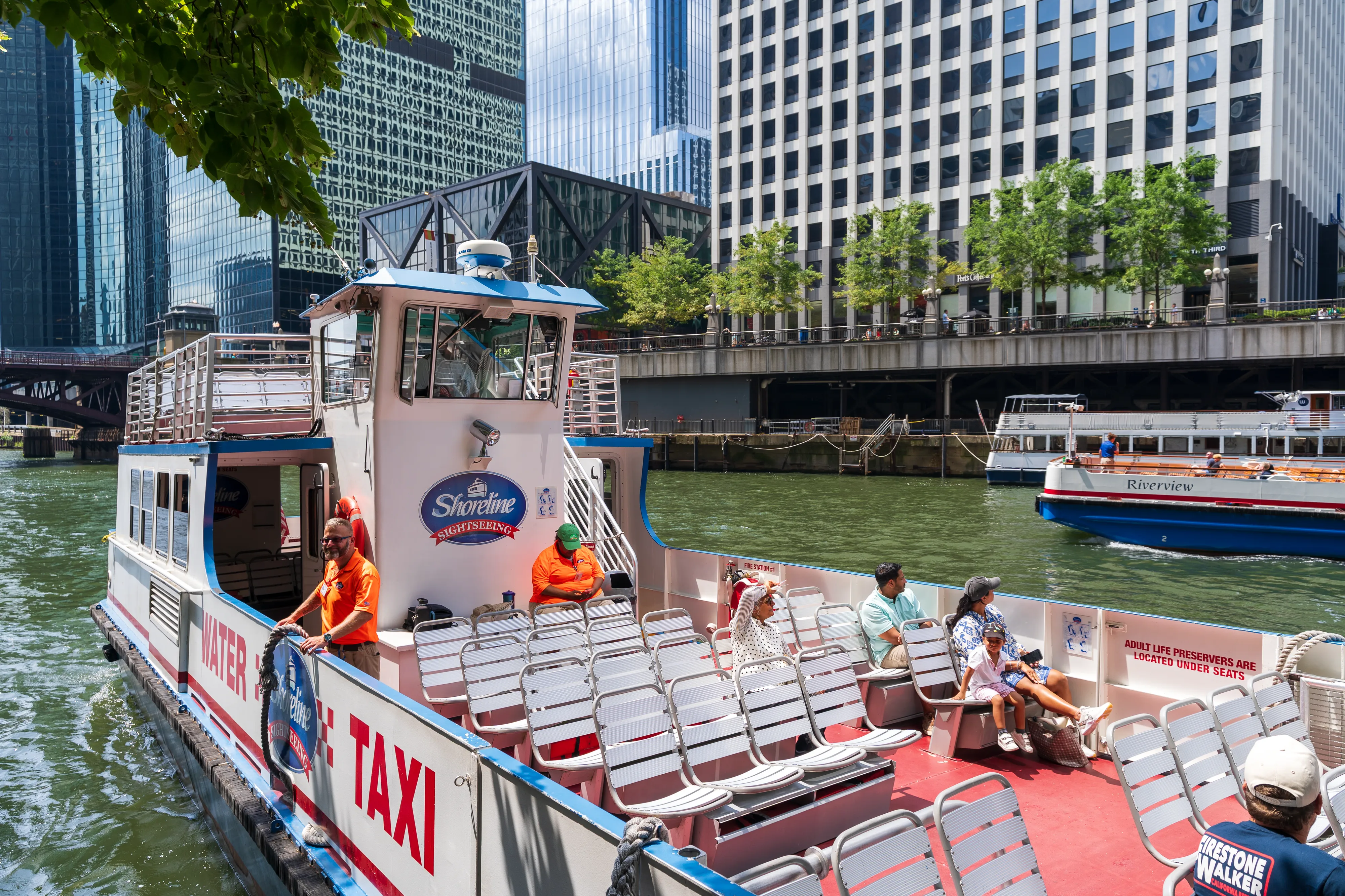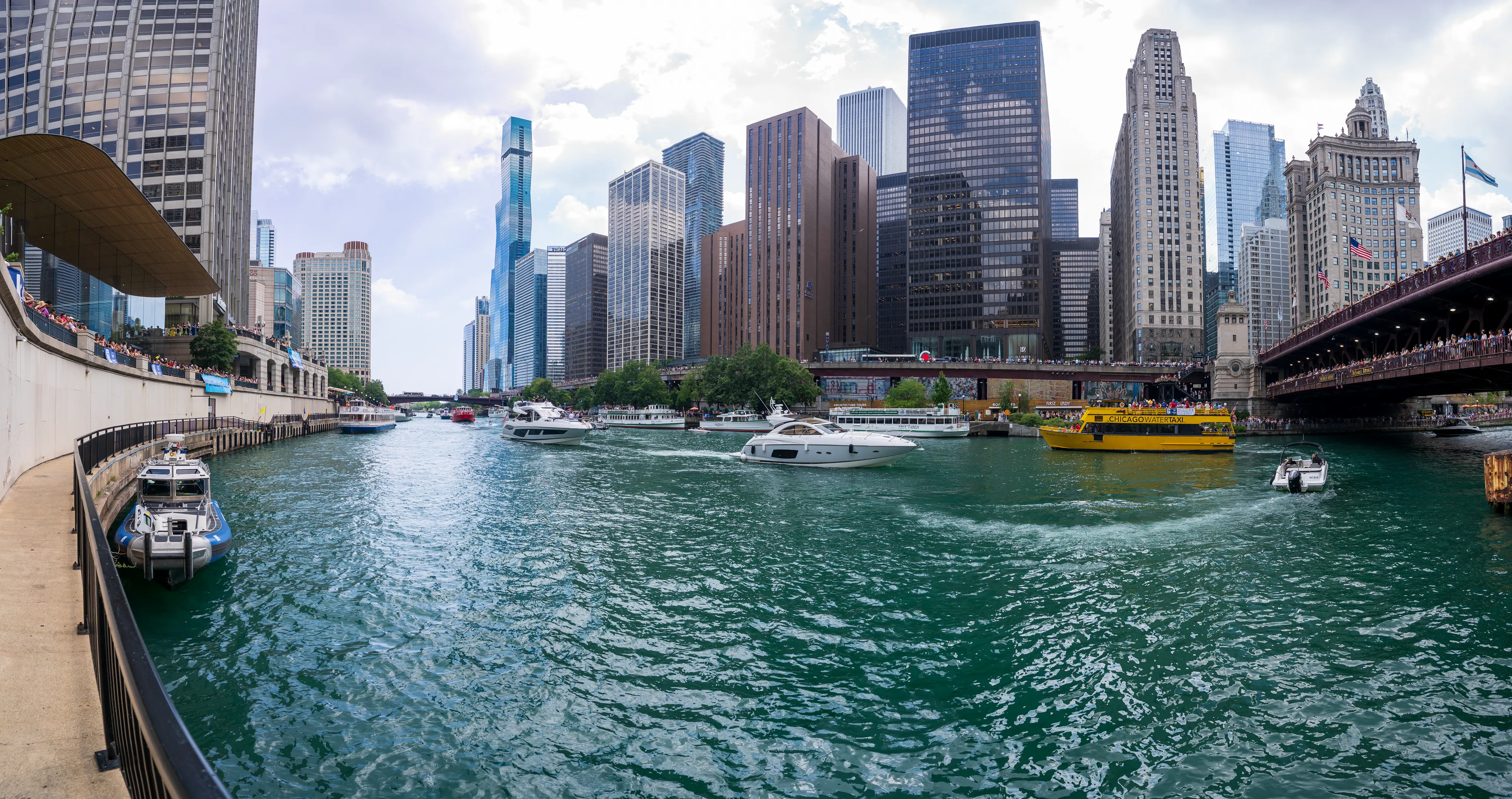 Ab dort folgen wir der Straße bis zum Willis Tower und besteigen auf Höhe der Union Station ein Wassertaxi. Eigentlich wollen wir bis zum Navy Pier schippern - erfahren allerdings unterwegs, das heute das Ducky Derby stattfindet und wir genau zur richtigen Zeit auf dem Fluss sind.